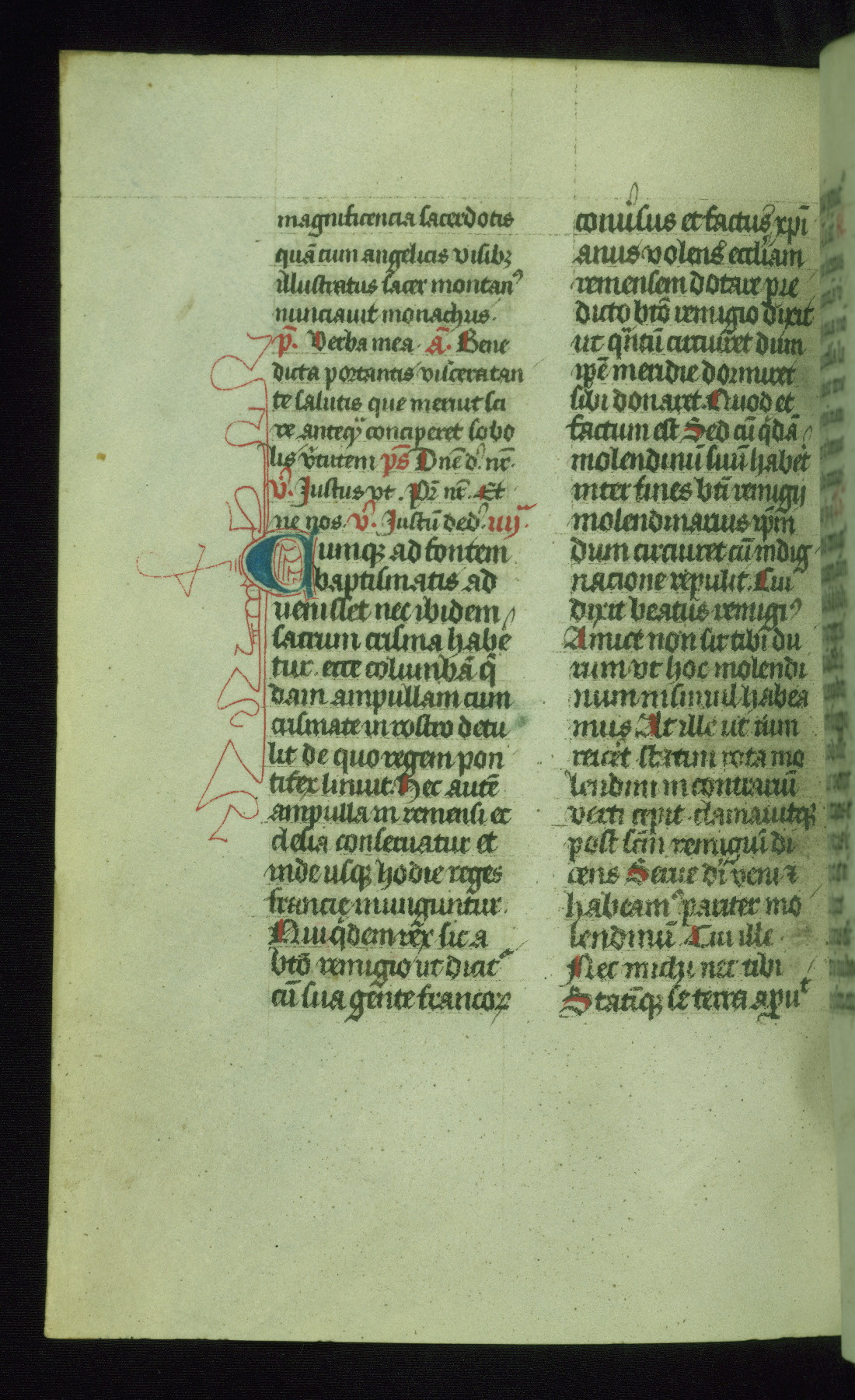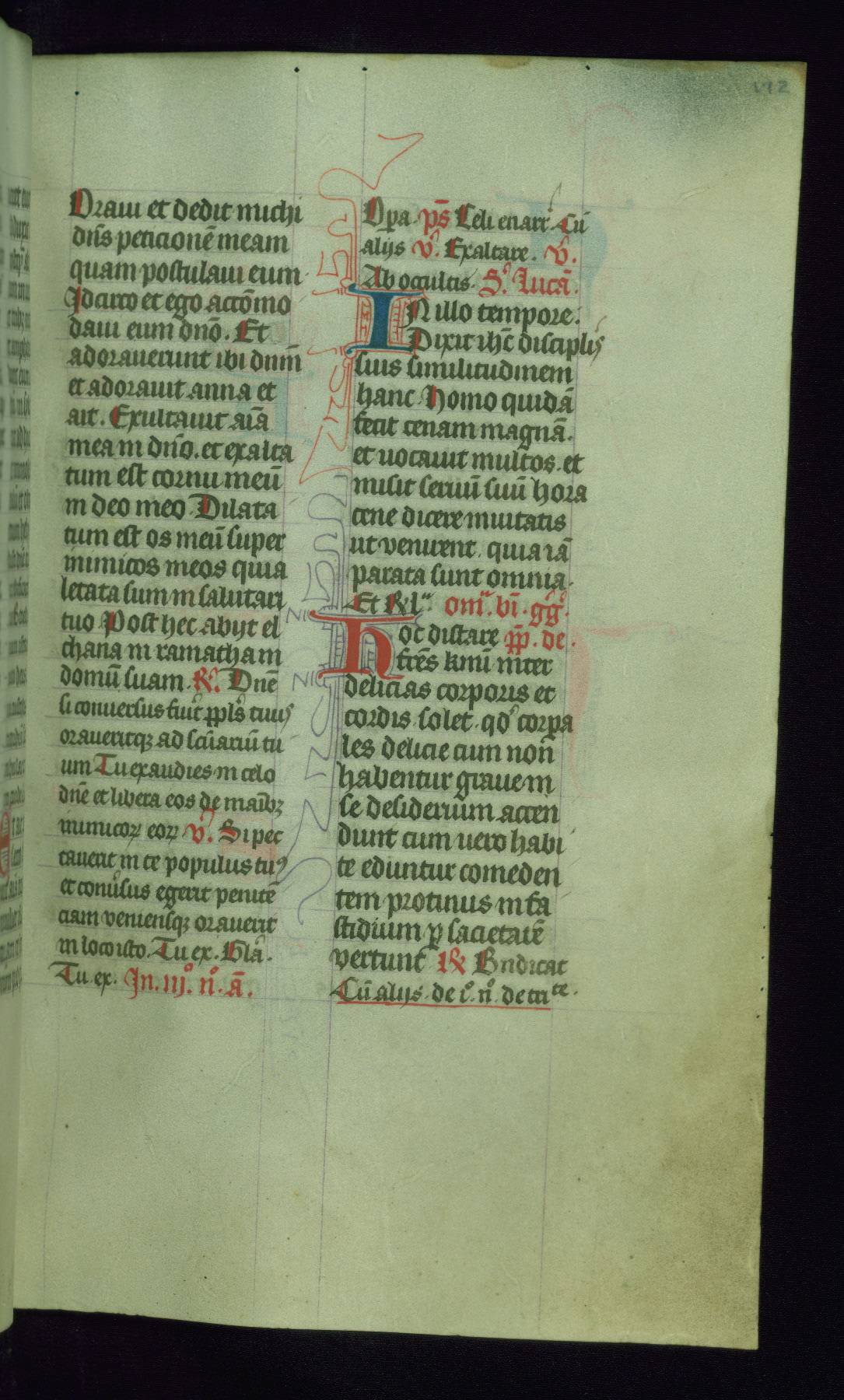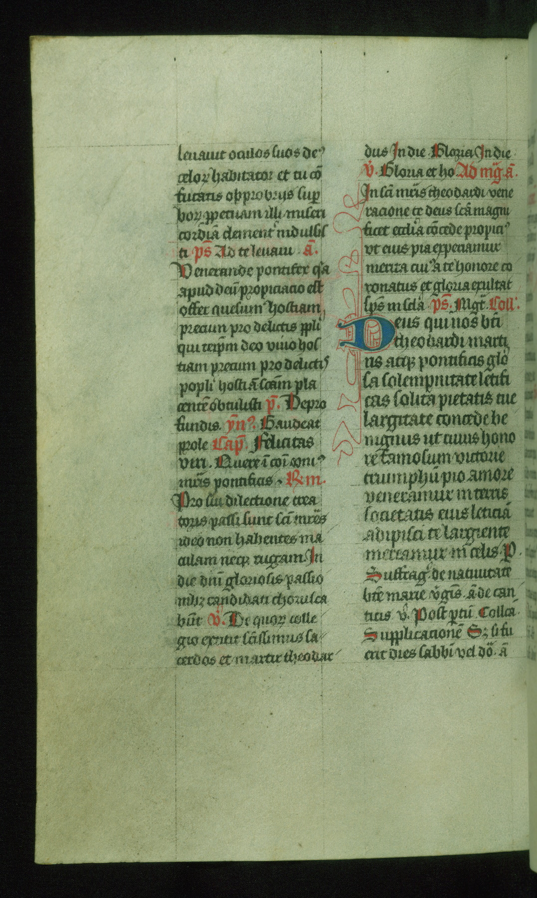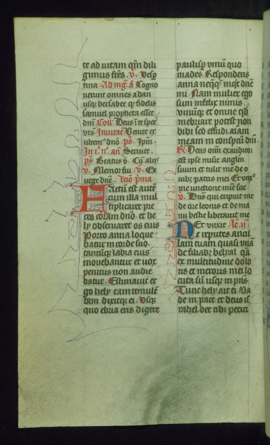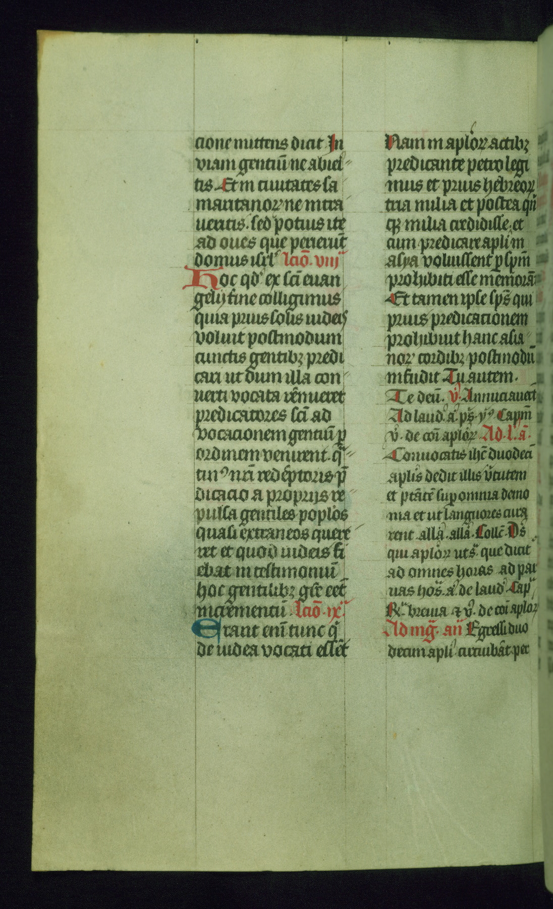 This small breviary, composed of more than 500 folios, is extraordinary for its length, considering it is the summer portion of a two-volume breviary for the use of Liège. The manuscript was completed for ecclesiastical use at the Cathedral of Notre-Dame and St.-Lambert in Liège ca. 1420. This attribution is suggested, for instance, by the petitions to the congregation of this cathedral (fols. 114v-117v), as well as the armorial shield of the family of Surlet de Chokier of Liège represented at the opening of the Psalms. The manuscript has modest, but interesting, decoration with historiated and decorated initials marking the liturgical texts, and occasional angels playing instruments in the margins. The most notable pictorial effect is found in the initials inhabited by transparent figures on rich blue ground. The technique is found, for instance, on fol. 156r with the gold monstrance held by translucent angels for the feast of the Corpus Christi.