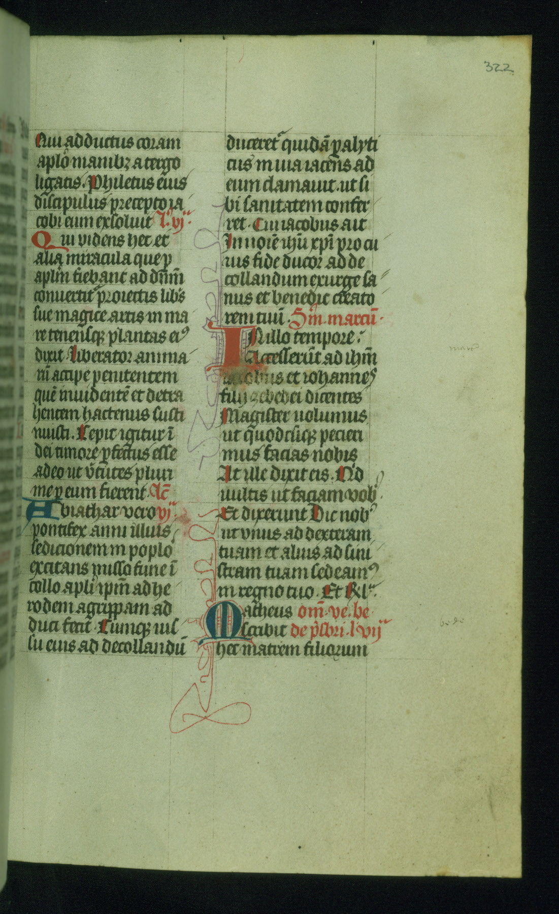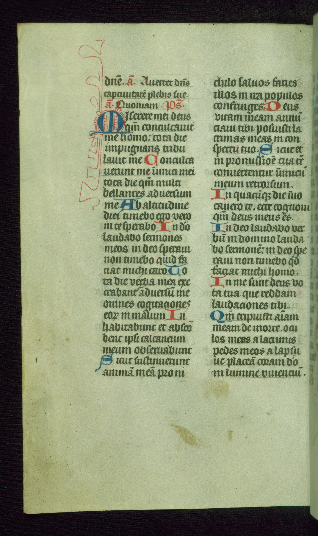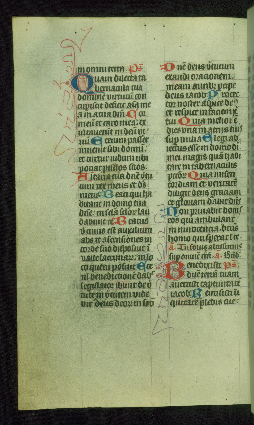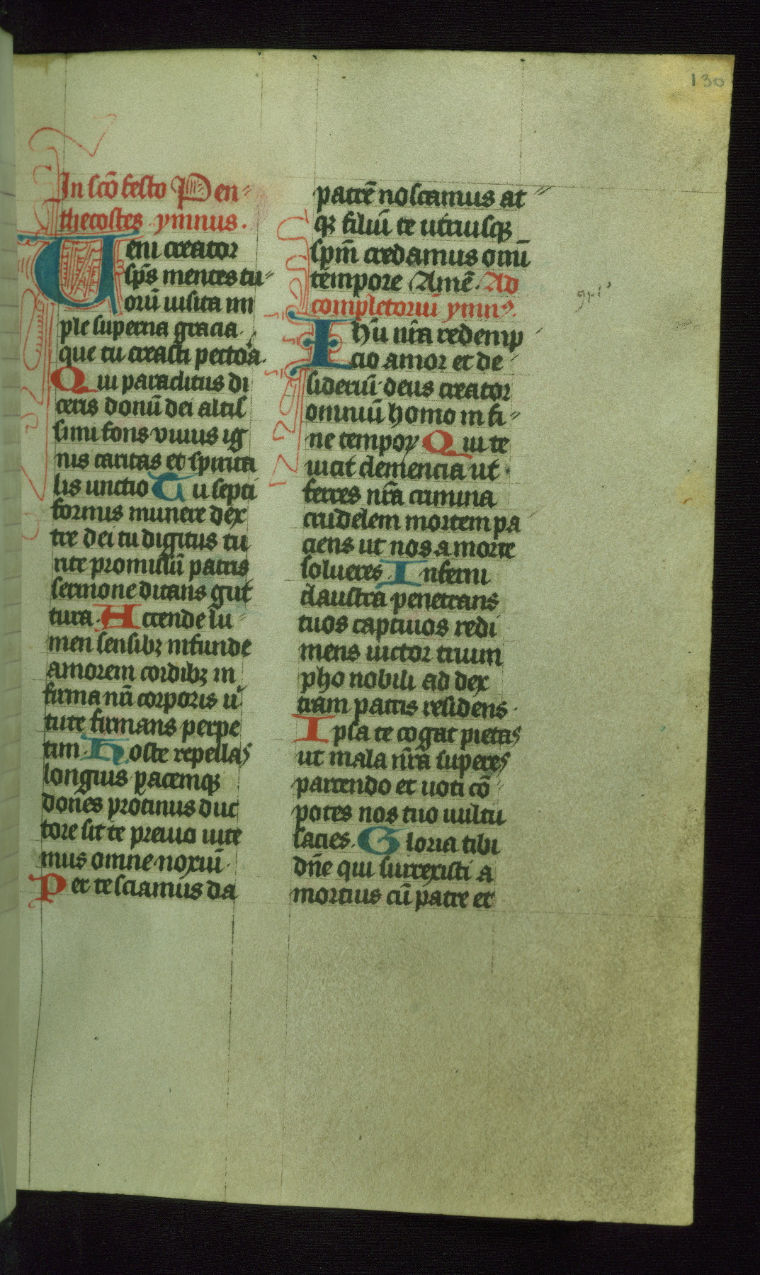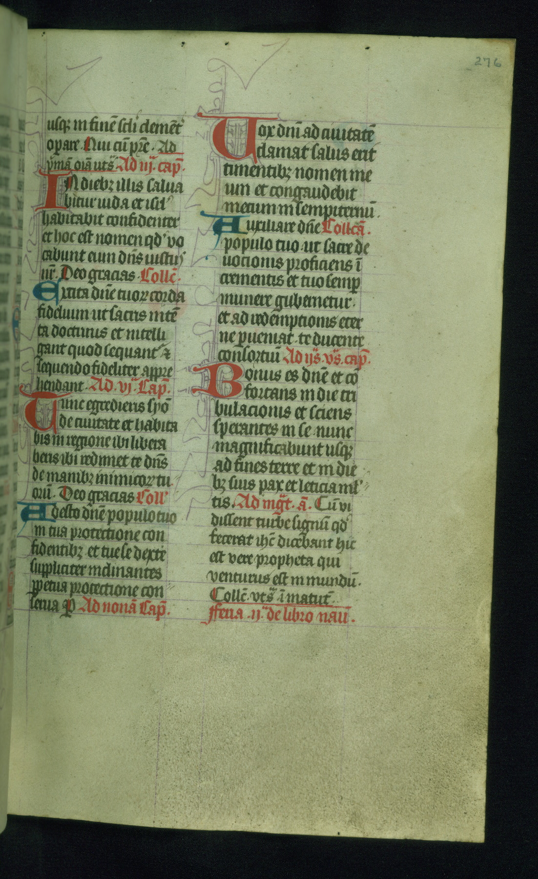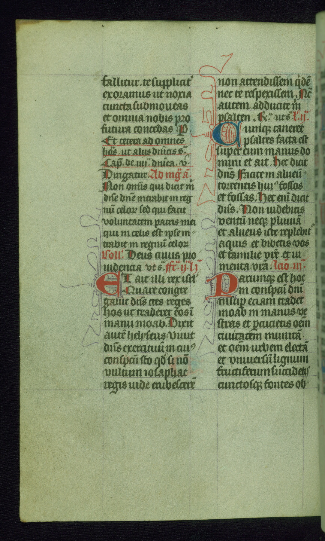 This small breviary, composed of more than 500 folios, is extraordinary for its length, considering it is the summer portion of a two-volume breviary for the use of Liège. The manuscript was completed for ecclesiastical use at the Cathedral of Notre-Dame and St.-Lambert in Liège ca. 1420. This attribution is suggested, for instance, by the petitions to the congregation of this cathedral (fols. 114v-117v), as well as the armorial shield of the family of Surlet de Chokier of Liège represented at the opening of the Psalms. The manuscript has modest, but interesting, decoration with historiated and decorated initials marking the liturgical texts, and occasional angels playing instruments in the margins. The most notable pictorial effect is found in the initials inhabited by transparent figures on rich blue ground. The technique is found, for instance, on fol. 156r with the gold monstrance held by translucent angels for the feast of the Corpus Christi.