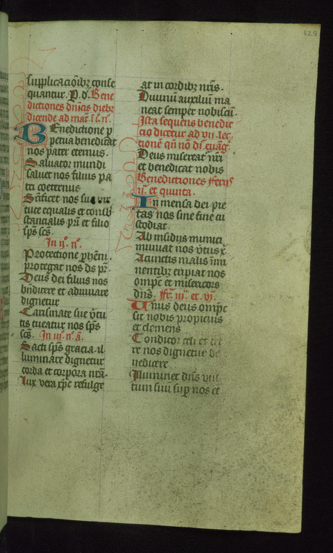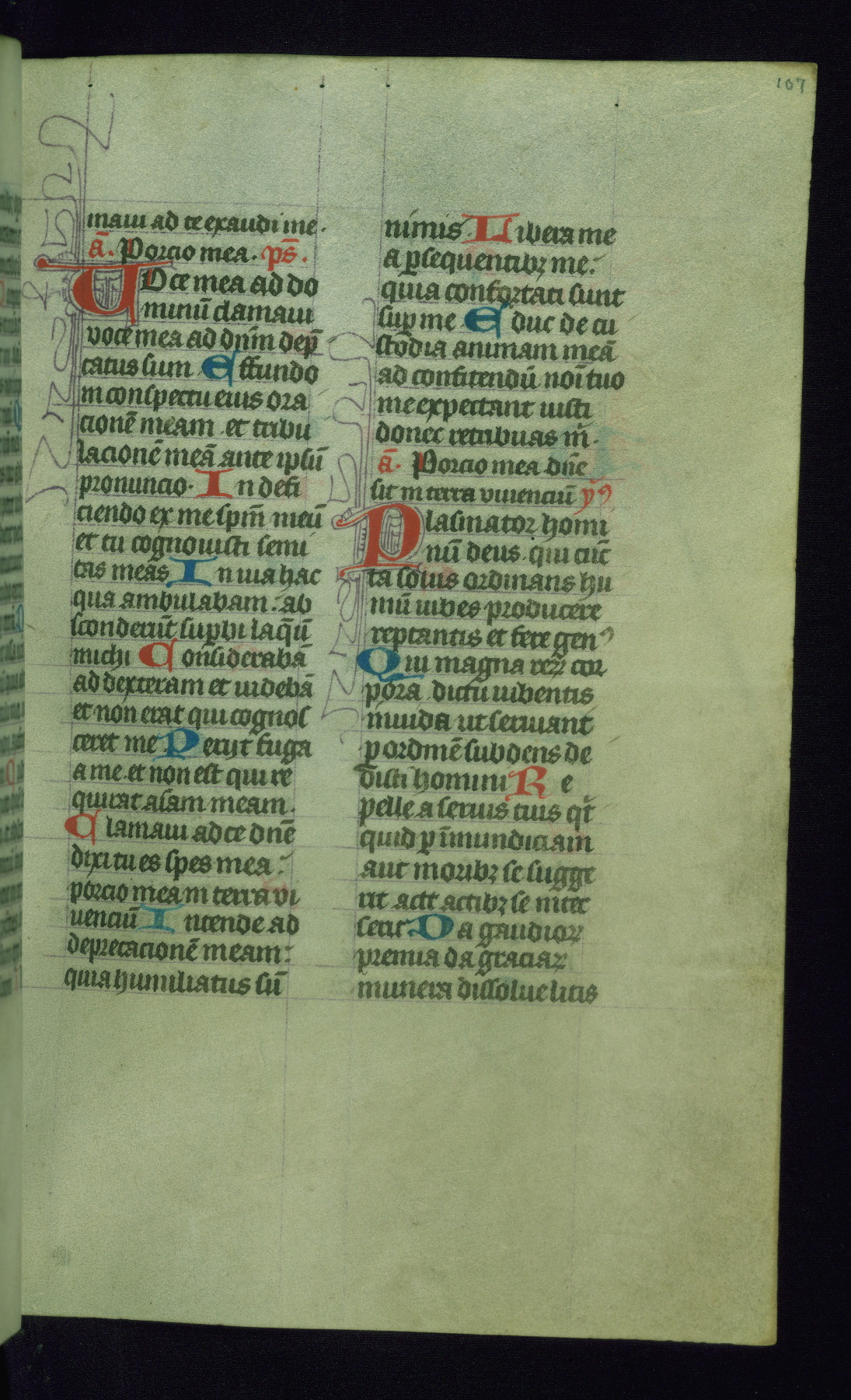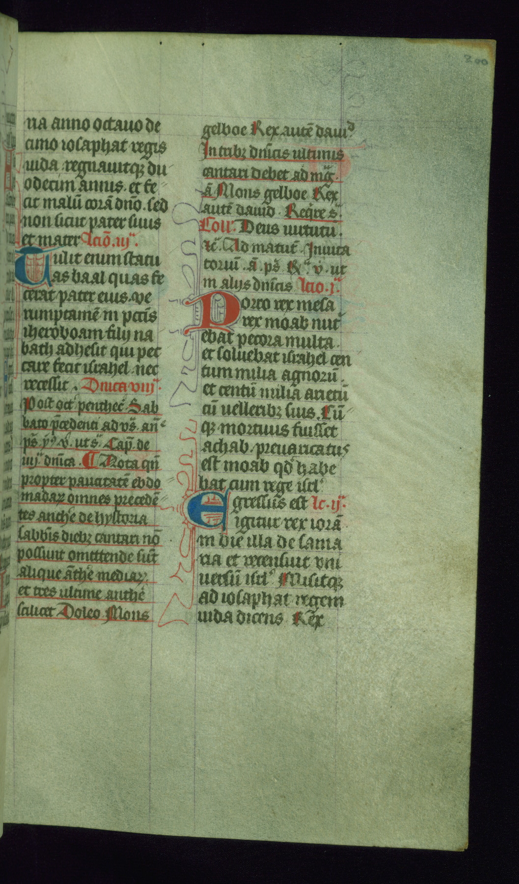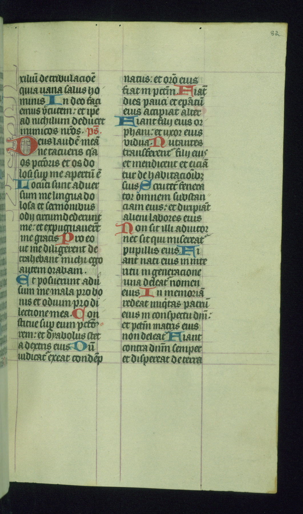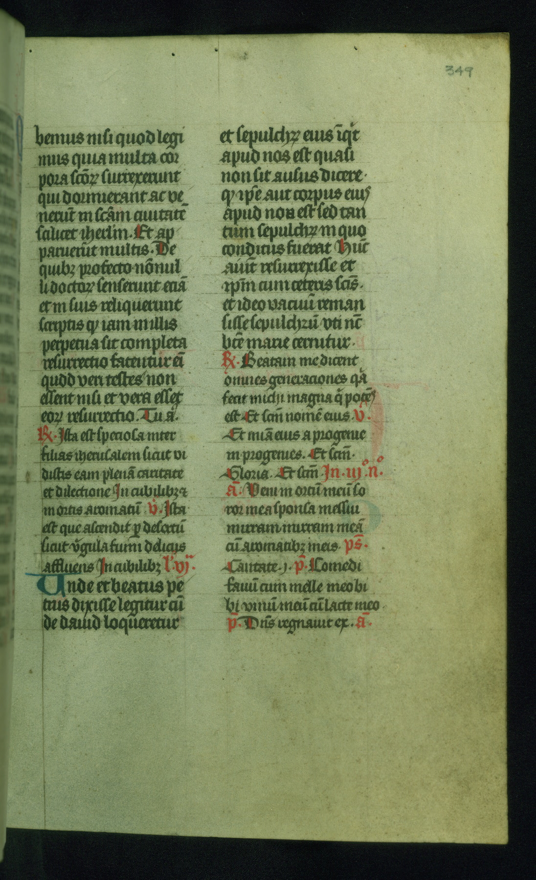 This small breviary, composed of more than 500 folios, is extraordinary for its length, considering it is the summer portion of a two-volume breviary for the use of Liège. The manuscript was completed for ecclesiastical use at the Cathedral of Notre-Dame and St.-Lambert in Liège ca. 1420. This attribution is suggested, for instance, by the petitions to the congregation of this cathedral (fols. 114v-117v), as well as the armorial shield of the family of Surlet de Chokier of Liège represented at the opening of the Psalms. The manuscript has modest, but interesting, decoration with historiated and decorated initials marking the liturgical texts, and occasional angels playing instruments in the margins. The most notable pictorial effect is found in the initials inhabited by transparent figures on rich blue ground. The technique is found, for instance, on fol. 156r with the gold monstrance held by translucent angels for the feast of the Corpus Christi.