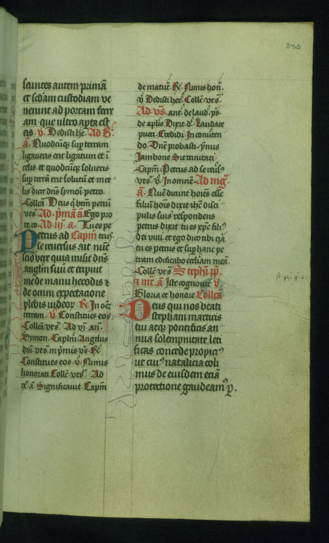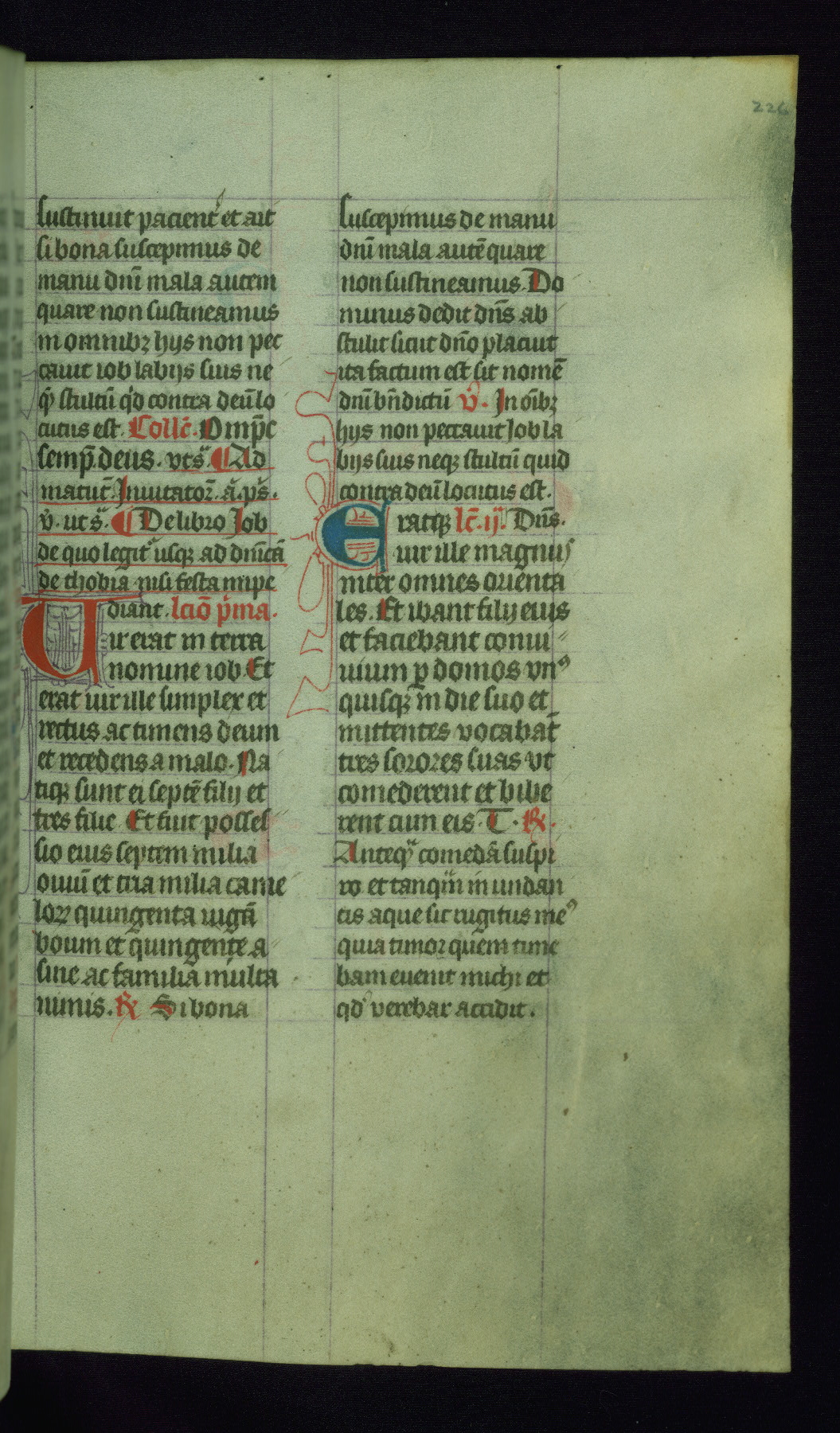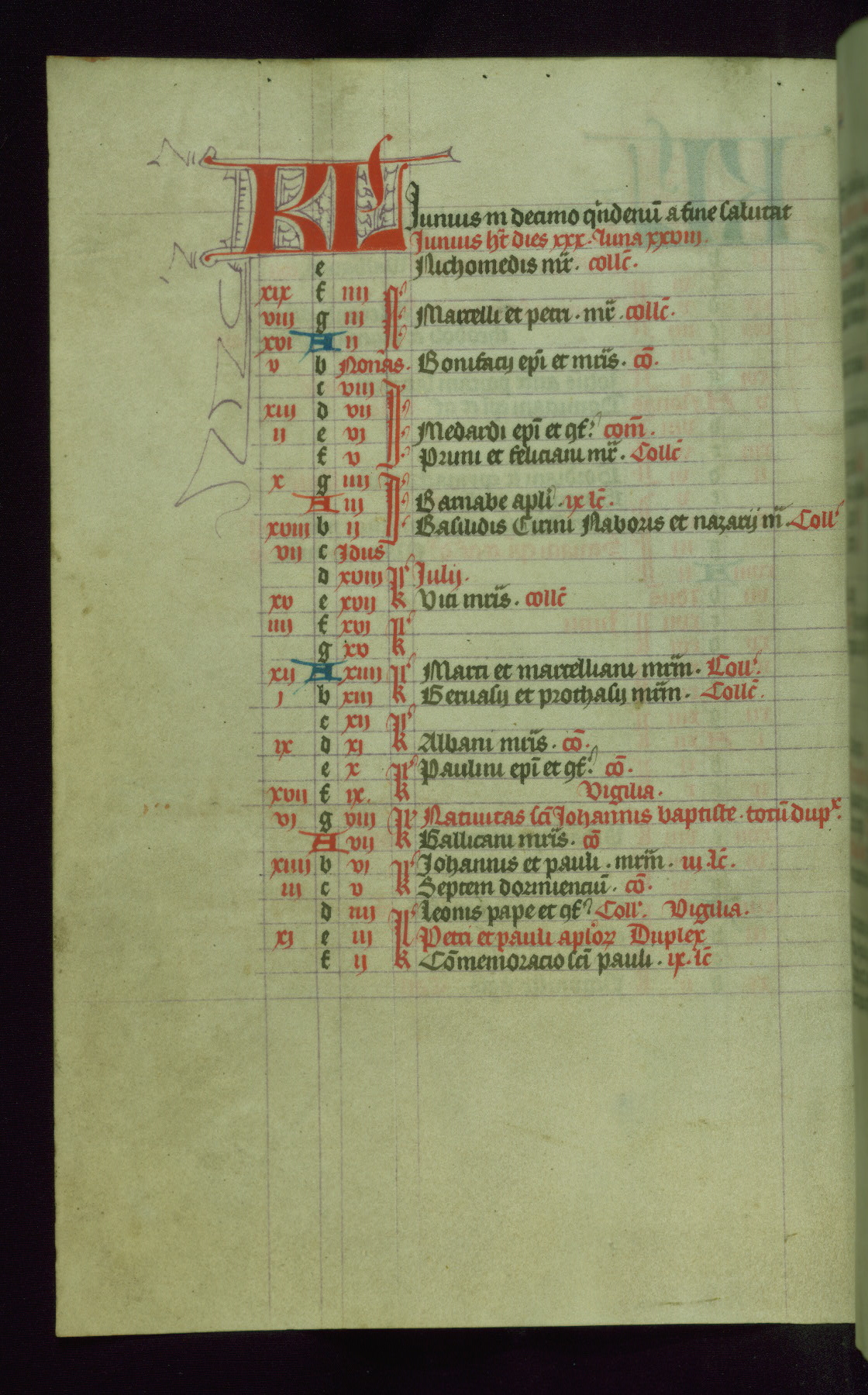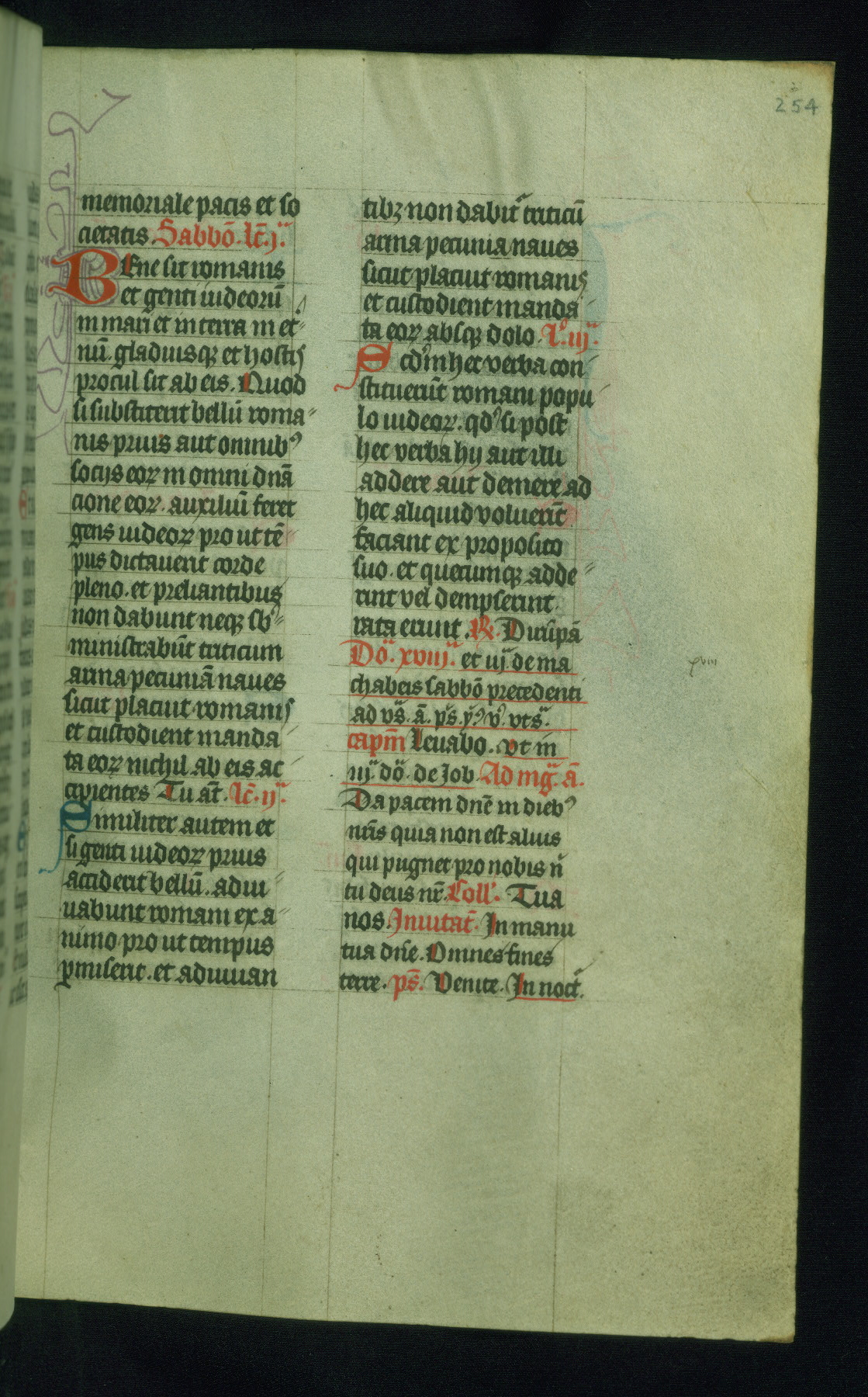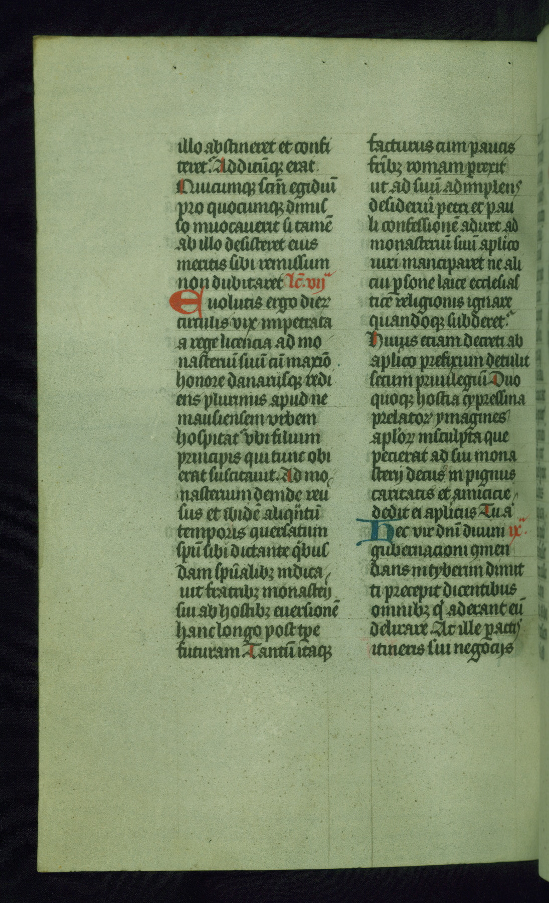 This small breviary, composed of more than 500 folios, is extraordinary for its length, considering it is the summer portion of a two-volume breviary for the use of Liège. The manuscript was completed for ecclesiastical use at the Cathedral of Notre-Dame and St.-Lambert in Liège ca. 1420. This attribution is suggested, for instance, by the petitions to the congregation of this cathedral (fols. 114v-117v), as well as the armorial shield of the family of Surlet de Chokier of Liège represented at the opening of the Psalms. The manuscript has modest, but interesting, decoration with historiated and decorated initials marking the liturgical texts, and occasional angels playing instruments in the margins. The most notable pictorial effect is found in the initials inhabited by transparent figures on rich blue ground. The technique is found, for instance, on fol. 156r with the gold monstrance held by translucent angels for the feast of the Corpus Christi.