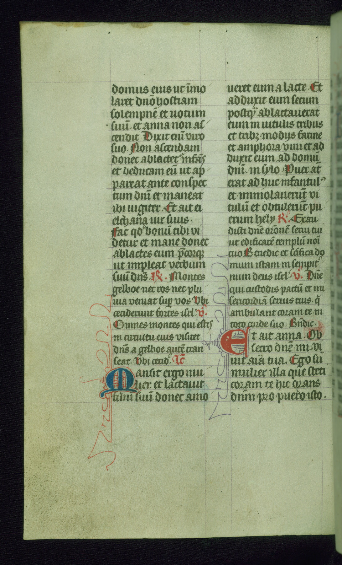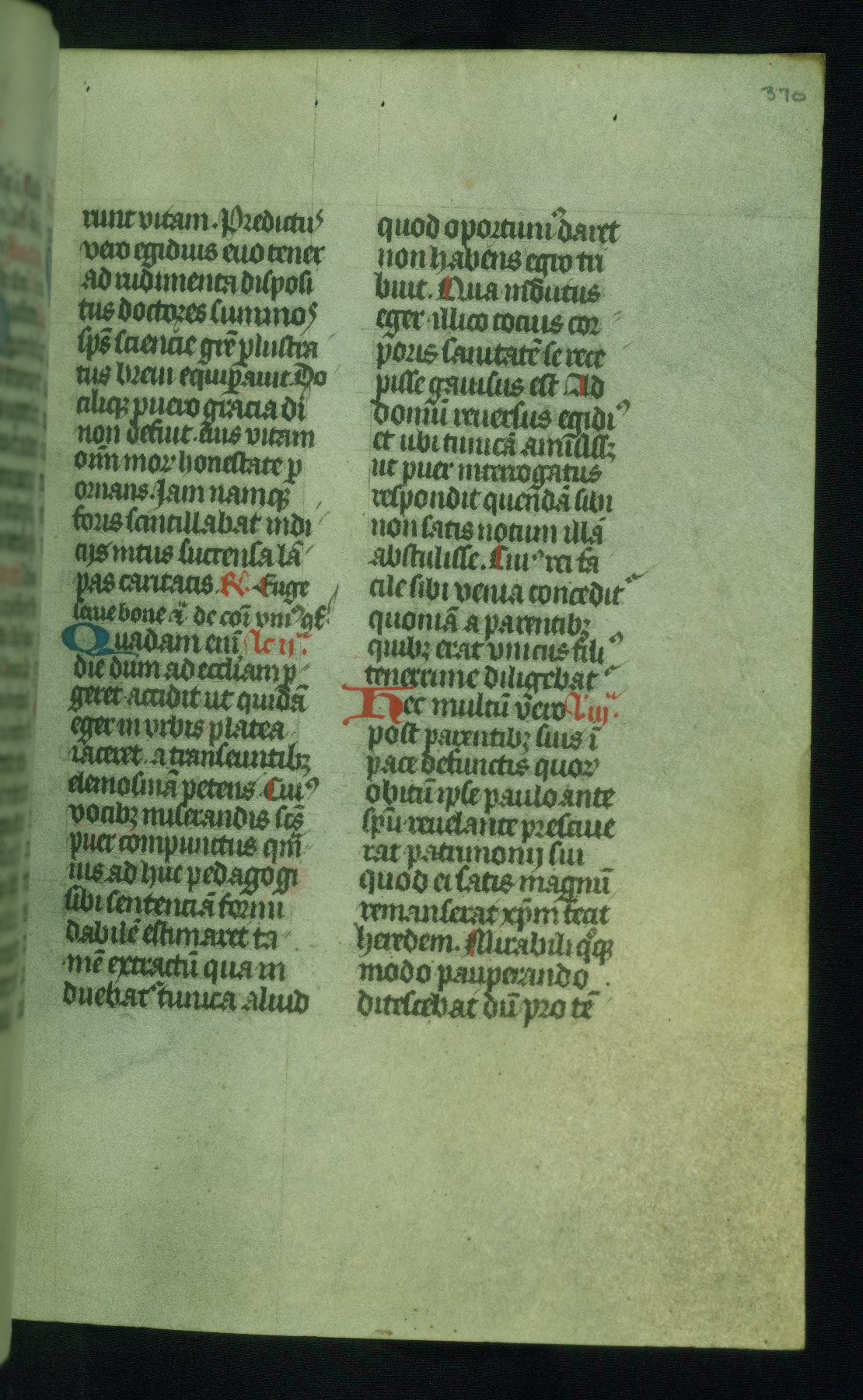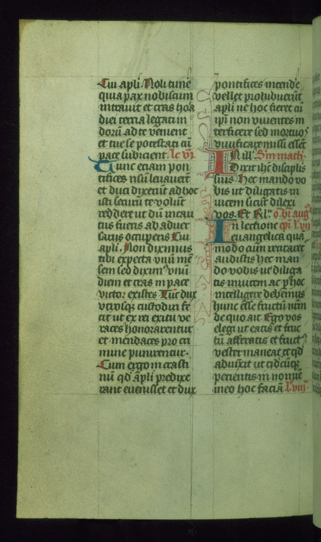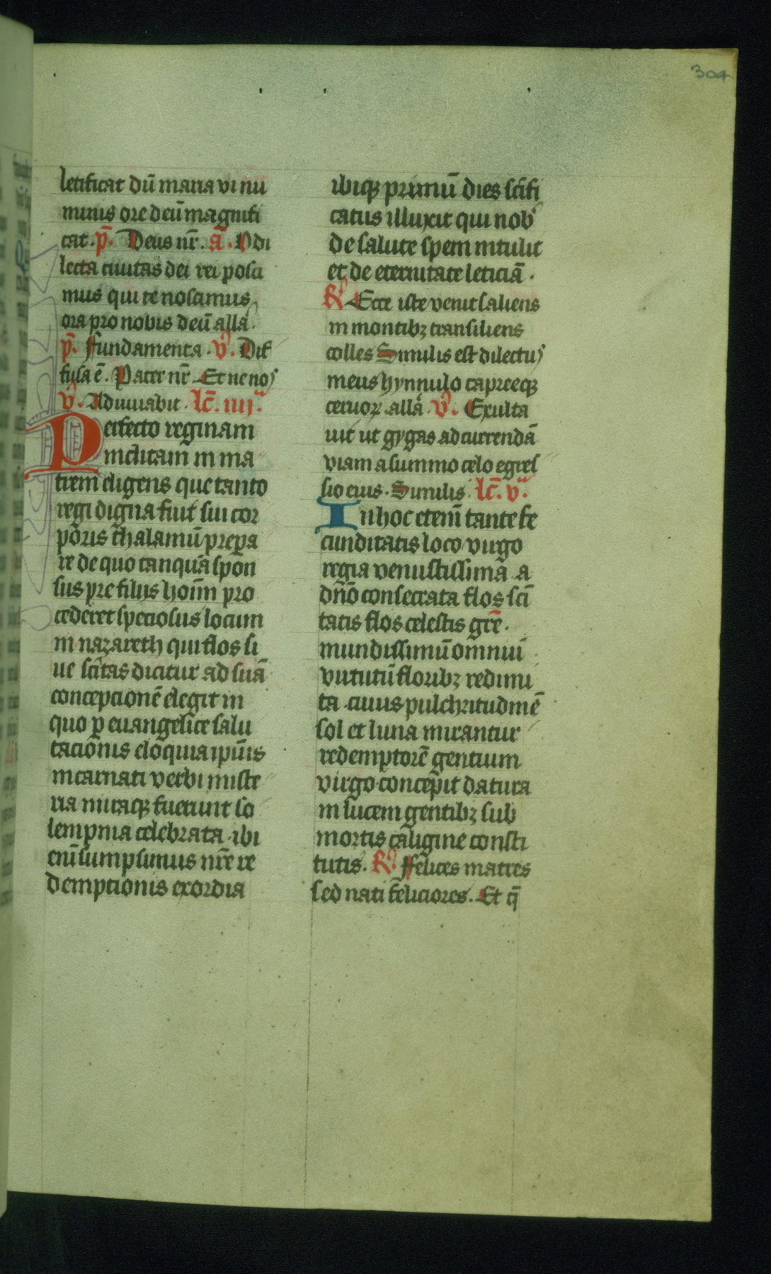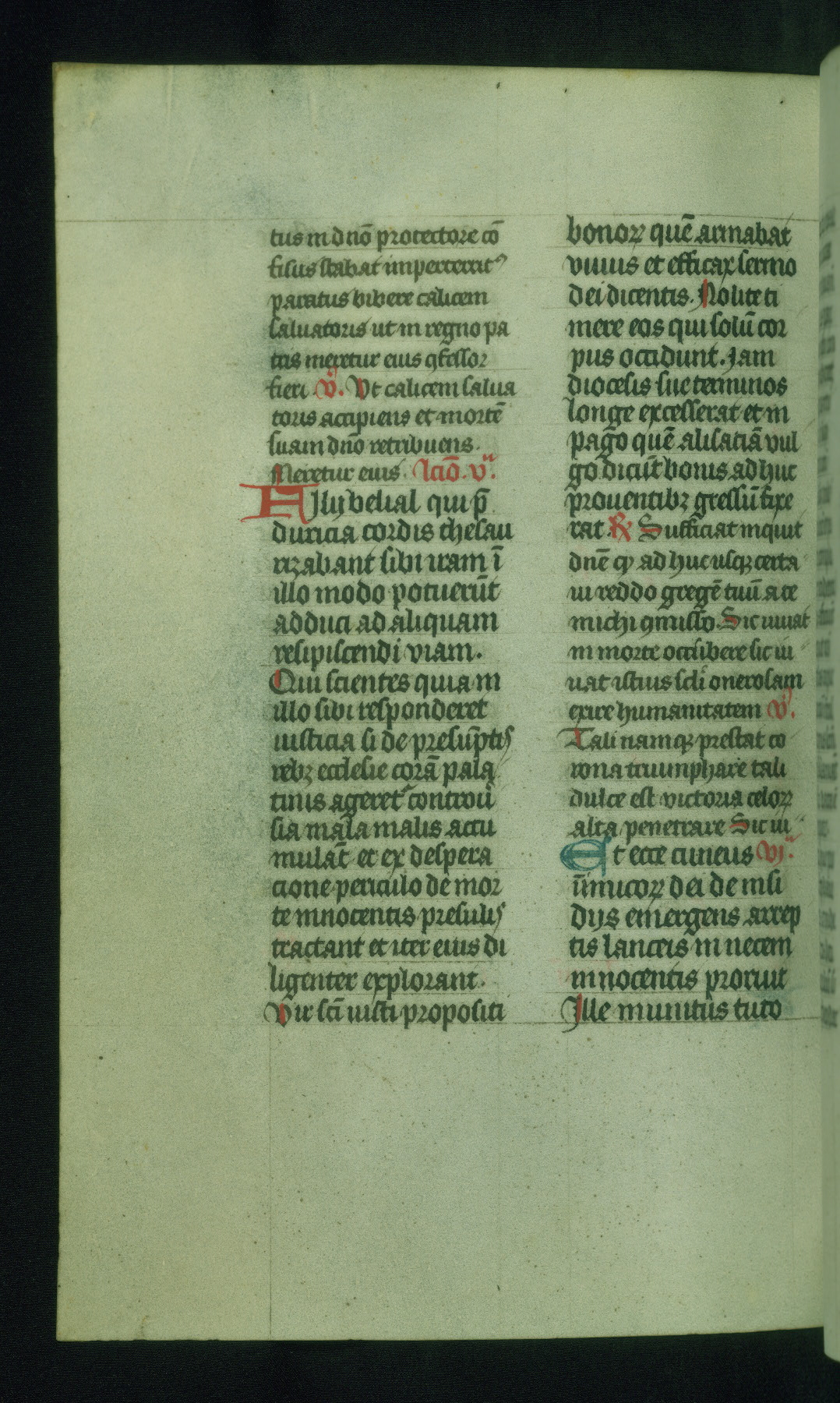 This small breviary, composed of more than 500 folios, is extraordinary for its length, considering it is the summer portion of a two-volume breviary for the use of Liège. The manuscript was completed for ecclesiastical use at the Cathedral of Notre-Dame and St.-Lambert in Liège ca. 1420. This attribution is suggested, for instance, by the petitions to the congregation of this cathedral (fols. 114v-117v), as well as the armorial shield of the family of Surlet de Chokier of Liège represented at the opening of the Psalms. The manuscript has modest, but interesting, decoration with historiated and decorated initials marking the liturgical texts, and occasional angels playing instruments in the margins. The most notable pictorial effect is found in the initials inhabited by transparent figures on rich blue ground. The technique is found, for instance, on fol. 156r with the gold monstrance held by translucent angels for the feast of the Corpus Christi.