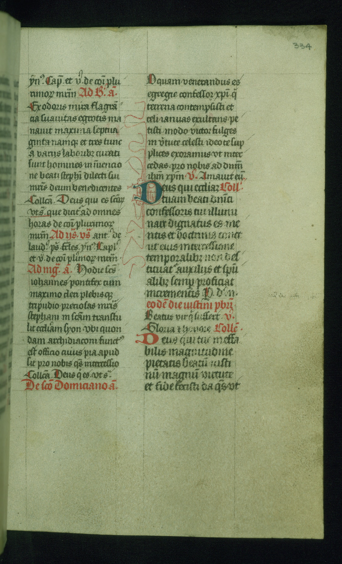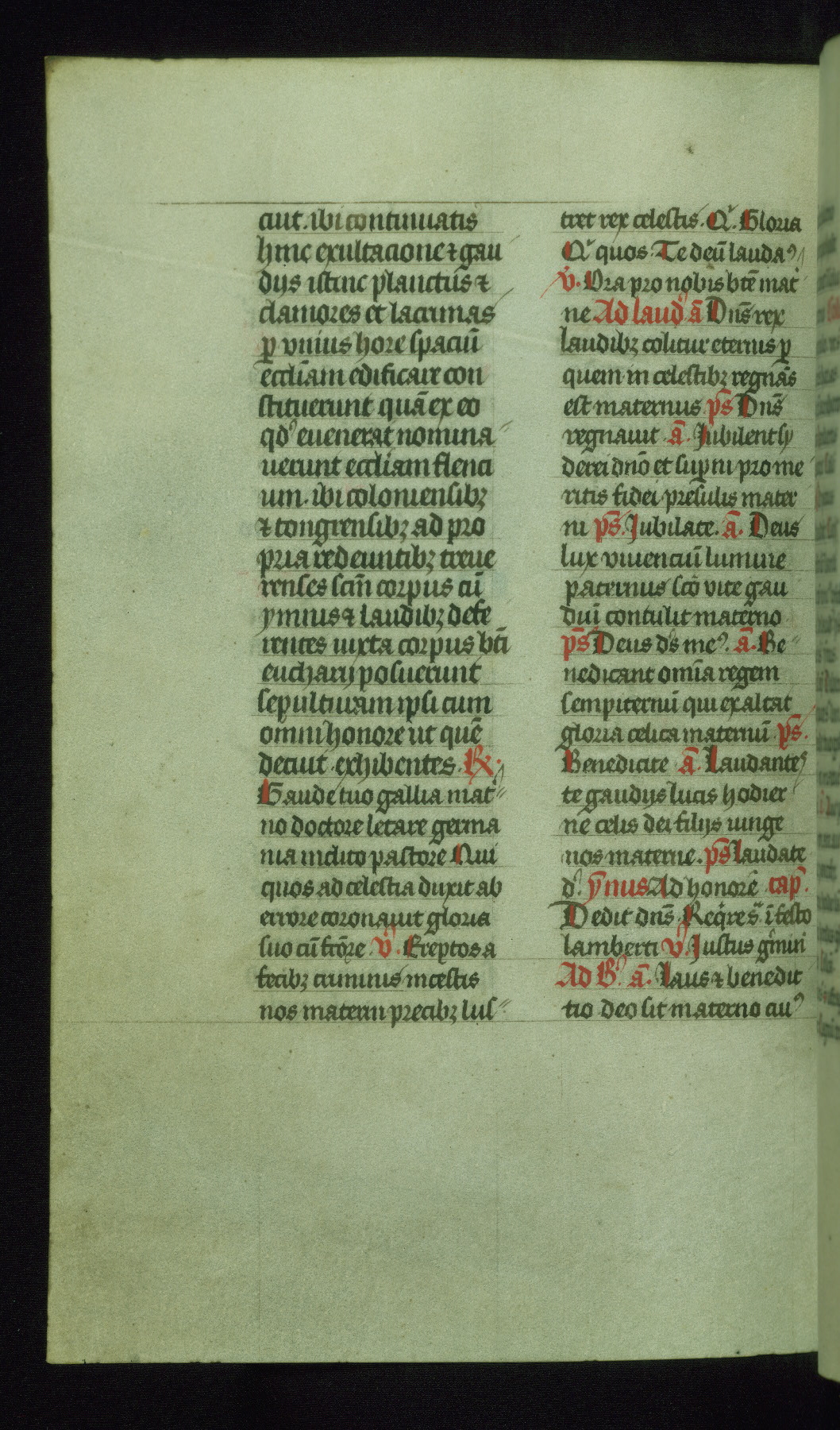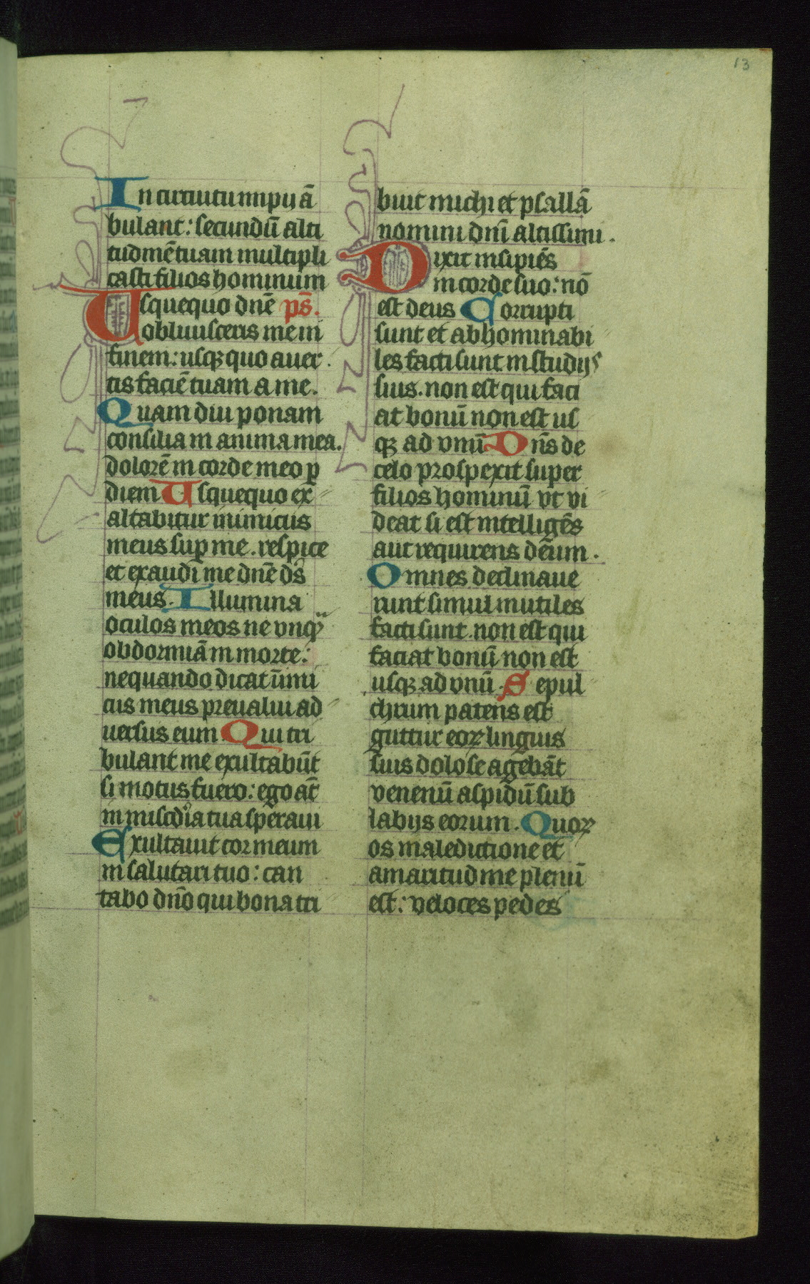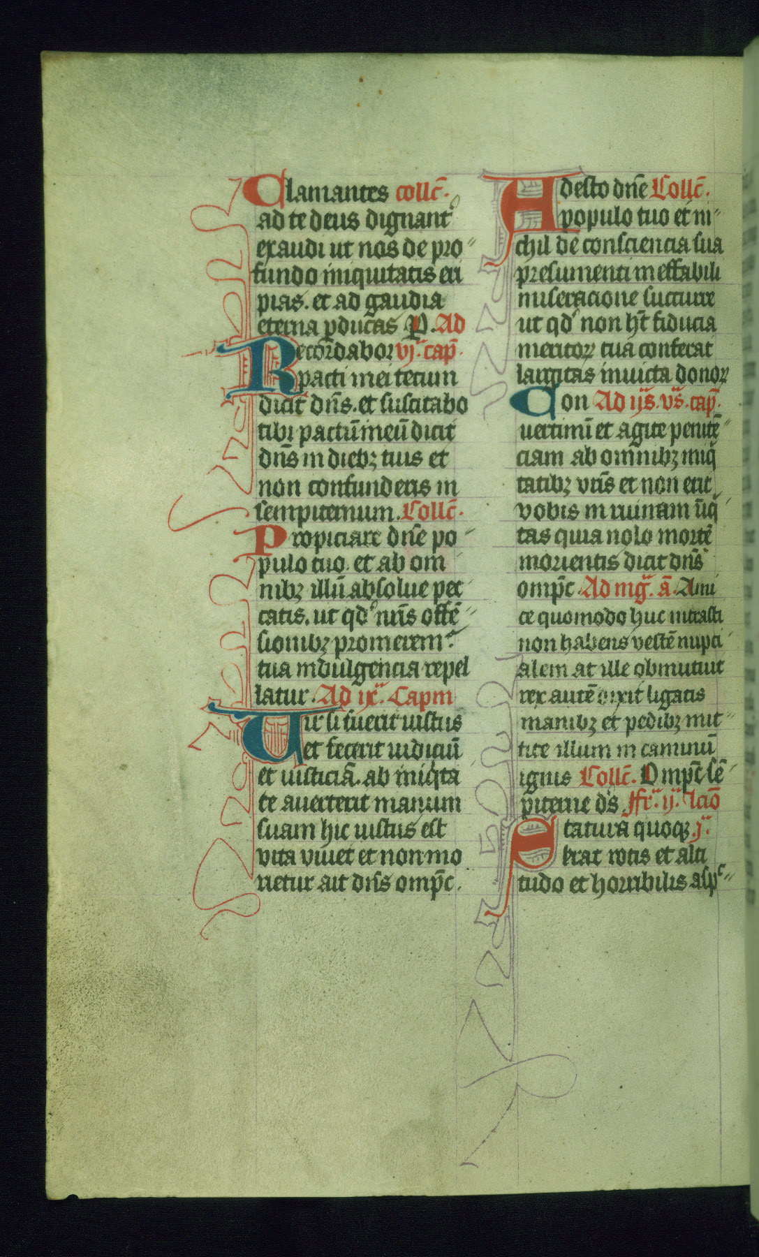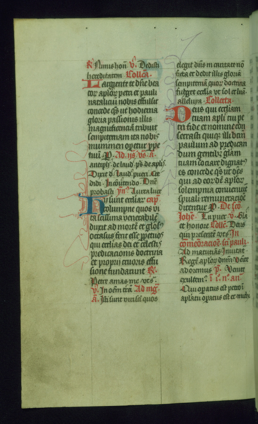 This small breviary, composed of more than 500 folios, is extraordinary for its length, considering it is the summer portion of a two-volume breviary for the use of Liège. The manuscript was completed for ecclesiastical use at the Cathedral of Notre-Dame and St.-Lambert in Liège ca. 1420. This attribution is suggested, for instance, by the petitions to the congregation of this cathedral (fols. 114v-117v), as well as the armorial shield of the family of Surlet de Chokier of Liège represented at the opening of the Psalms. The manuscript has modest, but interesting, decoration with historiated and decorated initials marking the liturgical texts, and occasional angels playing instruments in the margins. The most notable pictorial effect is found in the initials inhabited by transparent figures on rich blue ground. The technique is found, for instance, on fol. 156r with the gold monstrance held by translucent angels for the feast of the Corpus Christi.