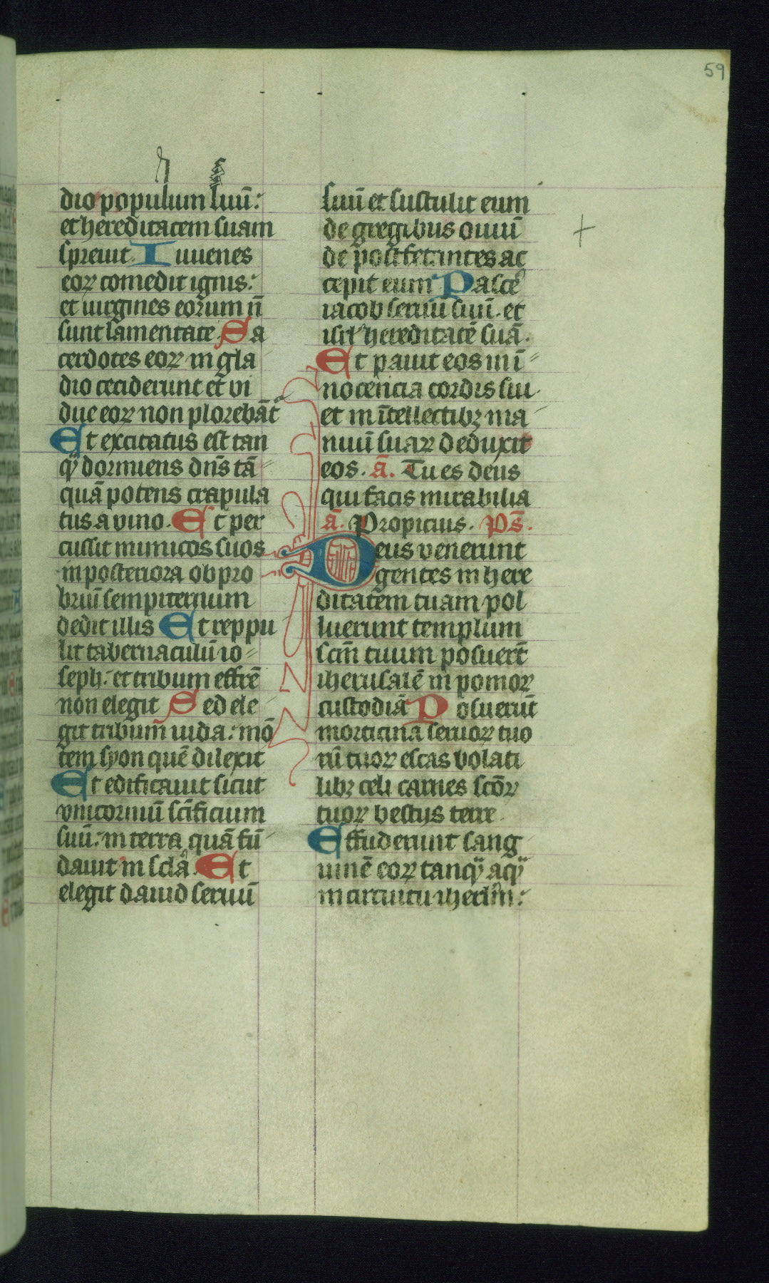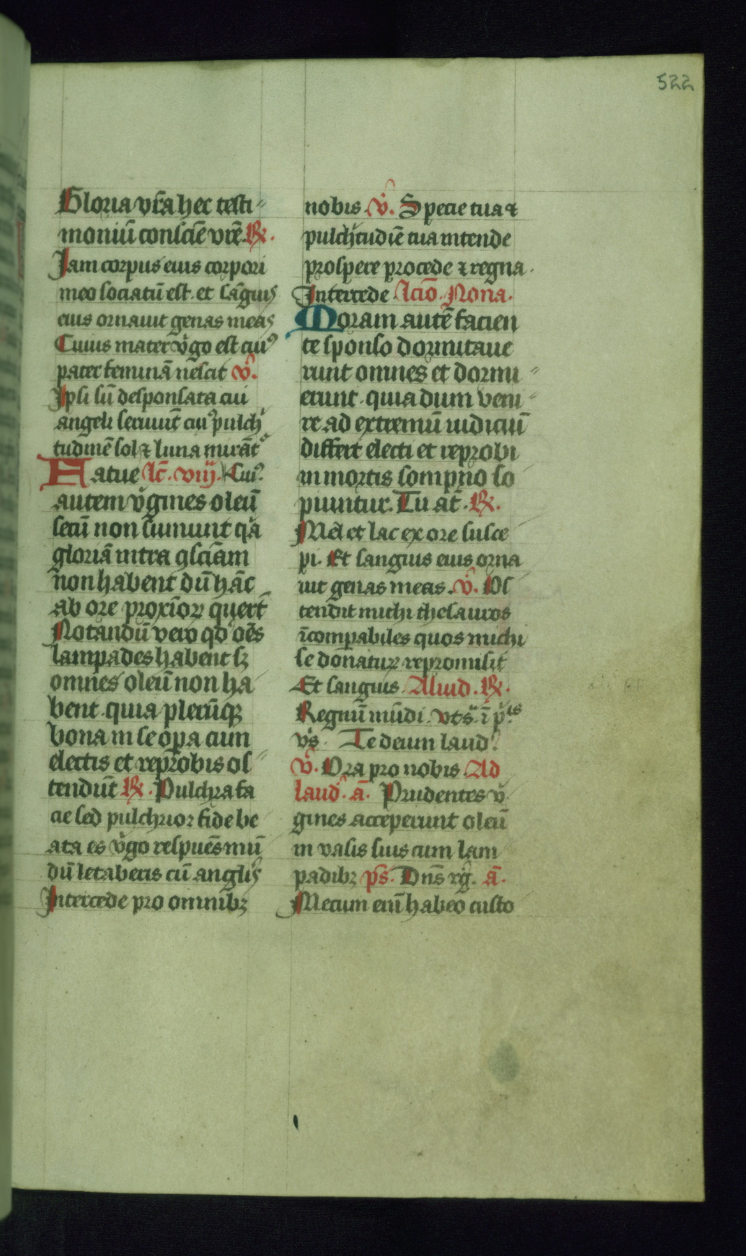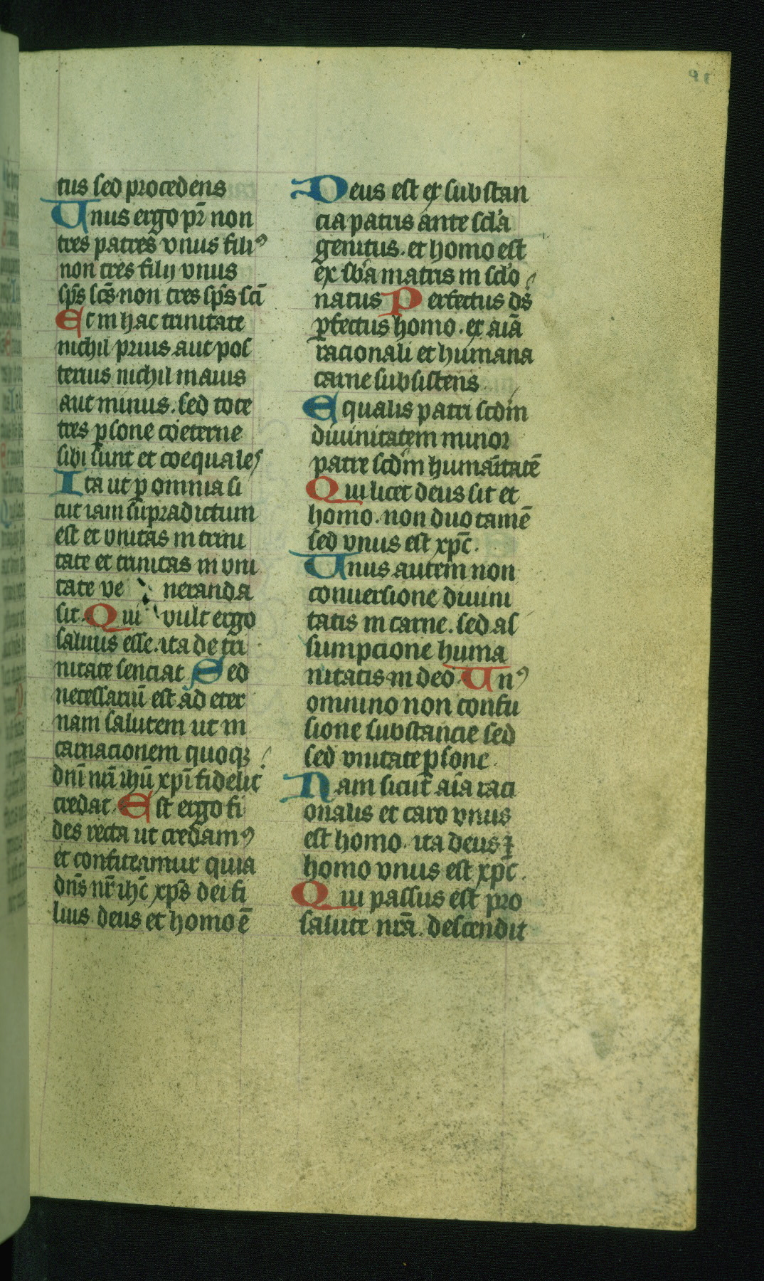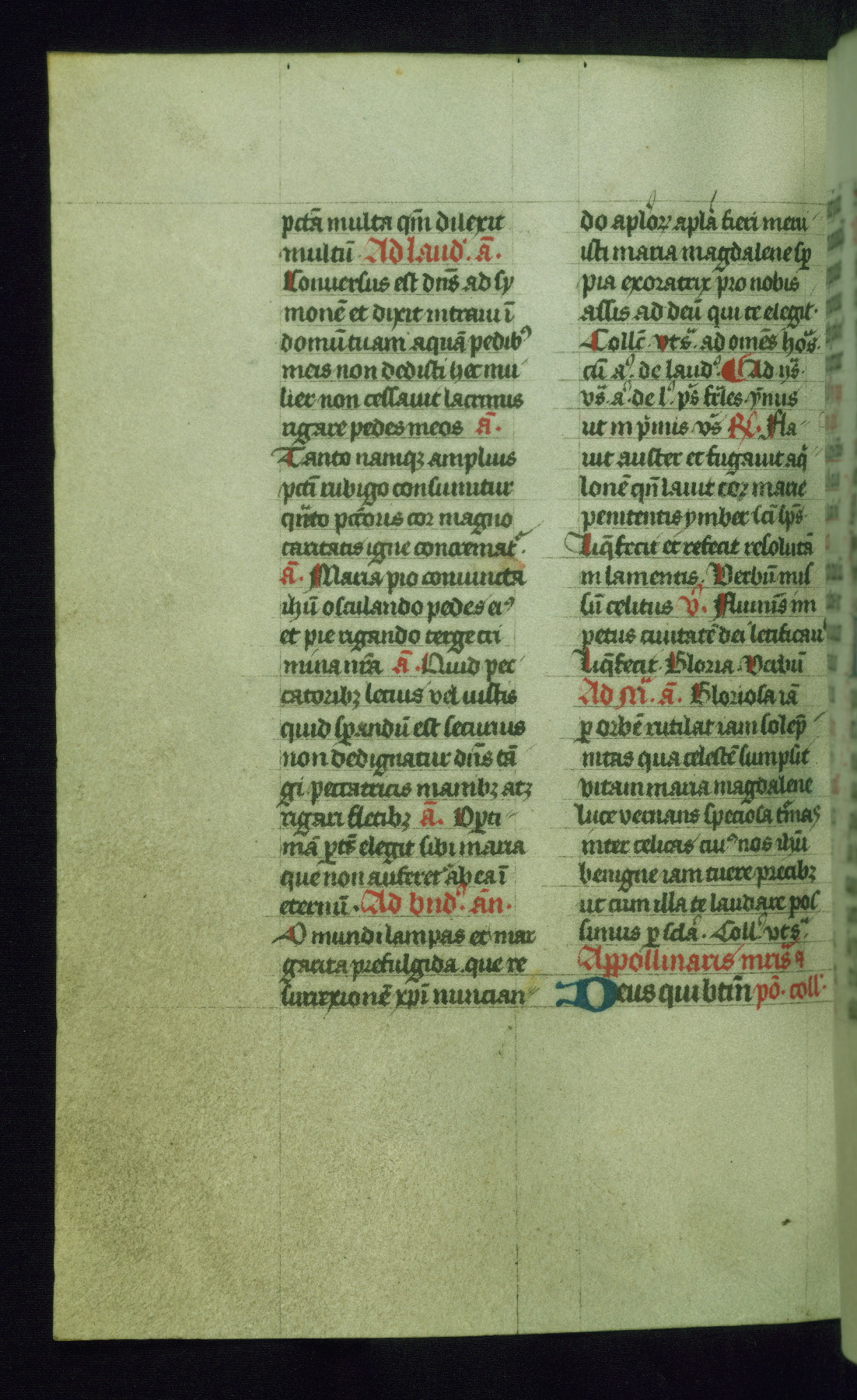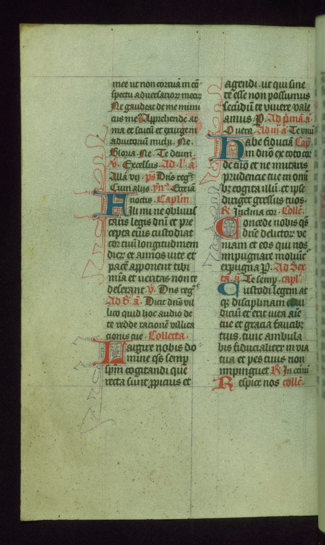 This small breviary, composed of more than 500 folios, is extraordinary for its length, considering it is the summer portion of a two-volume breviary for the use of Liège. The manuscript was completed for ecclesiastical use at the Cathedral of Notre-Dame and St.-Lambert in Liège ca. 1420. This attribution is suggested, for instance, by the petitions to the congregation of this cathedral (fols. 114v-117v), as well as the armorial shield of the family of Surlet de Chokier of Liège represented at the opening of the Psalms. The manuscript has modest, but interesting, decoration with historiated and decorated initials marking the liturgical texts, and occasional angels playing instruments in the margins. The most notable pictorial effect is found in the initials inhabited by transparent figures on rich blue ground. The technique is found, for instance, on fol. 156r with the gold monstrance held by translucent angels for the feast of the Corpus Christi.