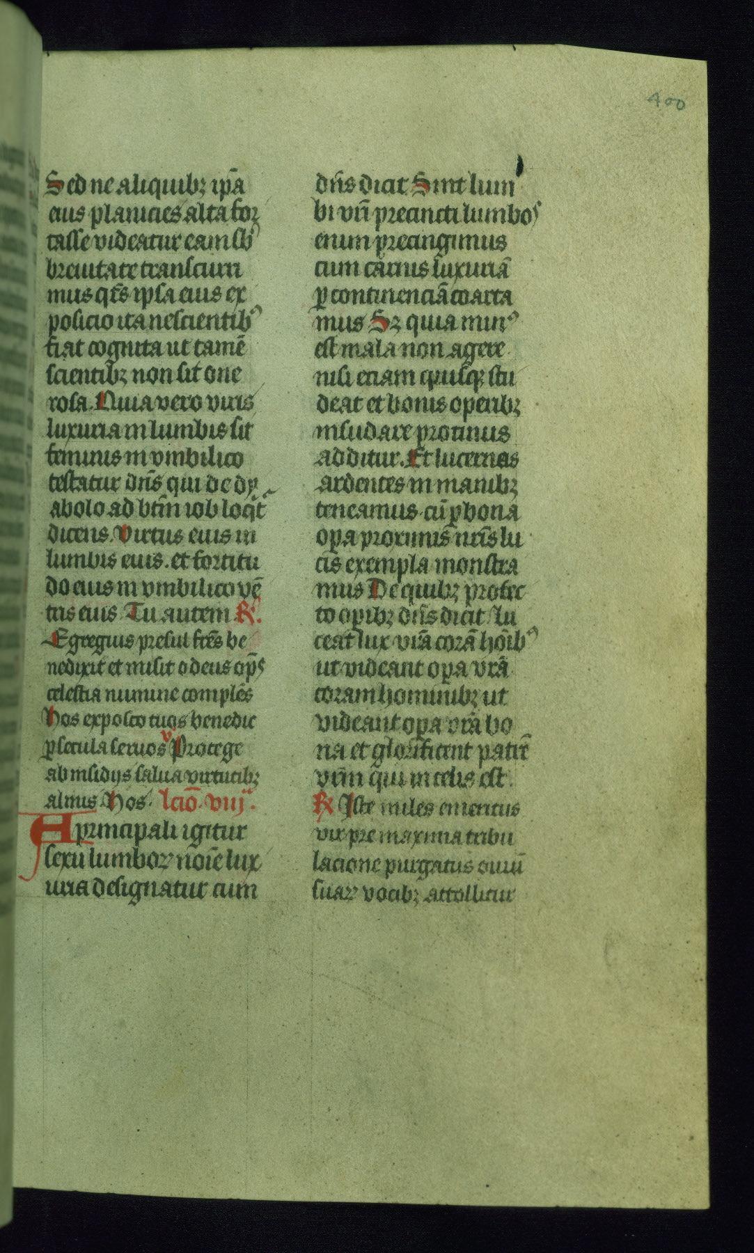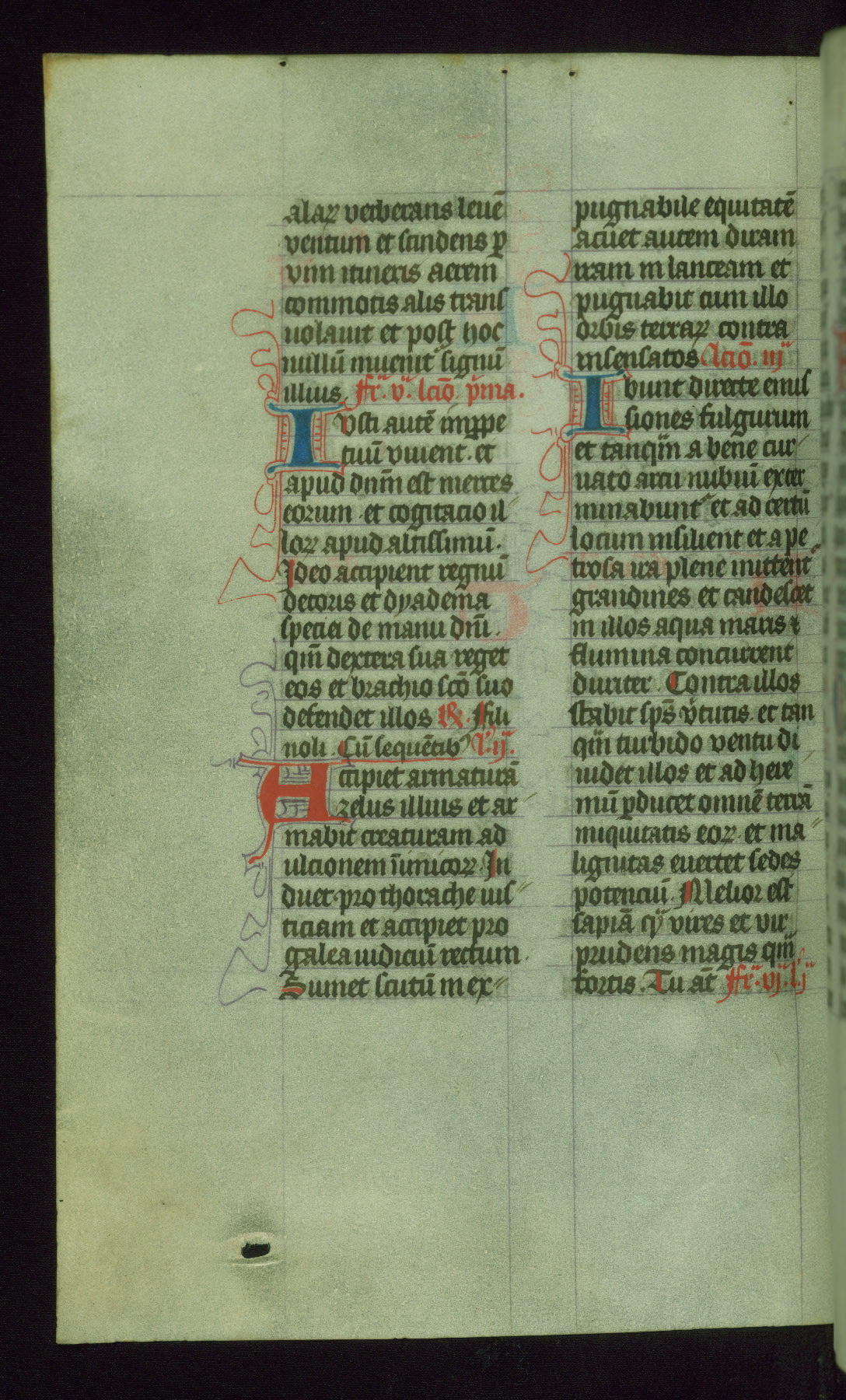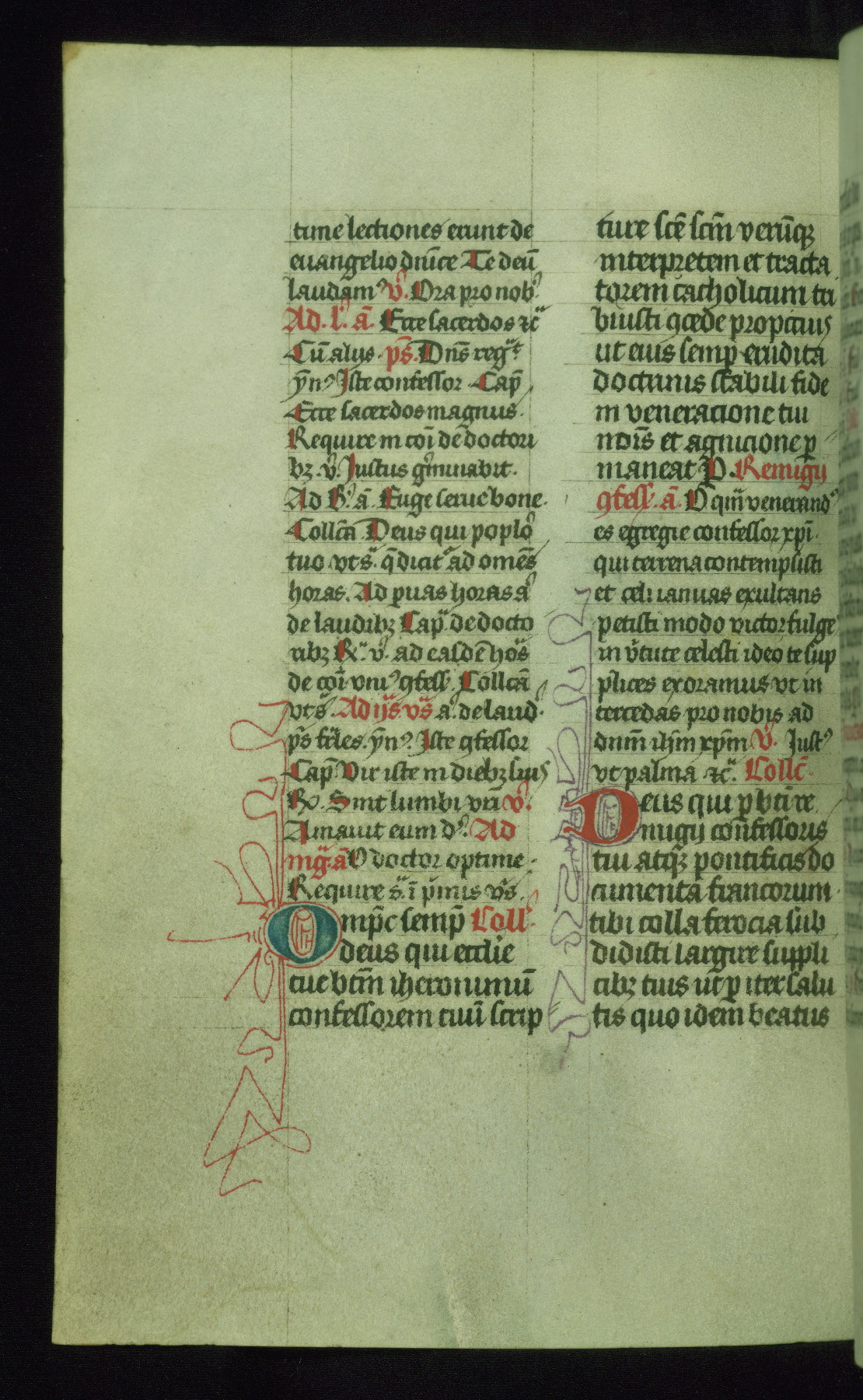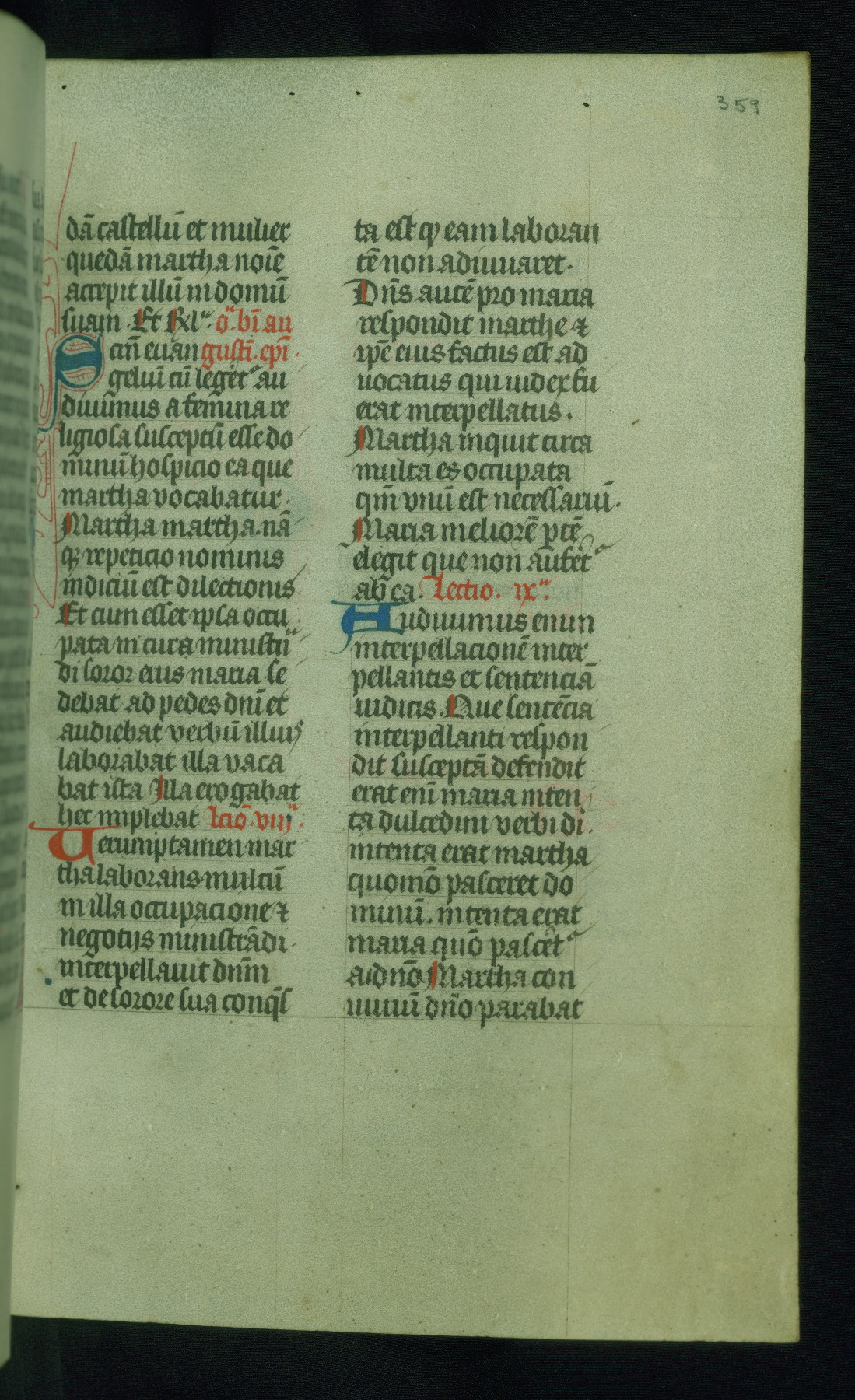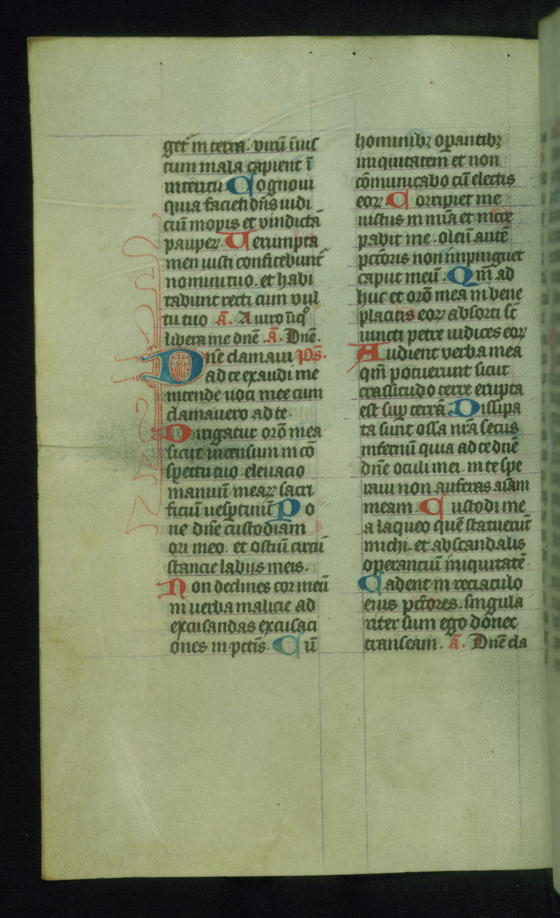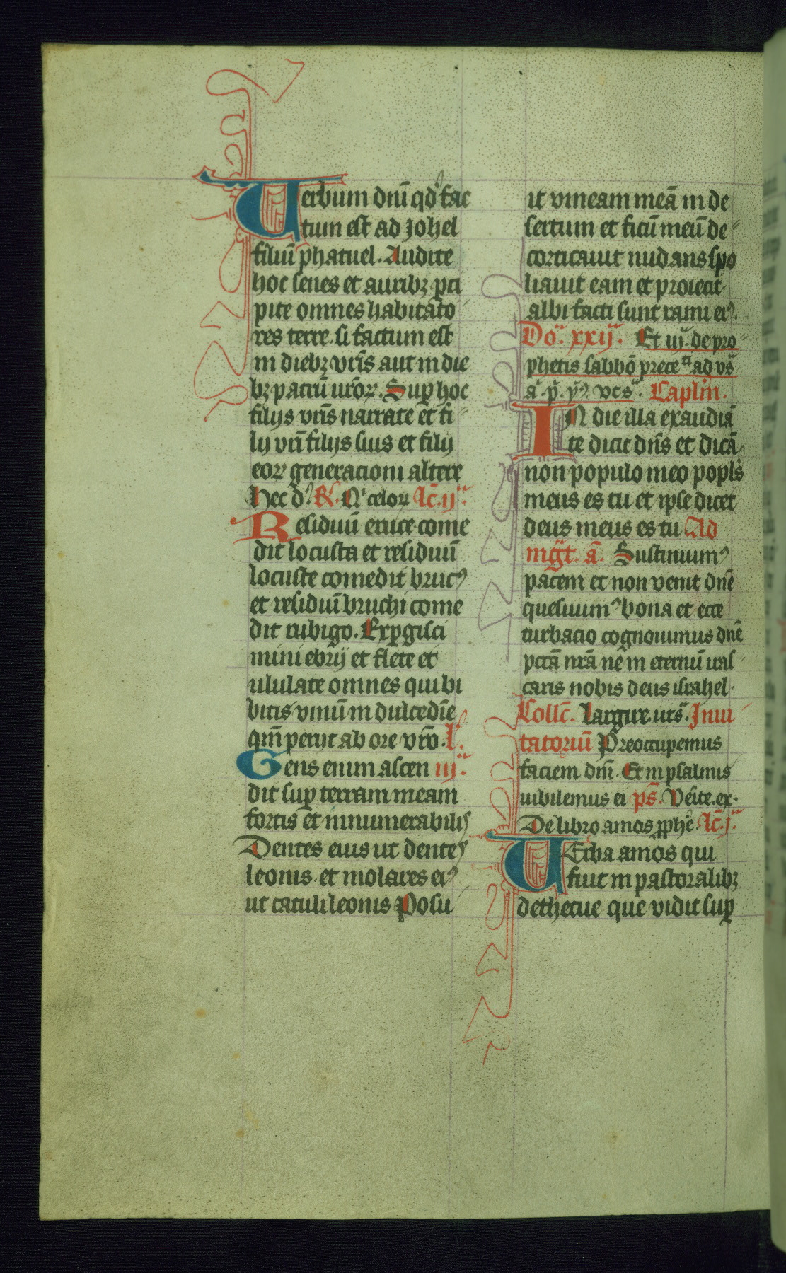 This small breviary, composed of more than 500 folios, is extraordinary for its length, considering it is the summer portion of a two-volume breviary for the use of Liège. The manuscript was completed for ecclesiastical use at the Cathedral of Notre-Dame and St.-Lambert in Liège ca. 1420. This attribution is suggested, for instance, by the petitions to the congregation of this cathedral (fols. 114v-117v), as well as the armorial shield of the family of Surlet de Chokier of Liège represented at the opening of the Psalms. The manuscript has modest, but interesting, decoration with historiated and decorated initials marking the liturgical texts, and occasional angels playing instruments in the margins. The most notable pictorial effect is found in the initials inhabited by transparent figures on rich blue ground. The technique is found, for instance, on fol. 156r with the gold monstrance held by translucent angels for the feast of the Corpus Christi.