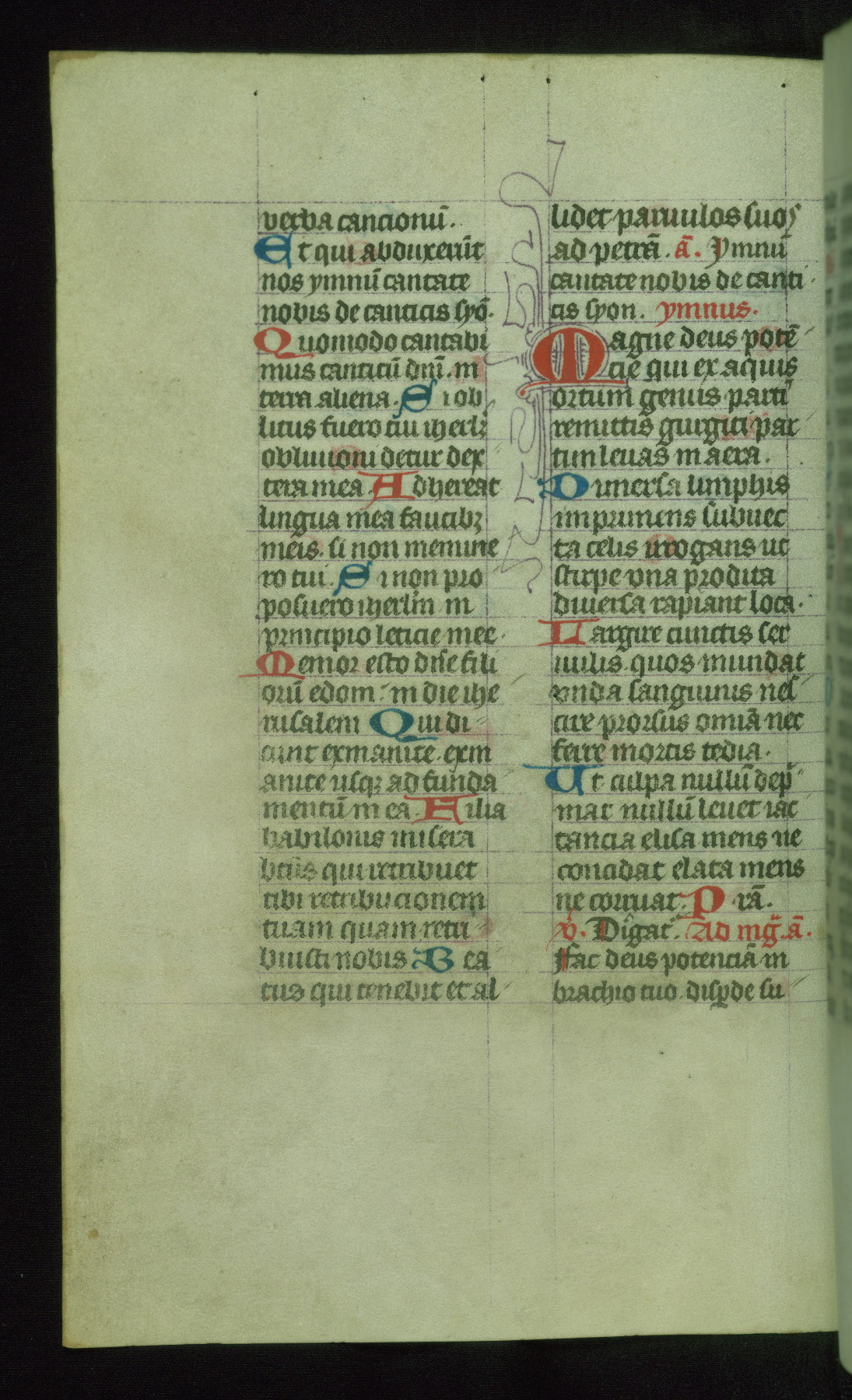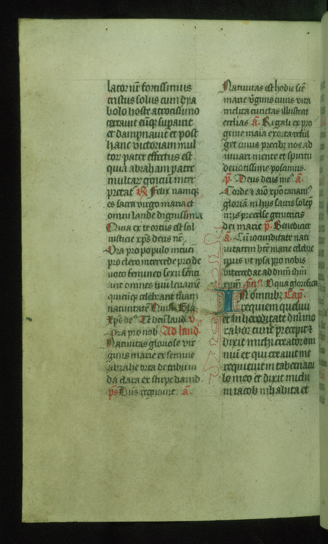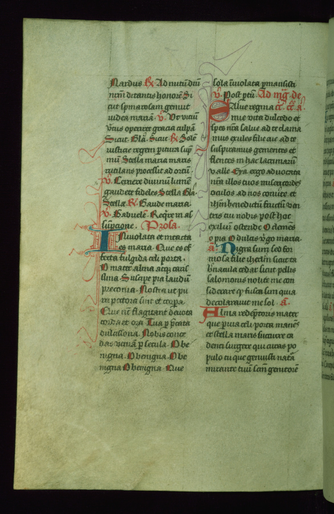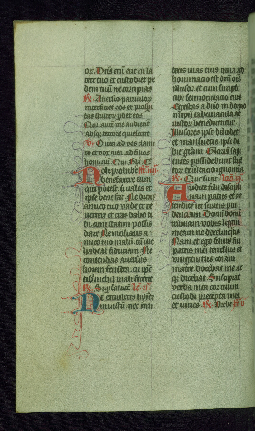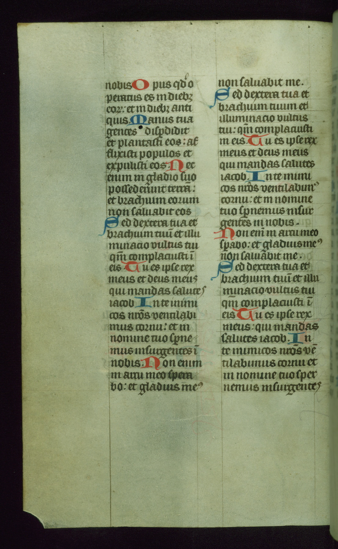 This small breviary, composed of more than 500 folios, is extraordinary for its length, considering it is the summer portion of a two-volume breviary for the use of Liège. The manuscript was completed for ecclesiastical use at the Cathedral of Notre-Dame and St.-Lambert in Liège ca. 1420. This attribution is suggested, for instance, by the petitions to the congregation of this cathedral (fols. 114v-117v), as well as the armorial shield of the family of Surlet de Chokier of Liège represented at the opening of the Psalms. The manuscript has modest, but interesting, decoration with historiated and decorated initials marking the liturgical texts, and occasional angels playing instruments in the margins. The most notable pictorial effect is found in the initials inhabited by transparent figures on rich blue ground. The technique is found, for instance, on fol. 156r with the gold monstrance held by translucent angels for the feast of the Corpus Christi.