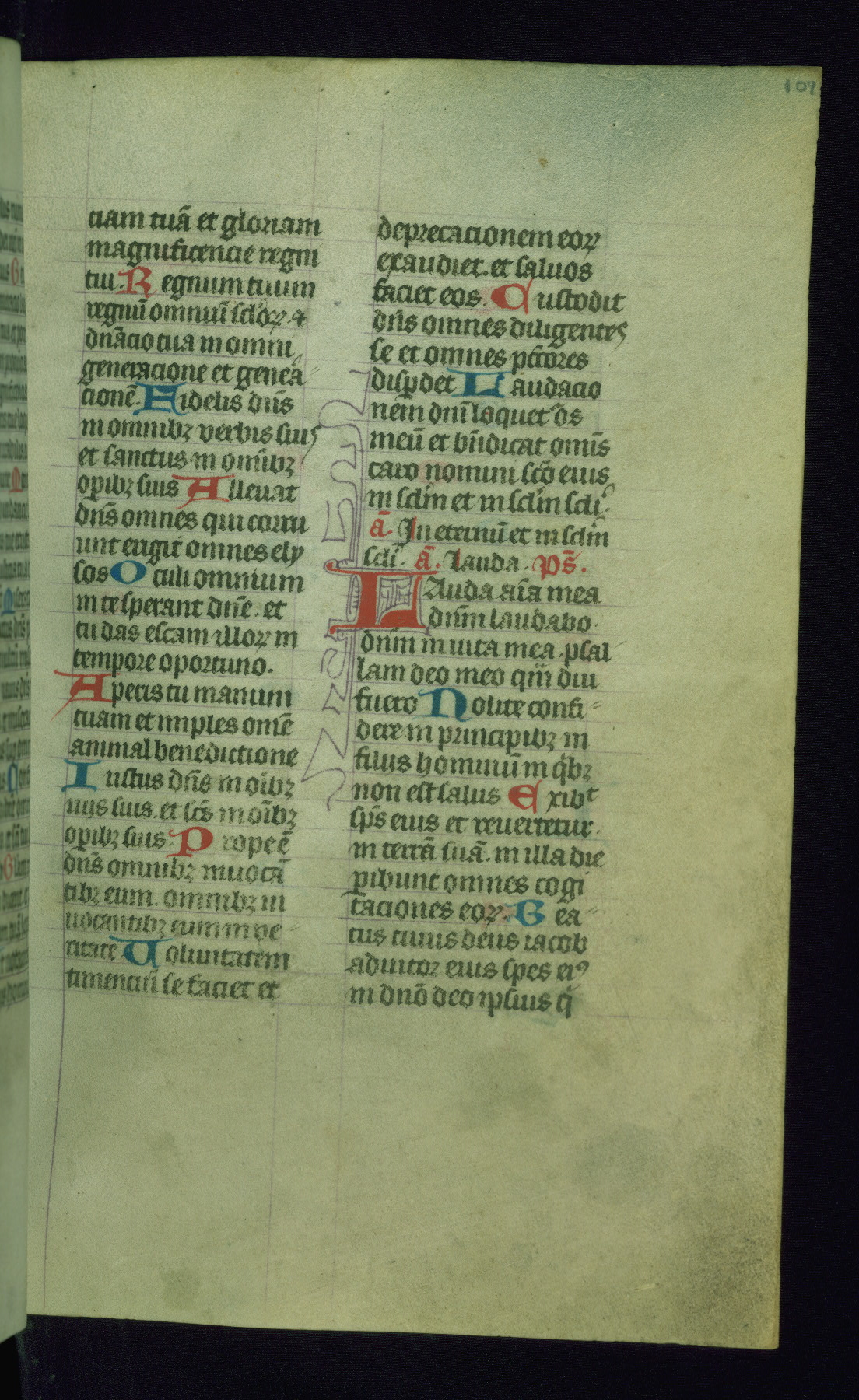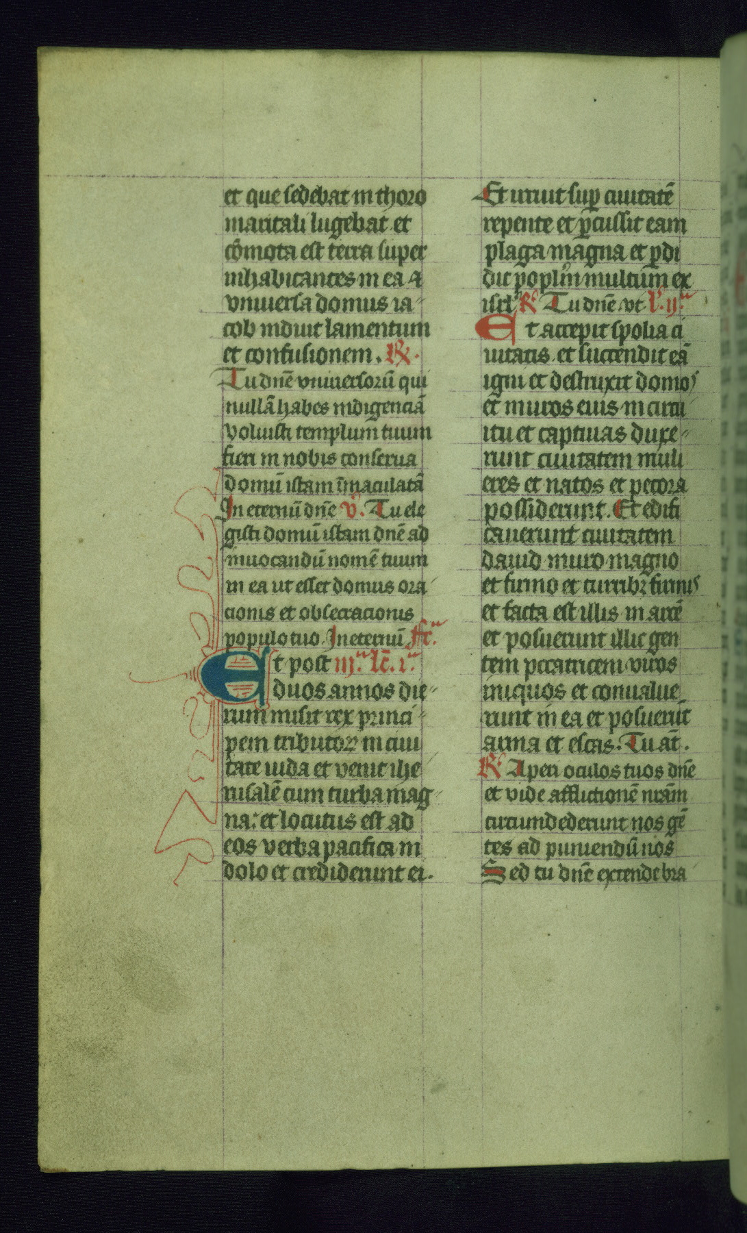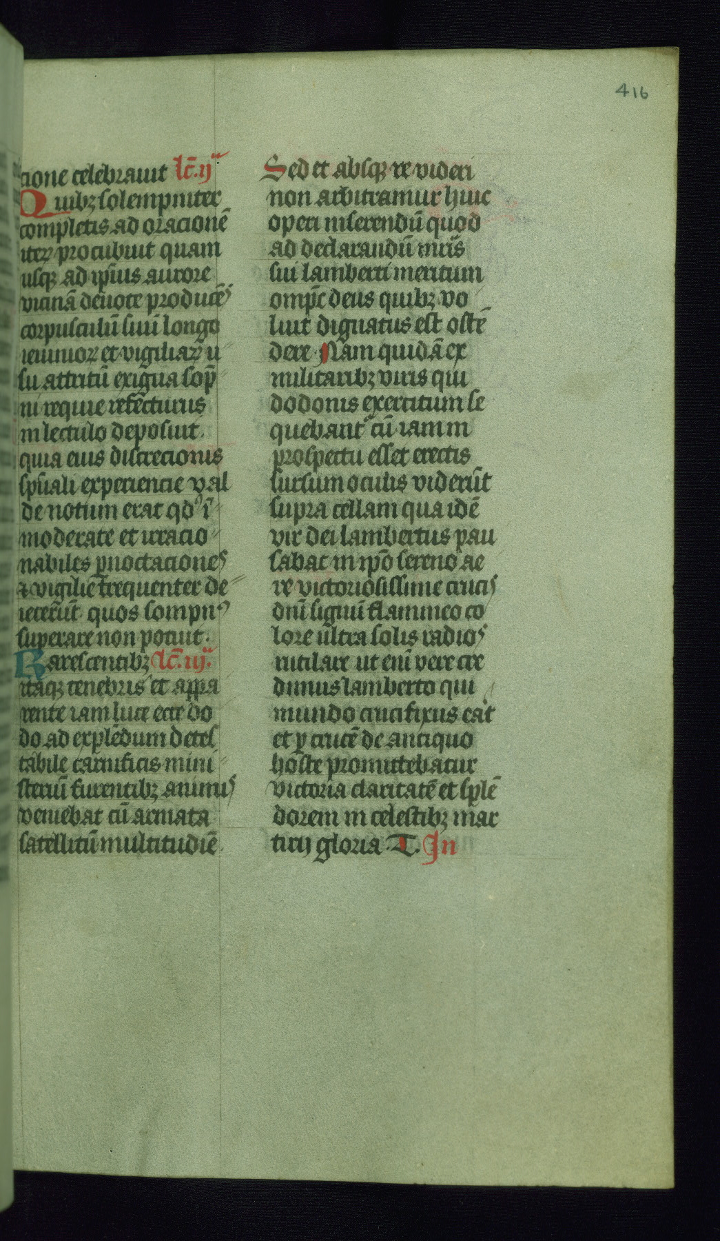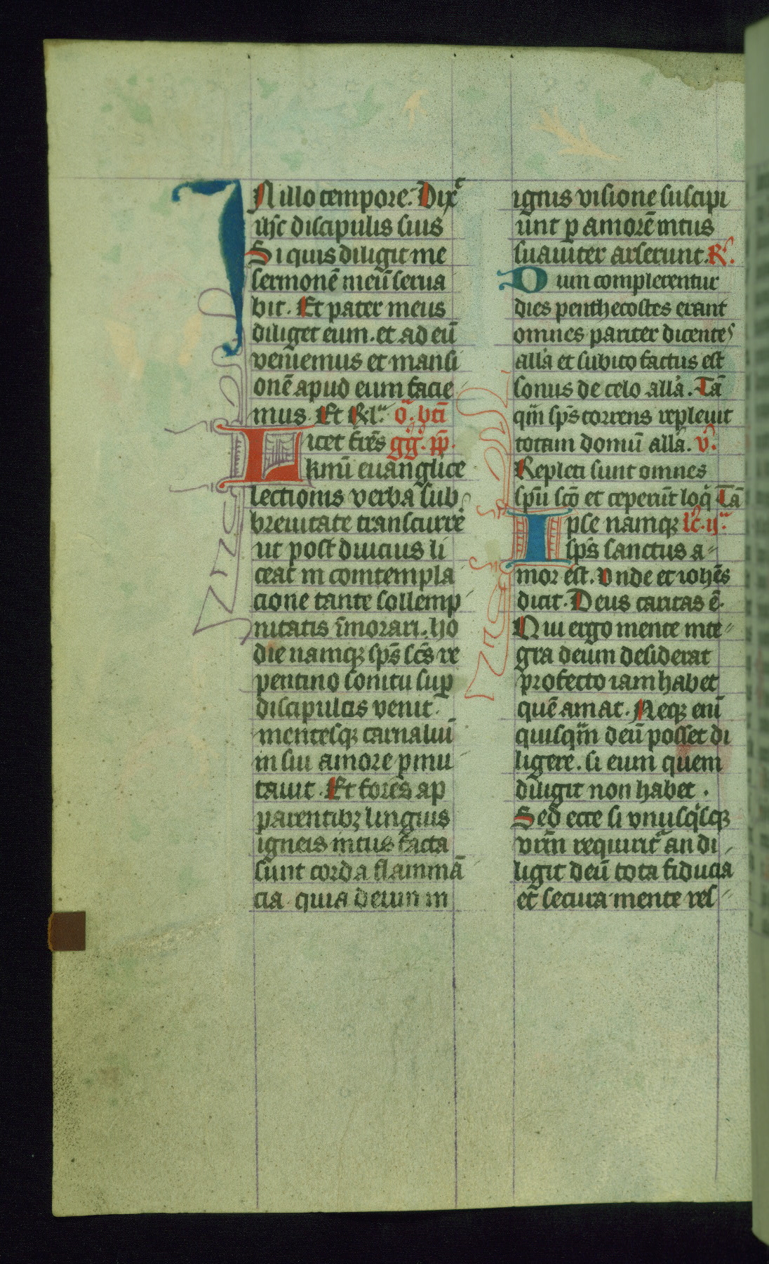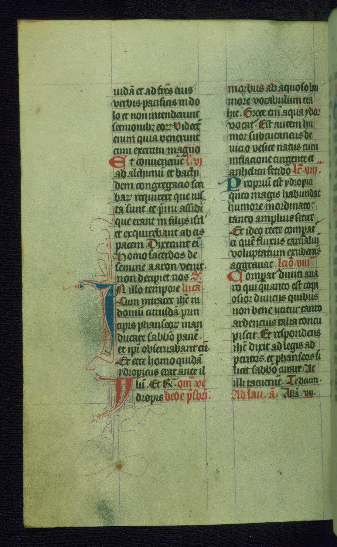 This small breviary, composed of more than 500 folios, is extraordinary for its length, considering it is the summer portion of a two-volume breviary for the use of Liège. The manuscript was completed for ecclesiastical use at the Cathedral of Notre-Dame and St.-Lambert in Liège ca. 1420. This attribution is suggested, for instance, by the petitions to the congregation of this cathedral (fols. 114v-117v), as well as the armorial shield of the family of Surlet de Chokier of Liège represented at the opening of the Psalms. The manuscript has modest, but interesting, decoration with historiated and decorated initials marking the liturgical texts, and occasional angels playing instruments in the margins. The most notable pictorial effect is found in the initials inhabited by transparent figures on rich blue ground. The technique is found, for instance, on fol. 156r with the gold monstrance held by translucent angels for the feast of the Corpus Christi.