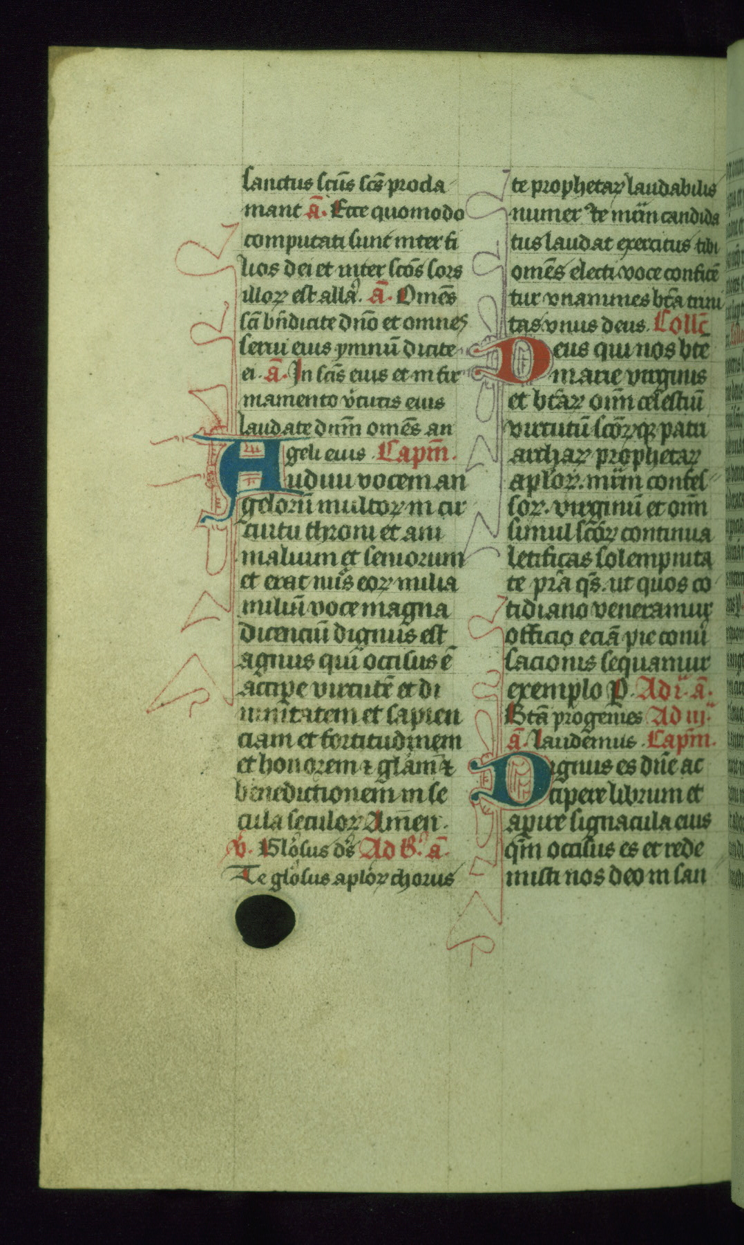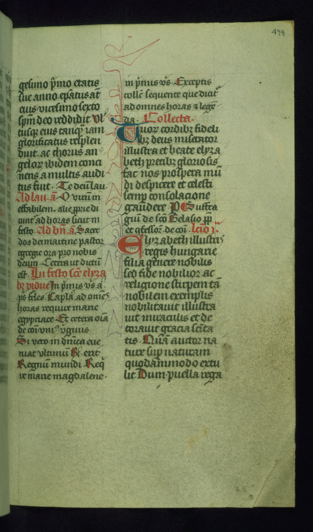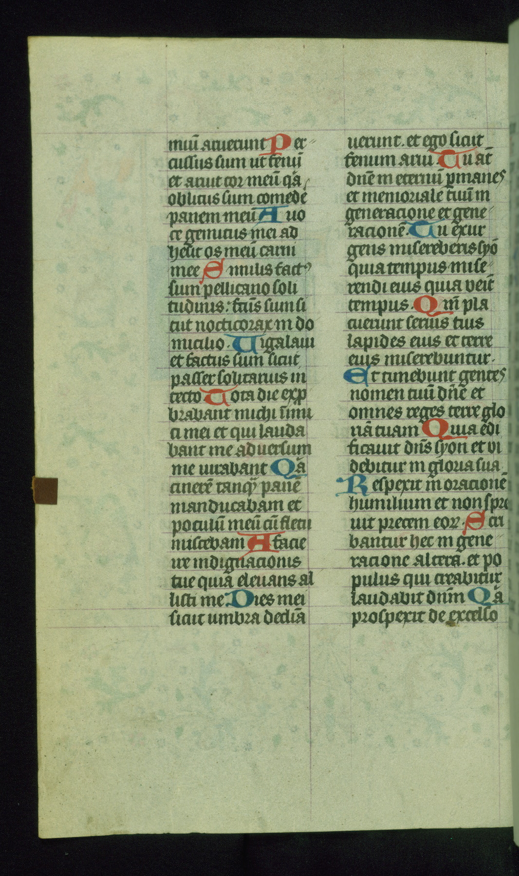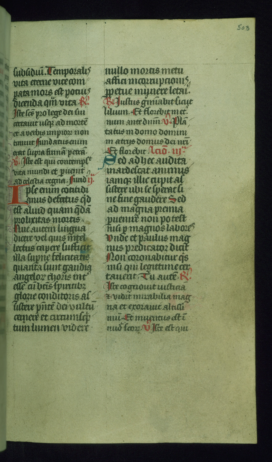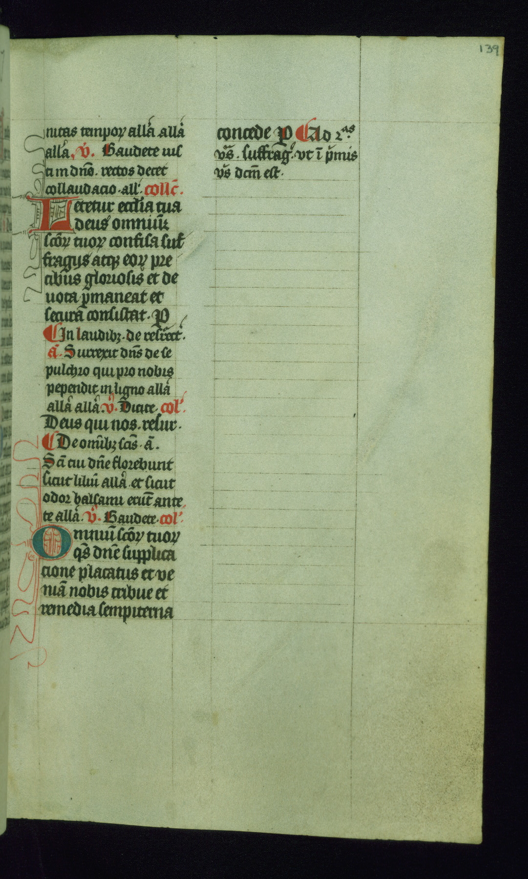 This small breviary, composed of more than 500 folios, is extraordinary for its length, considering it is the summer portion of a two-volume breviary for the use of Liège. The manuscript was completed for ecclesiastical use at the Cathedral of Notre-Dame and St.-Lambert in Liège ca. 1420. This attribution is suggested, for instance, by the petitions to the congregation of this cathedral (fols. 114v-117v), as well as the armorial shield of the family of Surlet de Chokier of Liège represented at the opening of the Psalms. The manuscript has modest, but interesting, decoration with historiated and decorated initials marking the liturgical texts, and occasional angels playing instruments in the margins. The most notable pictorial effect is found in the initials inhabited by transparent figures on rich blue ground. The technique is found, for instance, on fol. 156r with the gold monstrance held by translucent angels for the feast of the Corpus Christi.