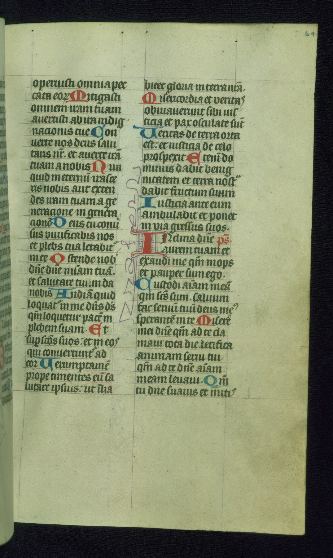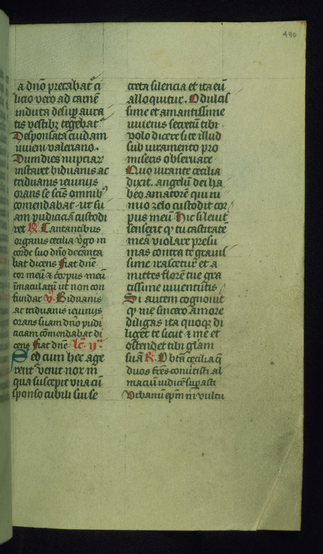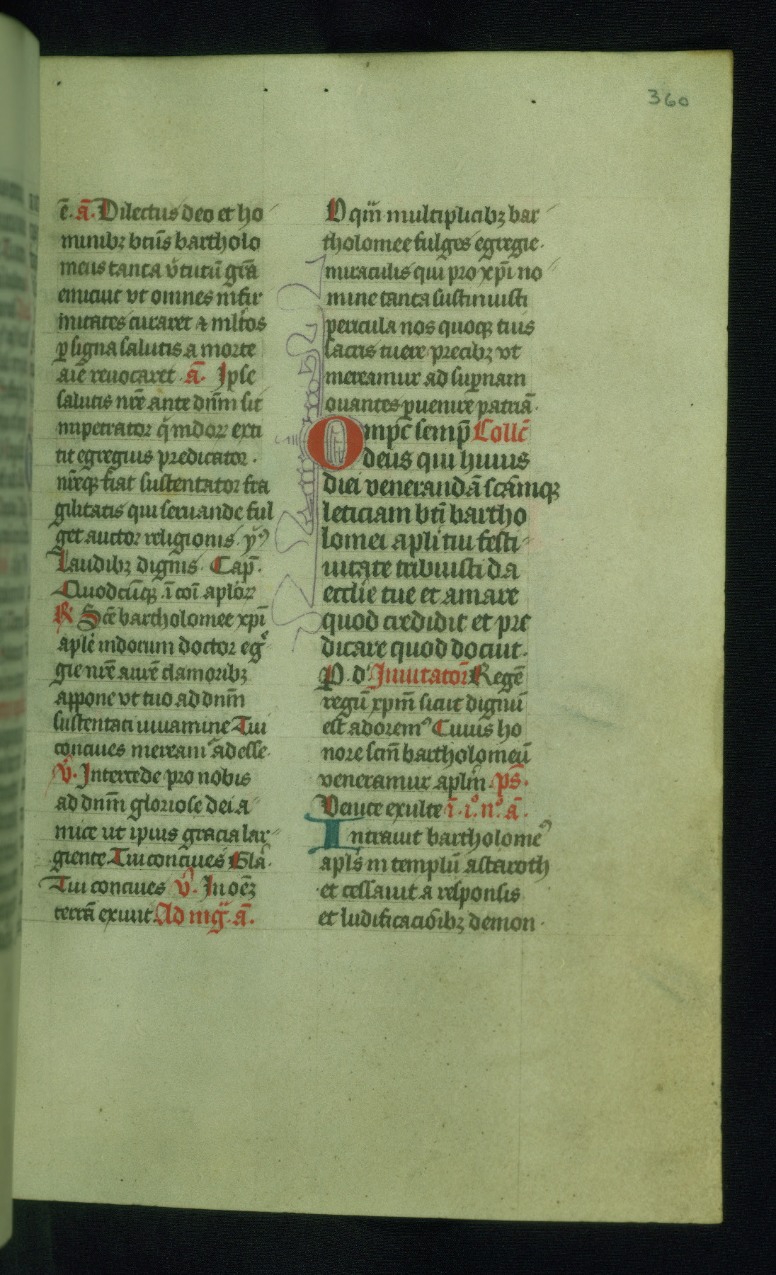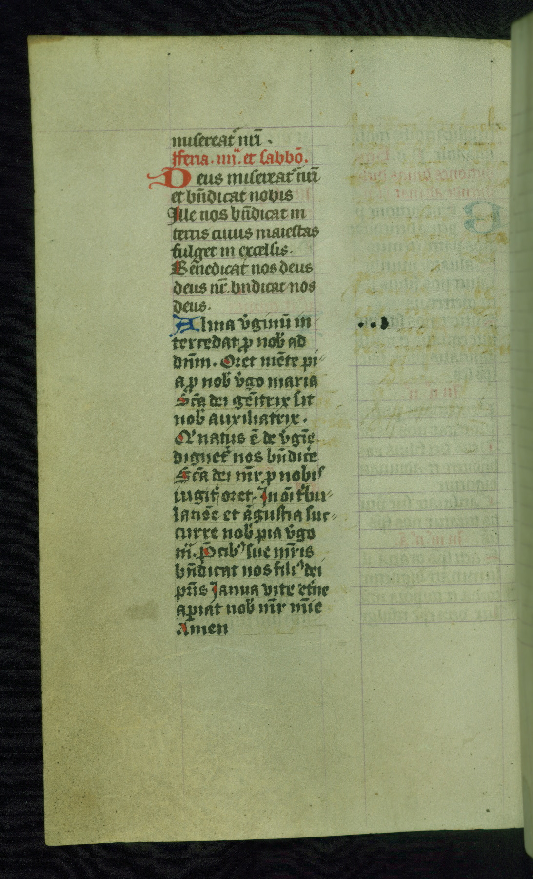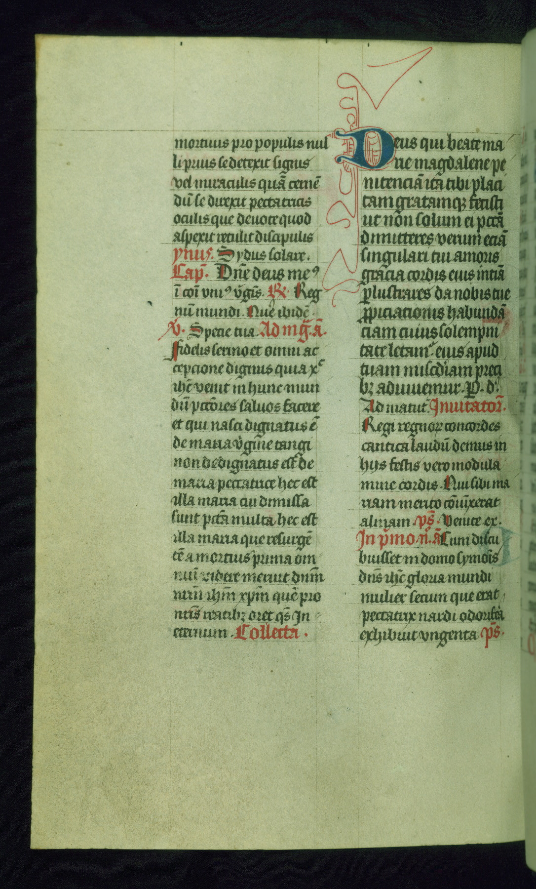 This small breviary, composed of more than 500 folios, is extraordinary for its length, considering it is the summer portion of a two-volume breviary for the use of Liège. The manuscript was completed for ecclesiastical use at the Cathedral of Notre-Dame and St.-Lambert in Liège ca. 1420. This attribution is suggested, for instance, by the petitions to the congregation of this cathedral (fols. 114v-117v), as well as the armorial shield of the family of Surlet de Chokier of Liège represented at the opening of the Psalms. The manuscript has modest, but interesting, decoration with historiated and decorated initials marking the liturgical texts, and occasional angels playing instruments in the margins. The most notable pictorial effect is found in the initials inhabited by transparent figures on rich blue ground. The technique is found, for instance, on fol. 156r with the gold monstrance held by translucent angels for the feast of the Corpus Christi.