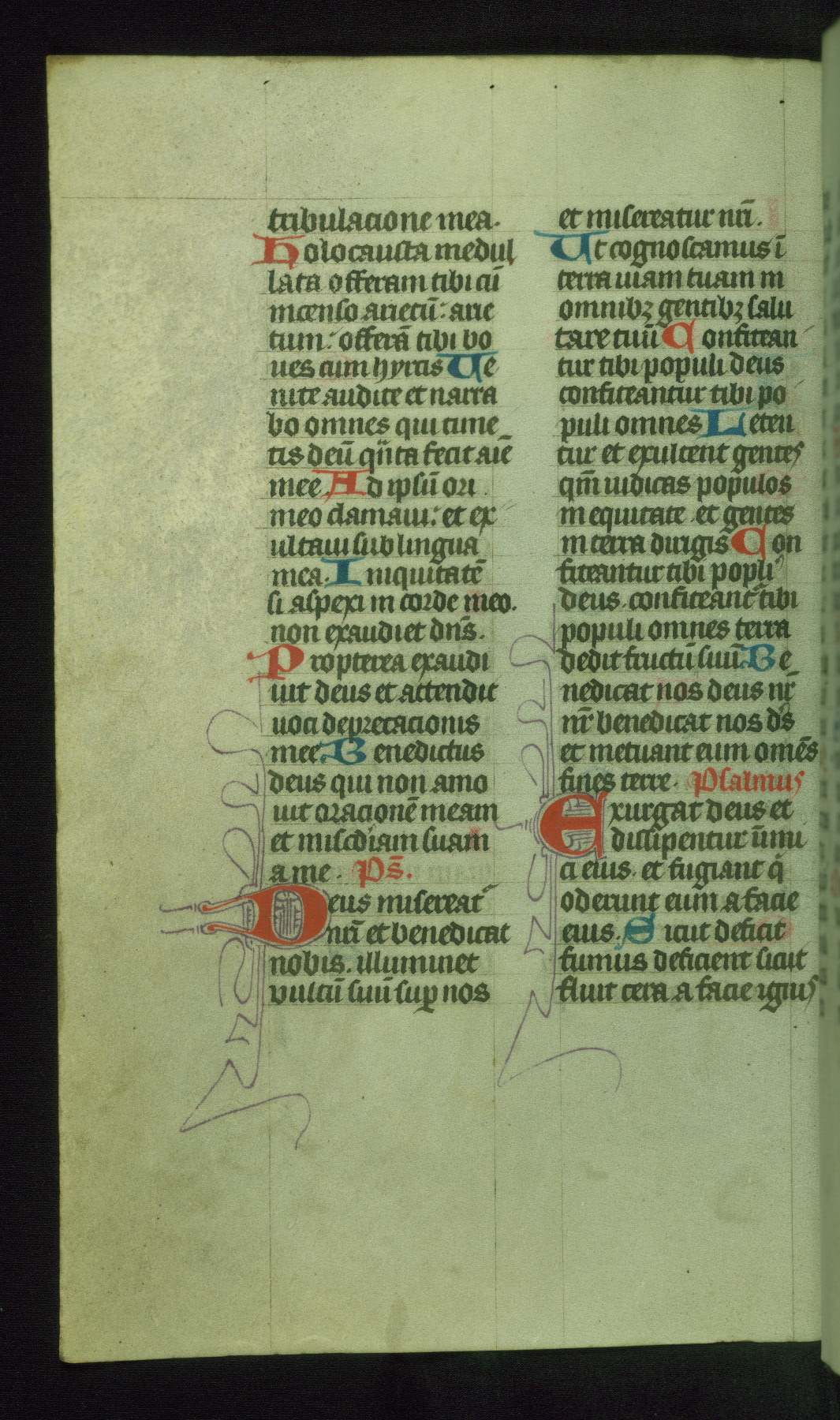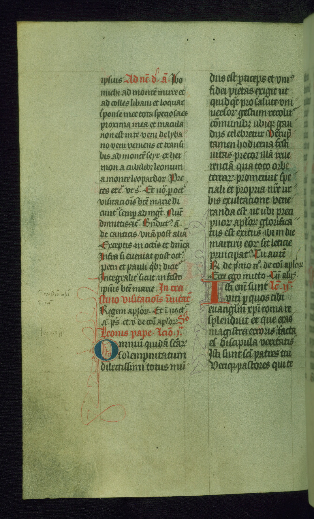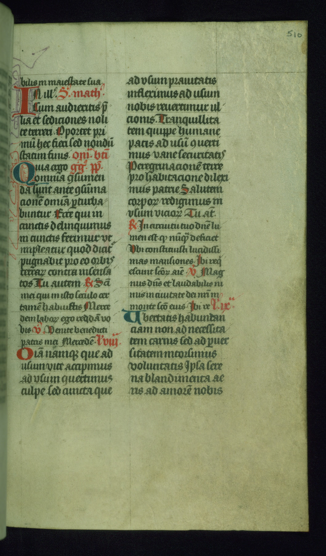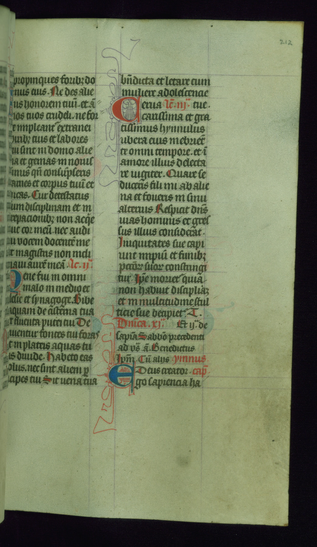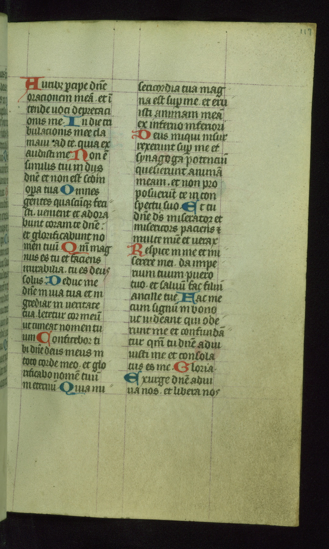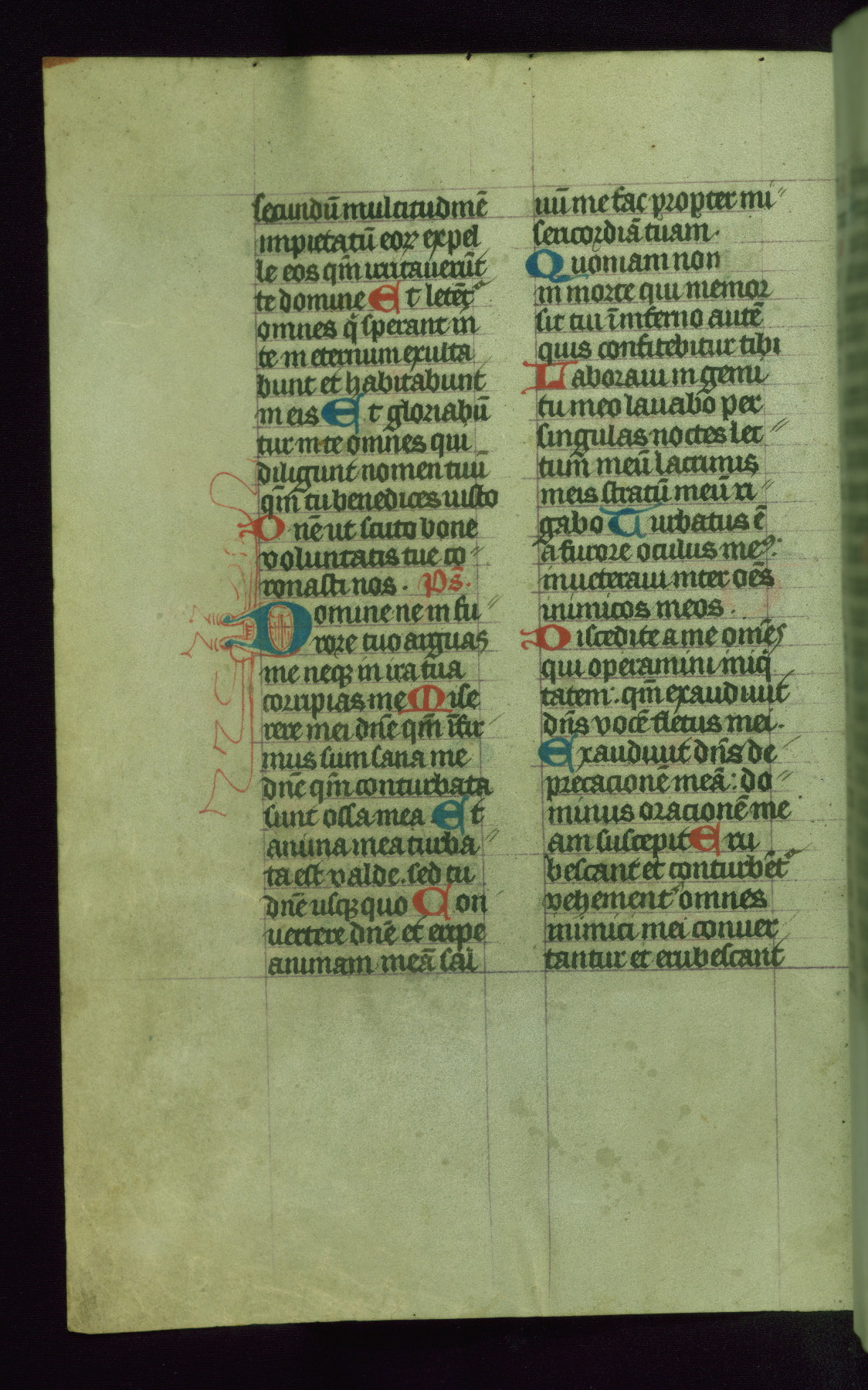 This small breviary, composed of more than 500 folios, is extraordinary for its length, considering it is the summer portion of a two-volume breviary for the use of Liège. The manuscript was completed for ecclesiastical use at the Cathedral of Notre-Dame and St.-Lambert in Liège ca. 1420. This attribution is suggested, for instance, by the petitions to the congregation of this cathedral (fols. 114v-117v), as well as the armorial shield of the family of Surlet de Chokier of Liège represented at the opening of the Psalms. The manuscript has modest, but interesting, decoration with historiated and decorated initials marking the liturgical texts, and occasional angels playing instruments in the margins. The most notable pictorial effect is found in the initials inhabited by transparent figures on rich blue ground. The technique is found, for instance, on fol. 156r with the gold monstrance held by translucent angels for the feast of the Corpus Christi.