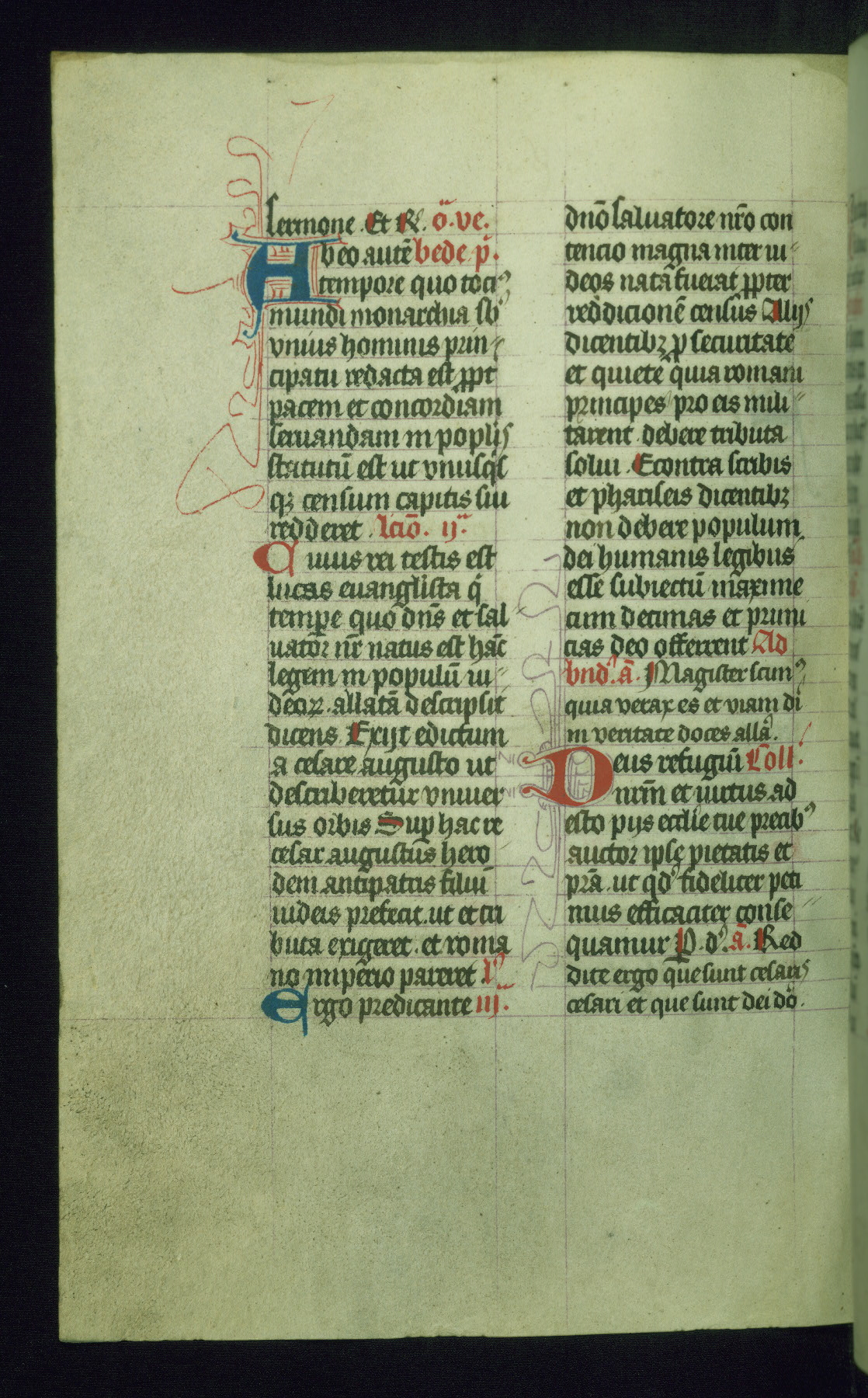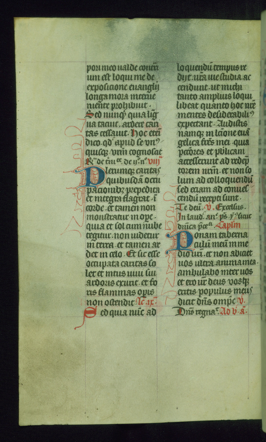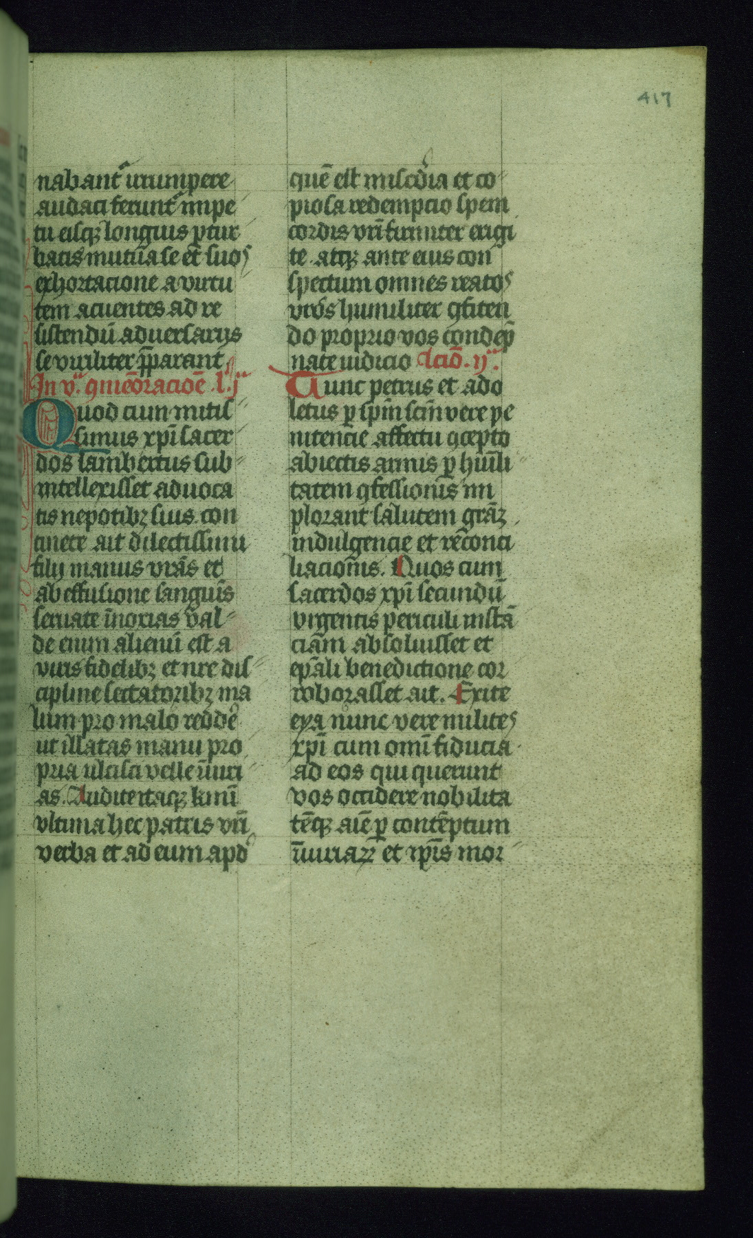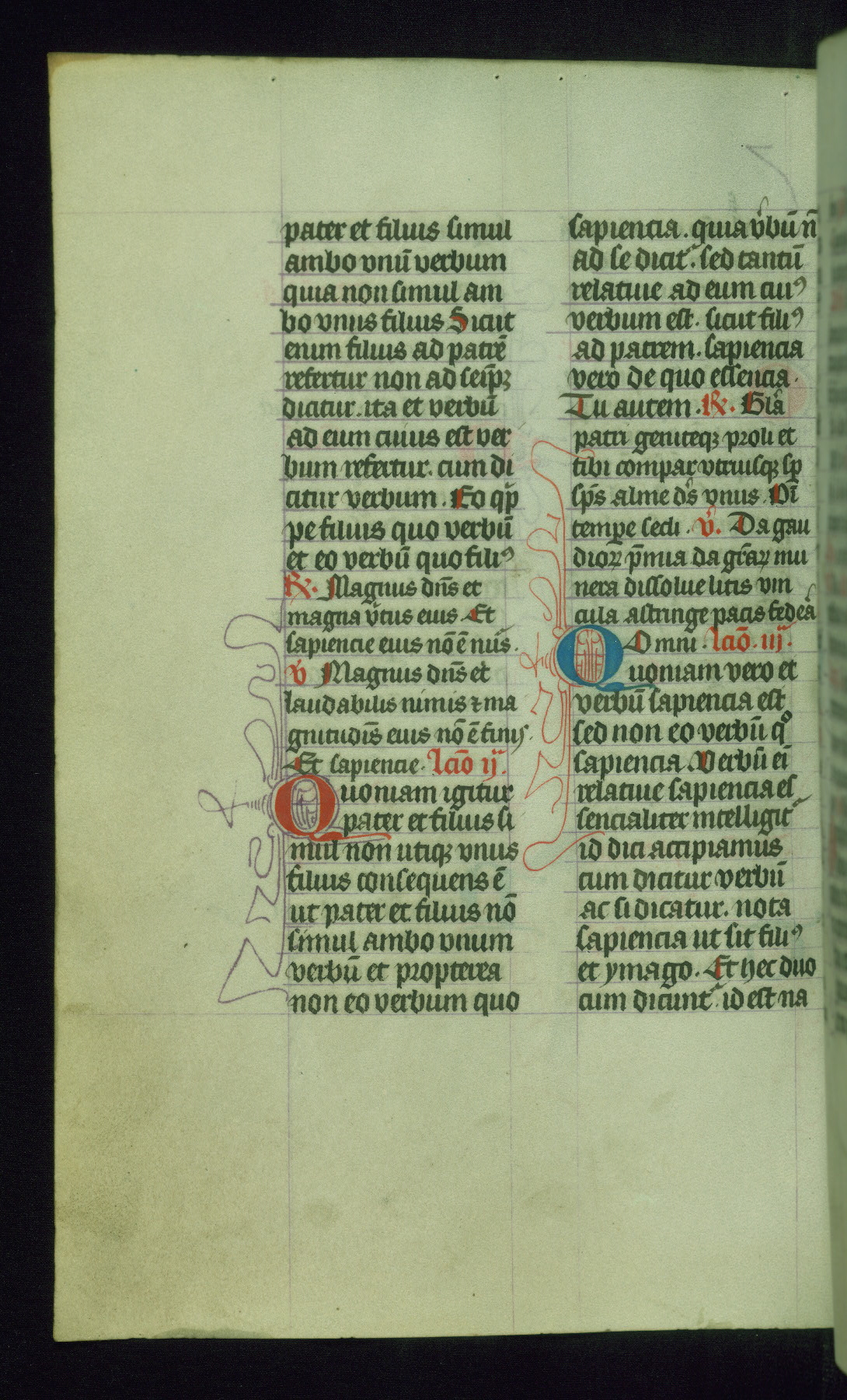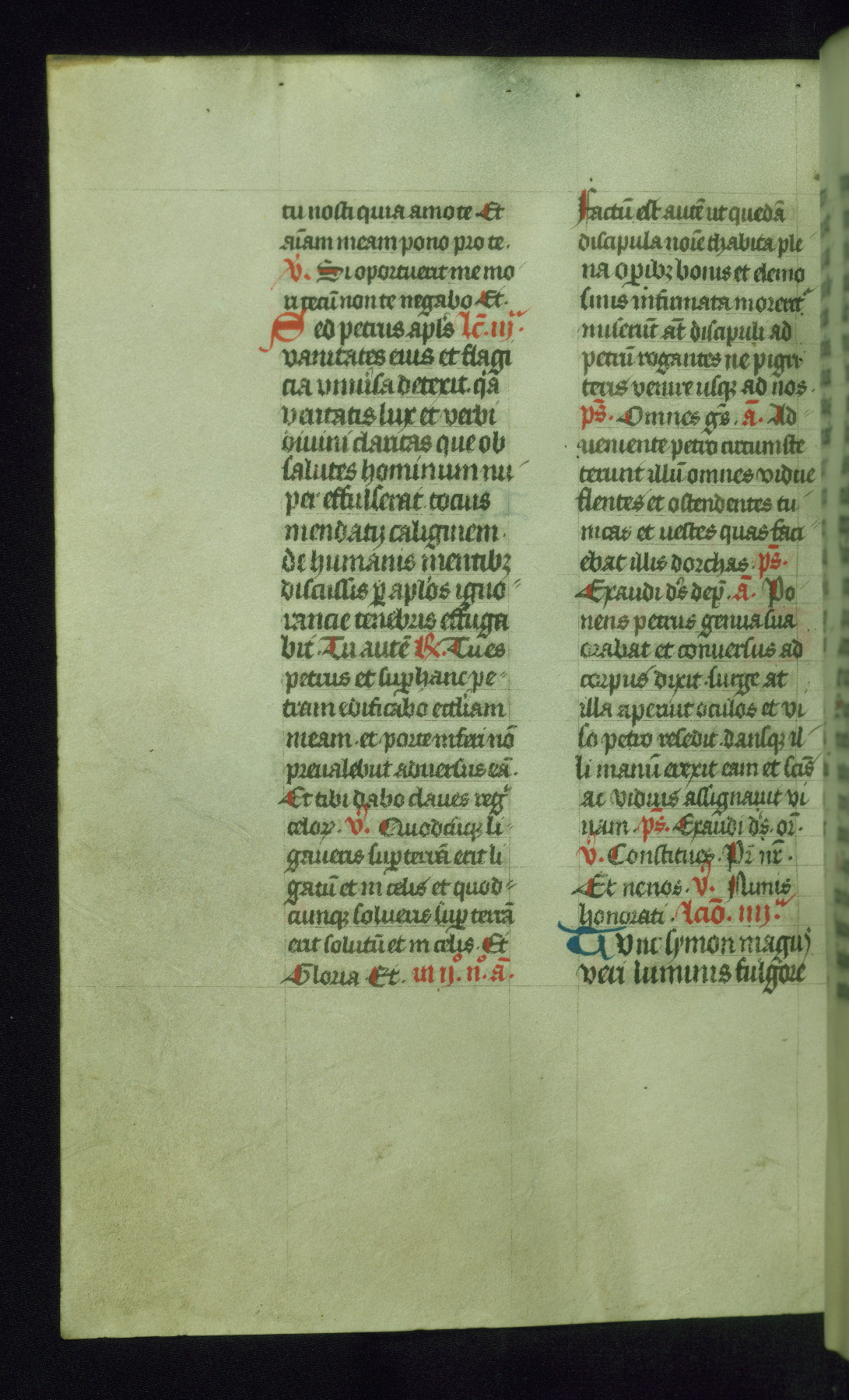 This small breviary, composed of more than 500 folios, is extraordinary for its length, considering it is the summer portion of a two-volume breviary for the use of Liège. The manuscript was completed for ecclesiastical use at the Cathedral of Notre-Dame and St.-Lambert in Liège ca. 1420. This attribution is suggested, for instance, by the petitions to the congregation of this cathedral (fols. 114v-117v), as well as the armorial shield of the family of Surlet de Chokier of Liège represented at the opening of the Psalms. The manuscript has modest, but interesting, decoration with historiated and decorated initials marking the liturgical texts, and occasional angels playing instruments in the margins. The most notable pictorial effect is found in the initials inhabited by transparent figures on rich blue ground. The technique is found, for instance, on fol. 156r with the gold monstrance held by translucent angels for the feast of the Corpus Christi.
