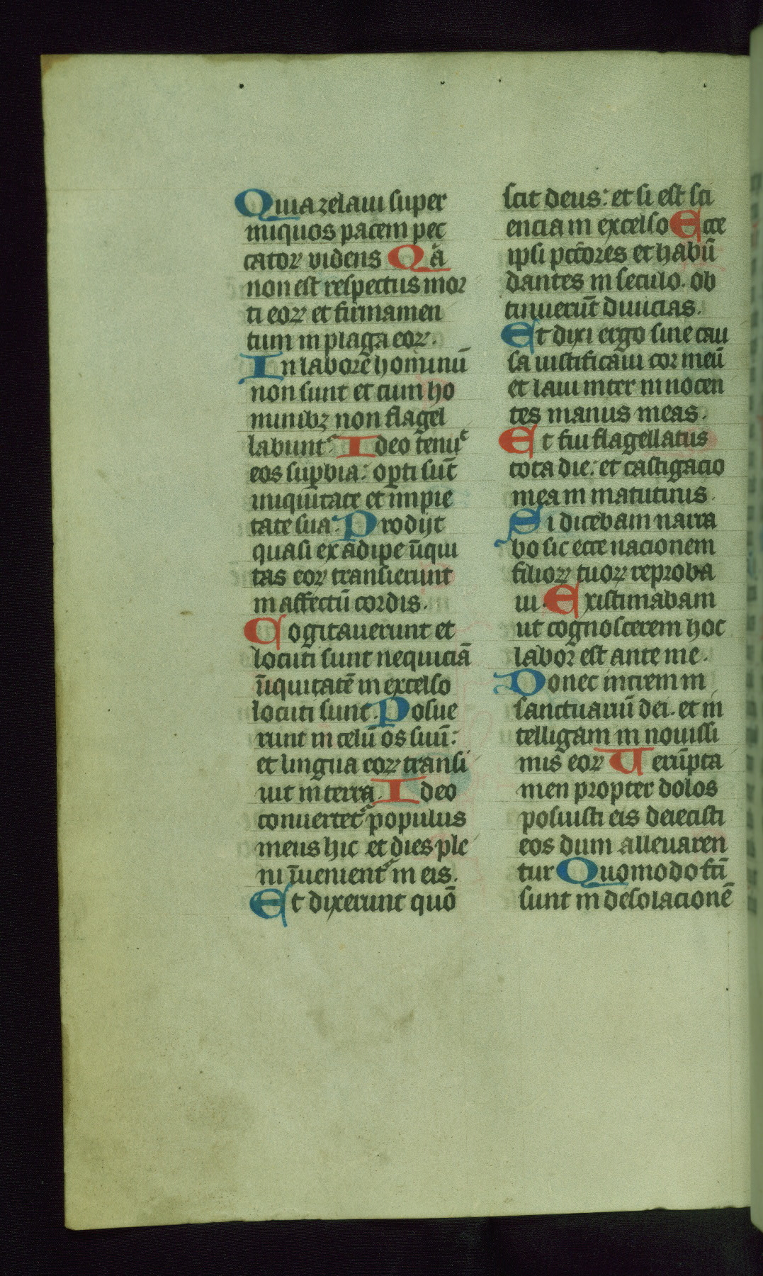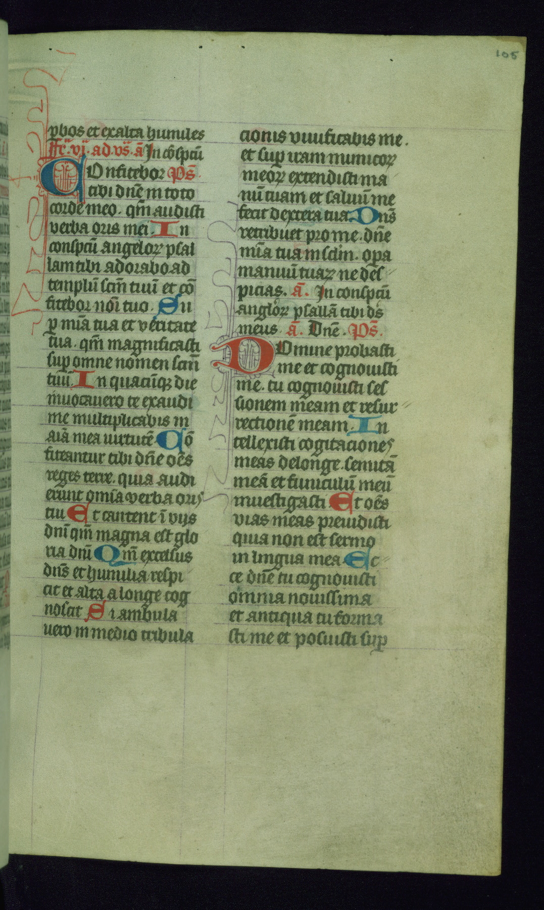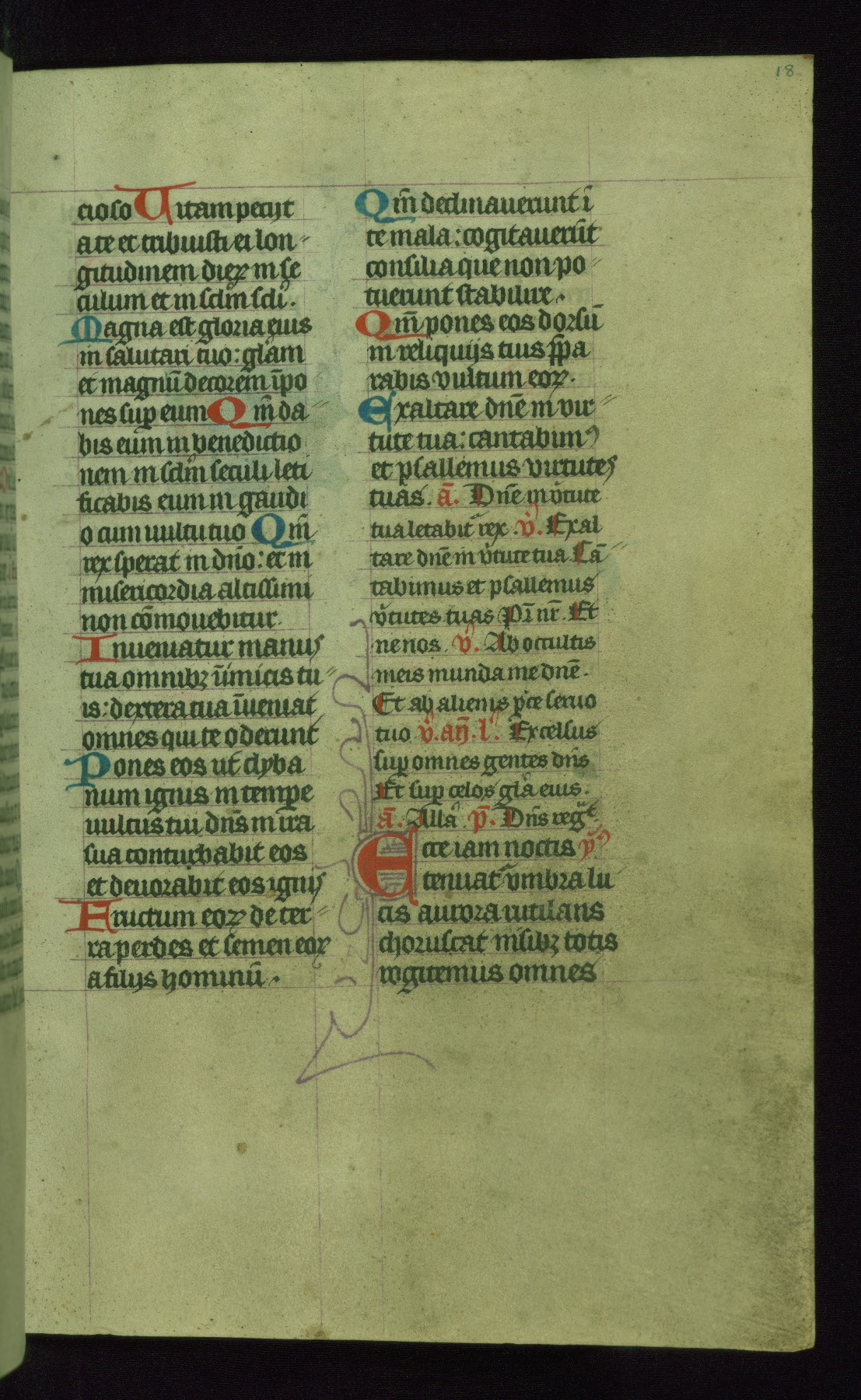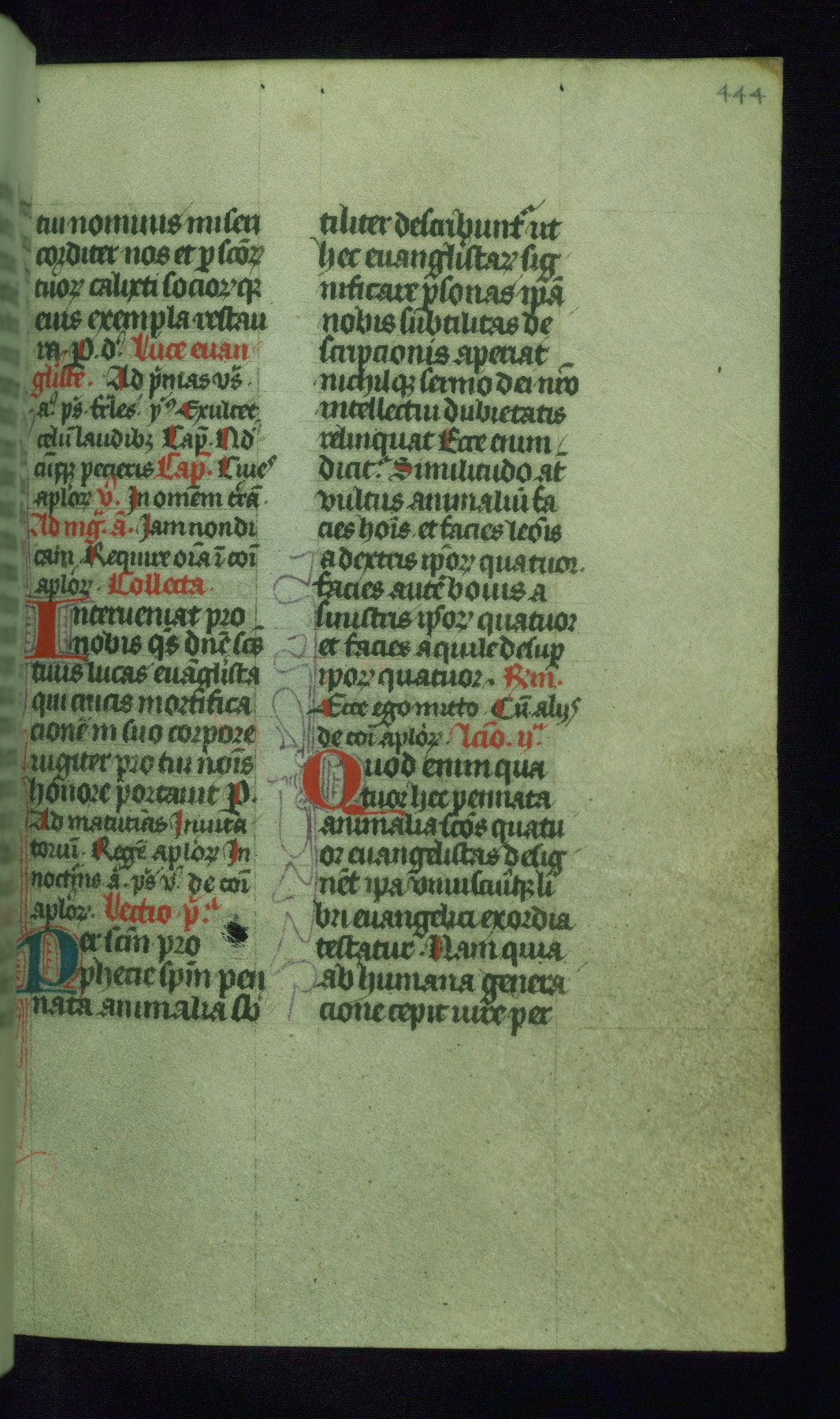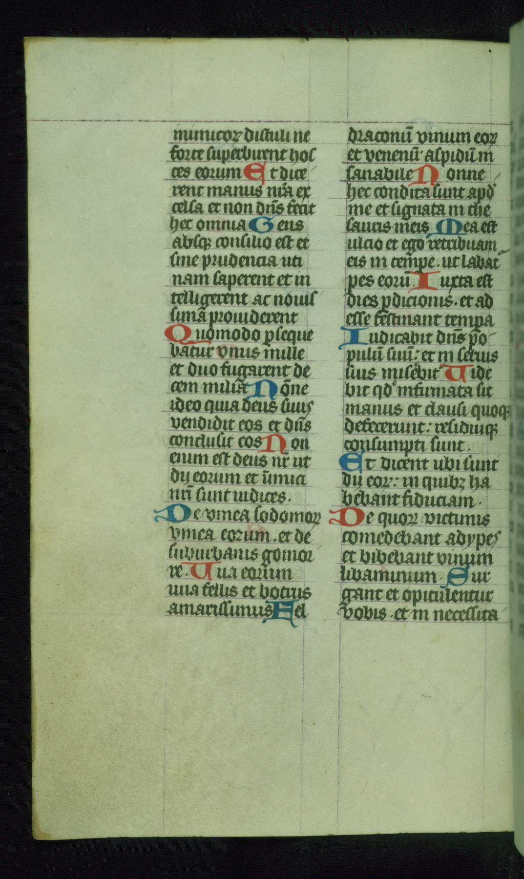 This small breviary, composed of more than 500 folios, is extraordinary for its length, considering it is the summer portion of a two-volume breviary for the use of Liège. The manuscript was completed for ecclesiastical use at the Cathedral of Notre-Dame and St.-Lambert in Liège ca. 1420. This attribution is suggested, for instance, by the petitions to the congregation of this cathedral (fols. 114v-117v), as well as the armorial shield of the family of Surlet de Chokier of Liège represented at the opening of the Psalms. The manuscript has modest, but interesting, decoration with historiated and decorated initials marking the liturgical texts, and occasional angels playing instruments in the margins. The most notable pictorial effect is found in the initials inhabited by transparent figures on rich blue ground. The technique is found, for instance, on fol. 156r with the gold monstrance held by translucent angels for the feast of the Corpus Christi.