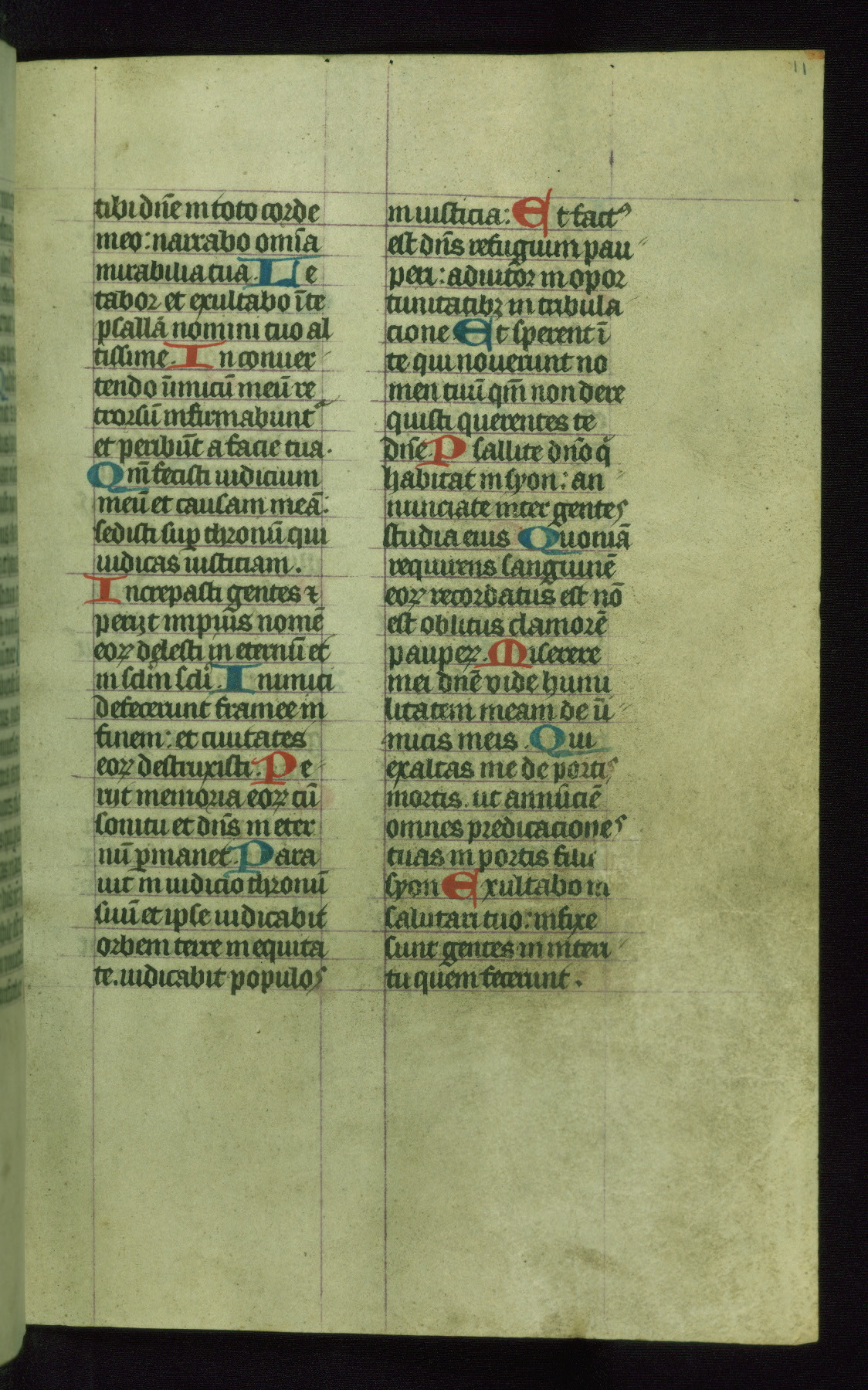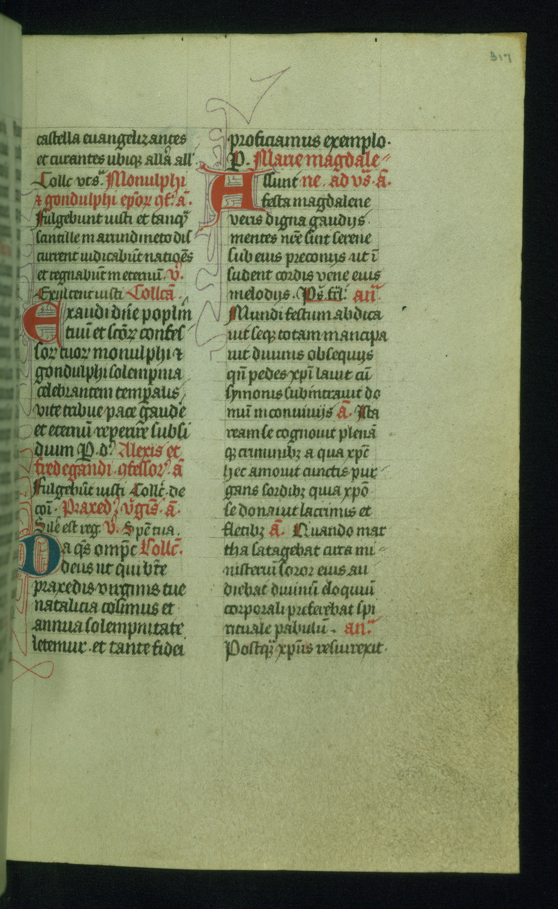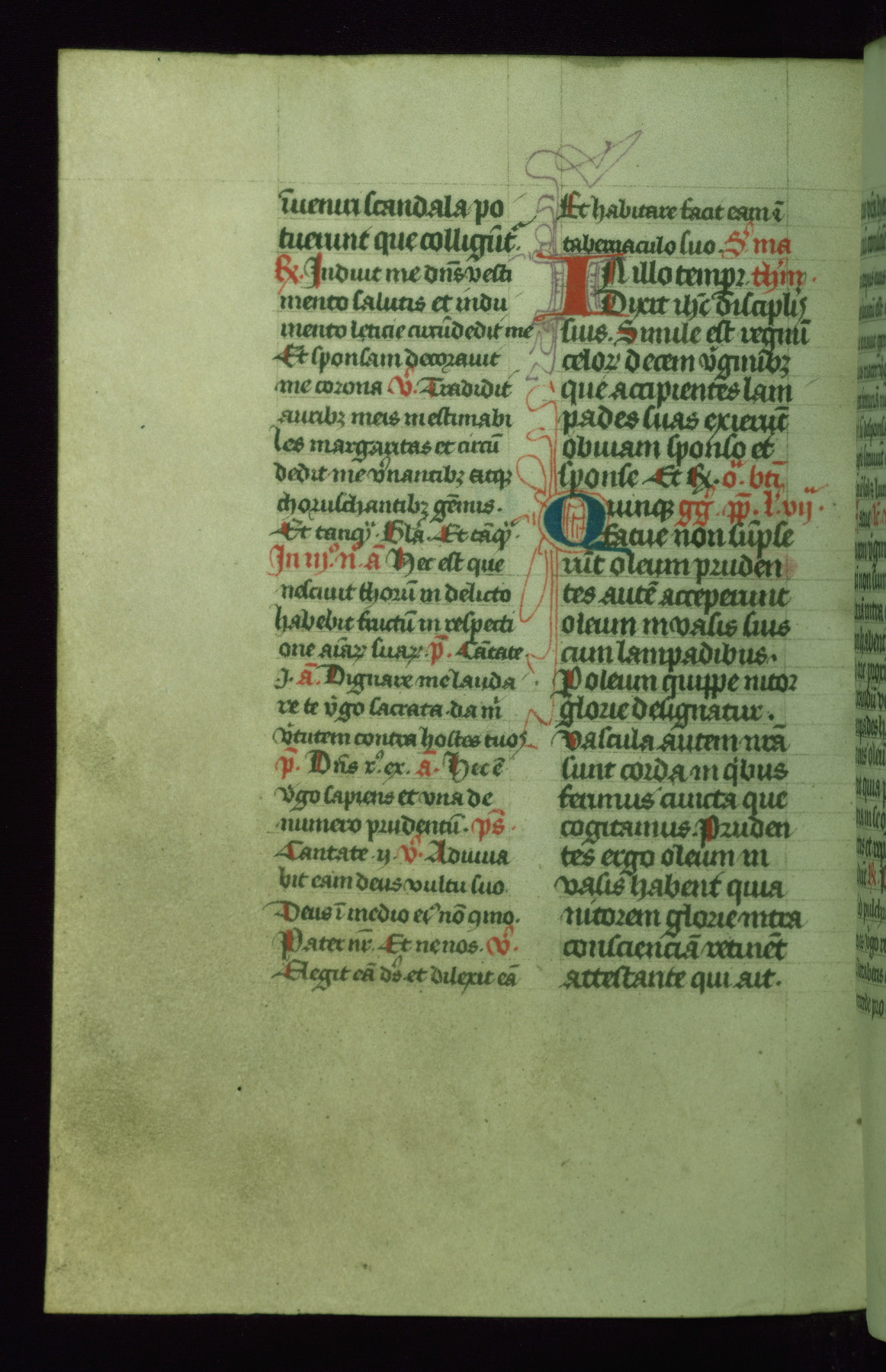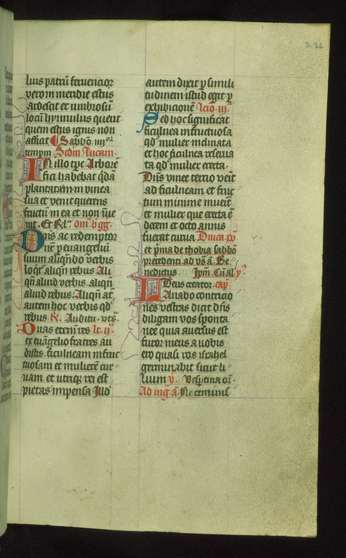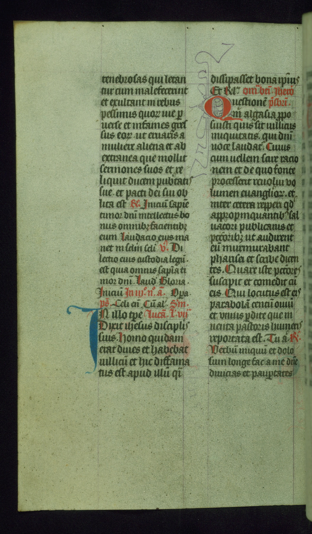 This small breviary, composed of more than 500 folios, is extraordinary for its length, considering it is the summer portion of a two-volume breviary for the use of Liège. The manuscript was completed for ecclesiastical use at the Cathedral of Notre-Dame and St.-Lambert in Liège ca. 1420. This attribution is suggested, for instance, by the petitions to the congregation of this cathedral (fols. 114v-117v), as well as the armorial shield of the family of Surlet de Chokier of Liège represented at the opening of the Psalms. The manuscript has modest, but interesting, decoration with historiated and decorated initials marking the liturgical texts, and occasional angels playing instruments in the margins. The most notable pictorial effect is found in the initials inhabited by transparent figures on rich blue ground. The technique is found, for instance, on fol. 156r with the gold monstrance held by translucent angels for the feast of the Corpus Christi.