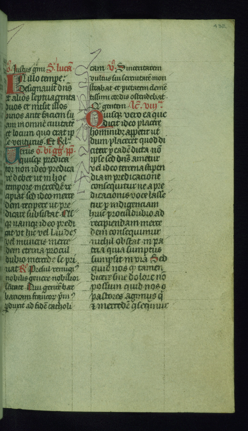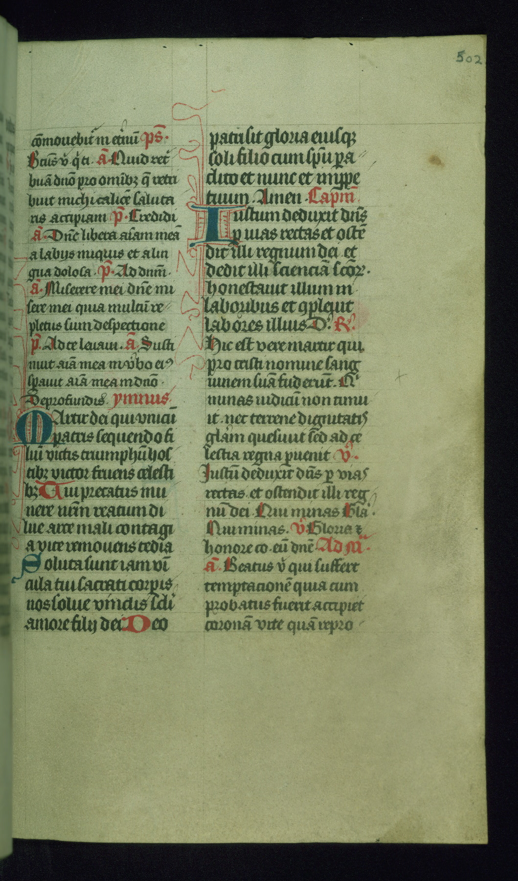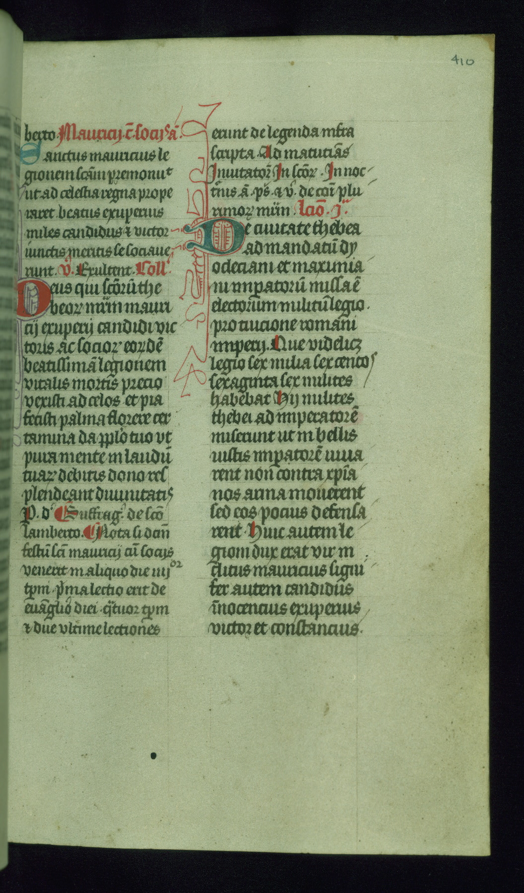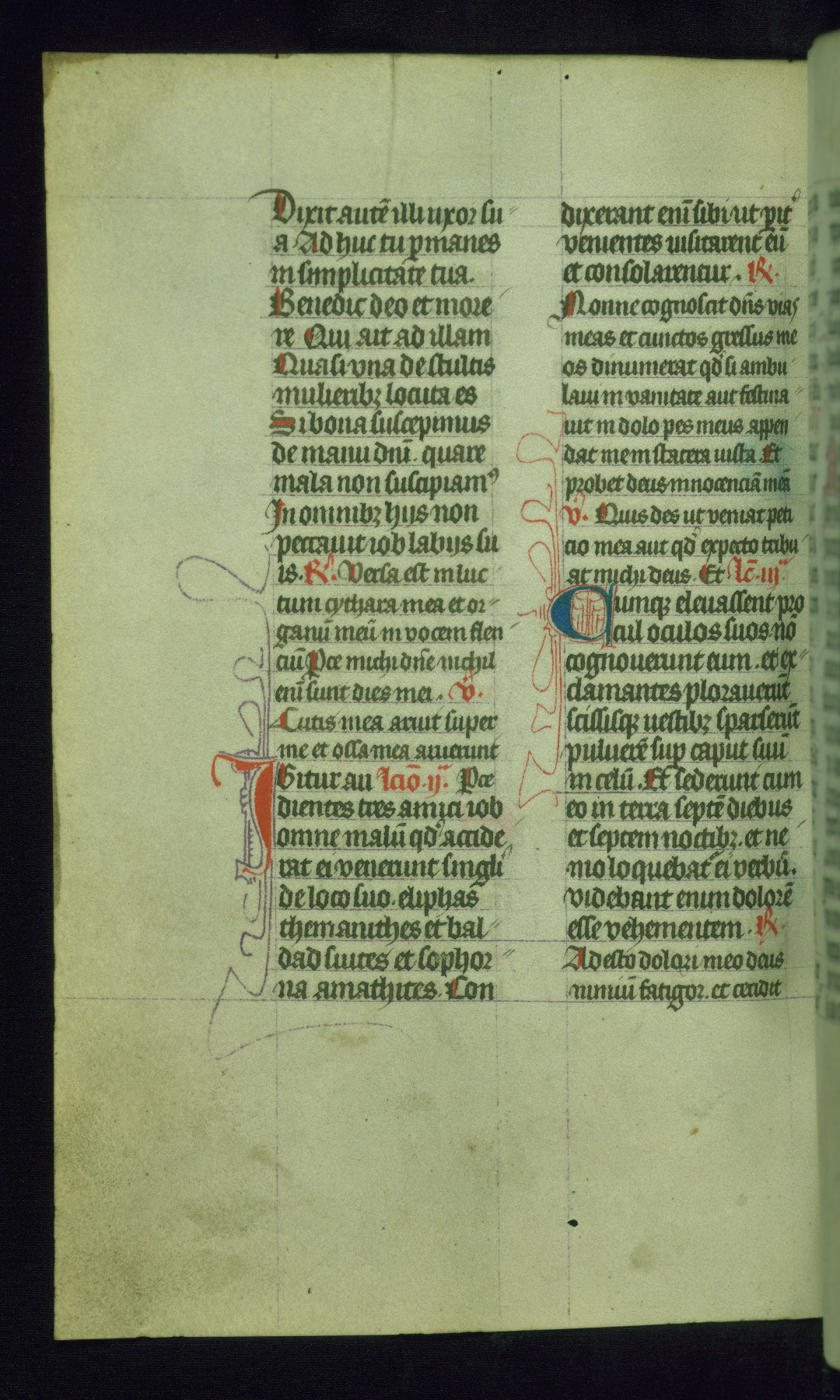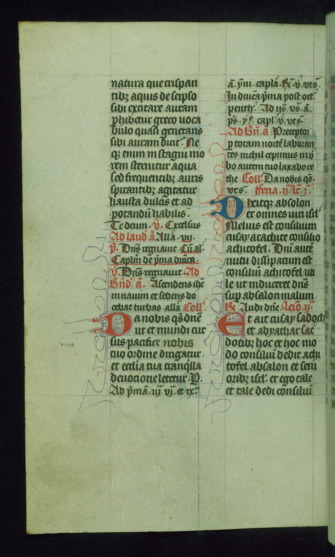 This small breviary, composed of more than 500 folios, is extraordinary for its length, considering it is the summer portion of a two-volume breviary for the use of Liège. The manuscript was completed for ecclesiastical use at the Cathedral of Notre-Dame and St.-Lambert in Liège ca. 1420. This attribution is suggested, for instance, by the petitions to the congregation of this cathedral (fols. 114v-117v), as well as the armorial shield of the family of Surlet de Chokier of Liège represented at the opening of the Psalms. The manuscript has modest, but interesting, decoration with historiated and decorated initials marking the liturgical texts, and occasional angels playing instruments in the margins. The most notable pictorial effect is found in the initials inhabited by transparent figures on rich blue ground. The technique is found, for instance, on fol. 156r with the gold monstrance held by translucent angels for the feast of the Corpus Christi.