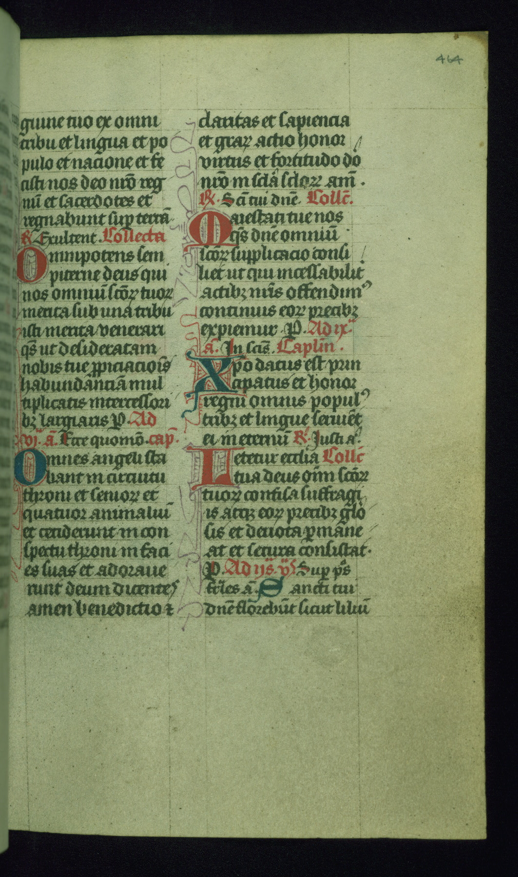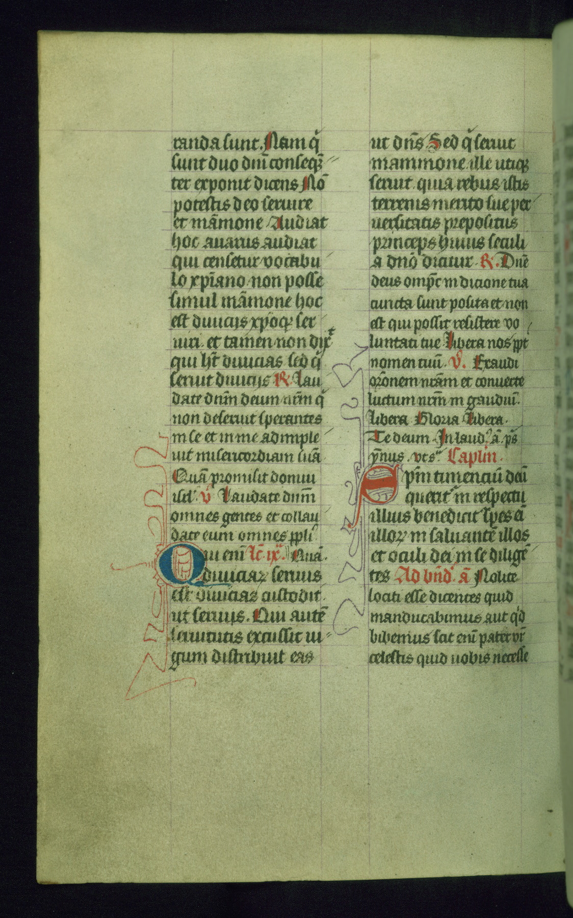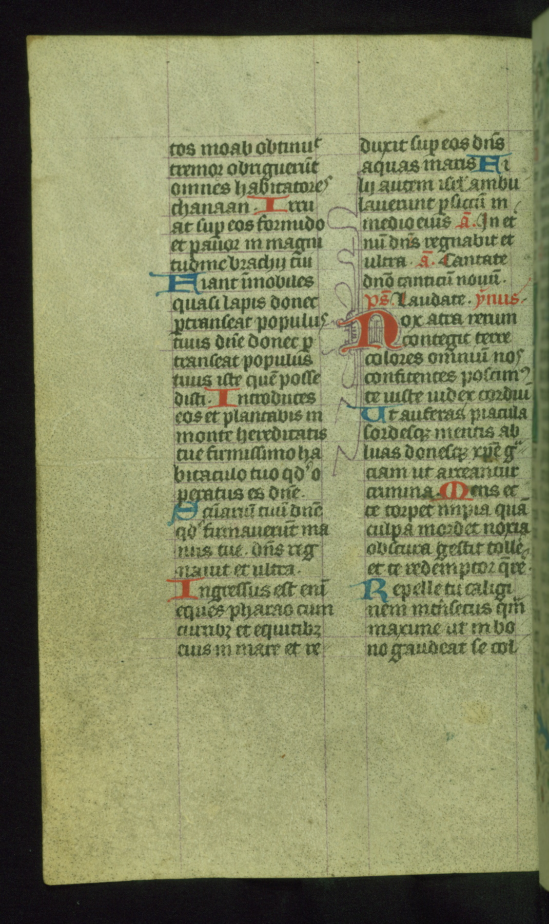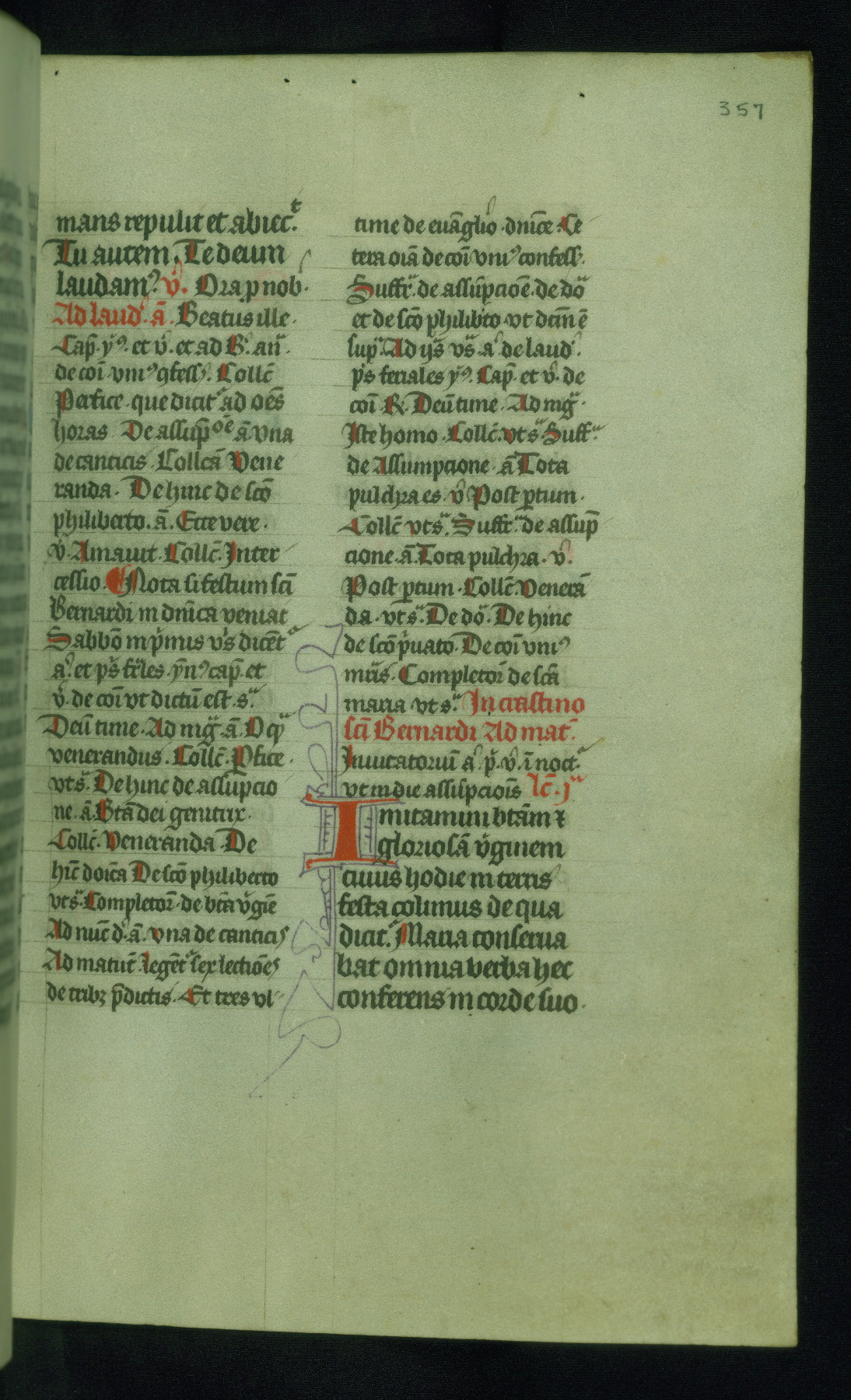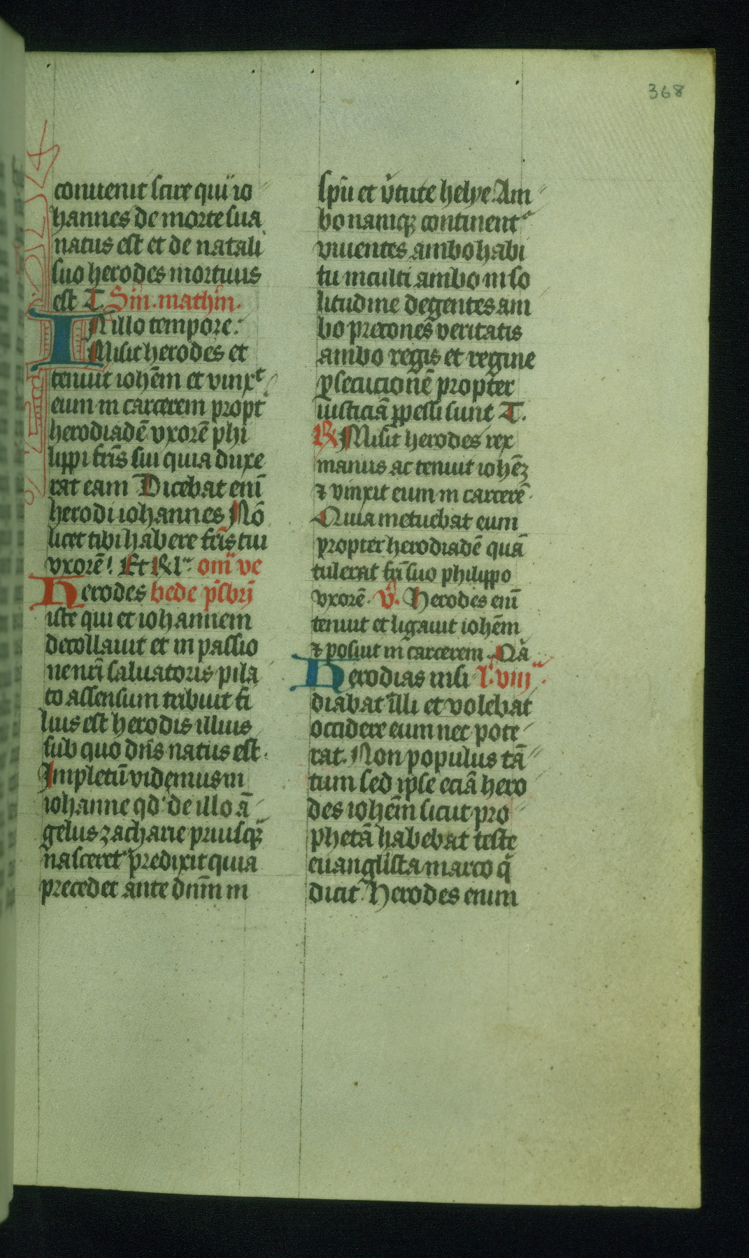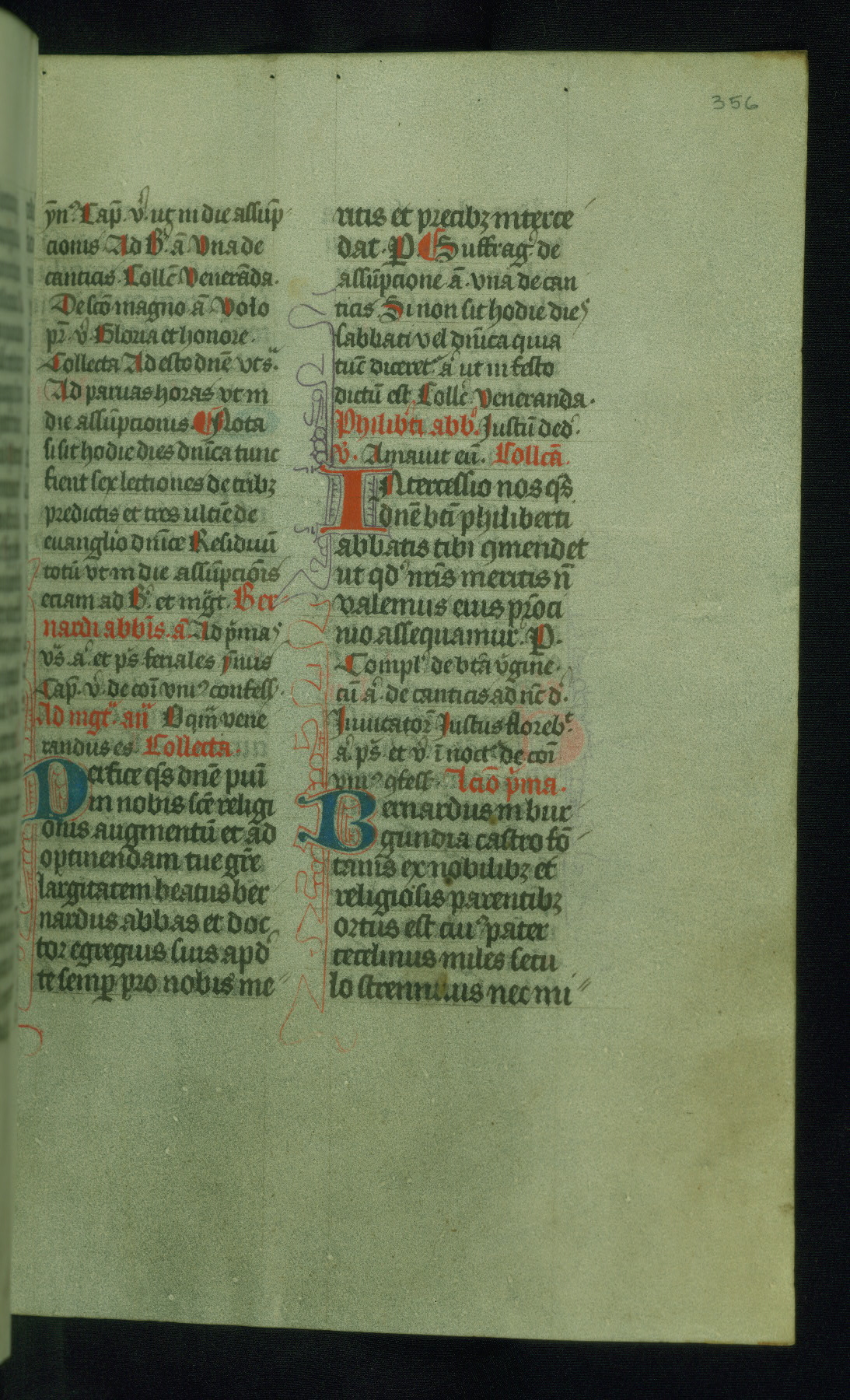 This small breviary, composed of more than 500 folios, is extraordinary for its length, considering it is the summer portion of a two-volume breviary for the use of Liège. The manuscript was completed for ecclesiastical use at the Cathedral of Notre-Dame and St.-Lambert in Liège ca. 1420. This attribution is suggested, for instance, by the petitions to the congregation of this cathedral (fols. 114v-117v), as well as the armorial shield of the family of Surlet de Chokier of Liège represented at the opening of the Psalms. The manuscript has modest, but interesting, decoration with historiated and decorated initials marking the liturgical texts, and occasional angels playing instruments in the margins. The most notable pictorial effect is found in the initials inhabited by transparent figures on rich blue ground. The technique is found, for instance, on fol. 156r with the gold monstrance held by translucent angels for the feast of the Corpus Christi.