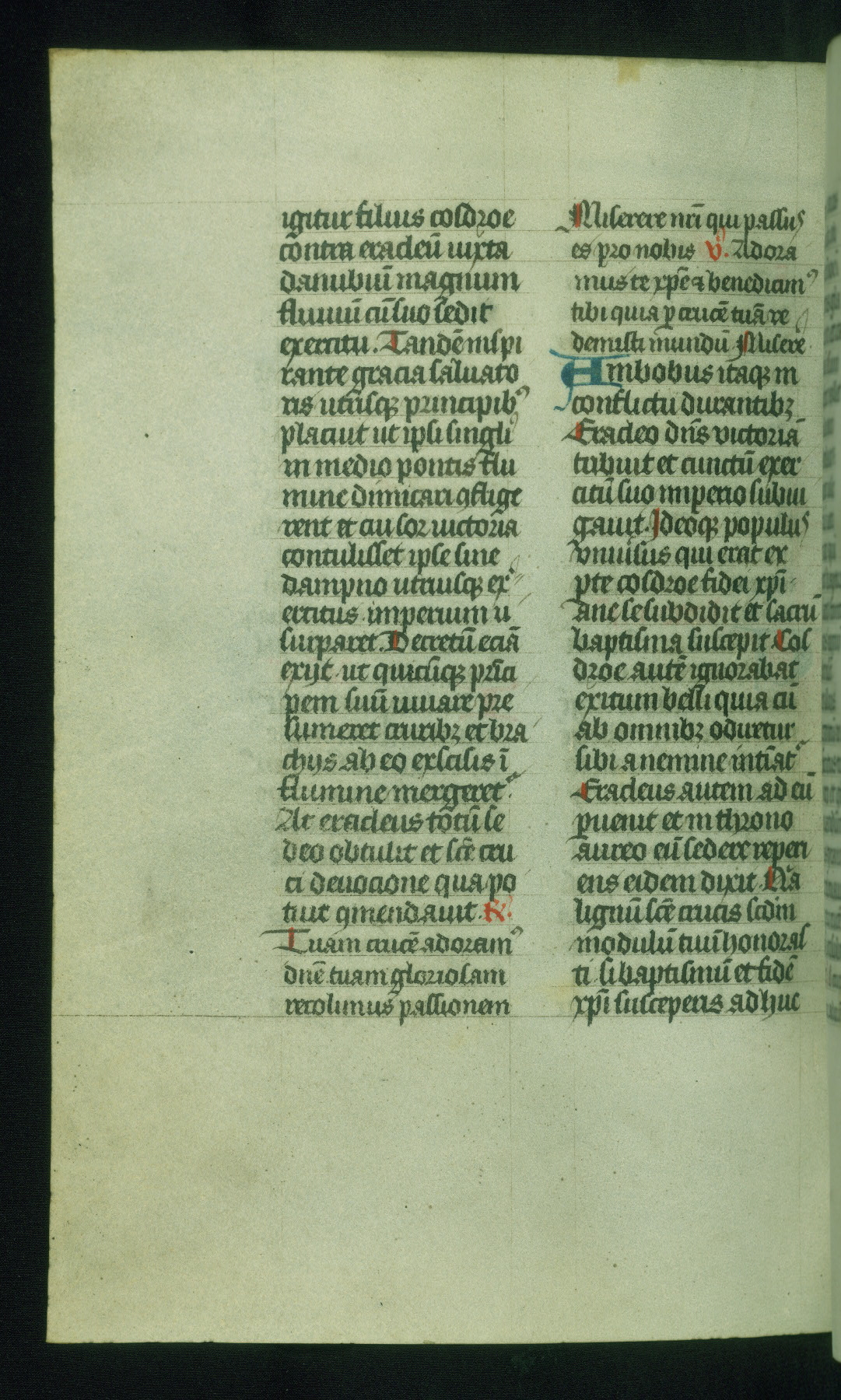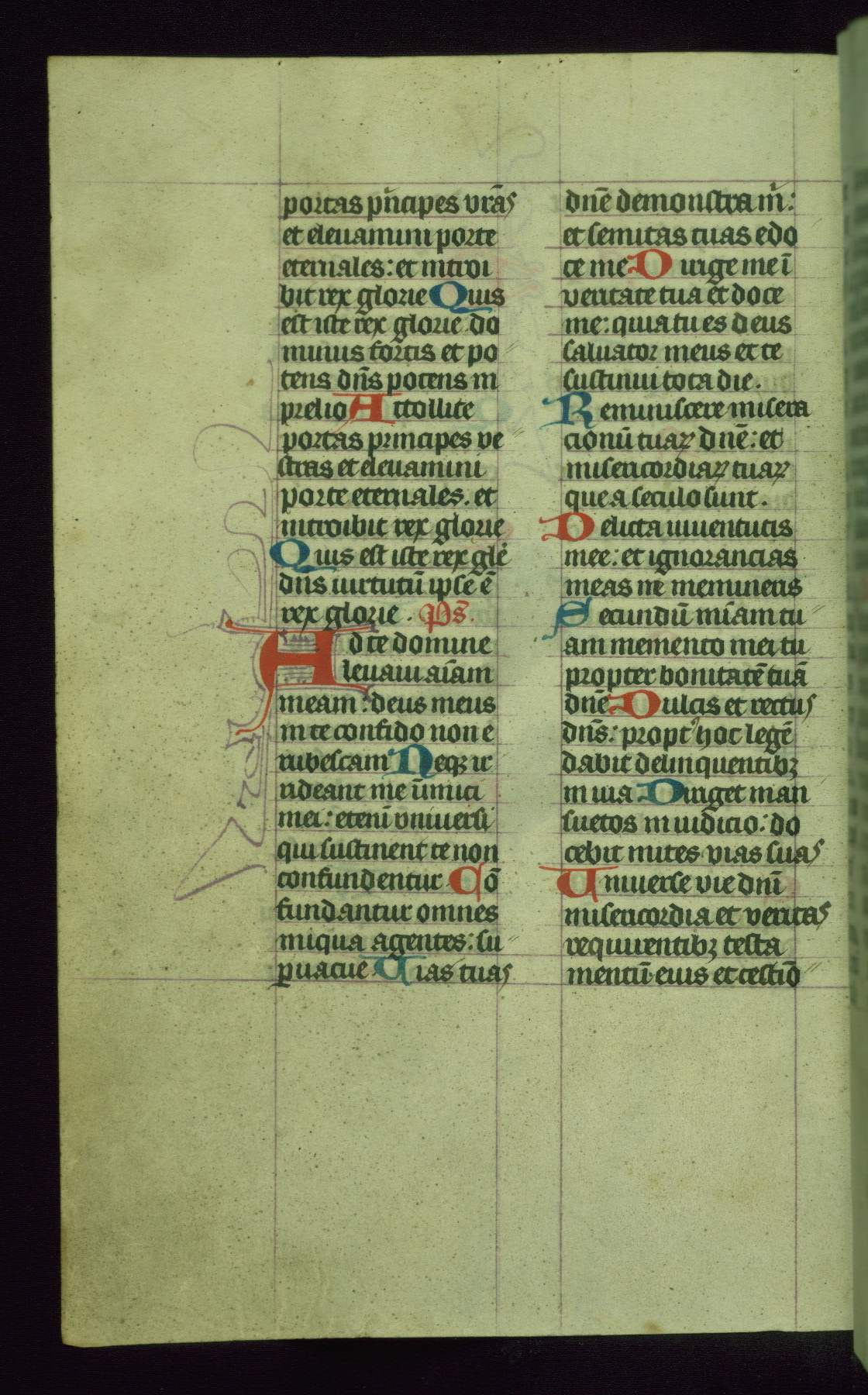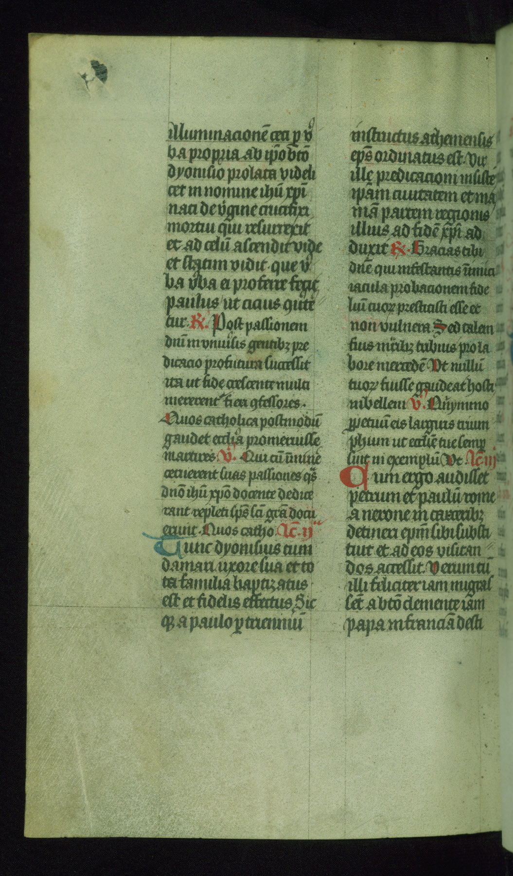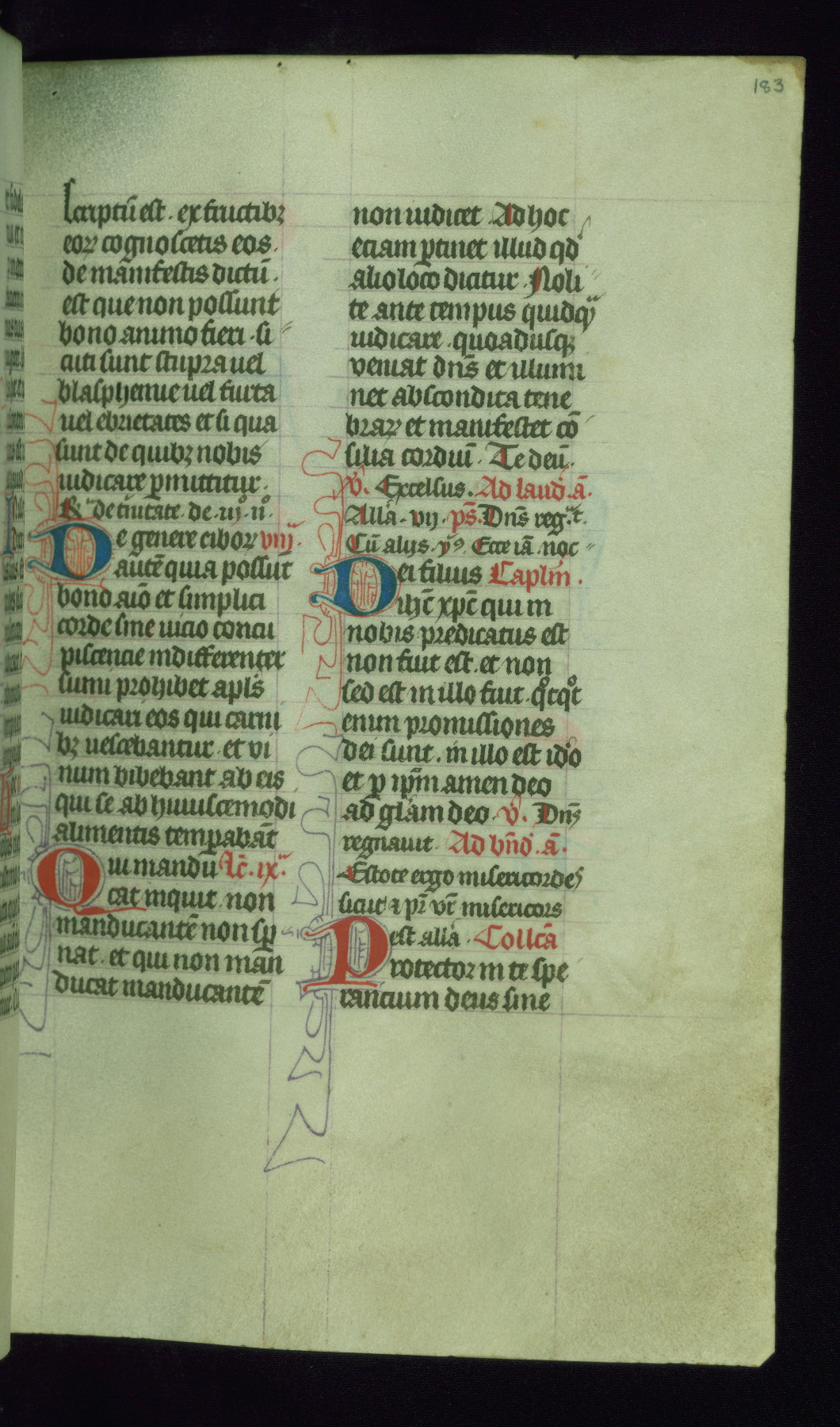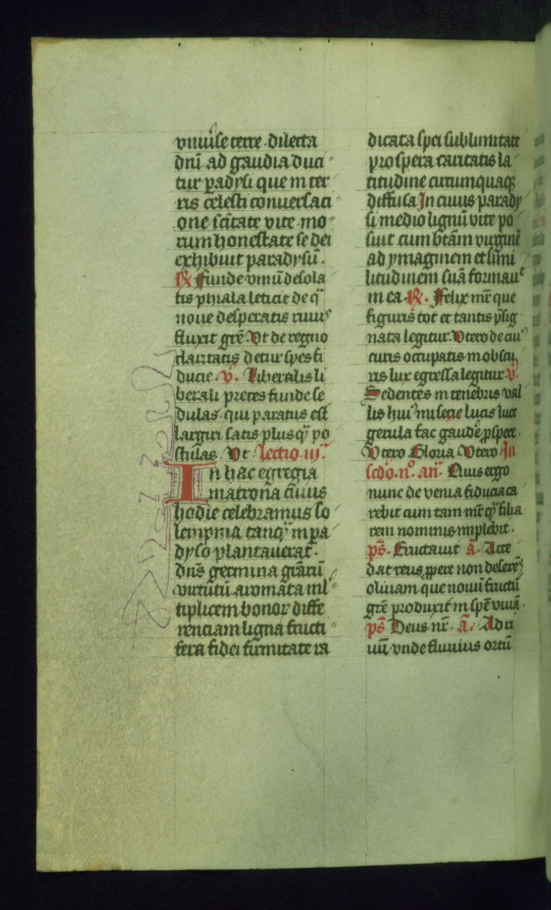 This small breviary, composed of more than 500 folios, is extraordinary for its length, considering it is the summer portion of a two-volume breviary for the use of Liège. The manuscript was completed for ecclesiastical use at the Cathedral of Notre-Dame and St.-Lambert in Liège ca. 1420. This attribution is suggested, for instance, by the petitions to the congregation of this cathedral (fols. 114v-117v), as well as the armorial shield of the family of Surlet de Chokier of Liège represented at the opening of the Psalms. The manuscript has modest, but interesting, decoration with historiated and decorated initials marking the liturgical texts, and occasional angels playing instruments in the margins. The most notable pictorial effect is found in the initials inhabited by transparent figures on rich blue ground. The technique is found, for instance, on fol. 156r with the gold monstrance held by translucent angels for the feast of the Corpus Christi.