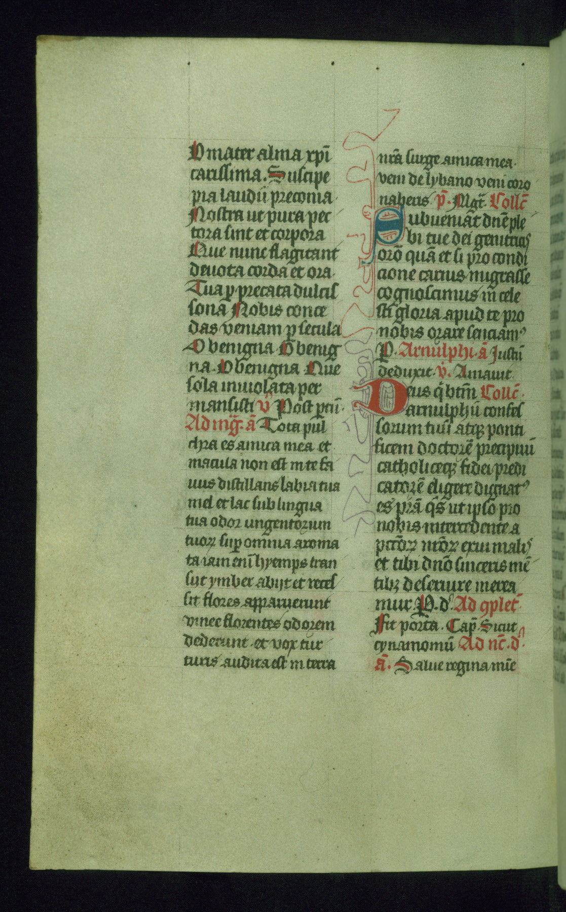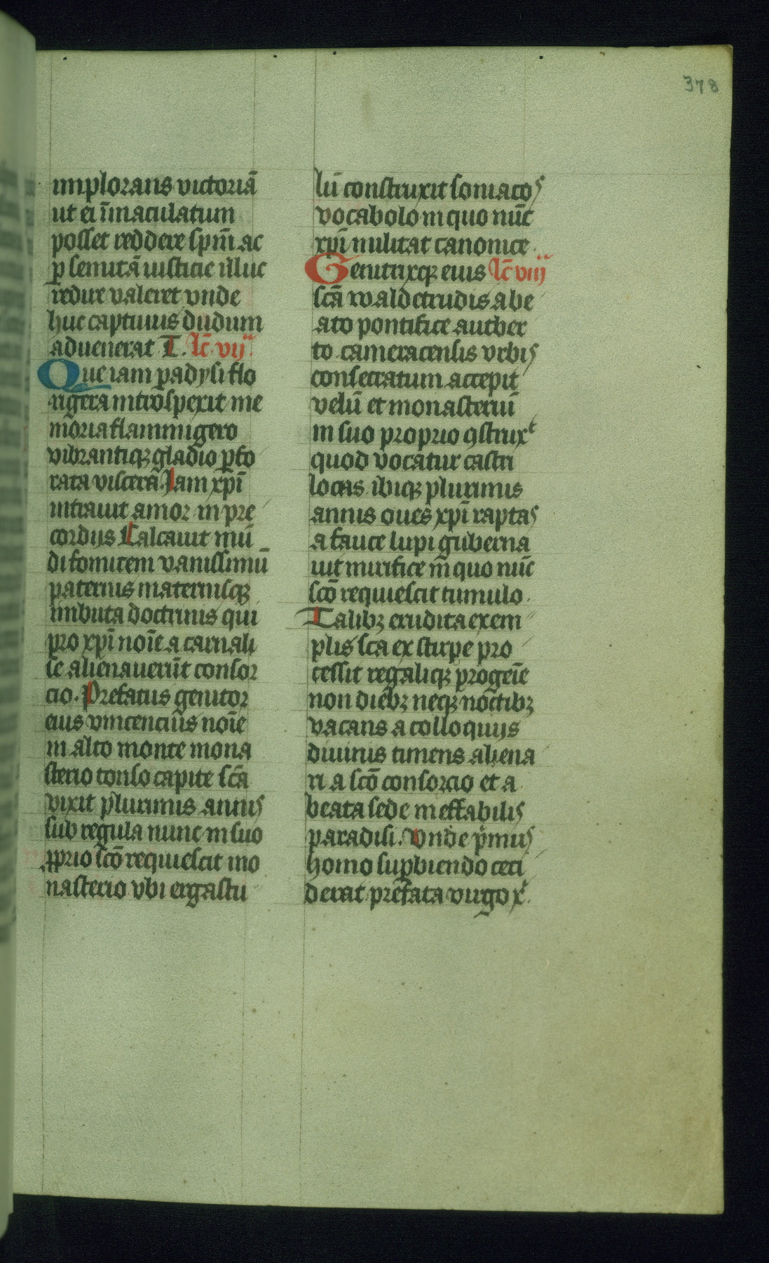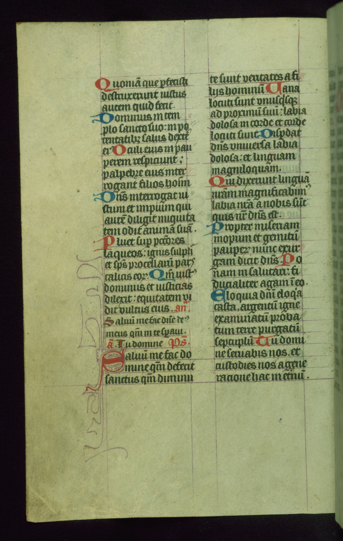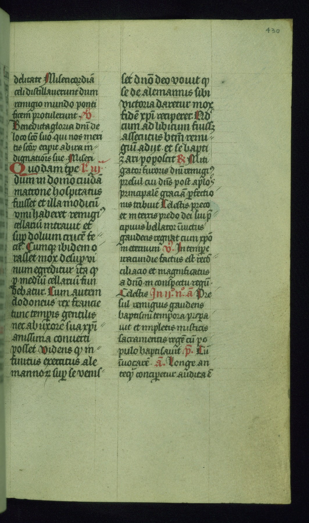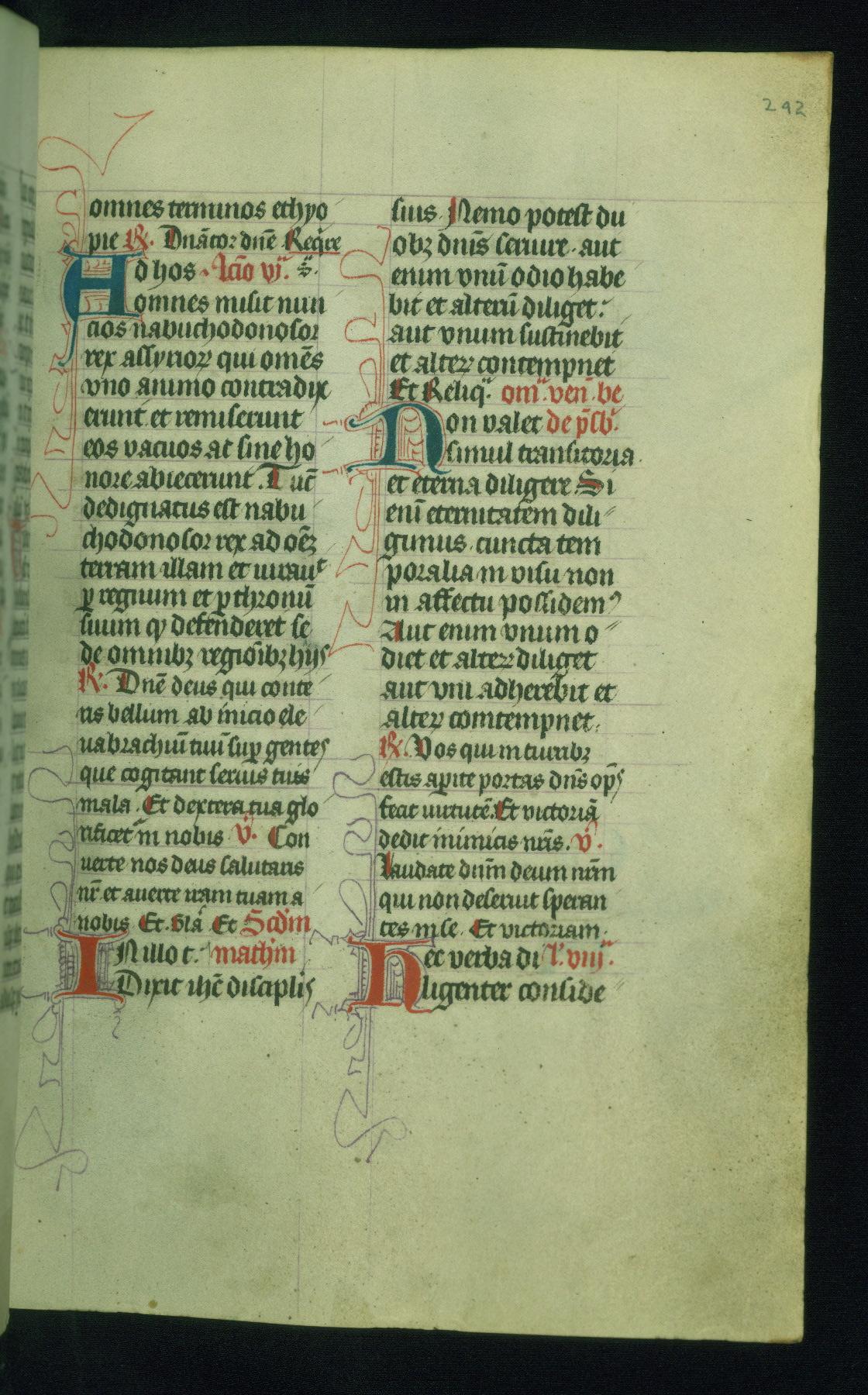 This small breviary, composed of more than 500 folios, is extraordinary for its length, considering it is the summer portion of a two-volume breviary for the use of Liège. The manuscript was completed for ecclesiastical use at the Cathedral of Notre-Dame and St.-Lambert in Liège ca. 1420. This attribution is suggested, for instance, by the petitions to the congregation of this cathedral (fols. 114v-117v), as well as the armorial shield of the family of Surlet de Chokier of Liège represented at the opening of the Psalms. The manuscript has modest, but interesting, decoration with historiated and decorated initials marking the liturgical texts, and occasional angels playing instruments in the margins. The most notable pictorial effect is found in the initials inhabited by transparent figures on rich blue ground. The technique is found, for instance, on fol. 156r with the gold monstrance held by translucent angels for the feast of the Corpus Christi.