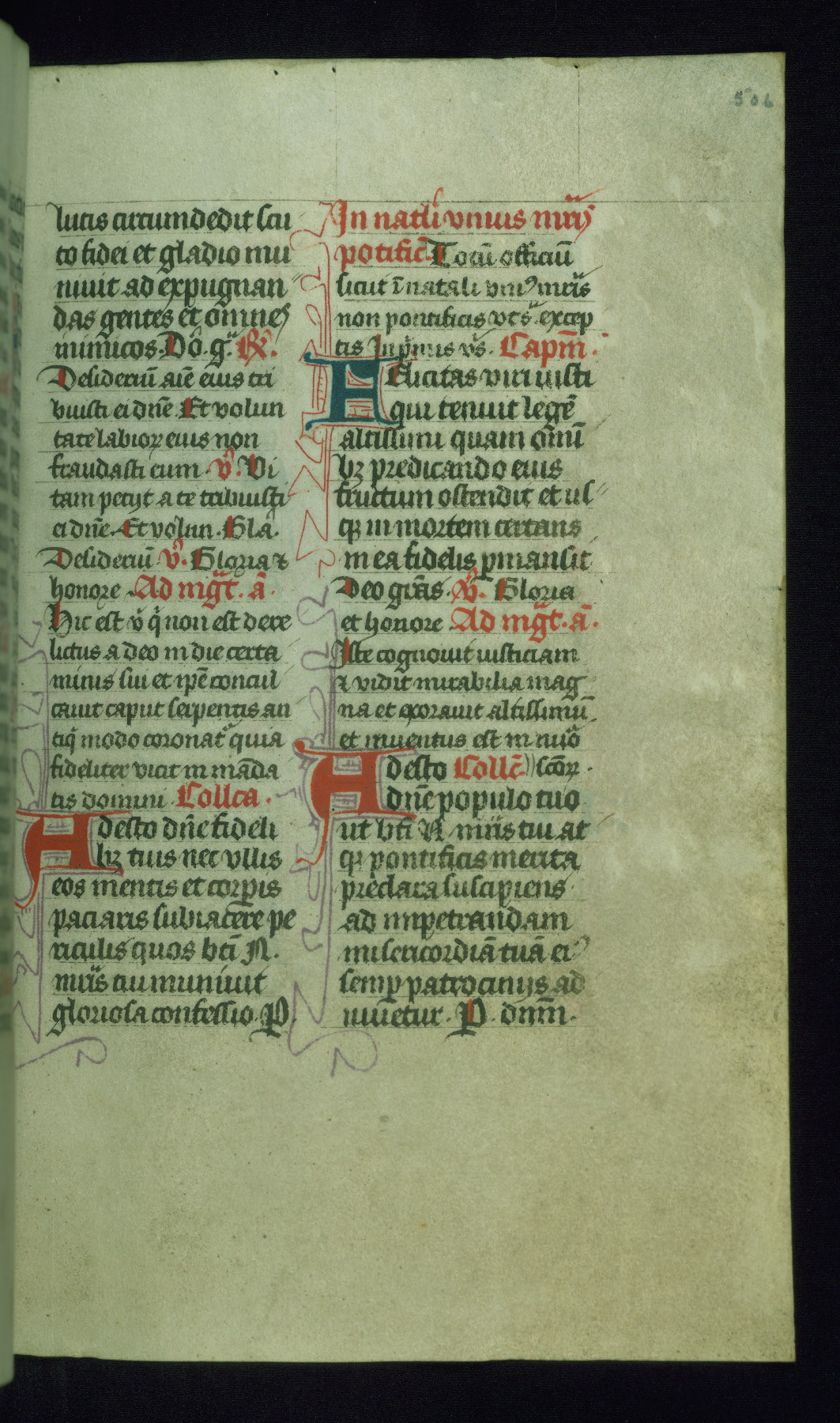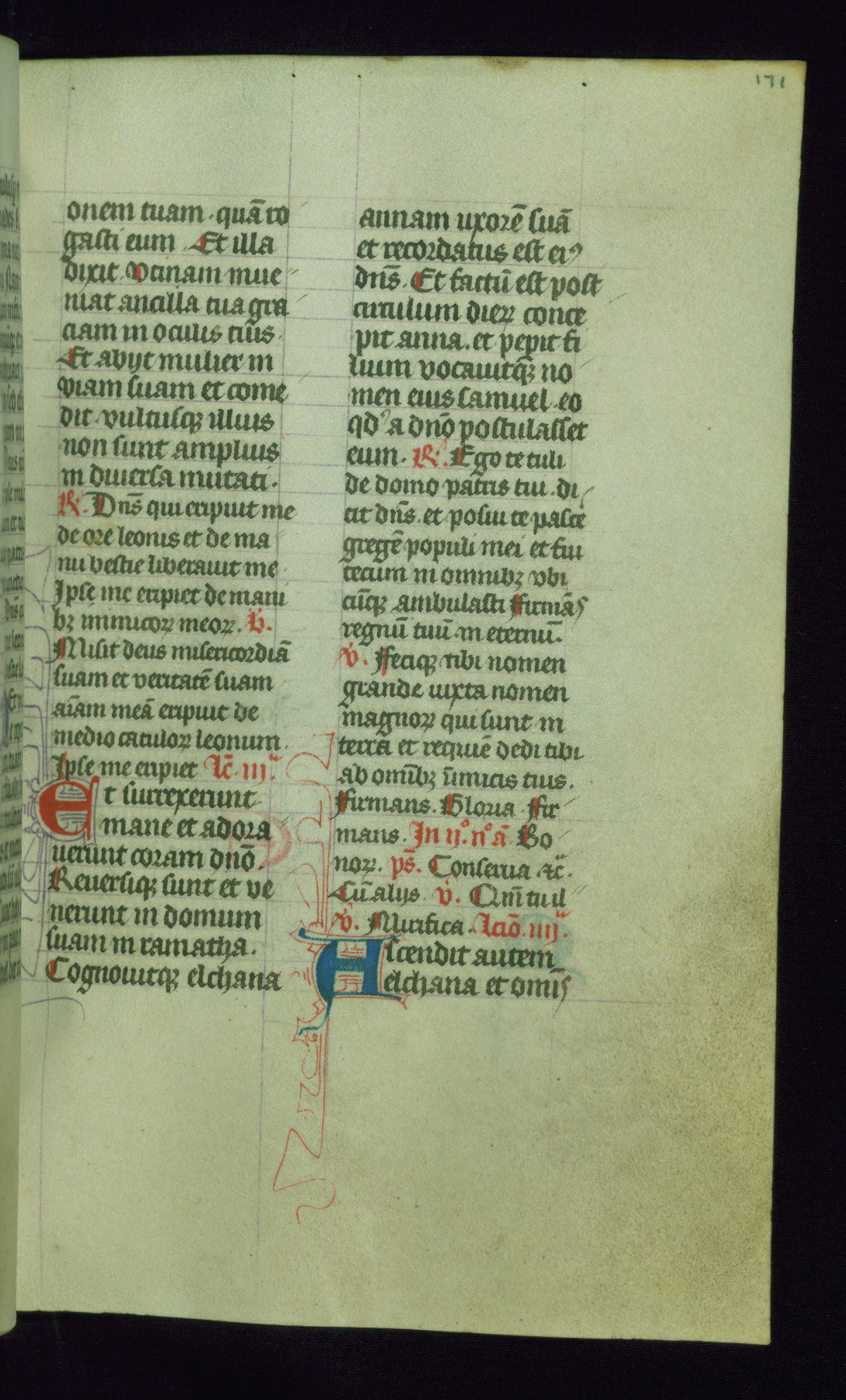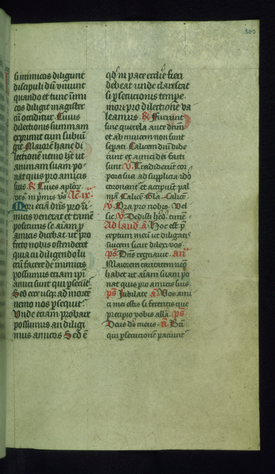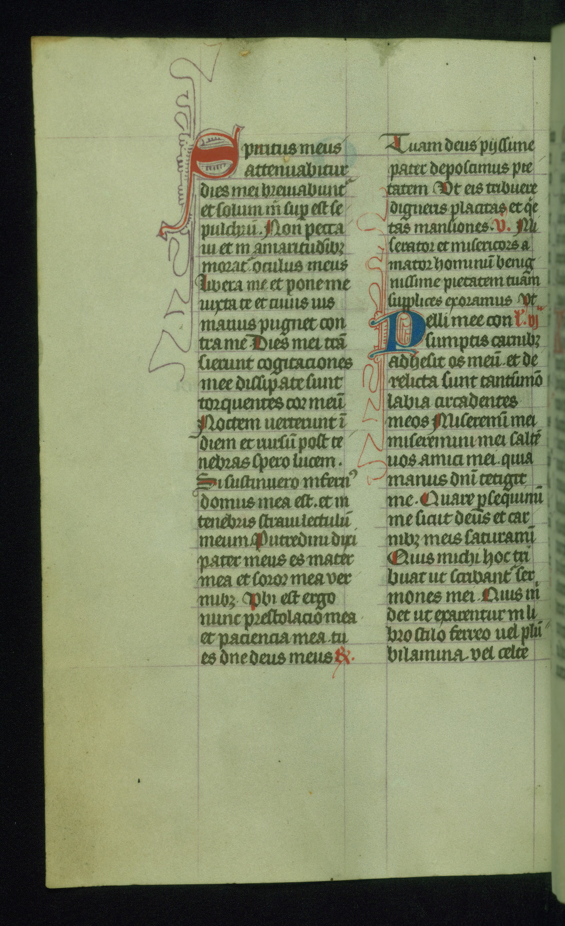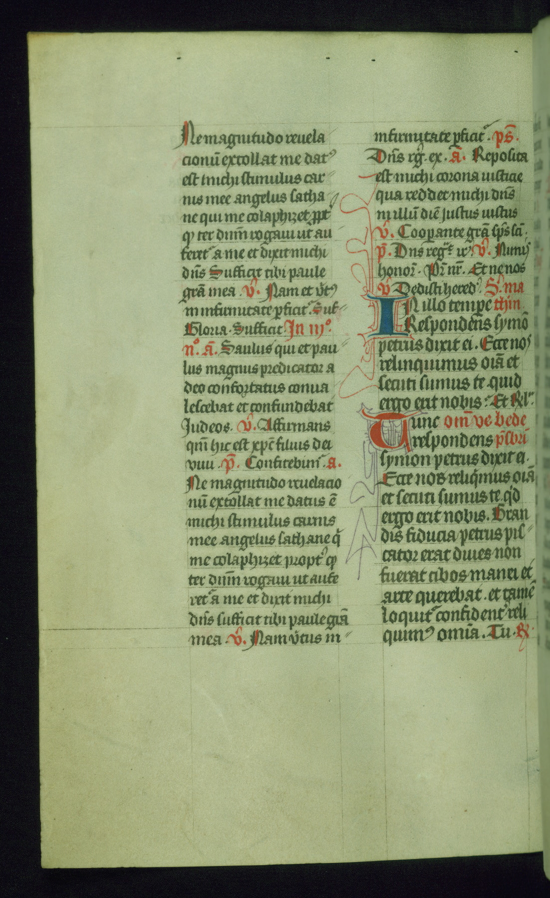 This small breviary, composed of more than 500 folios, is extraordinary for its length, considering it is the summer portion of a two-volume breviary for the use of Liège. The manuscript was completed for ecclesiastical use at the Cathedral of Notre-Dame and St.-Lambert in Liège ca. 1420. This attribution is suggested, for instance, by the petitions to the congregation of this cathedral (fols. 114v-117v), as well as the armorial shield of the family of Surlet de Chokier of Liège represented at the opening of the Psalms. The manuscript has modest, but interesting, decoration with historiated and decorated initials marking the liturgical texts, and occasional angels playing instruments in the margins. The most notable pictorial effect is found in the initials inhabited by transparent figures on rich blue ground. The technique is found, for instance, on fol. 156r with the gold monstrance held by translucent angels for the feast of the Corpus Christi.