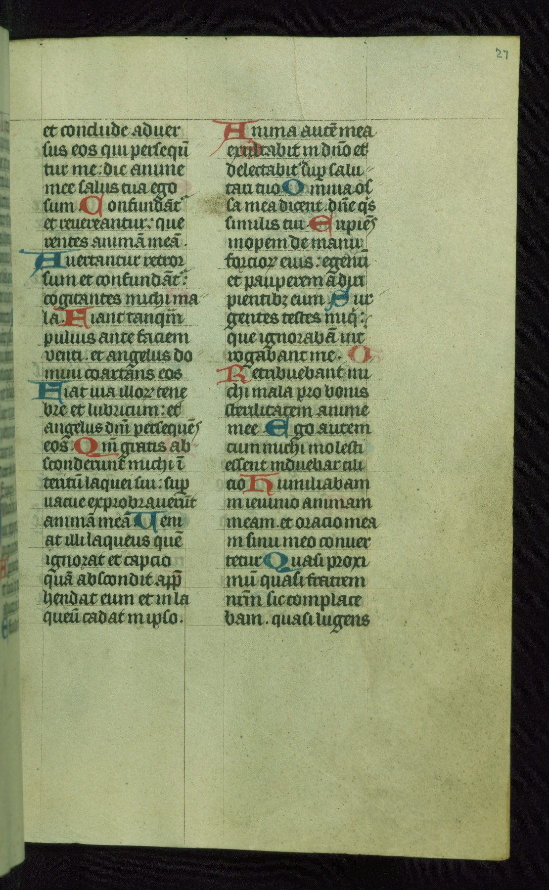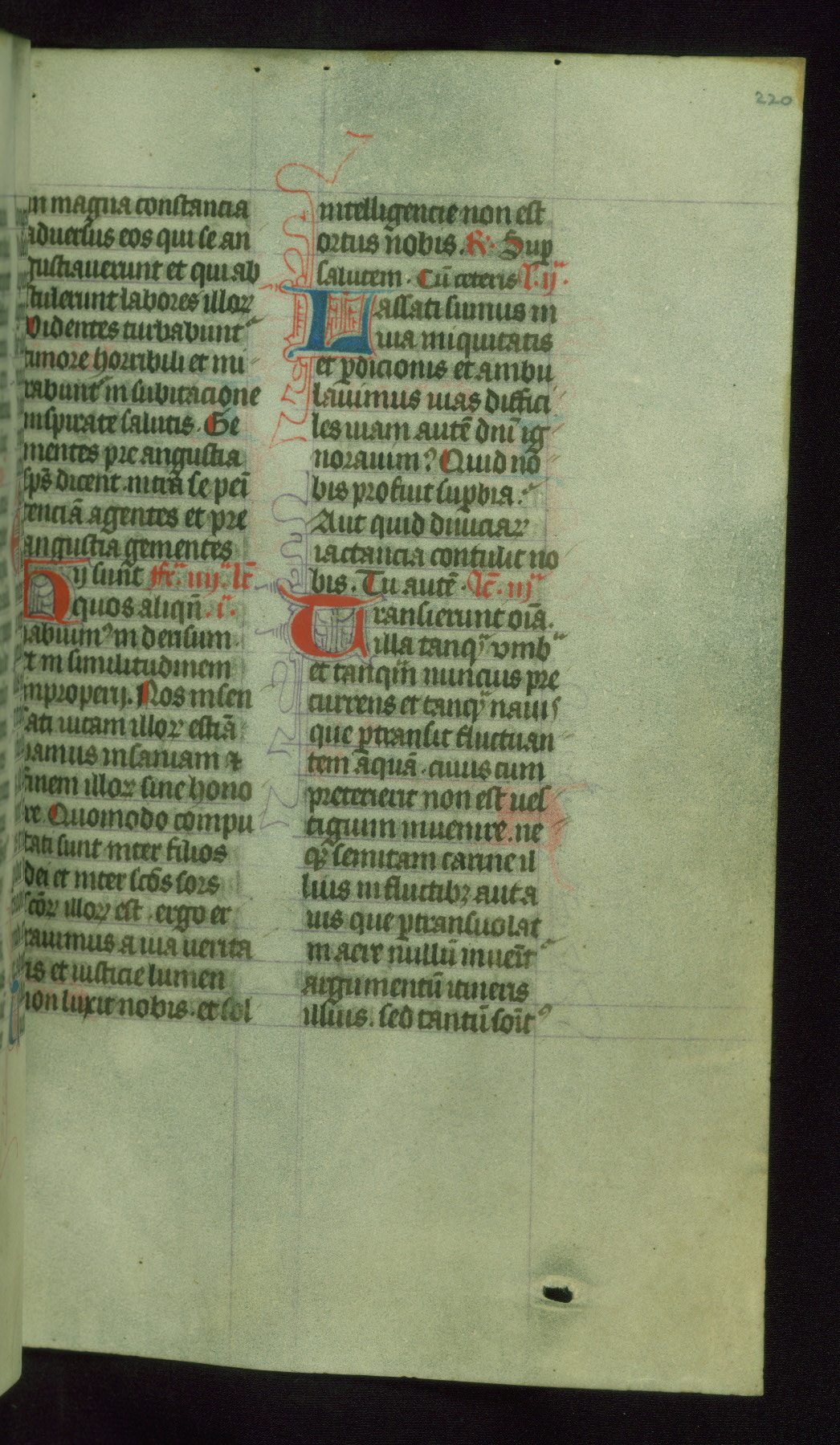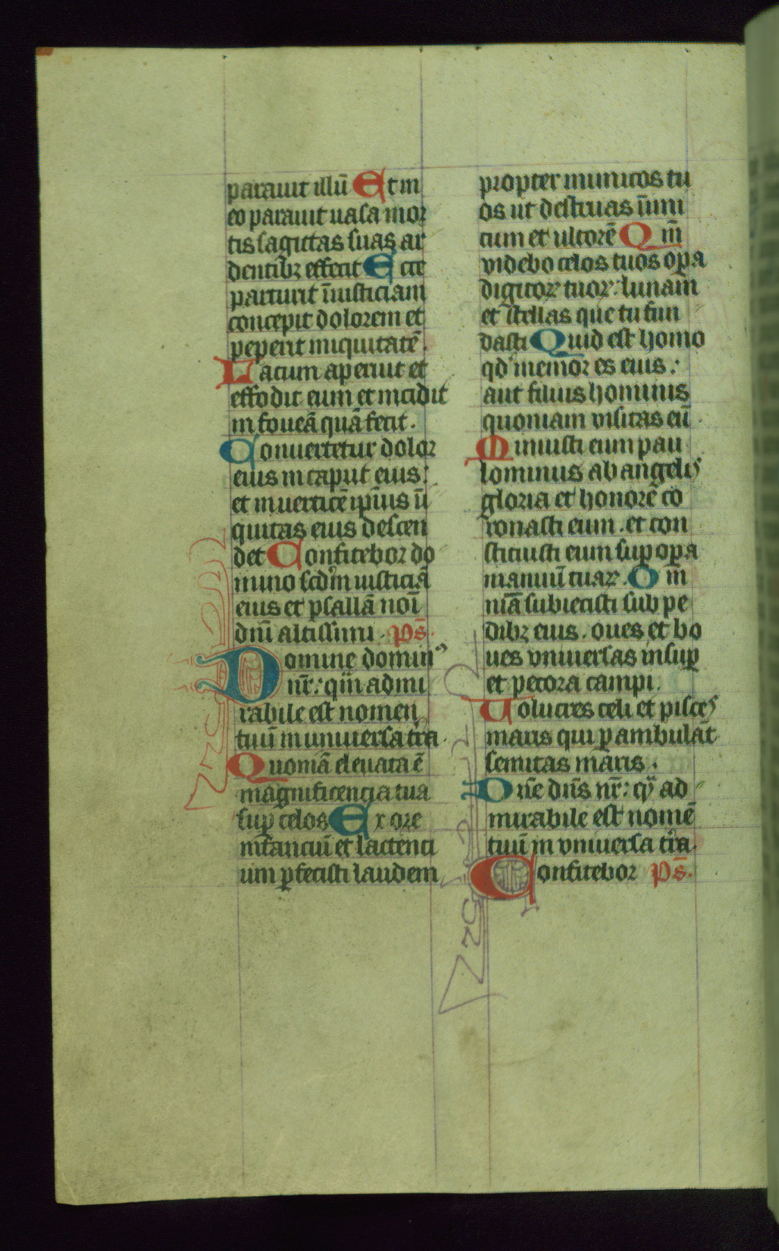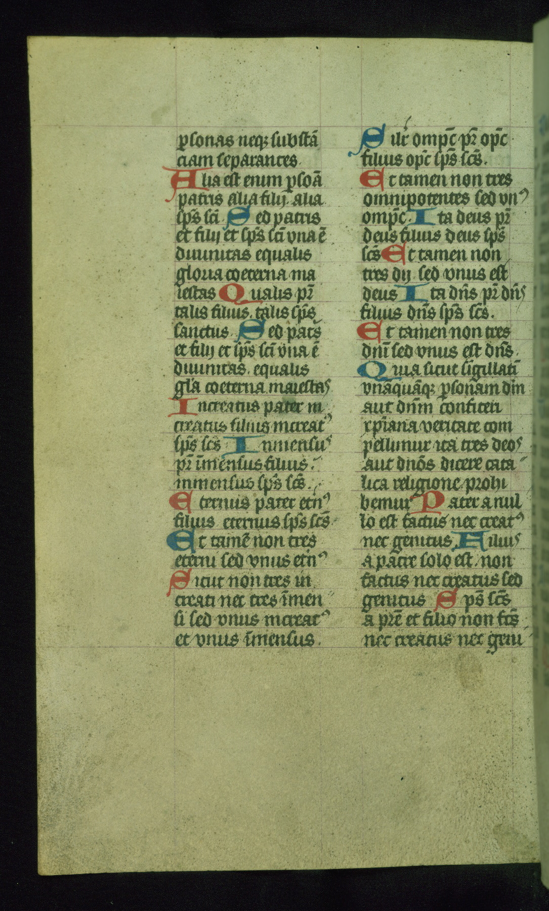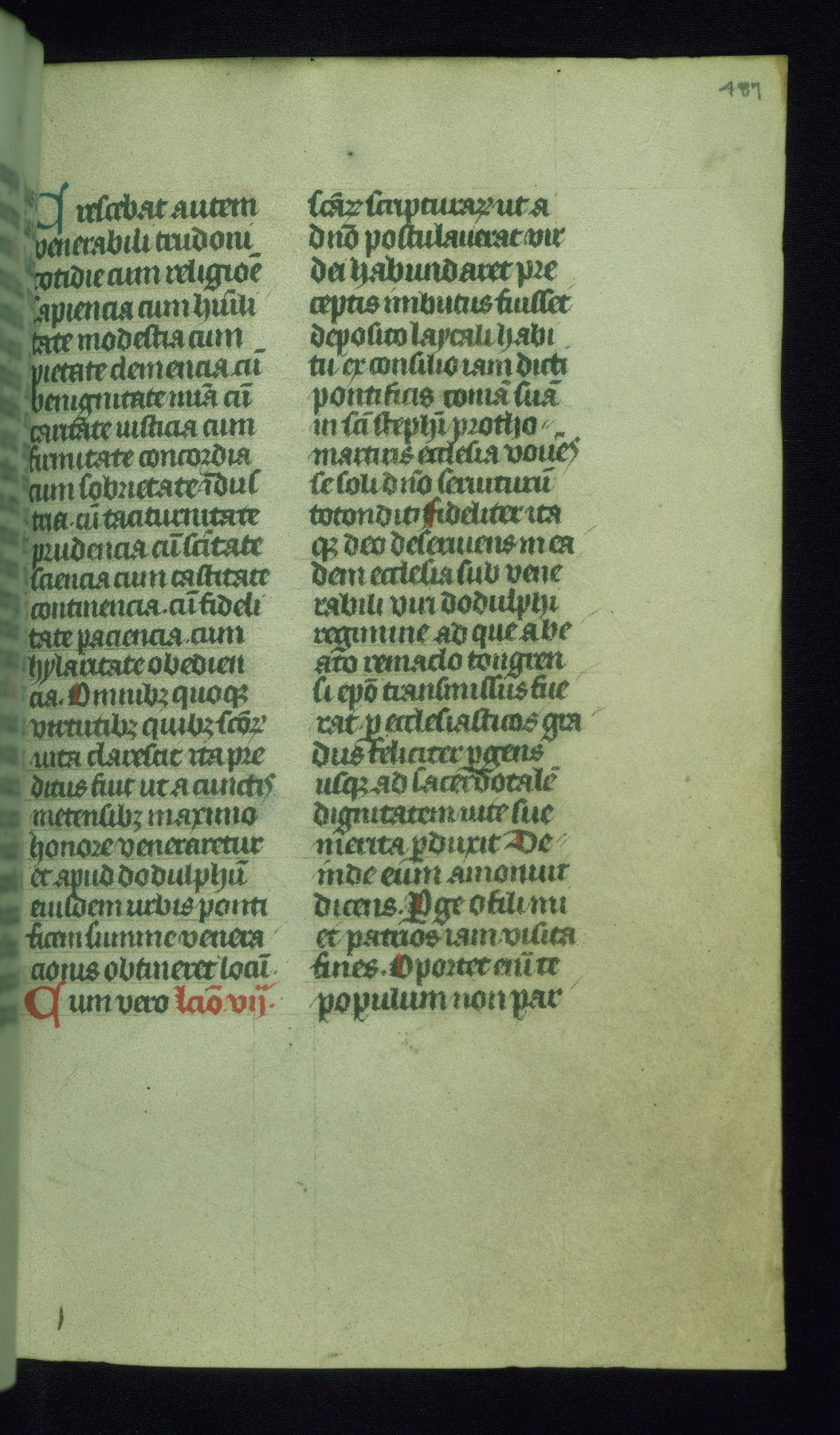 This small breviary, composed of more than 500 folios, is extraordinary for its length, considering it is the summer portion of a two-volume breviary for the use of Liège. The manuscript was completed for ecclesiastical use at the Cathedral of Notre-Dame and St.-Lambert in Liège ca. 1420. This attribution is suggested, for instance, by the petitions to the congregation of this cathedral (fols. 114v-117v), as well as the armorial shield of the family of Surlet de Chokier of Liège represented at the opening of the Psalms. The manuscript has modest, but interesting, decoration with historiated and decorated initials marking the liturgical texts, and occasional angels playing instruments in the margins. The most notable pictorial effect is found in the initials inhabited by transparent figures on rich blue ground. The technique is found, for instance, on fol. 156r with the gold monstrance held by translucent angels for the feast of the Corpus Christi.