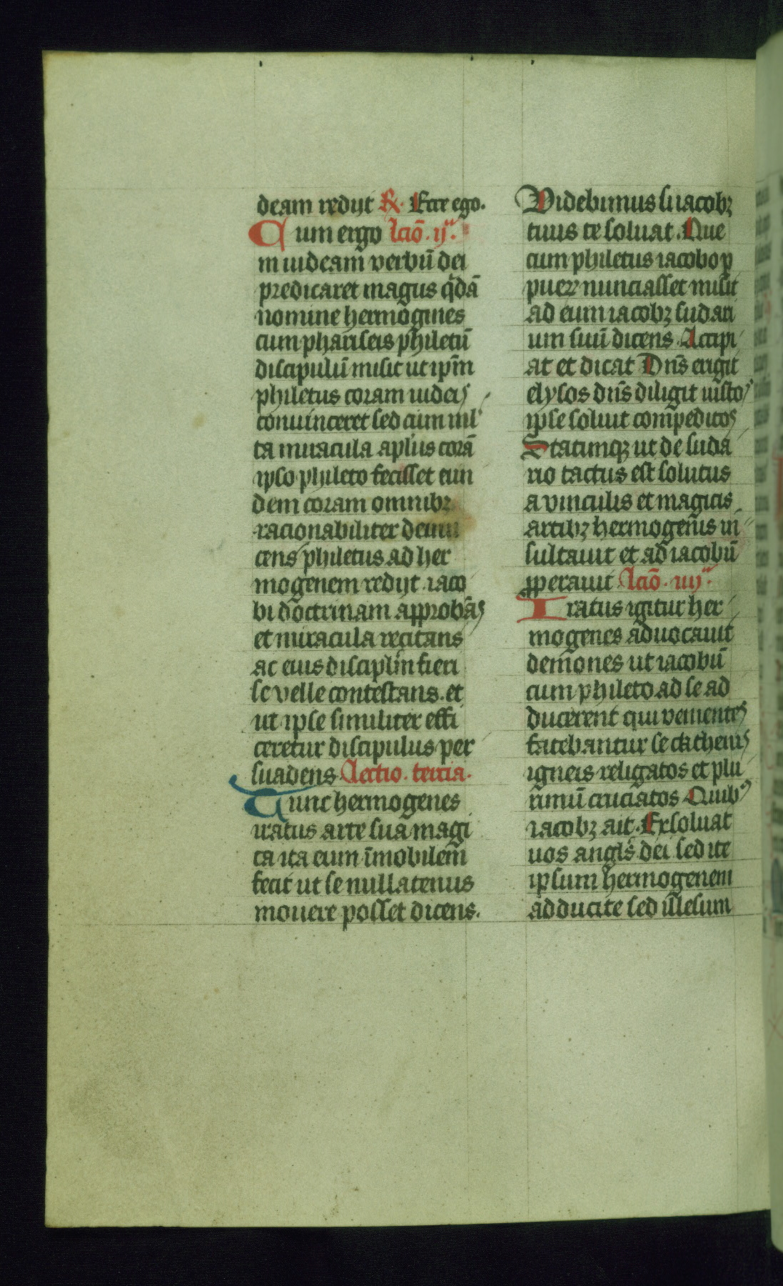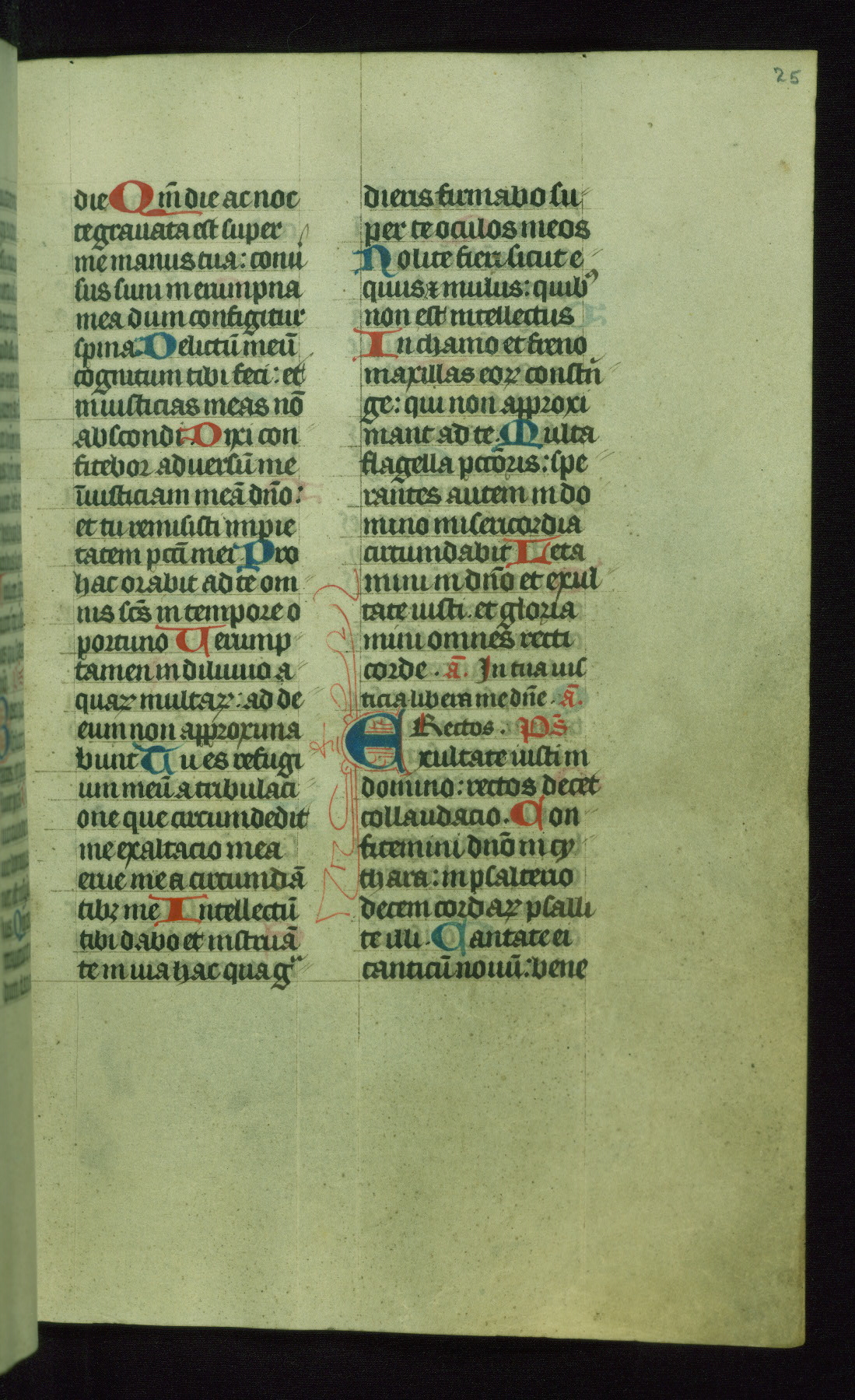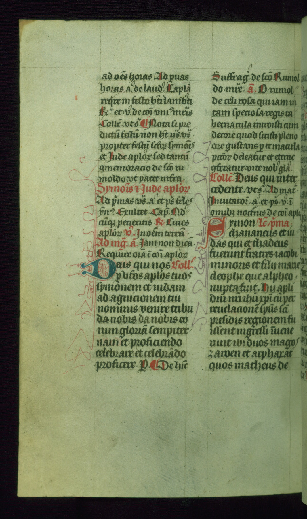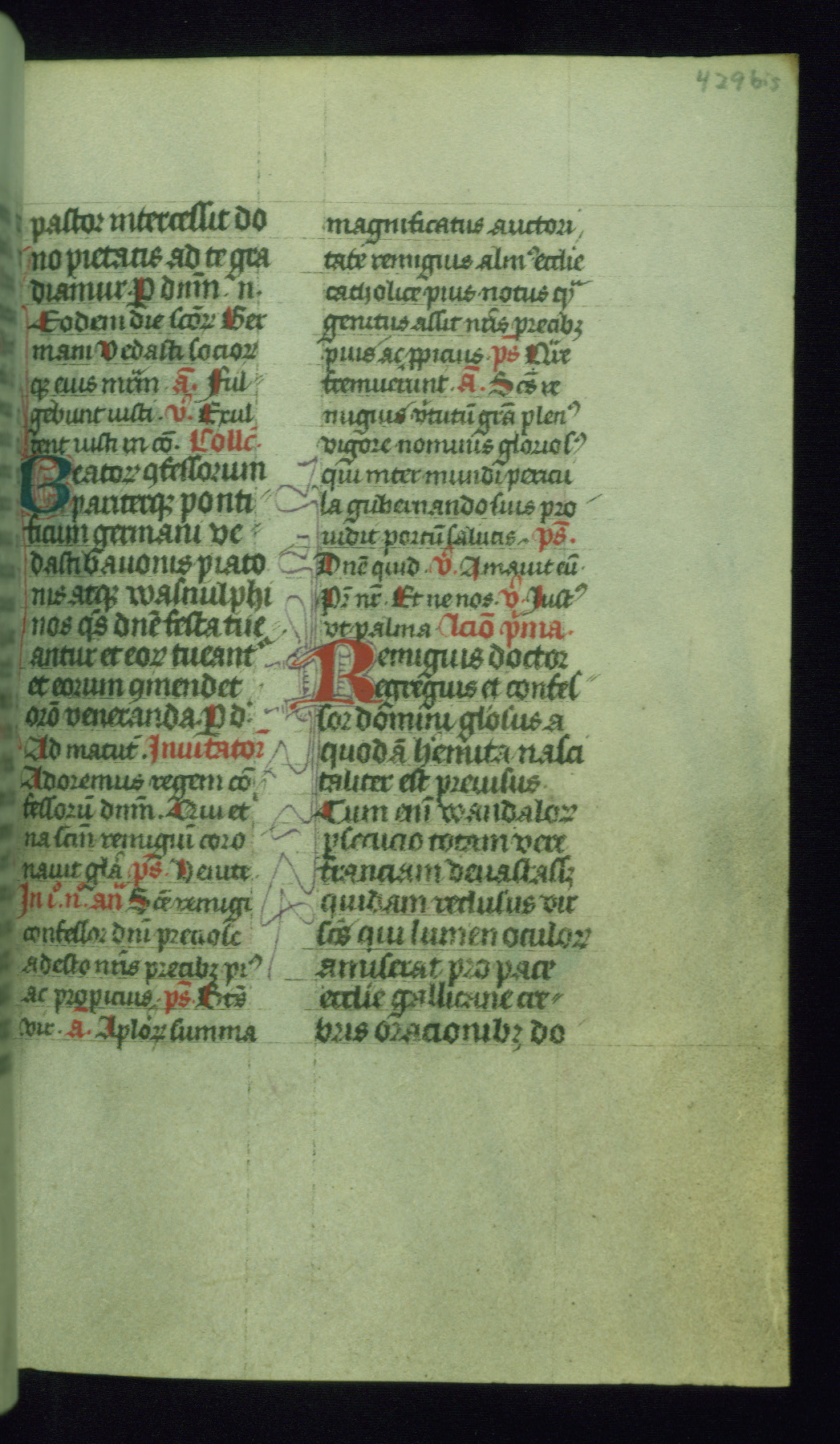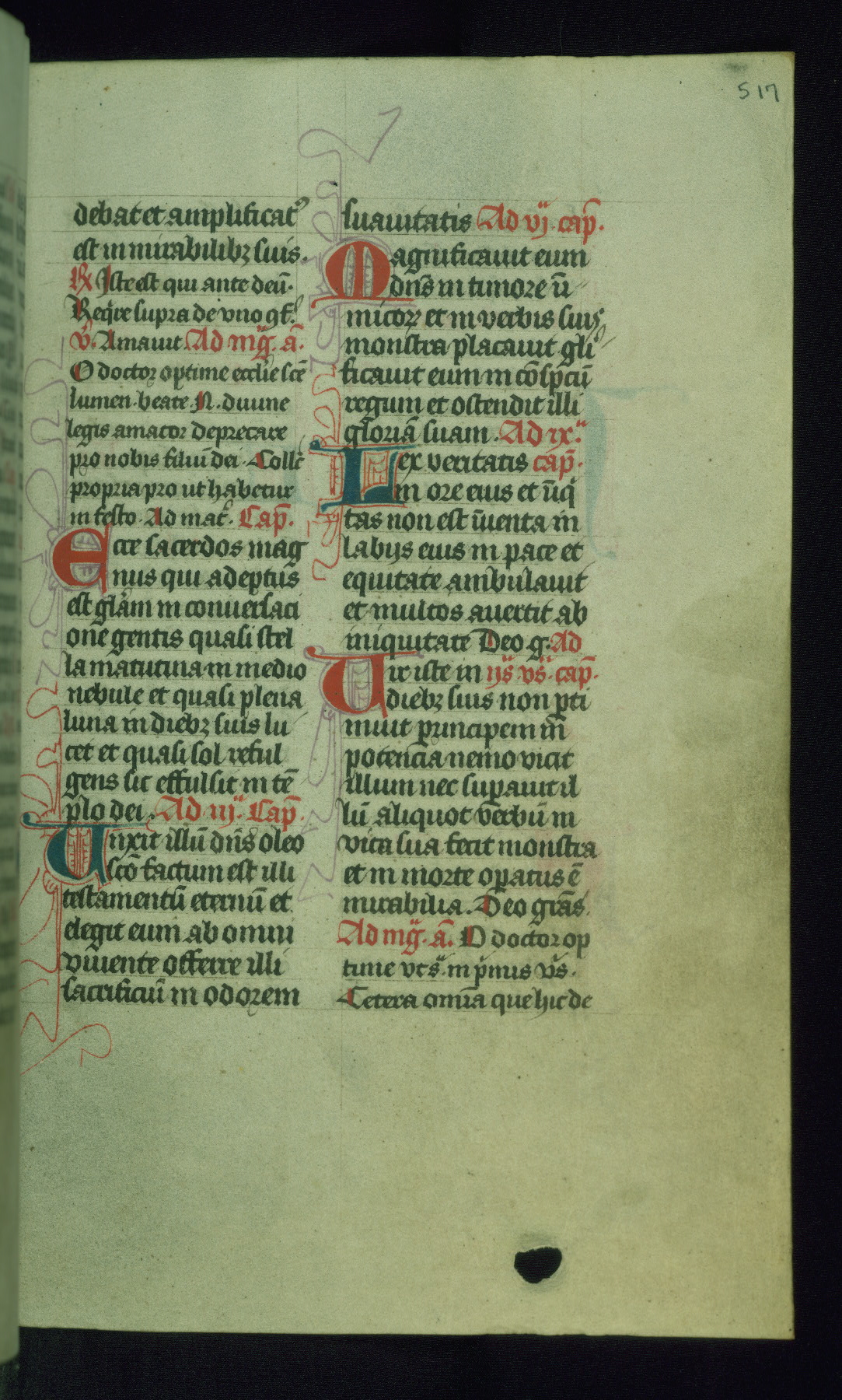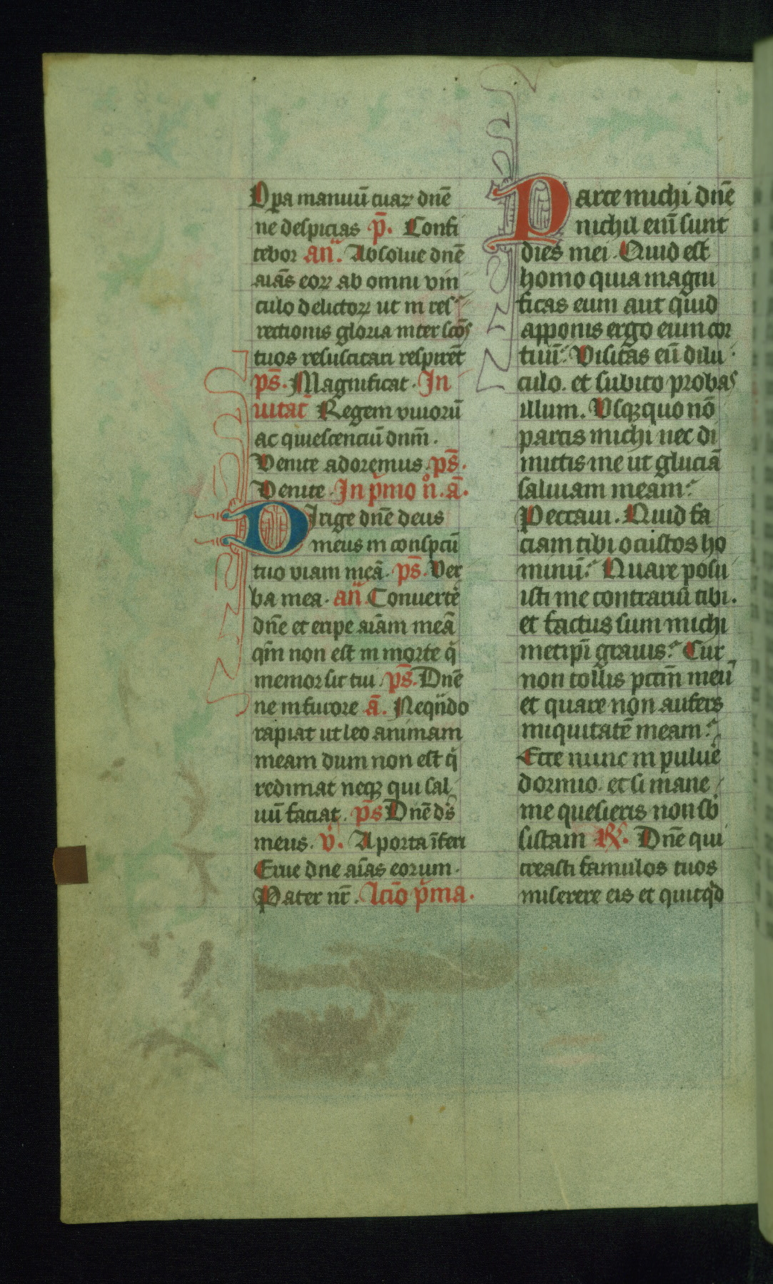 This small breviary, composed of more than 500 folios, is extraordinary for its length, considering it is the summer portion of a two-volume breviary for the use of Liège. The manuscript was completed for ecclesiastical use at the Cathedral of Notre-Dame and St.-Lambert in Liège ca. 1420. This attribution is suggested, for instance, by the petitions to the congregation of this cathedral (fols. 114v-117v), as well as the armorial shield of the family of Surlet de Chokier of Liège represented at the opening of the Psalms. The manuscript has modest, but interesting, decoration with historiated and decorated initials marking the liturgical texts, and occasional angels playing instruments in the margins. The most notable pictorial effect is found in the initials inhabited by transparent figures on rich blue ground. The technique is found, for instance, on fol. 156r with the gold monstrance held by translucent angels for the feast of the Corpus Christi.