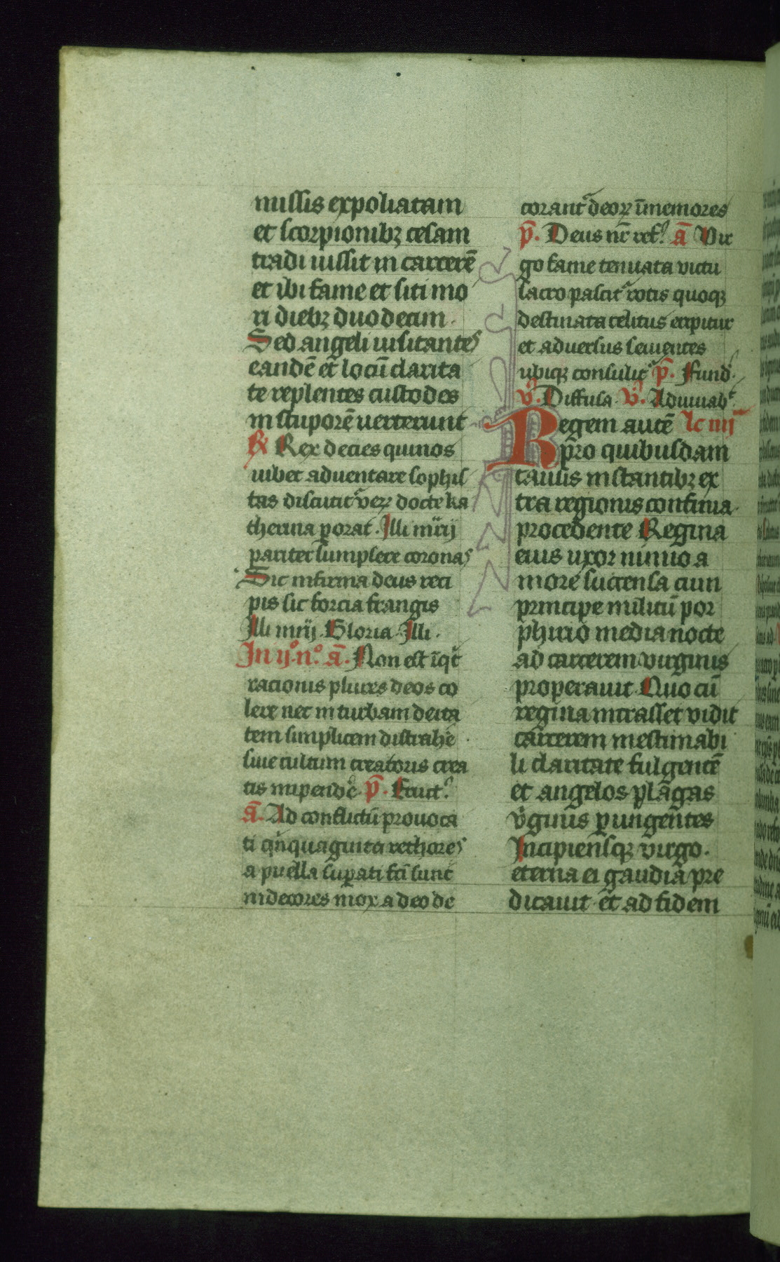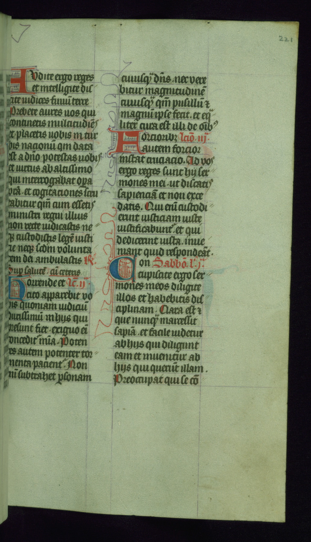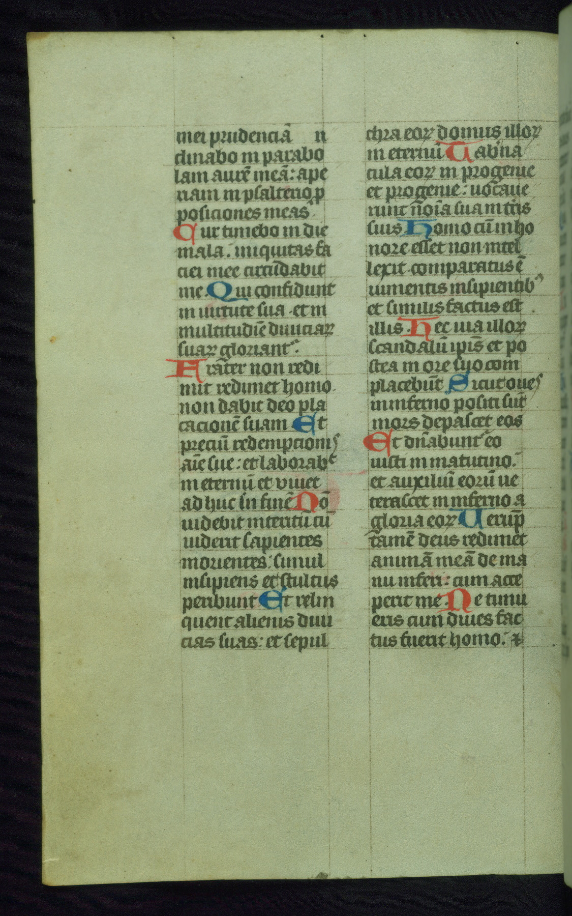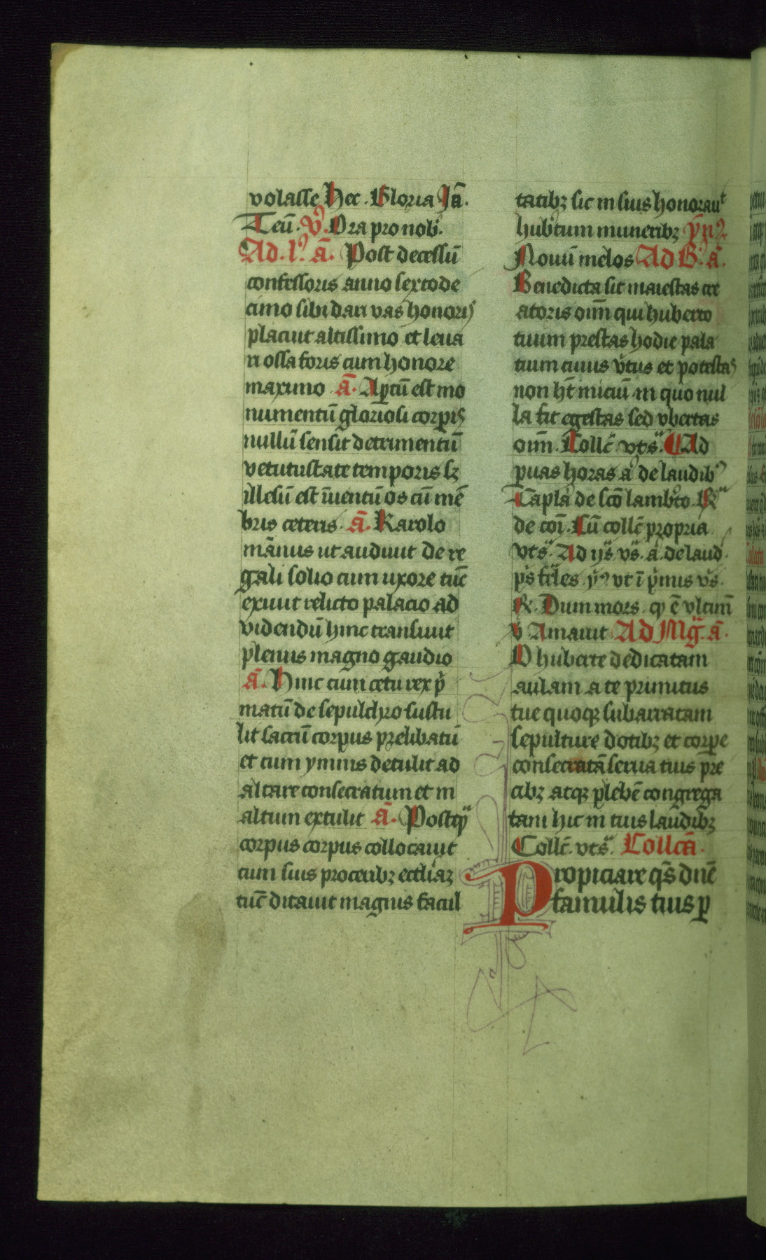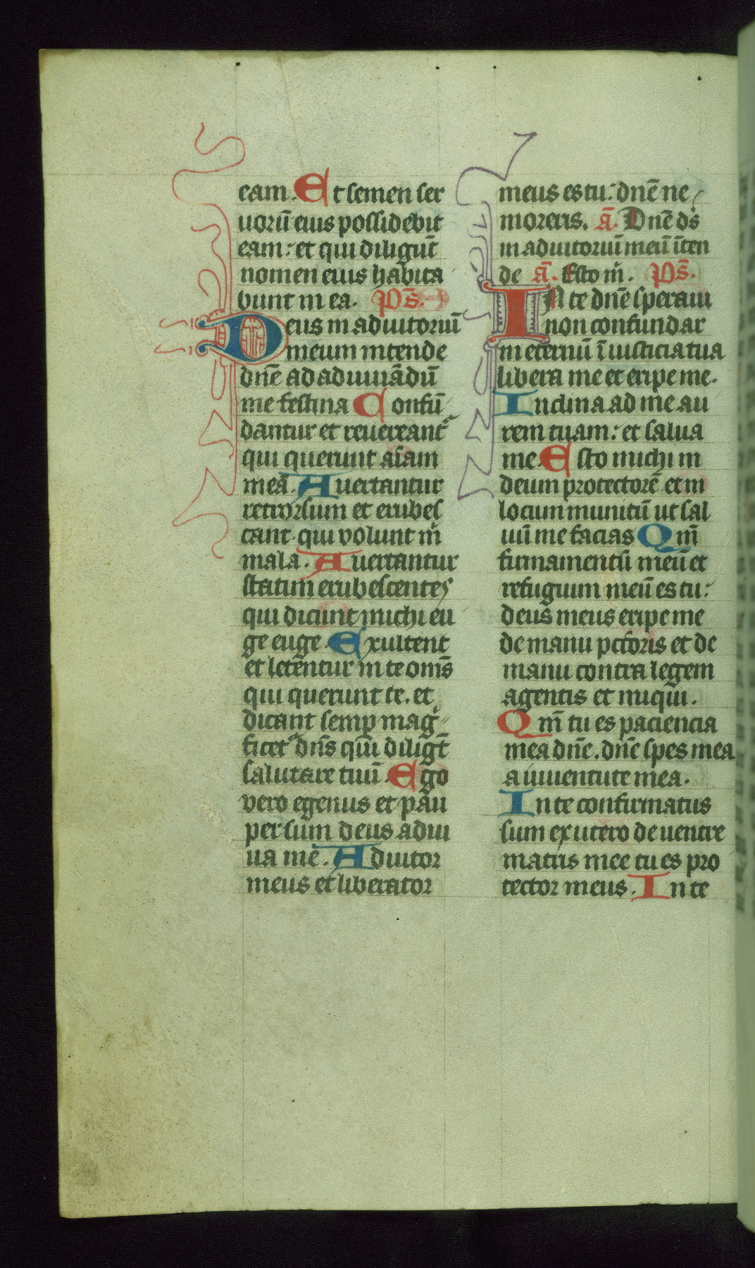 This small breviary, composed of more than 500 folios, is extraordinary for its length, considering it is the summer portion of a two-volume breviary for the use of Liège. The manuscript was completed for ecclesiastical use at the Cathedral of Notre-Dame and St.-Lambert in Liège ca. 1420. This attribution is suggested, for instance, by the petitions to the congregation of this cathedral (fols. 114v-117v), as well as the armorial shield of the family of Surlet de Chokier of Liège represented at the opening of the Psalms. The manuscript has modest, but interesting, decoration with historiated and decorated initials marking the liturgical texts, and occasional angels playing instruments in the margins. The most notable pictorial effect is found in the initials inhabited by transparent figures on rich blue ground. The technique is found, for instance, on fol. 156r with the gold monstrance held by translucent angels for the feast of the Corpus Christi.