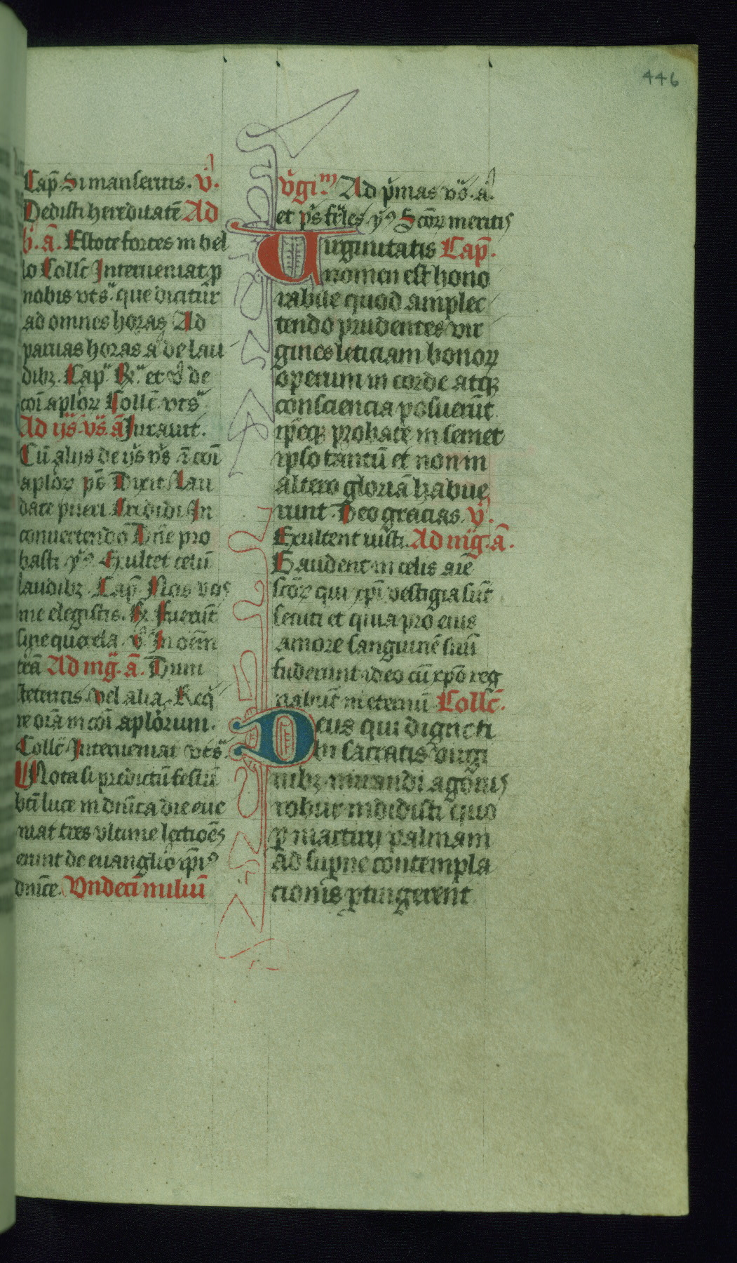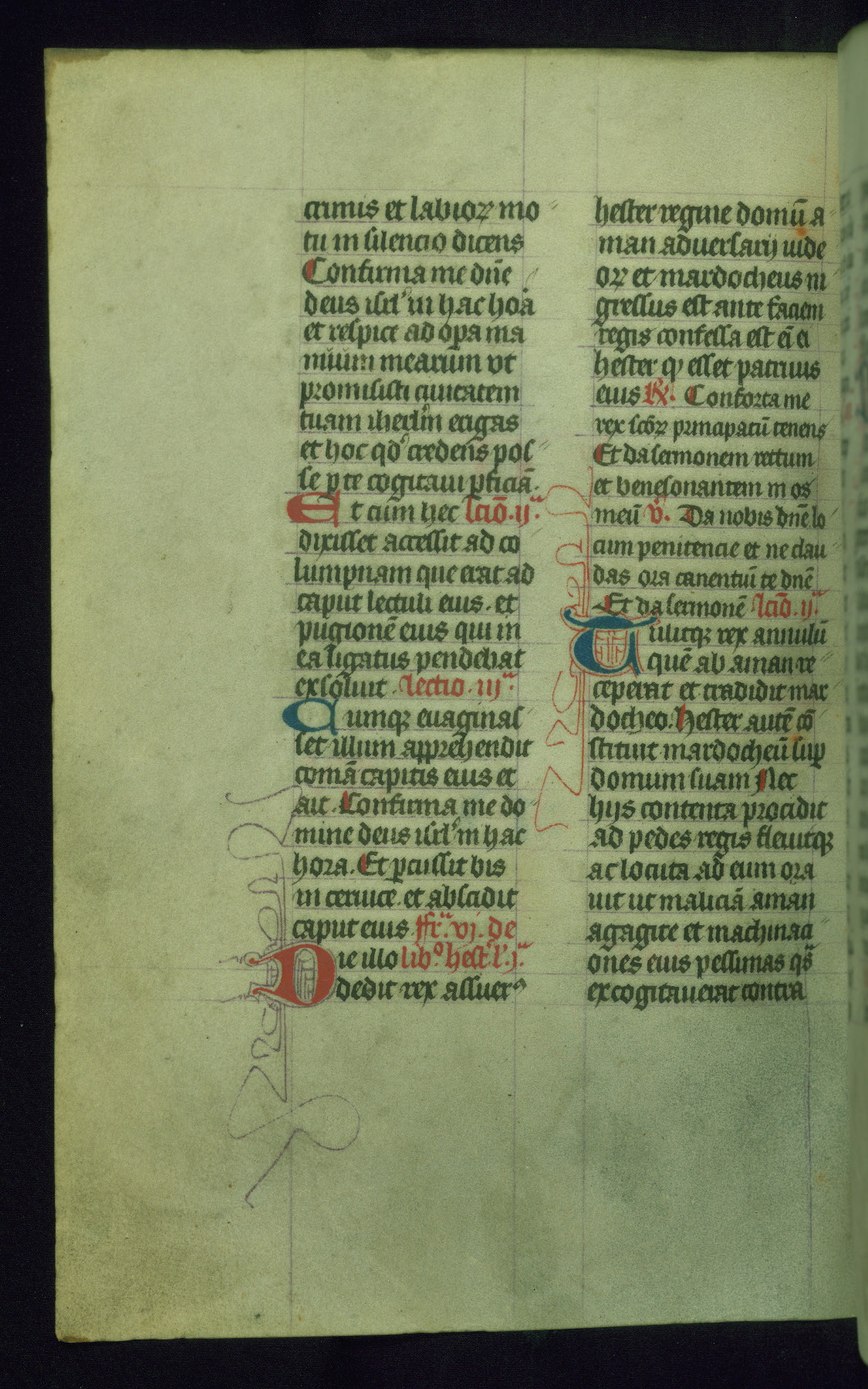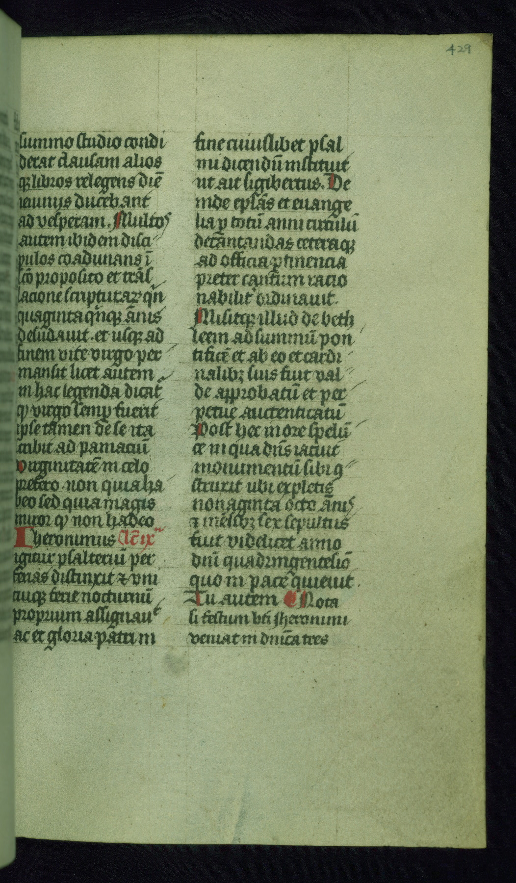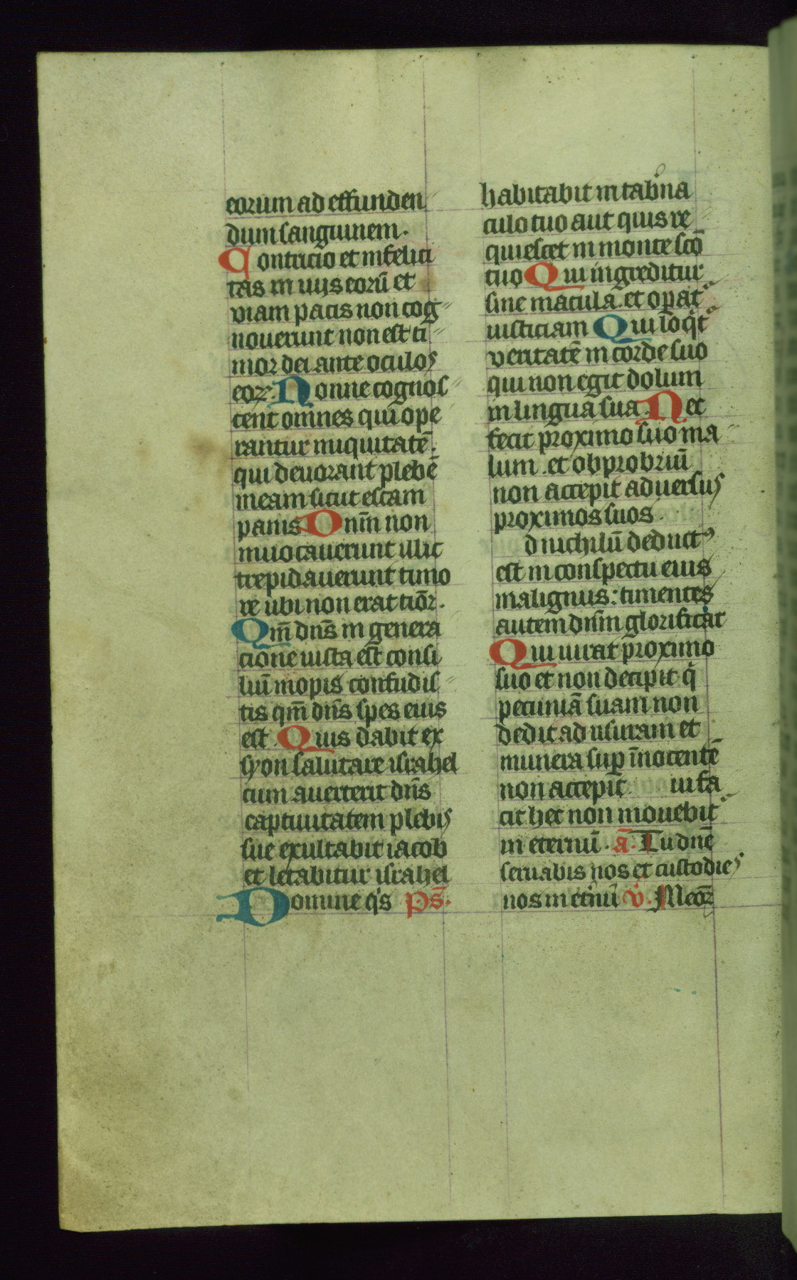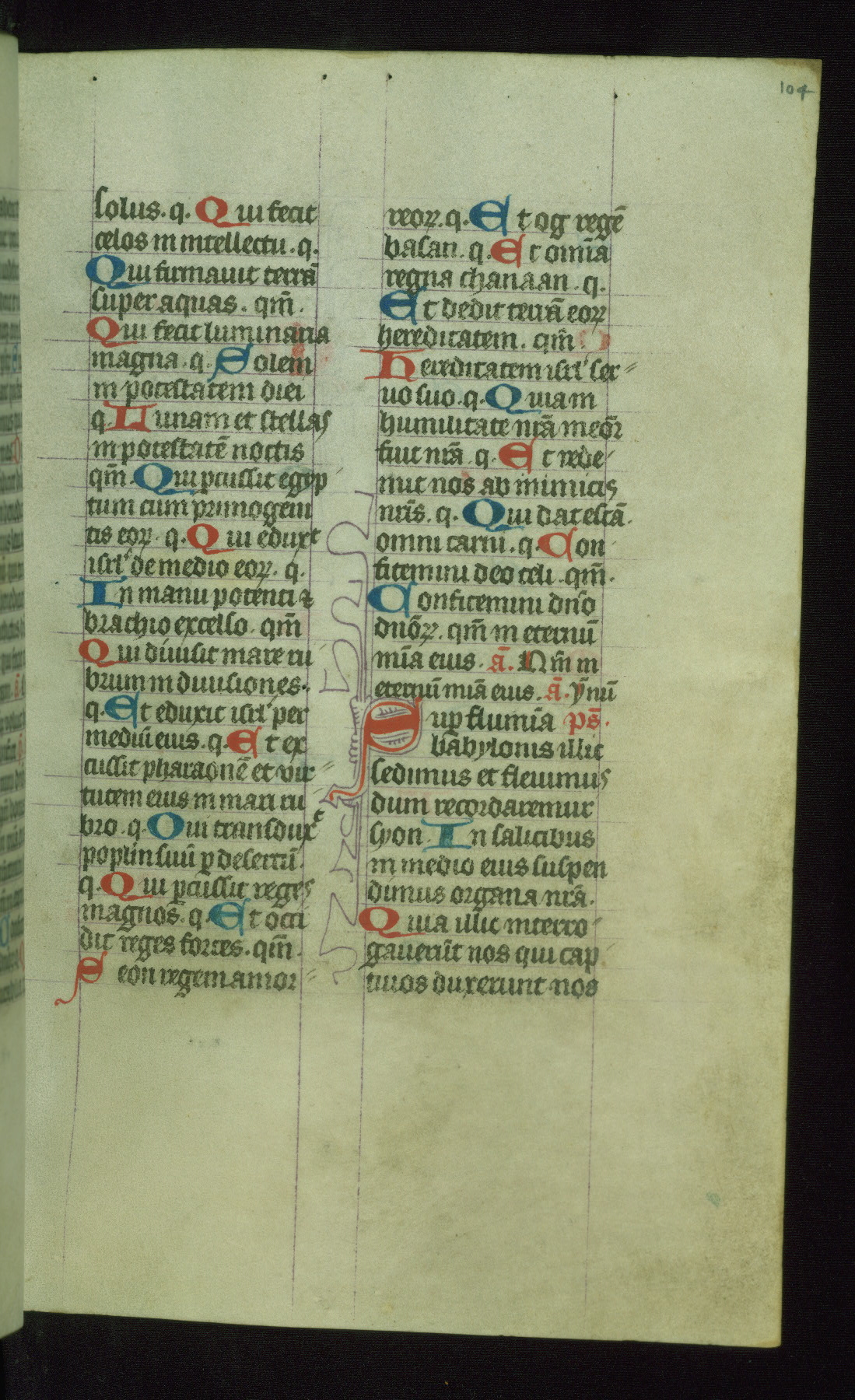 This small breviary, composed of more than 500 folios, is extraordinary for its length, considering it is the summer portion of a two-volume breviary for the use of Liège. The manuscript was completed for ecclesiastical use at the Cathedral of Notre-Dame and St.-Lambert in Liège ca. 1420. This attribution is suggested, for instance, by the petitions to the congregation of this cathedral (fols. 114v-117v), as well as the armorial shield of the family of Surlet de Chokier of Liège represented at the opening of the Psalms. The manuscript has modest, but interesting, decoration with historiated and decorated initials marking the liturgical texts, and occasional angels playing instruments in the margins. The most notable pictorial effect is found in the initials inhabited by transparent figures on rich blue ground. The technique is found, for instance, on fol. 156r with the gold monstrance held by translucent angels for the feast of the Corpus Christi.