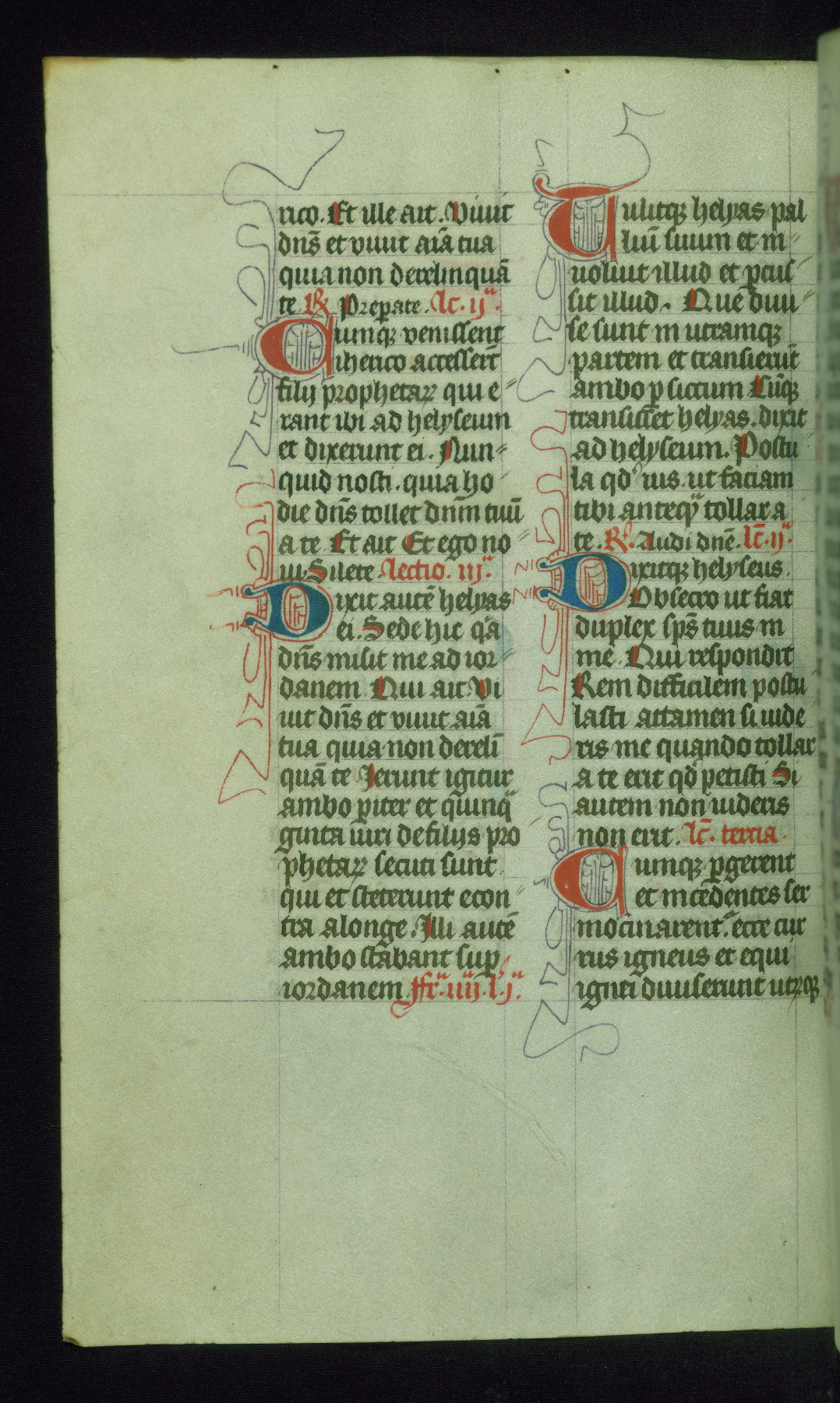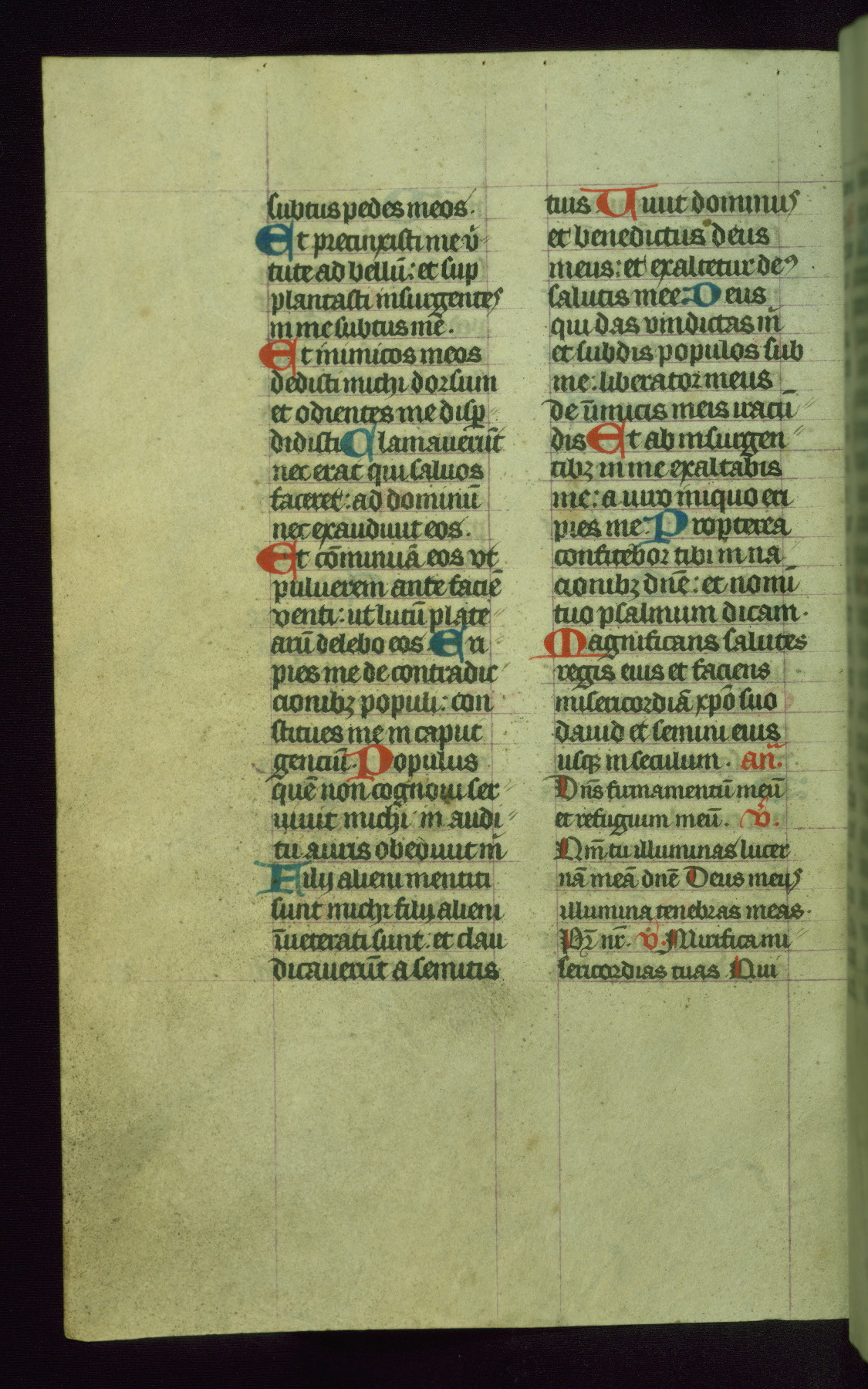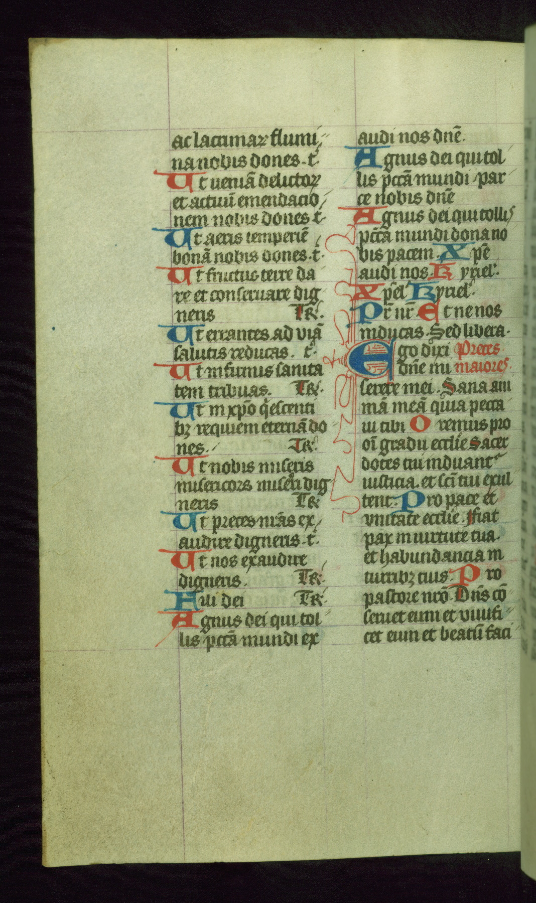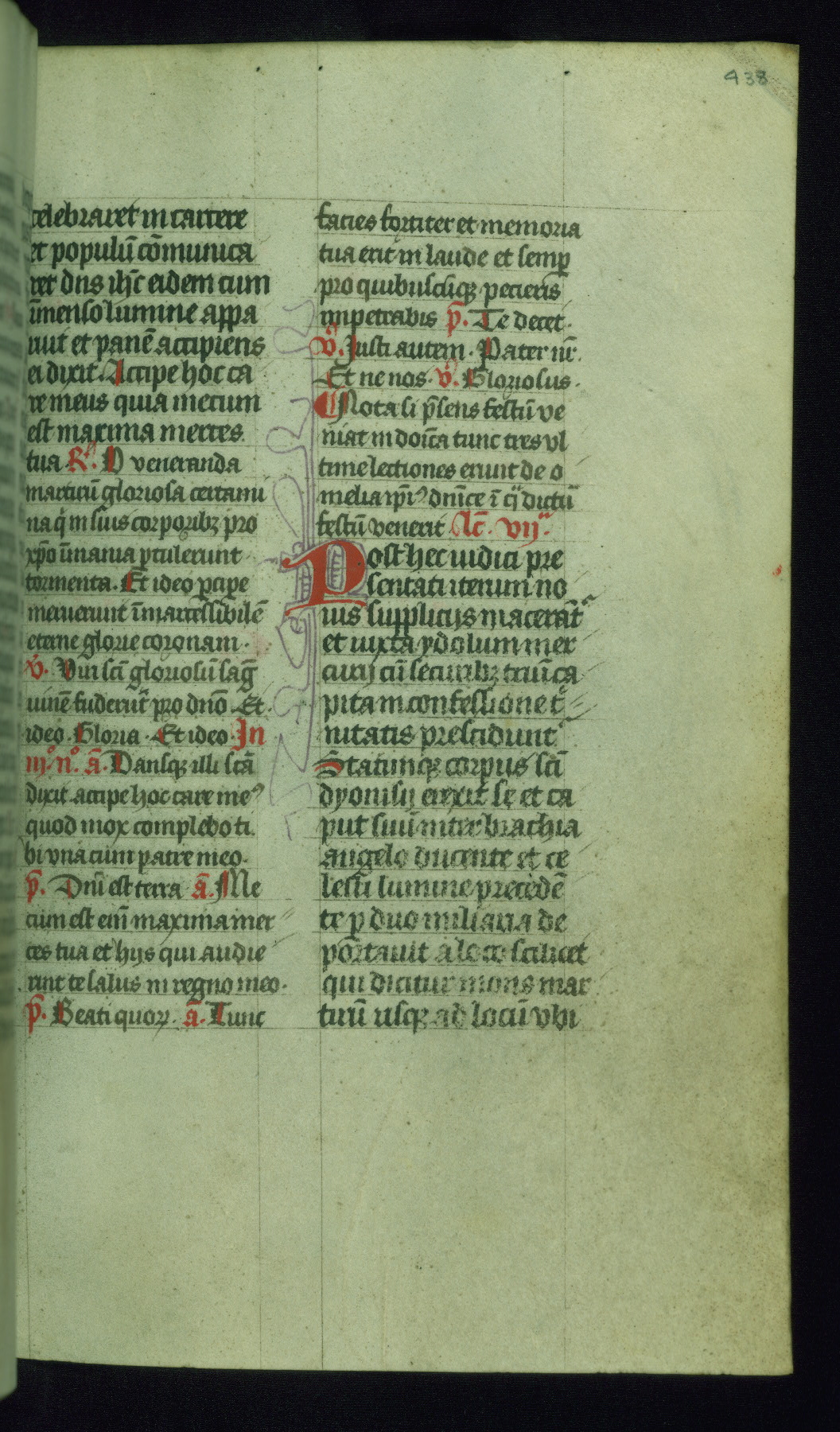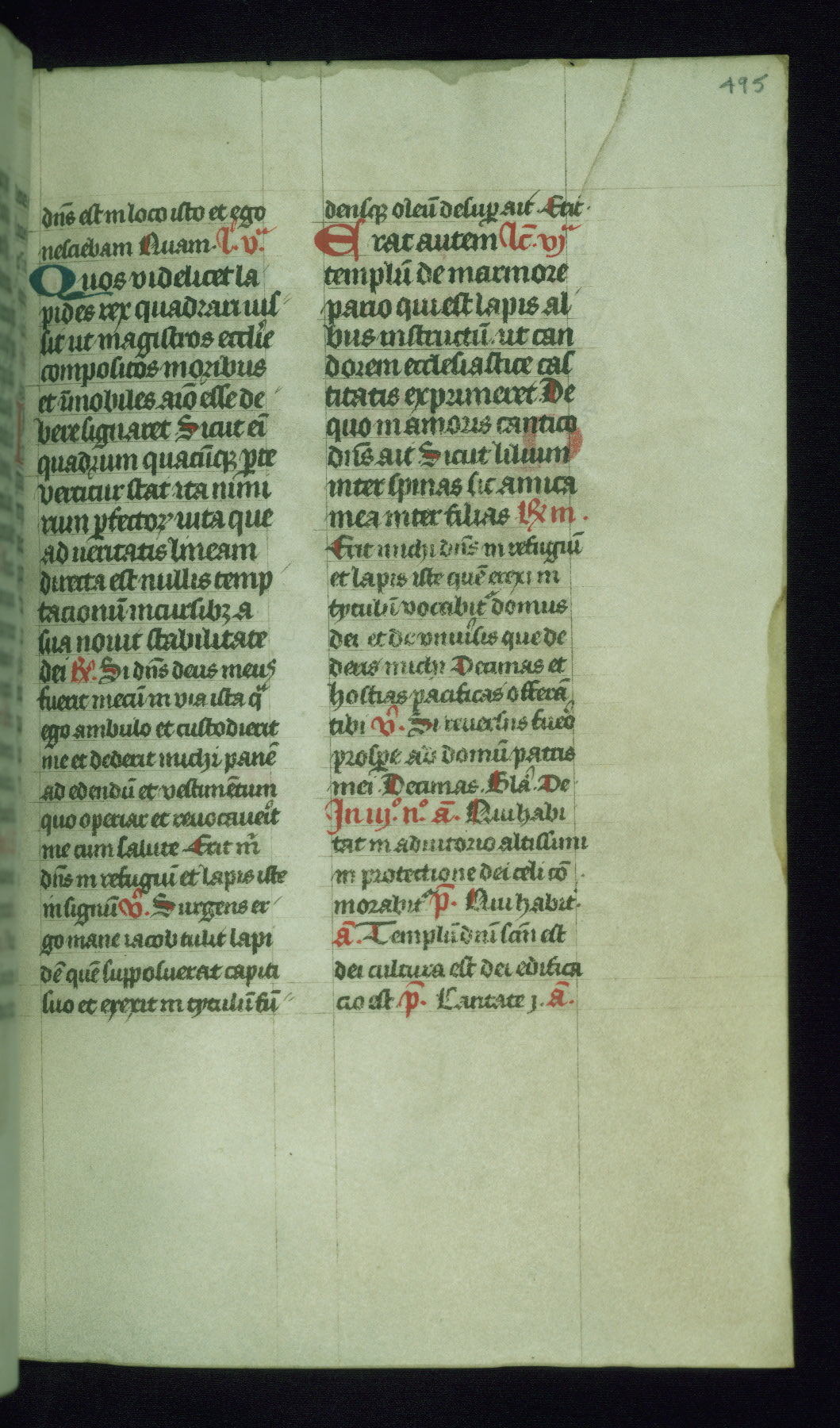 This small breviary, composed of more than 500 folios, is extraordinary for its length, considering it is the summer portion of a two-volume breviary for the use of Liège. The manuscript was completed for ecclesiastical use at the Cathedral of Notre-Dame and St.-Lambert in Liège ca. 1420. This attribution is suggested, for instance, by the petitions to the congregation of this cathedral (fols. 114v-117v), as well as the armorial shield of the family of Surlet de Chokier of Liège represented at the opening of the Psalms. The manuscript has modest, but interesting, decoration with historiated and decorated initials marking the liturgical texts, and occasional angels playing instruments in the margins. The most notable pictorial effect is found in the initials inhabited by transparent figures on rich blue ground. The technique is found, for instance, on fol. 156r with the gold monstrance held by translucent angels for the feast of the Corpus Christi.