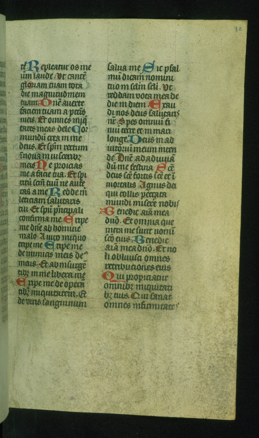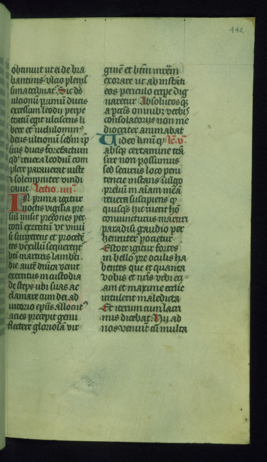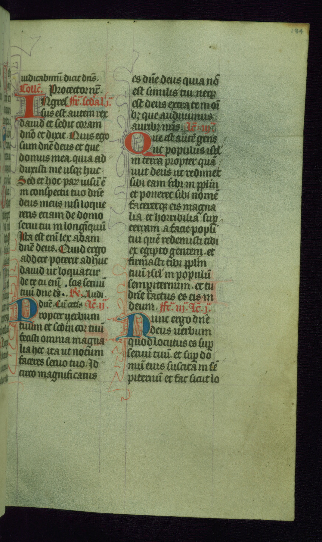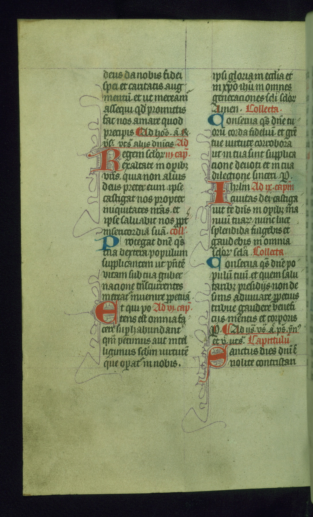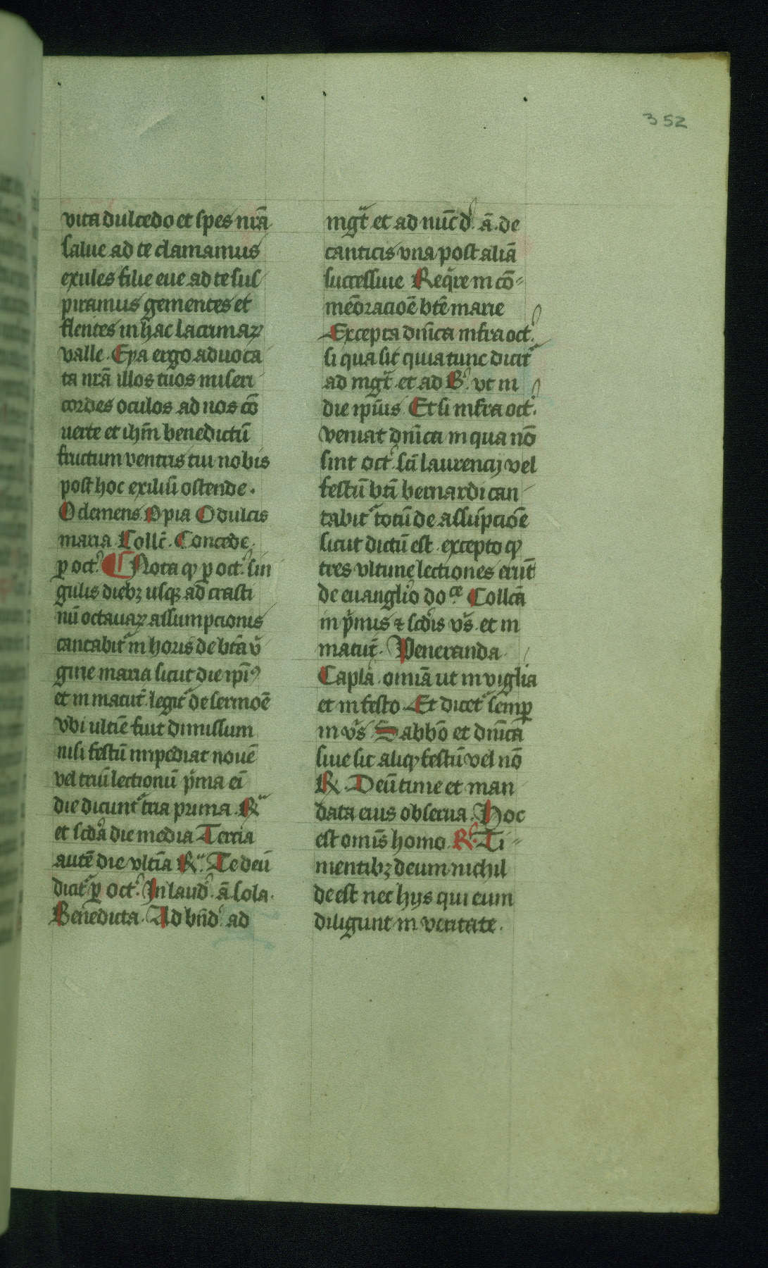 This small breviary, composed of more than 500 folios, is extraordinary for its length, considering it is the summer portion of a two-volume breviary for the use of Liège. The manuscript was completed for ecclesiastical use at the Cathedral of Notre-Dame and St.-Lambert in Liège ca. 1420. This attribution is suggested, for instance, by the petitions to the congregation of this cathedral (fols. 114v-117v), as well as the armorial shield of the family of Surlet de Chokier of Liège represented at the opening of the Psalms. The manuscript has modest, but interesting, decoration with historiated and decorated initials marking the liturgical texts, and occasional angels playing instruments in the margins. The most notable pictorial effect is found in the initials inhabited by transparent figures on rich blue ground. The technique is found, for instance, on fol. 156r with the gold monstrance held by translucent angels for the feast of the Corpus Christi.