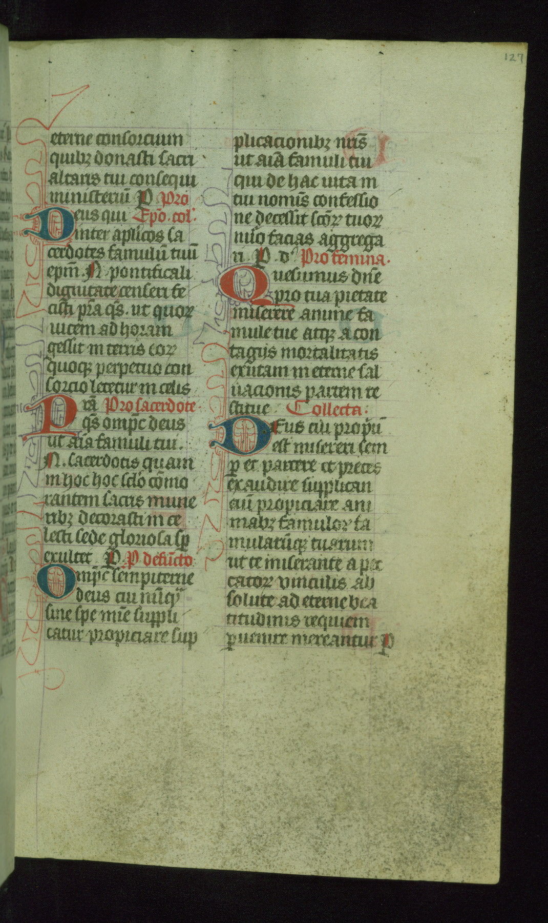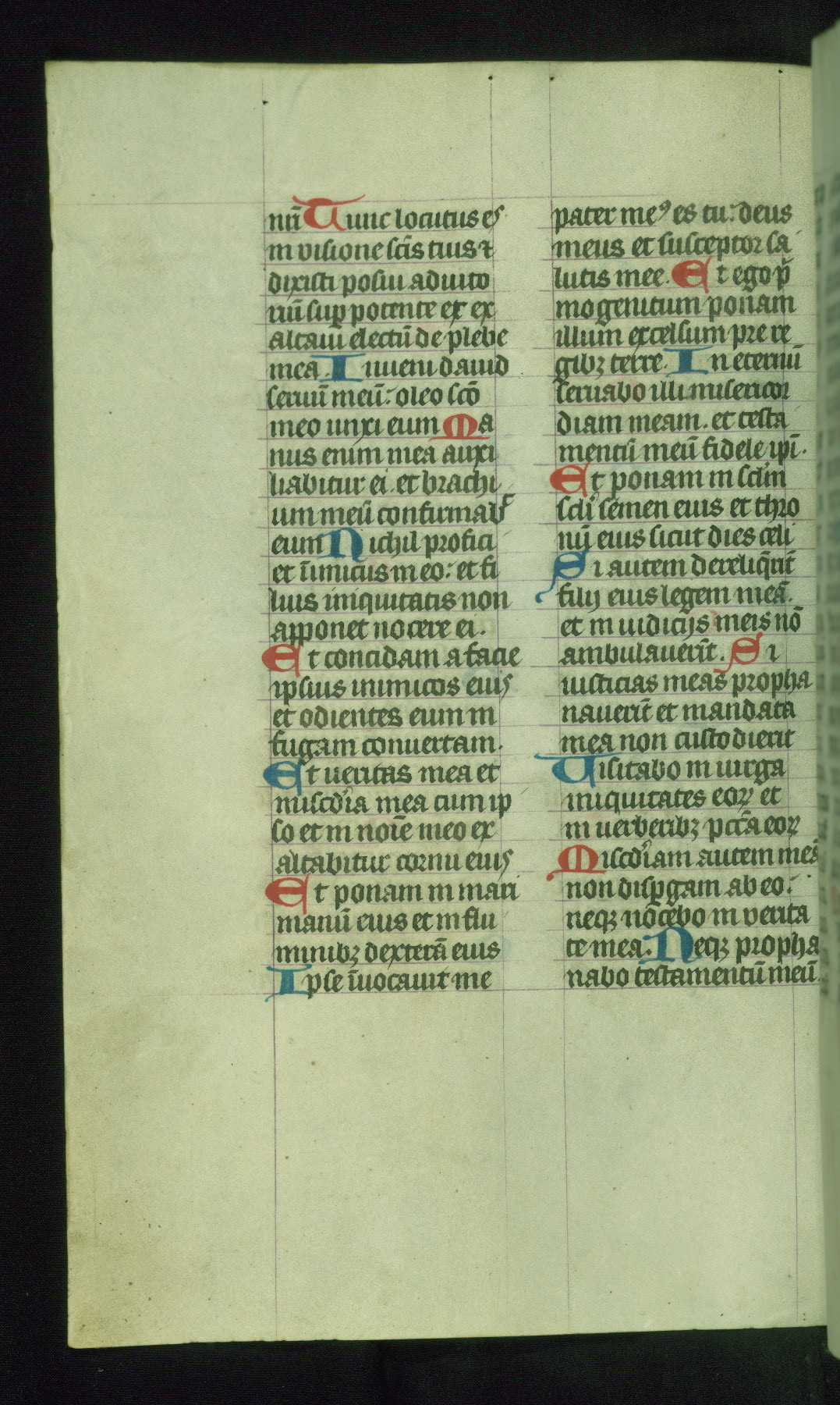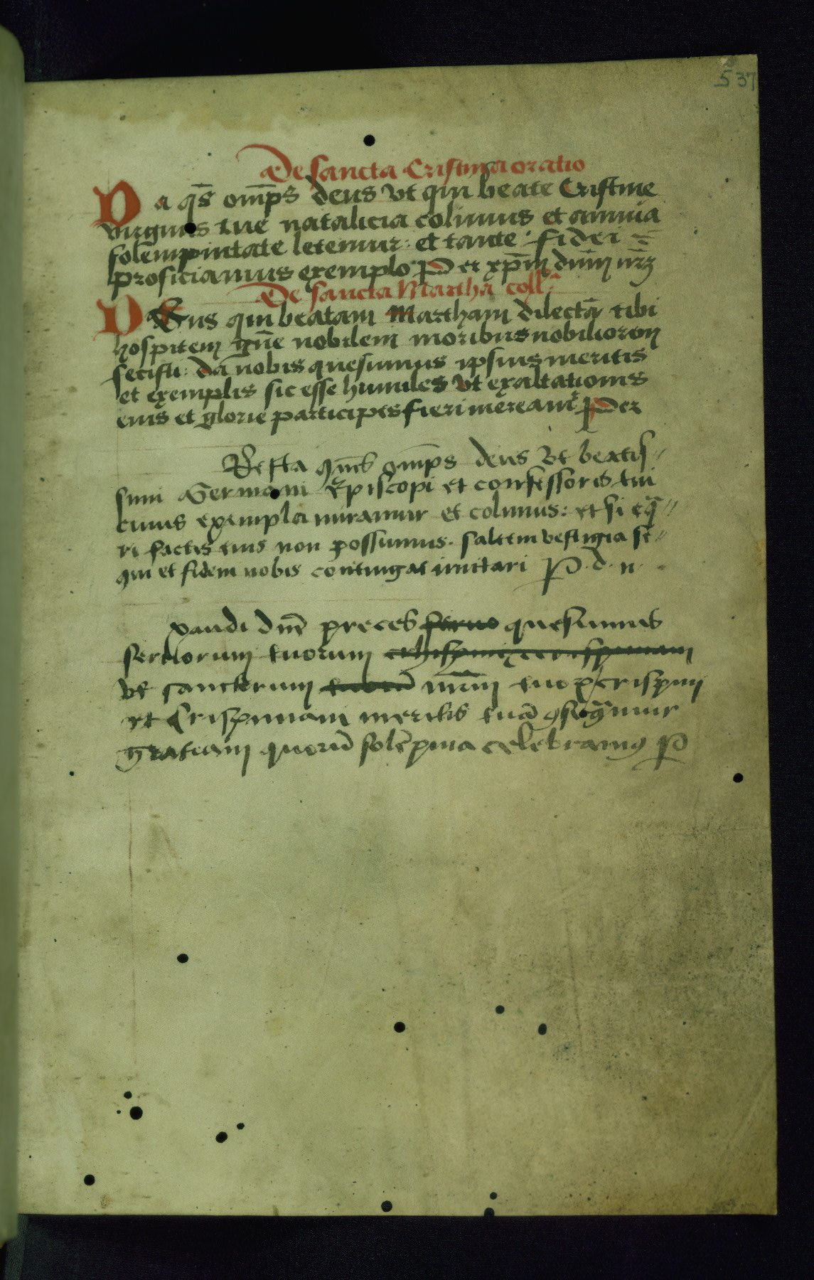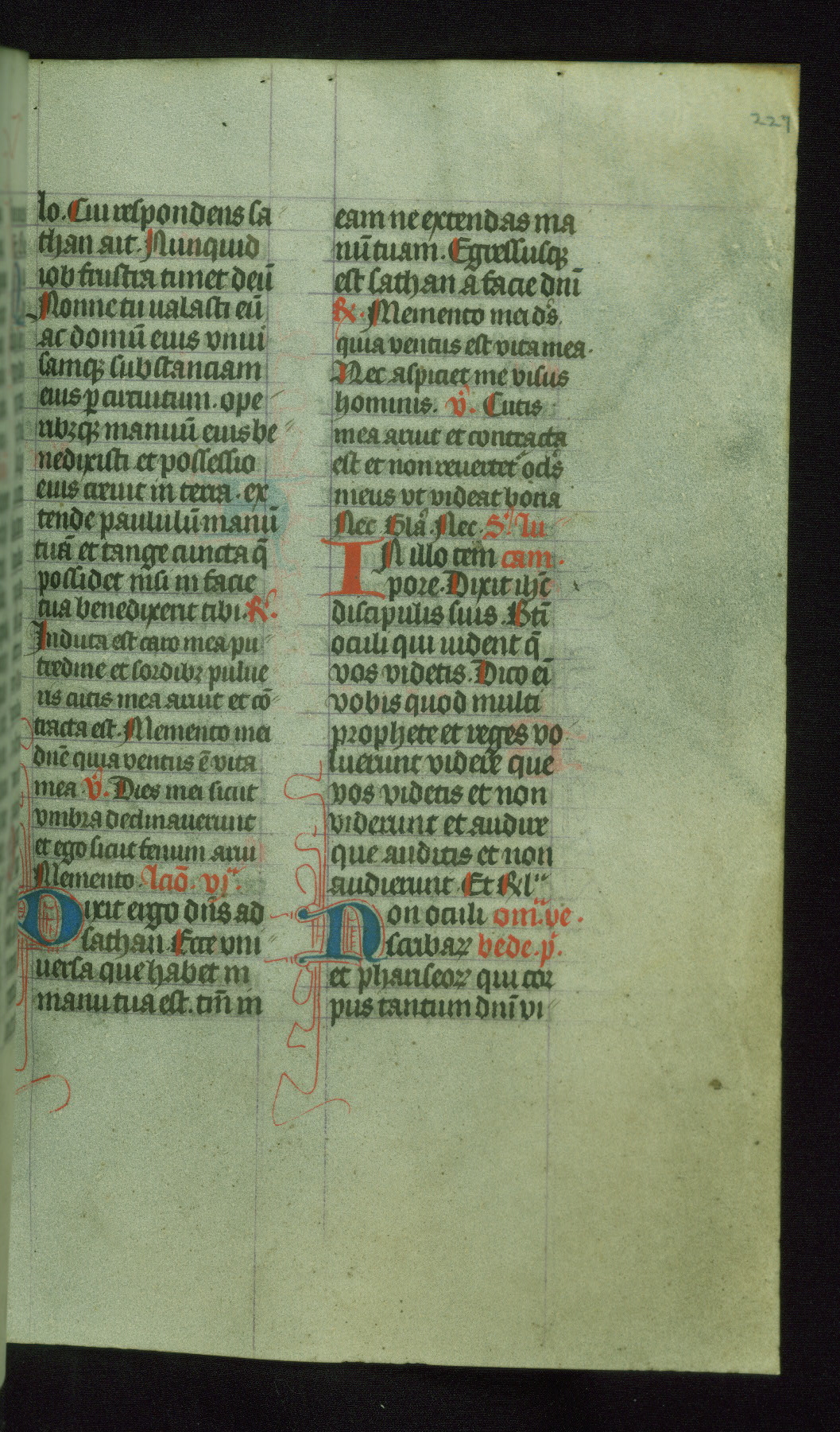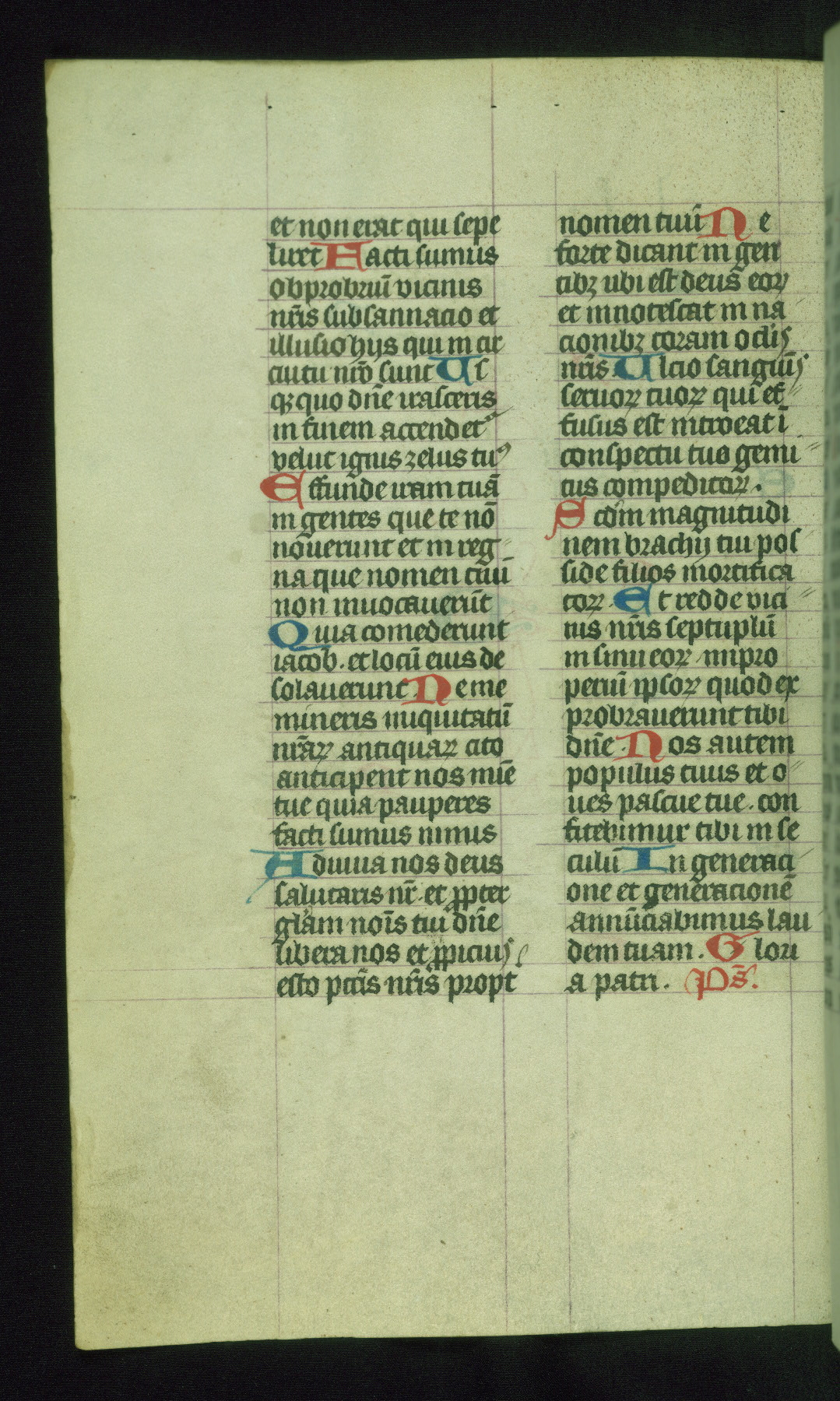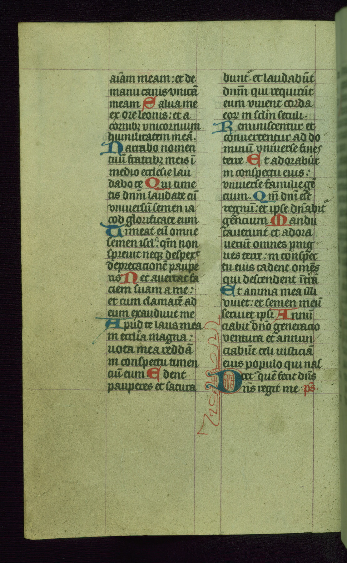 This small breviary, composed of more than 500 folios, is extraordinary for its length, considering it is the summer portion of a two-volume breviary for the use of Liège. The manuscript was completed for ecclesiastical use at the Cathedral of Notre-Dame and St.-Lambert in Liège ca. 1420. This attribution is suggested, for instance, by the petitions to the congregation of this cathedral (fols. 114v-117v), as well as the armorial shield of the family of Surlet de Chokier of Liège represented at the opening of the Psalms. The manuscript has modest, but interesting, decoration with historiated and decorated initials marking the liturgical texts, and occasional angels playing instruments in the margins. The most notable pictorial effect is found in the initials inhabited by transparent figures on rich blue ground. The technique is found, for instance, on fol. 156r with the gold monstrance held by translucent angels for the feast of the Corpus Christi.