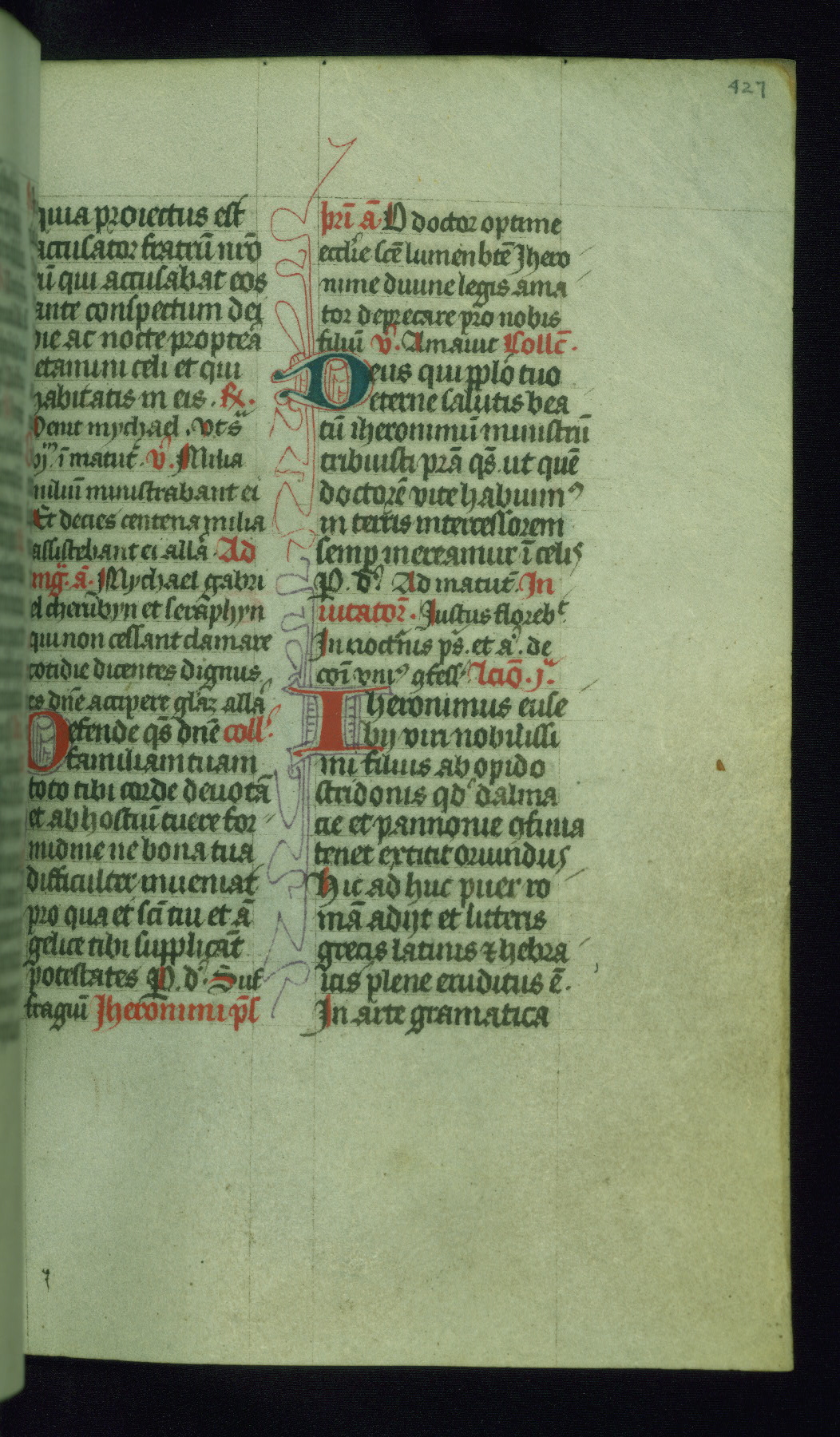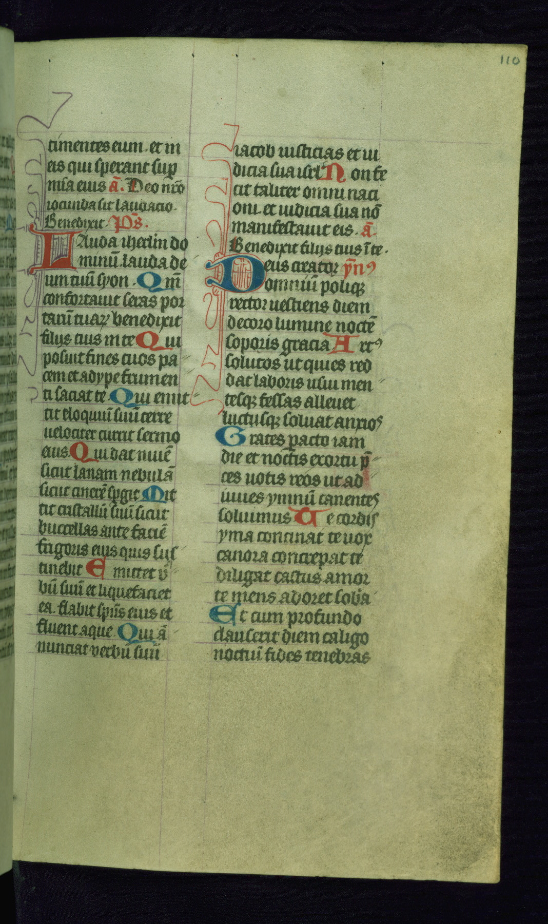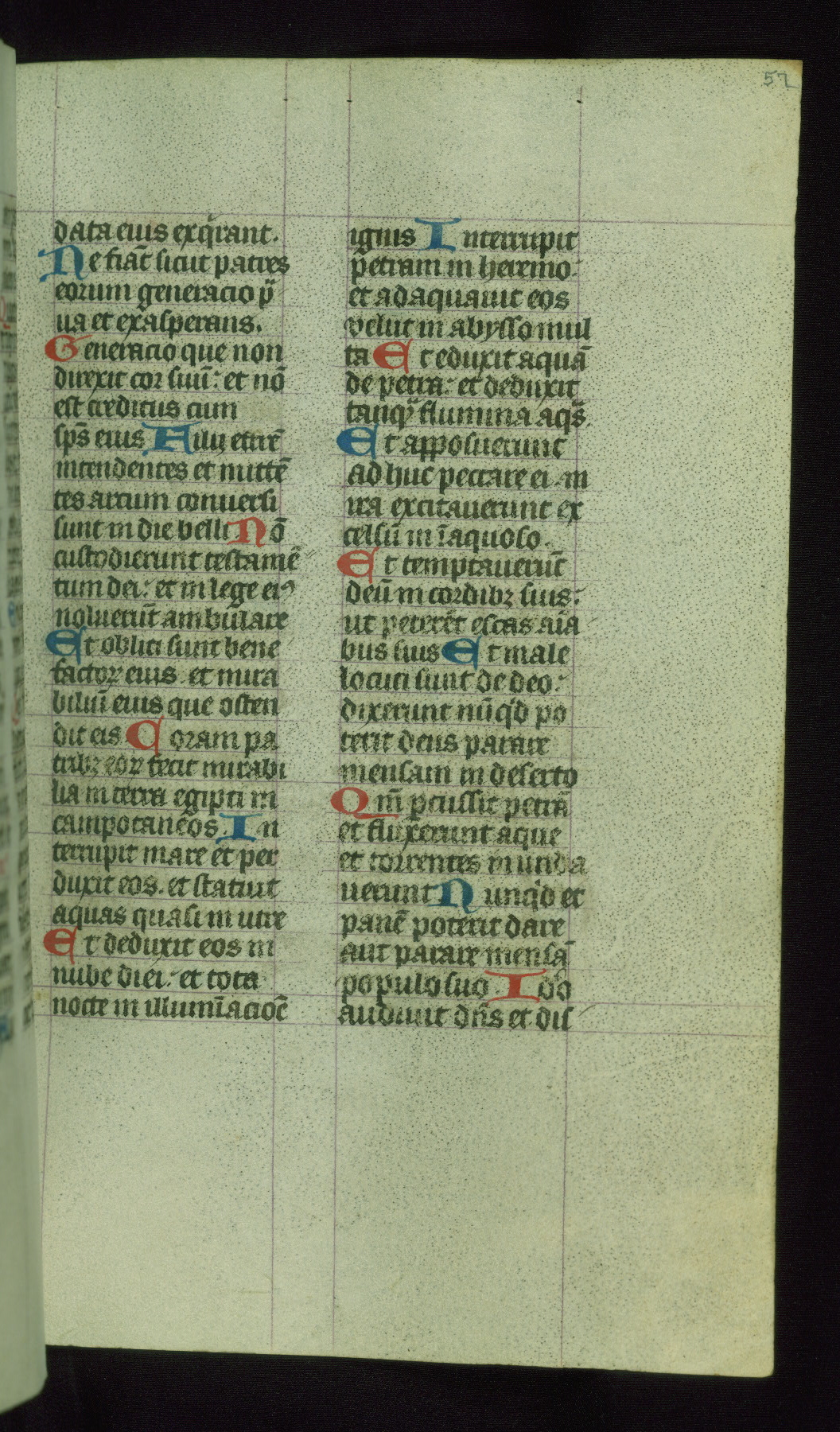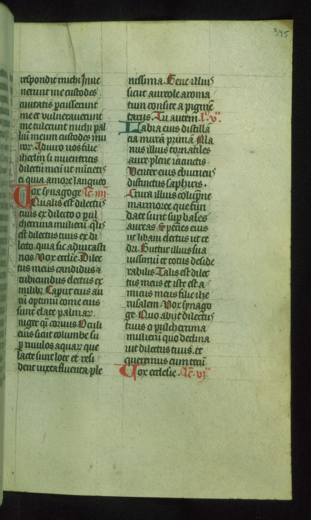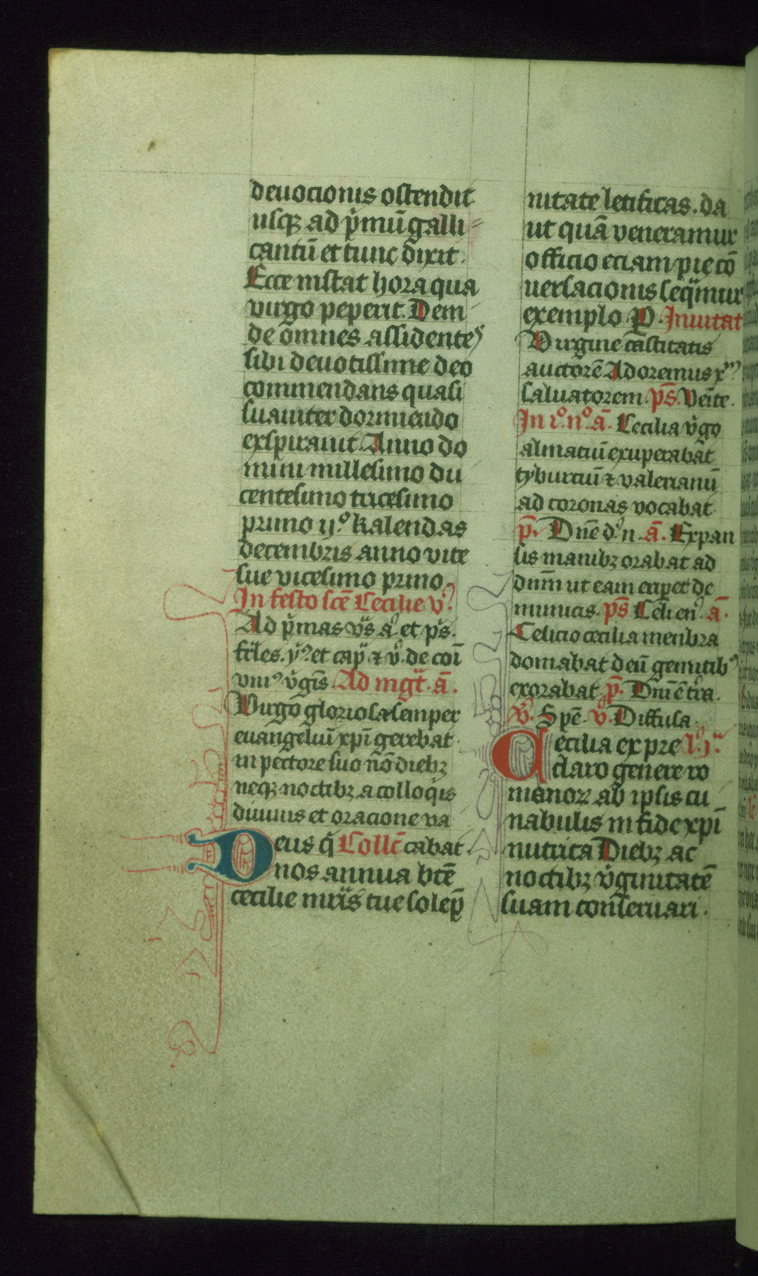 This small breviary, composed of more than 500 folios, is extraordinary for its length, considering it is the summer portion of a two-volume breviary for the use of Liège. The manuscript was completed for ecclesiastical use at the Cathedral of Notre-Dame and St.-Lambert in Liège ca. 1420. This attribution is suggested, for instance, by the petitions to the congregation of this cathedral (fols. 114v-117v), as well as the armorial shield of the family of Surlet de Chokier of Liège represented at the opening of the Psalms. The manuscript has modest, but interesting, decoration with historiated and decorated initials marking the liturgical texts, and occasional angels playing instruments in the margins. The most notable pictorial effect is found in the initials inhabited by transparent figures on rich blue ground. The technique is found, for instance, on fol. 156r with the gold monstrance held by translucent angels for the feast of the Corpus Christi.