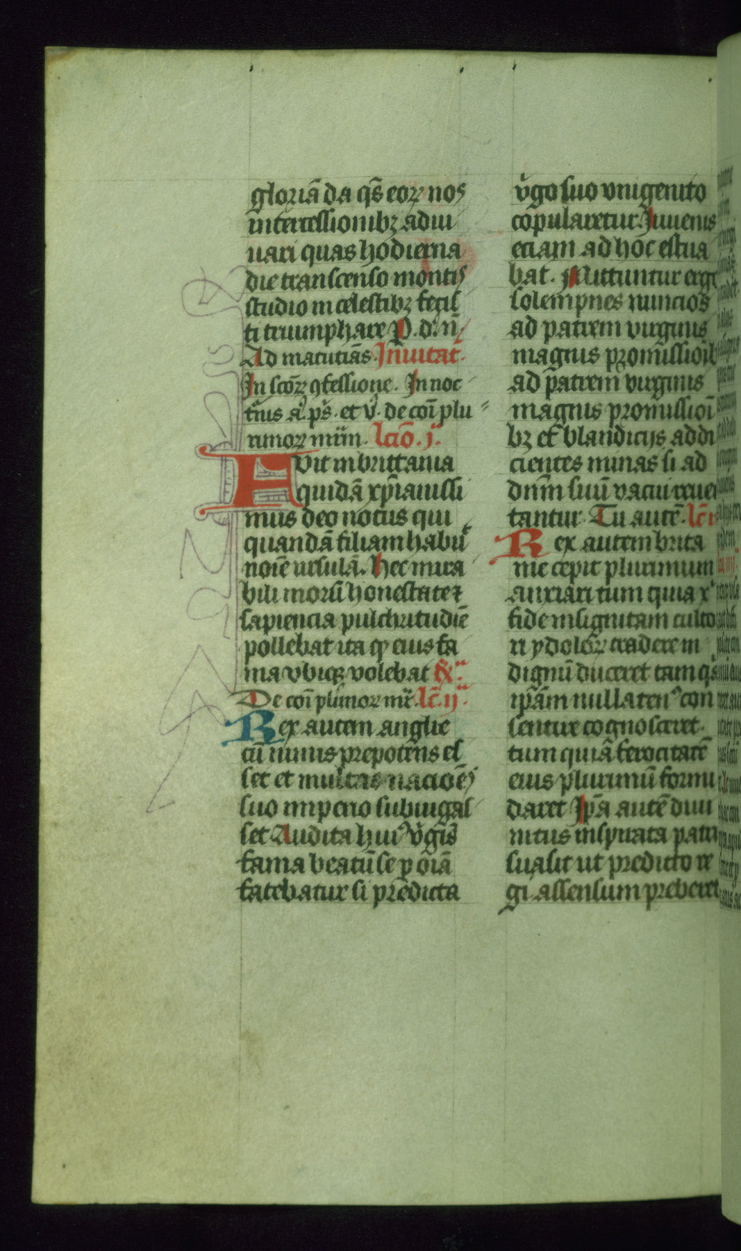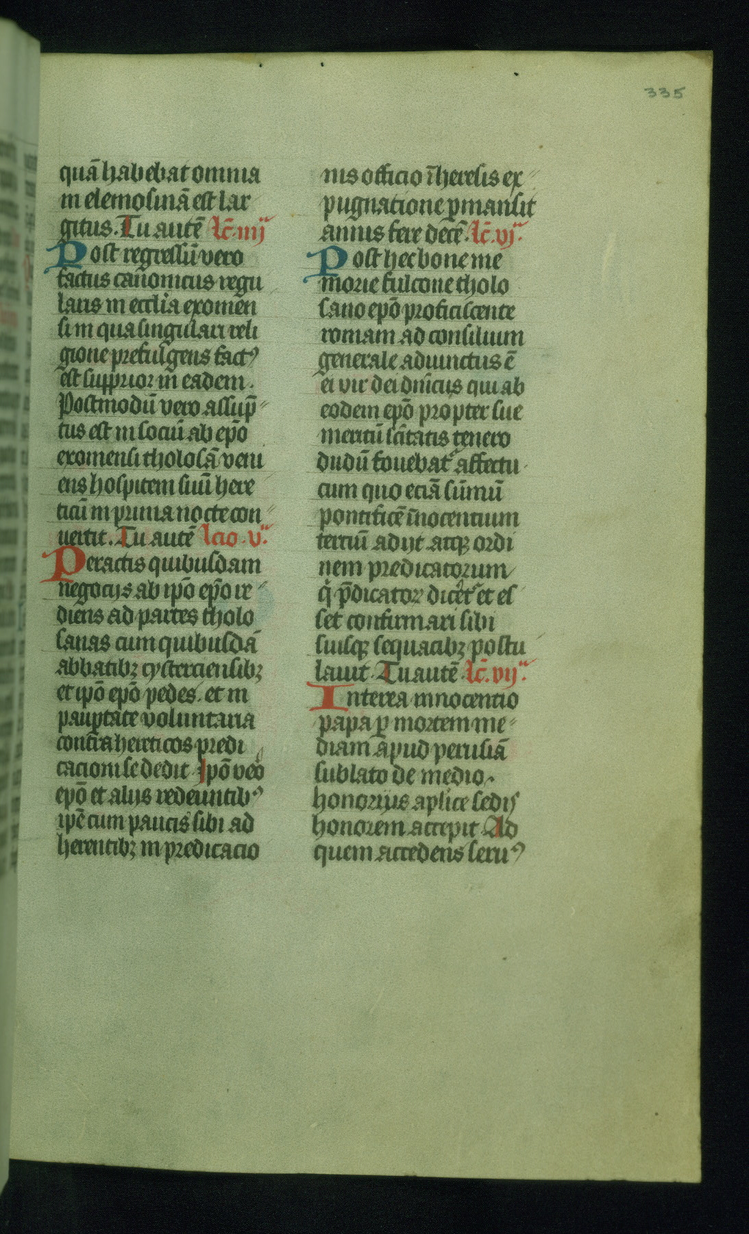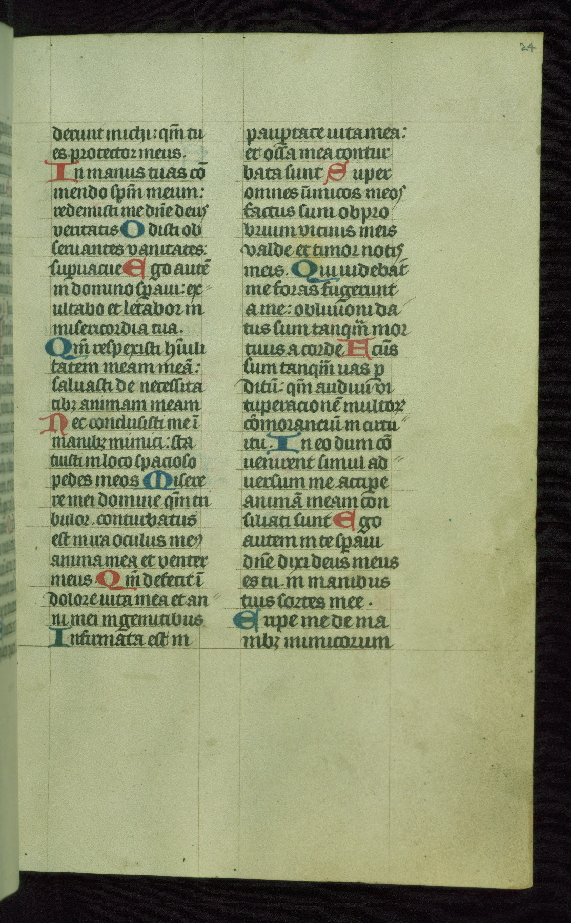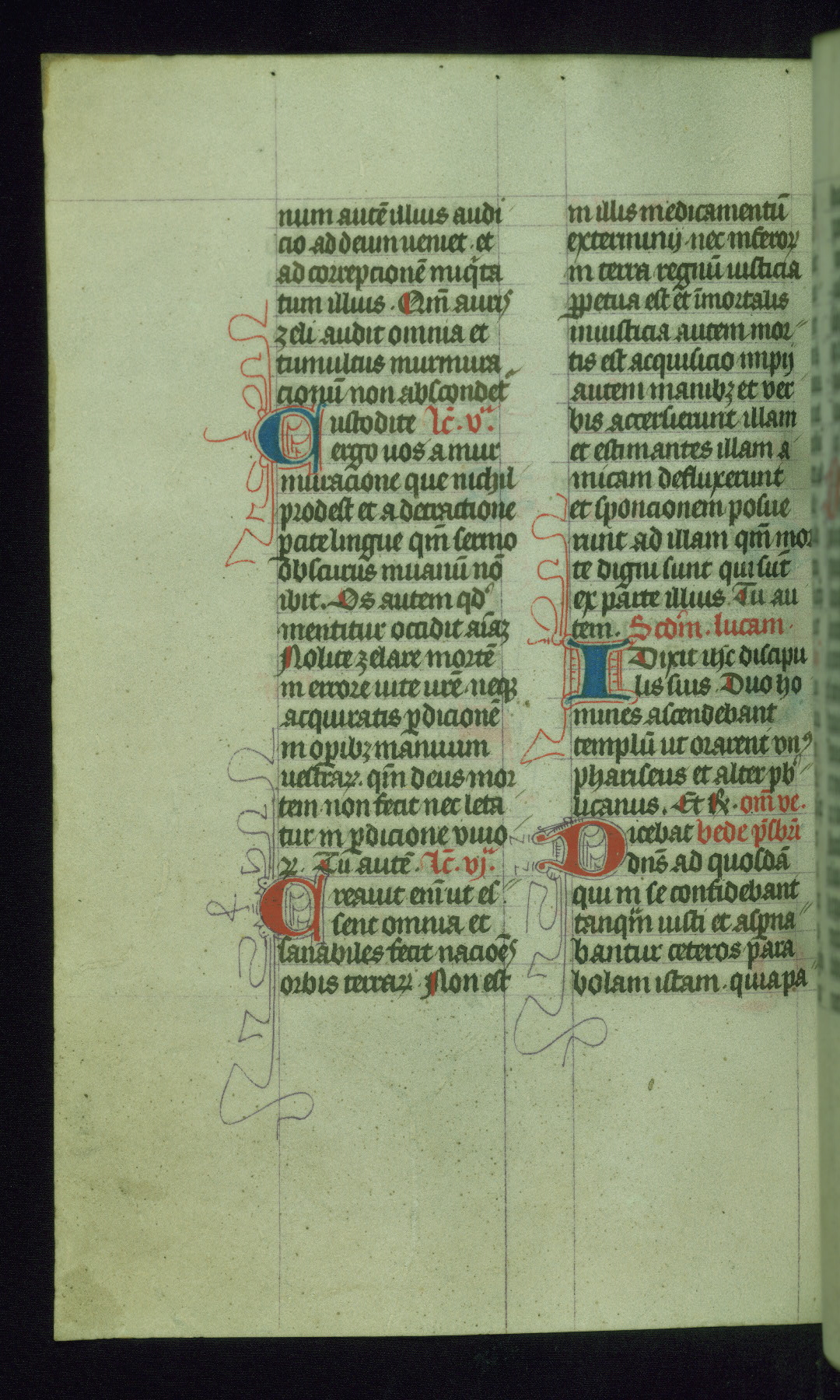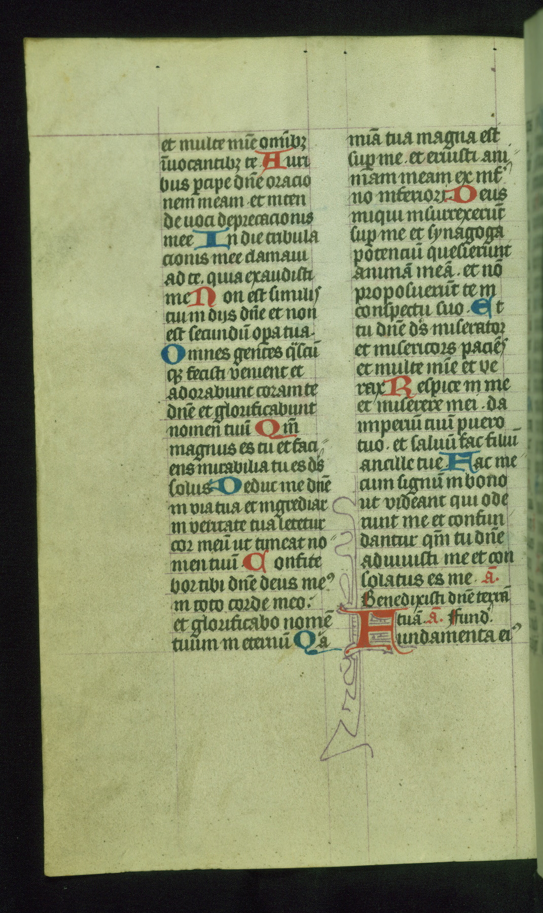 This small breviary, composed of more than 500 folios, is extraordinary for its length, considering it is the summer portion of a two-volume breviary for the use of Liège. The manuscript was completed for ecclesiastical use at the Cathedral of Notre-Dame and St.-Lambert in Liège ca. 1420. This attribution is suggested, for instance, by the petitions to the congregation of this cathedral (fols. 114v-117v), as well as the armorial shield of the family of Surlet de Chokier of Liège represented at the opening of the Psalms. The manuscript has modest, but interesting, decoration with historiated and decorated initials marking the liturgical texts, and occasional angels playing instruments in the margins. The most notable pictorial effect is found in the initials inhabited by transparent figures on rich blue ground. The technique is found, for instance, on fol. 156r with the gold monstrance held by translucent angels for the feast of the Corpus Christi.