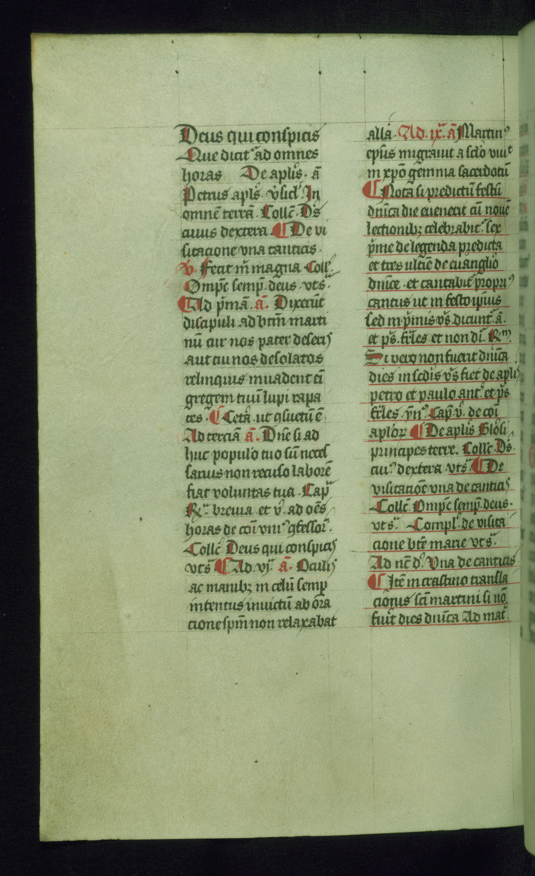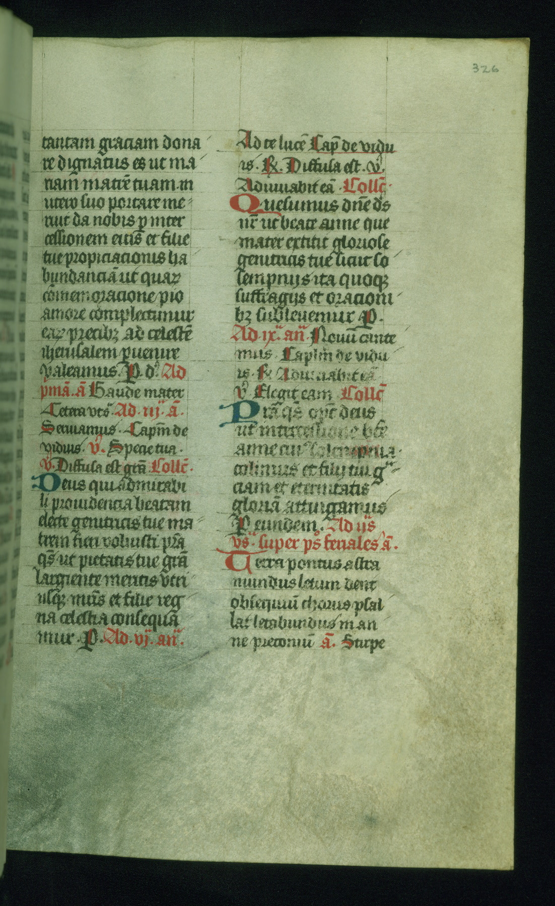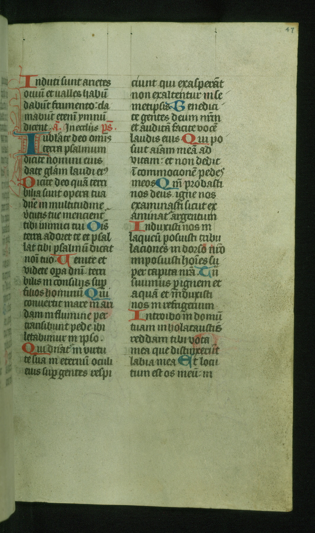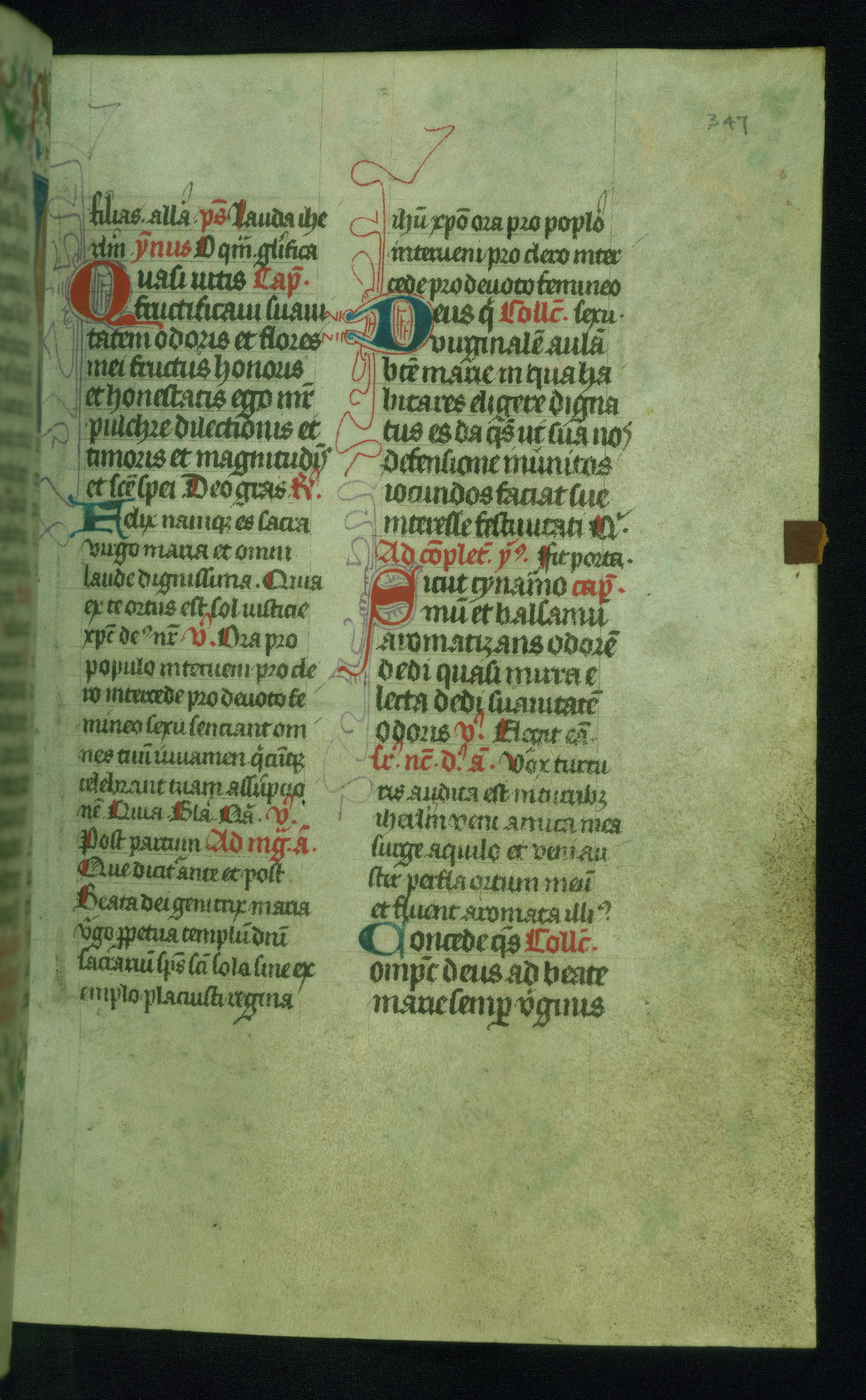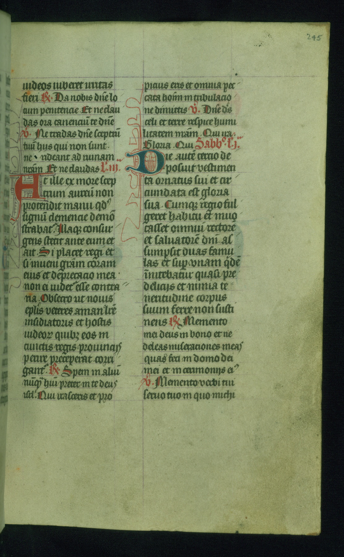 This small breviary, composed of more than 500 folios, is extraordinary for its length, considering it is the summer portion of a two-volume breviary for the use of Liège. The manuscript was completed for ecclesiastical use at the Cathedral of Notre-Dame and St.-Lambert in Liège ca. 1420. This attribution is suggested, for instance, by the petitions to the congregation of this cathedral (fols. 114v-117v), as well as the armorial shield of the family of Surlet de Chokier of Liège represented at the opening of the Psalms. The manuscript has modest, but interesting, decoration with historiated and decorated initials marking the liturgical texts, and occasional angels playing instruments in the margins. The most notable pictorial effect is found in the initials inhabited by transparent figures on rich blue ground. The technique is found, for instance, on fol. 156r with the gold monstrance held by translucent angels for the feast of the Corpus Christi.