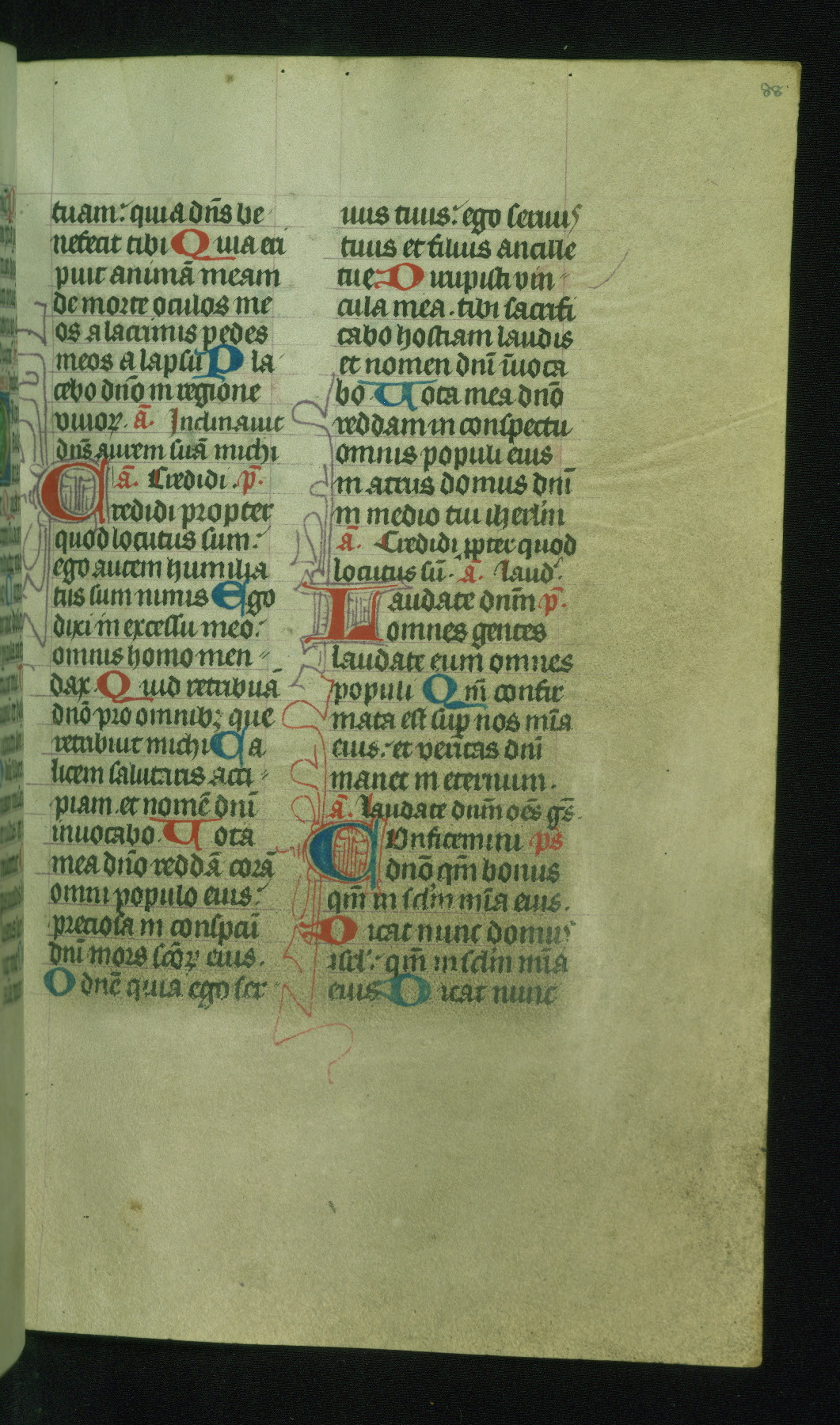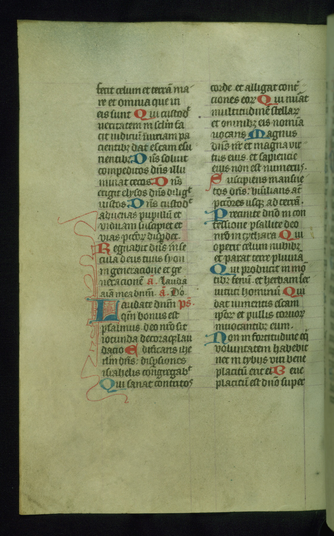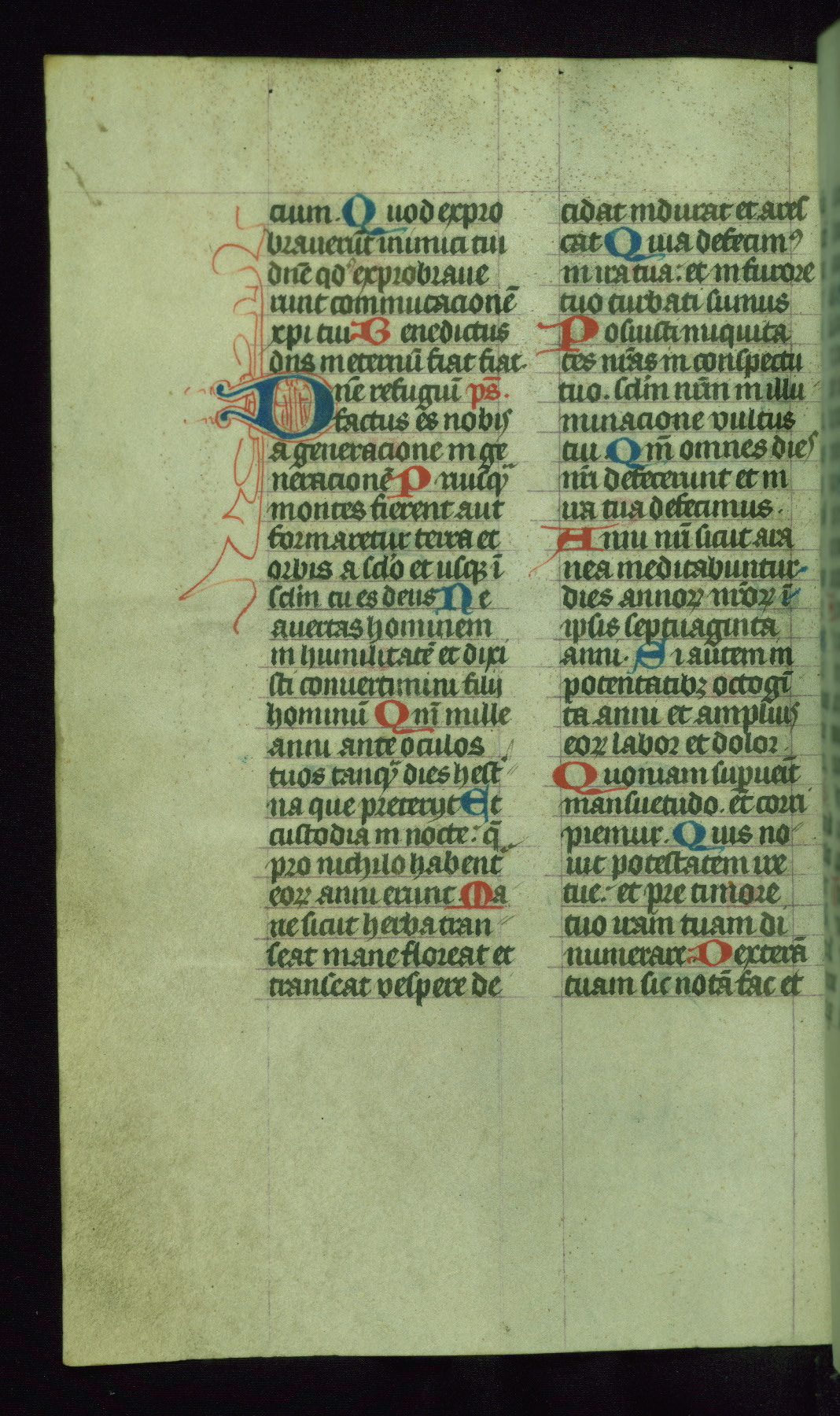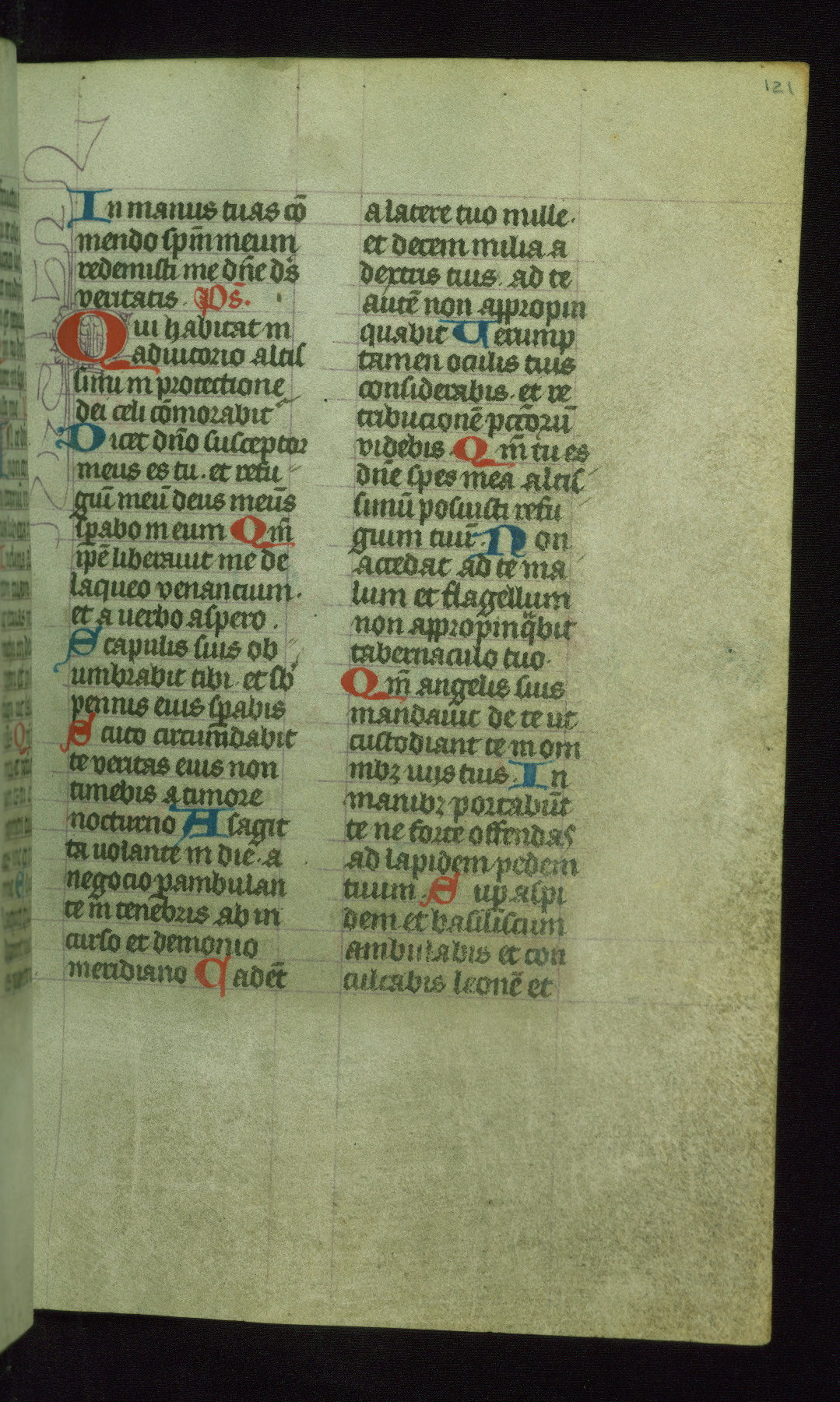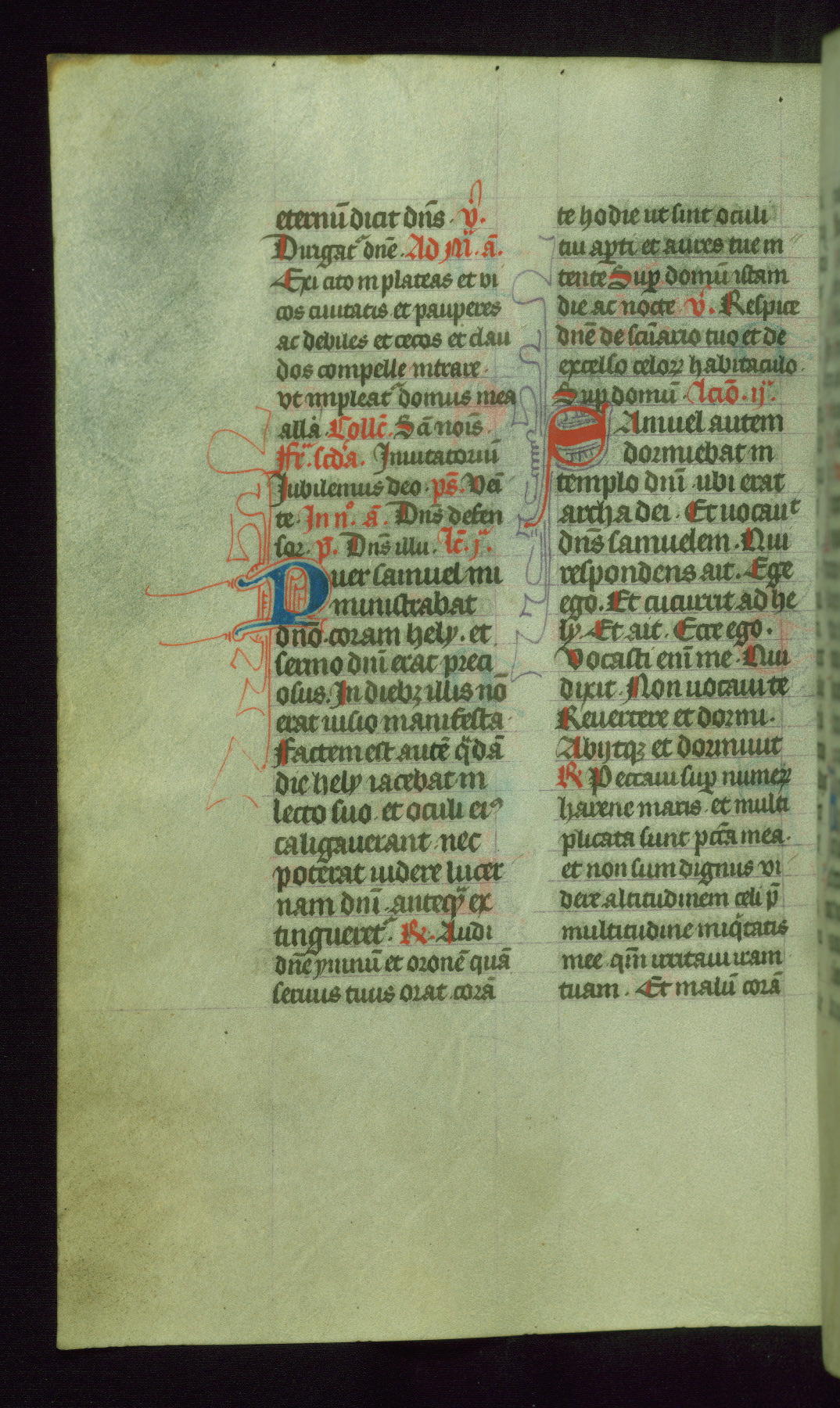 This small breviary, composed of more than 500 folios, is extraordinary for its length, considering it is the summer portion of a two-volume breviary for the use of Liège. The manuscript was completed for ecclesiastical use at the Cathedral of Notre-Dame and St.-Lambert in Liège ca. 1420. This attribution is suggested, for instance, by the petitions to the congregation of this cathedral (fols. 114v-117v), as well as the armorial shield of the family of Surlet de Chokier of Liège represented at the opening of the Psalms. The manuscript has modest, but interesting, decoration with historiated and decorated initials marking the liturgical texts, and occasional angels playing instruments in the margins. The most notable pictorial effect is found in the initials inhabited by transparent figures on rich blue ground. The technique is found, for instance, on fol. 156r with the gold monstrance held by translucent angels for the feast of the Corpus Christi.