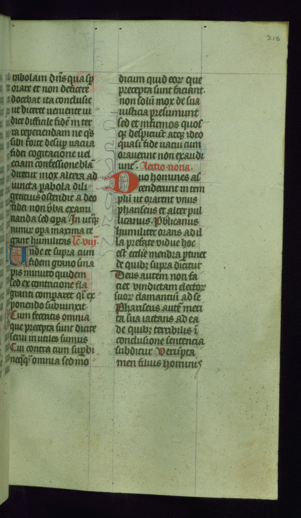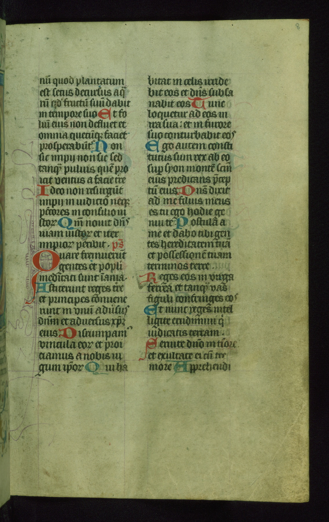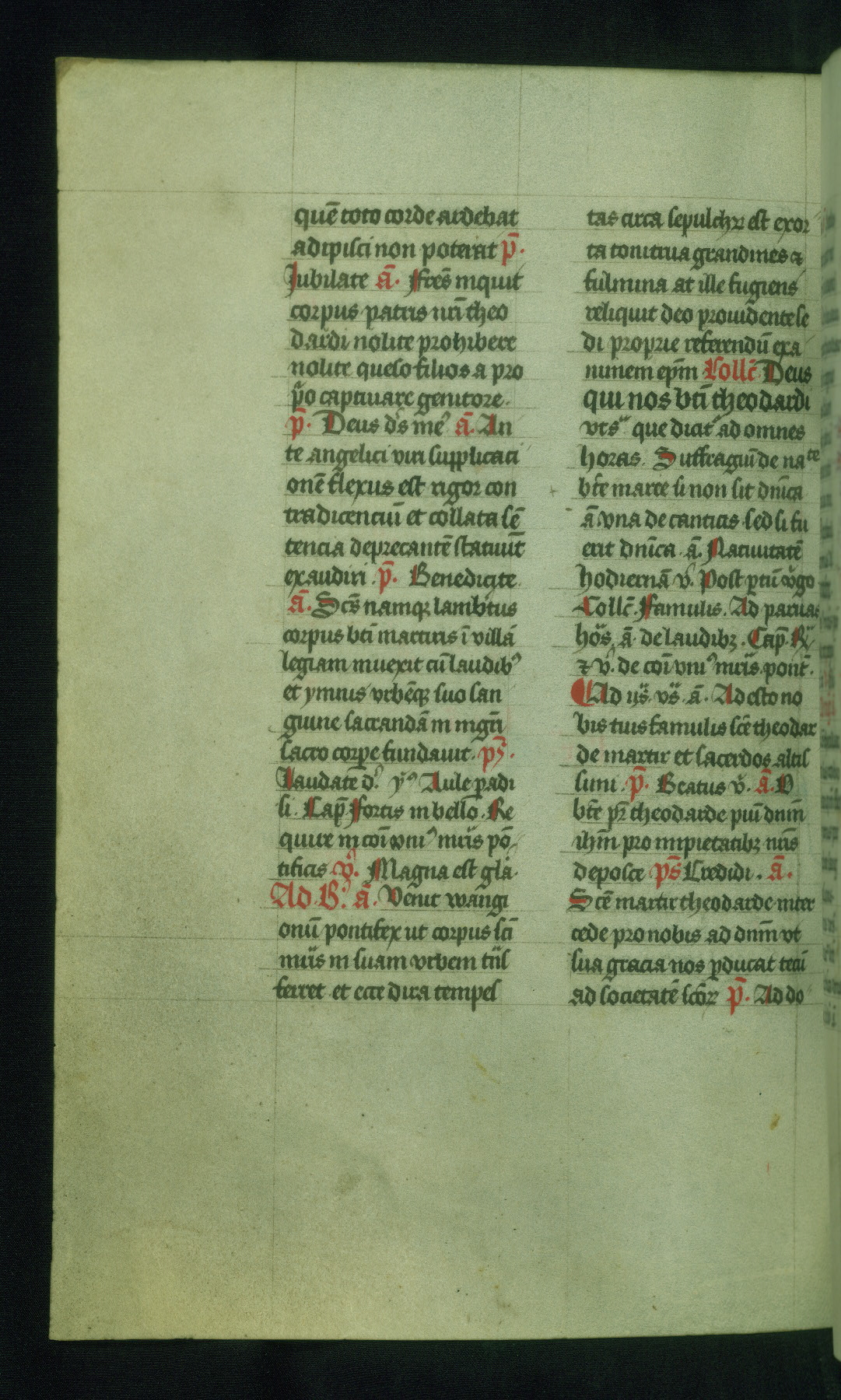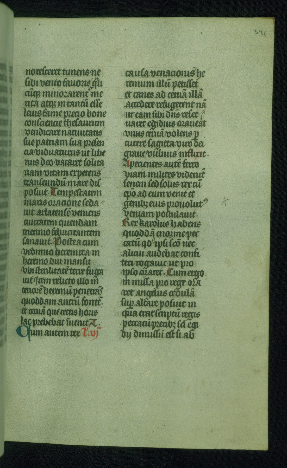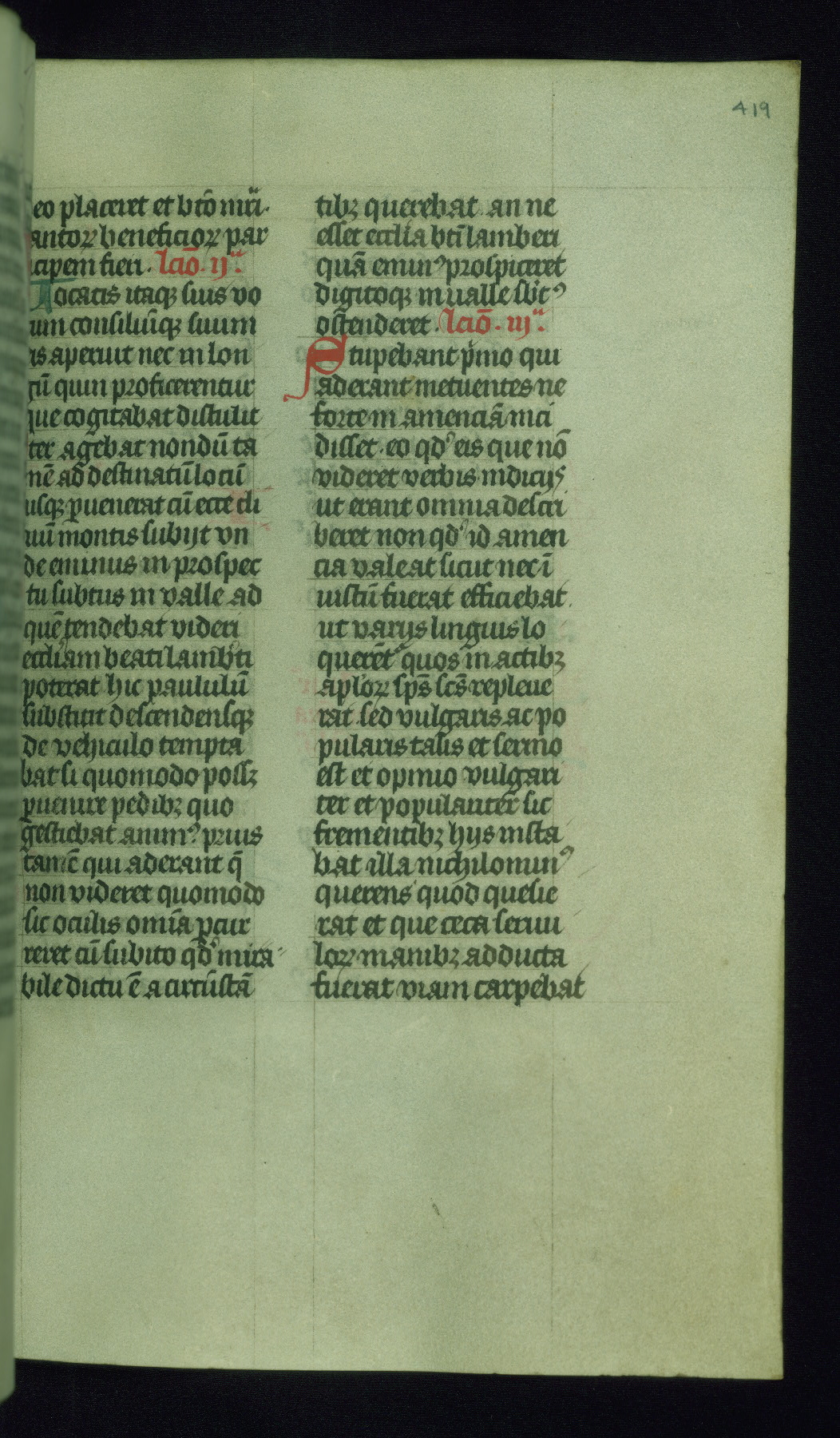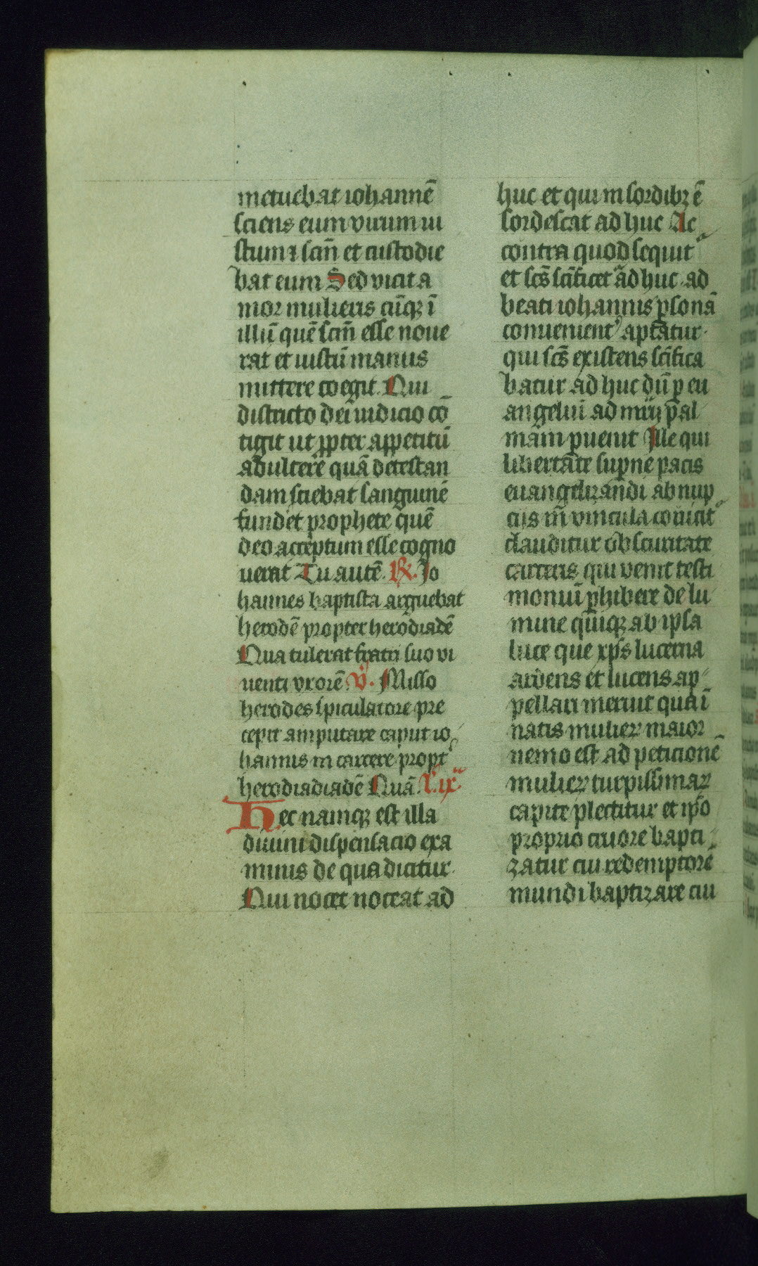 This small breviary, composed of more than 500 folios, is extraordinary for its length, considering it is the summer portion of a two-volume breviary for the use of Liège. The manuscript was completed for ecclesiastical use at the Cathedral of Notre-Dame and St.-Lambert in Liège ca. 1420. This attribution is suggested, for instance, by the petitions to the congregation of this cathedral (fols. 114v-117v), as well as the armorial shield of the family of Surlet de Chokier of Liège represented at the opening of the Psalms. The manuscript has modest, but interesting, decoration with historiated and decorated initials marking the liturgical texts, and occasional angels playing instruments in the margins. The most notable pictorial effect is found in the initials inhabited by transparent figures on rich blue ground. The technique is found, for instance, on fol. 156r with the gold monstrance held by translucent angels for the feast of the Corpus Christi.