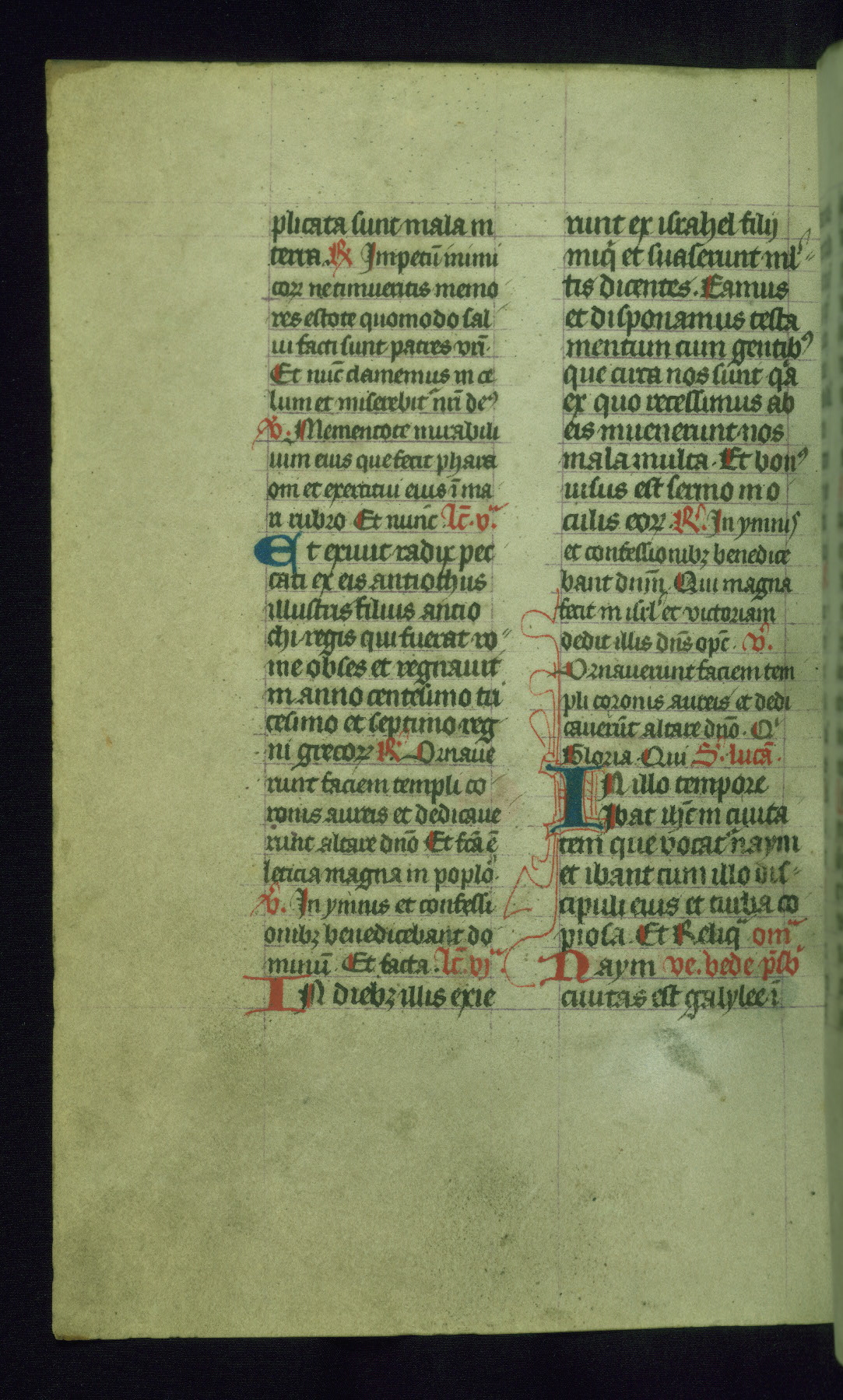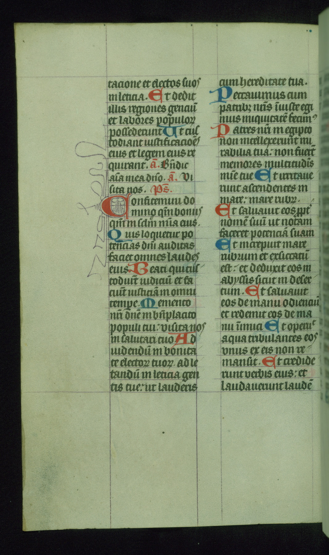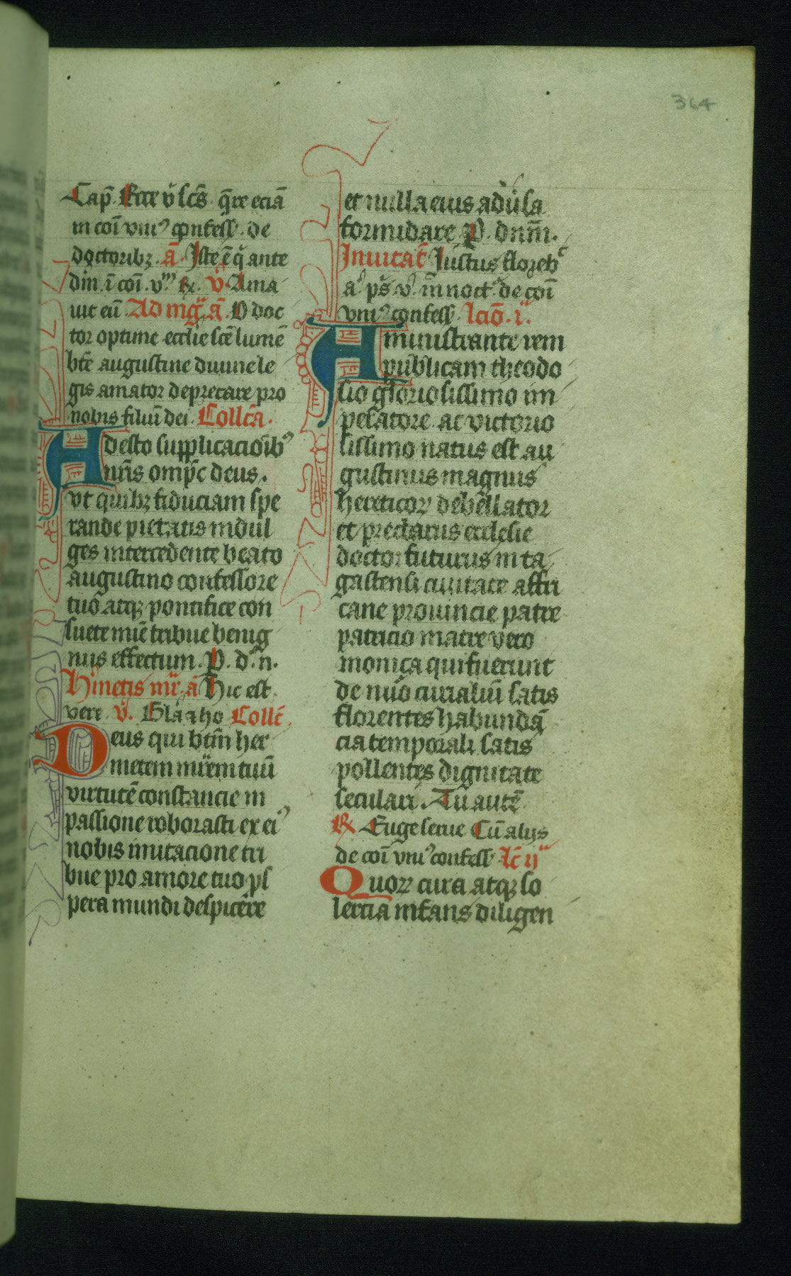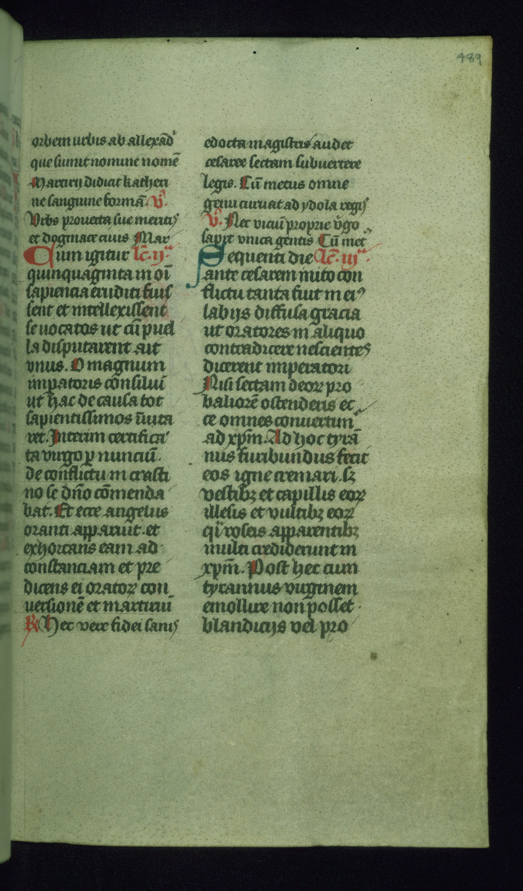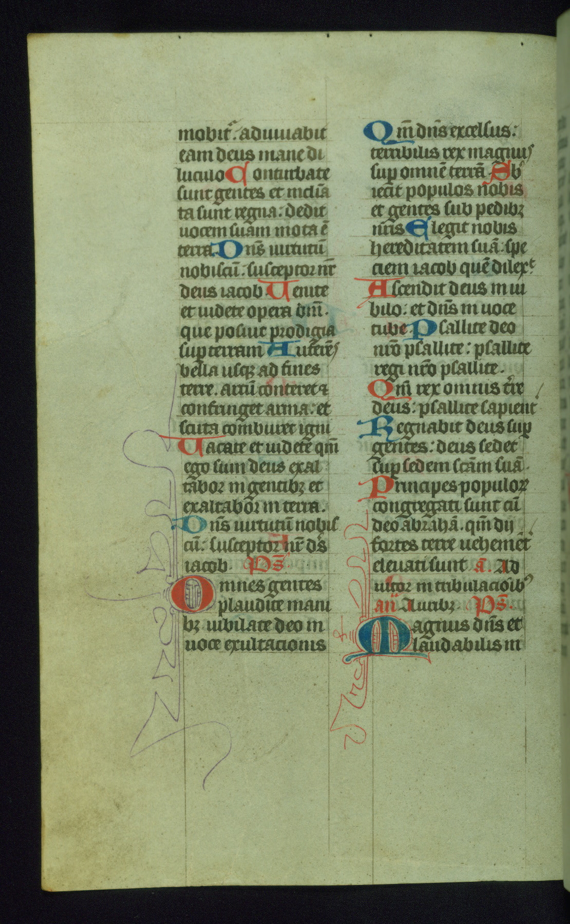 This small breviary, composed of more than 500 folios, is extraordinary for its length, considering it is the summer portion of a two-volume breviary for the use of Liège. The manuscript was completed for ecclesiastical use at the Cathedral of Notre-Dame and St.-Lambert in Liège ca. 1420. This attribution is suggested, for instance, by the petitions to the congregation of this cathedral (fols. 114v-117v), as well as the armorial shield of the family of Surlet de Chokier of Liège represented at the opening of the Psalms. The manuscript has modest, but interesting, decoration with historiated and decorated initials marking the liturgical texts, and occasional angels playing instruments in the margins. The most notable pictorial effect is found in the initials inhabited by transparent figures on rich blue ground. The technique is found, for instance, on fol. 156r with the gold monstrance held by translucent angels for the feast of the Corpus Christi.