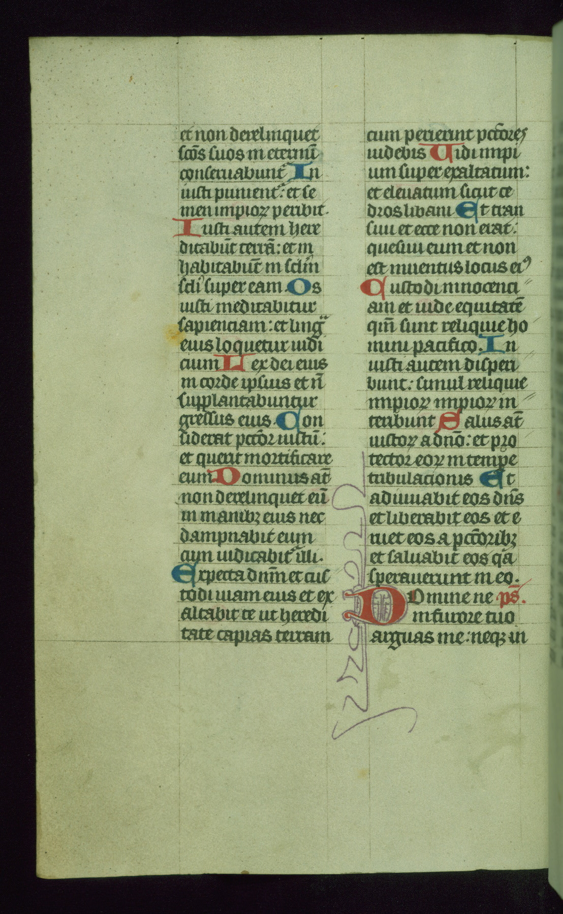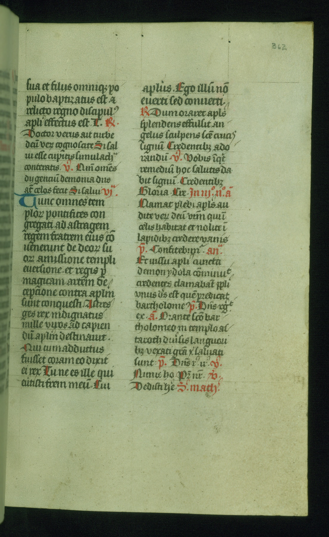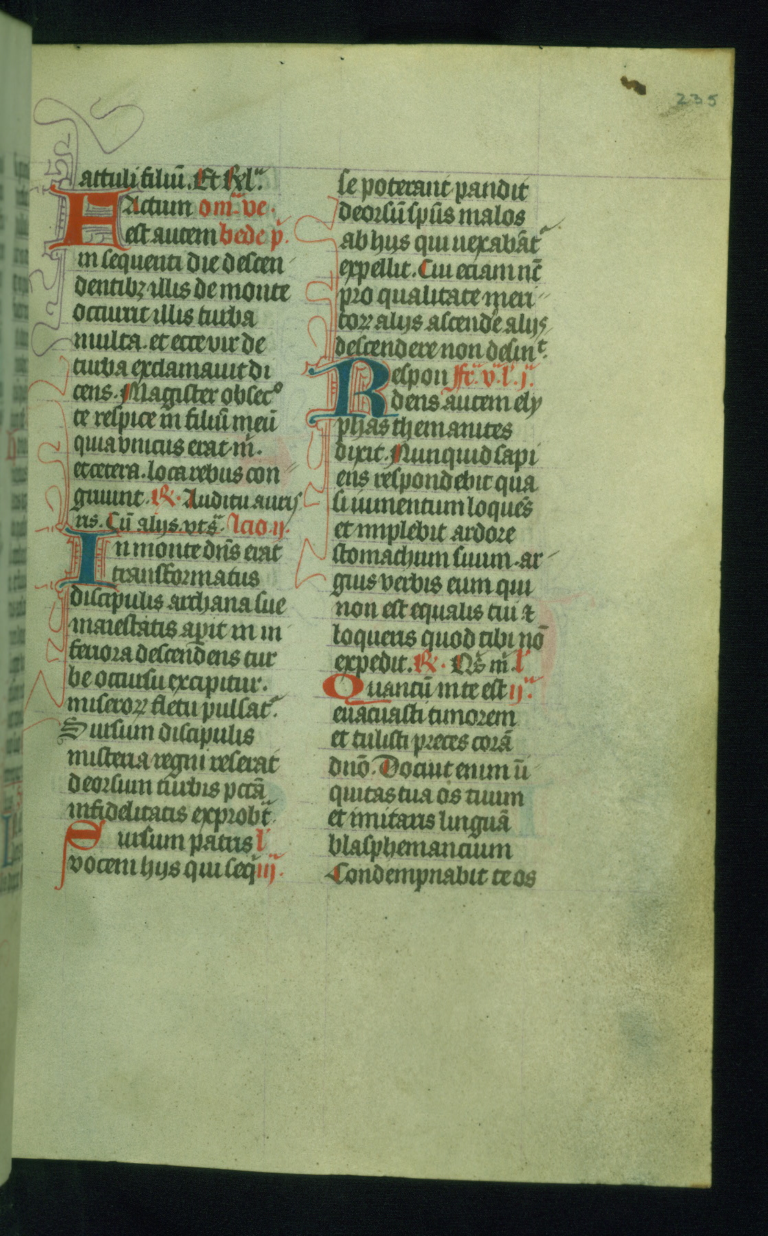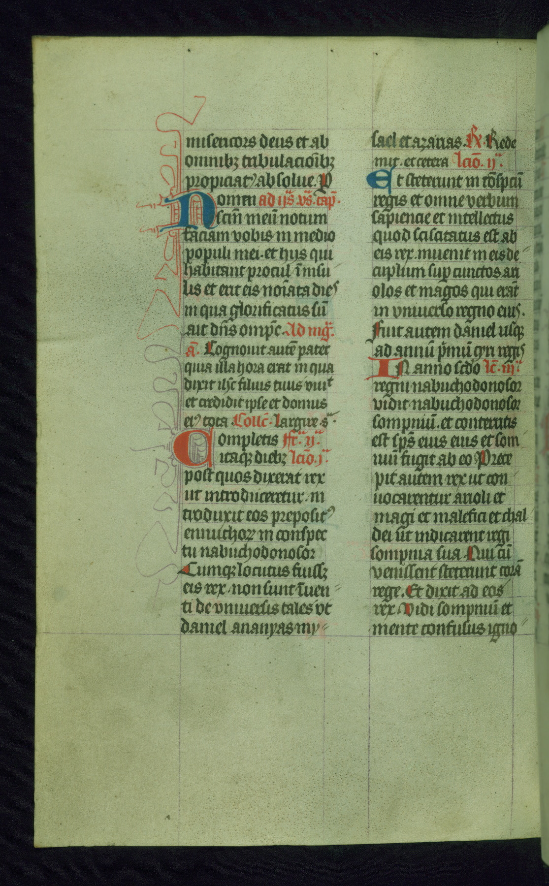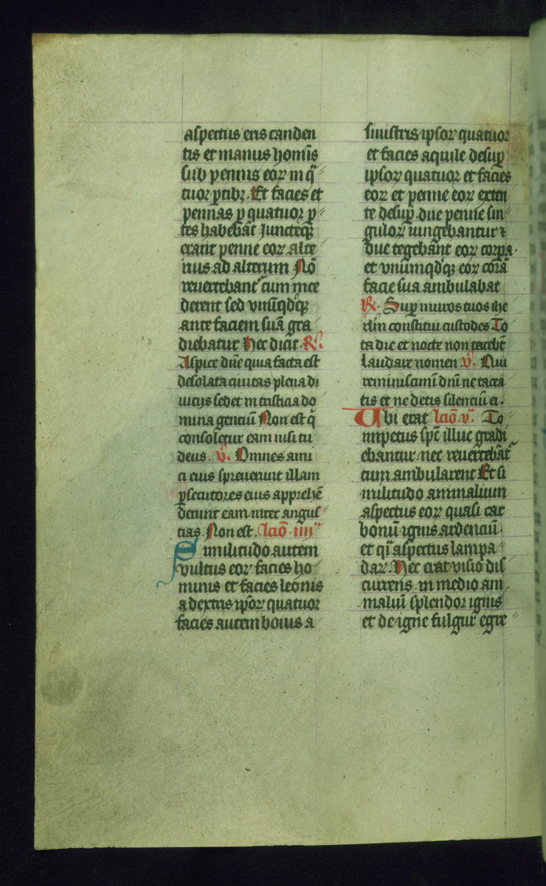 This small breviary, composed of more than 500 folios, is extraordinary for its length, considering it is the summer portion of a two-volume breviary for the use of Liège. The manuscript was completed for ecclesiastical use at the Cathedral of Notre-Dame and St.-Lambert in Liège ca. 1420. This attribution is suggested, for instance, by the petitions to the congregation of this cathedral (fols. 114v-117v), as well as the armorial shield of the family of Surlet de Chokier of Liège represented at the opening of the Psalms. The manuscript has modest, but interesting, decoration with historiated and decorated initials marking the liturgical texts, and occasional angels playing instruments in the margins. The most notable pictorial effect is found in the initials inhabited by transparent figures on rich blue ground. The technique is found, for instance, on fol. 156r with the gold monstrance held by translucent angels for the feast of the Corpus Christi.