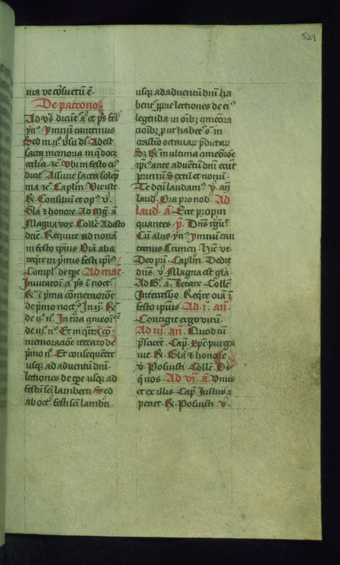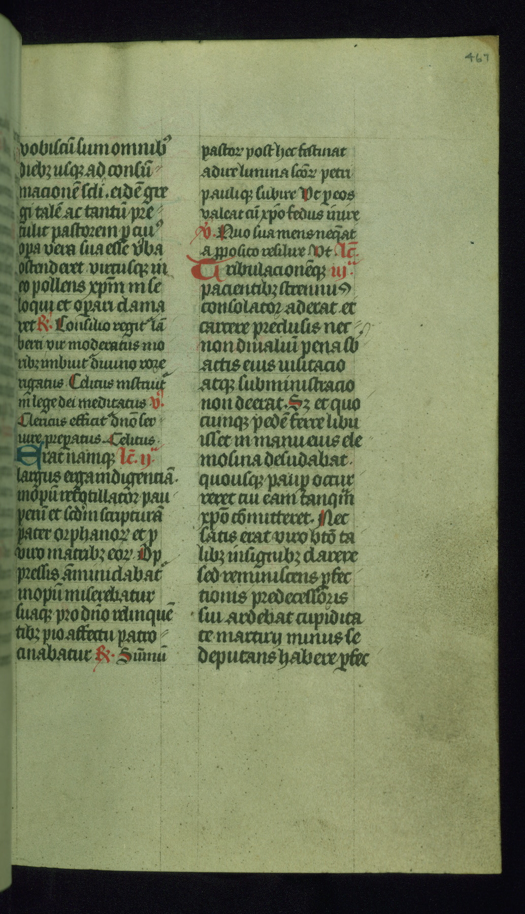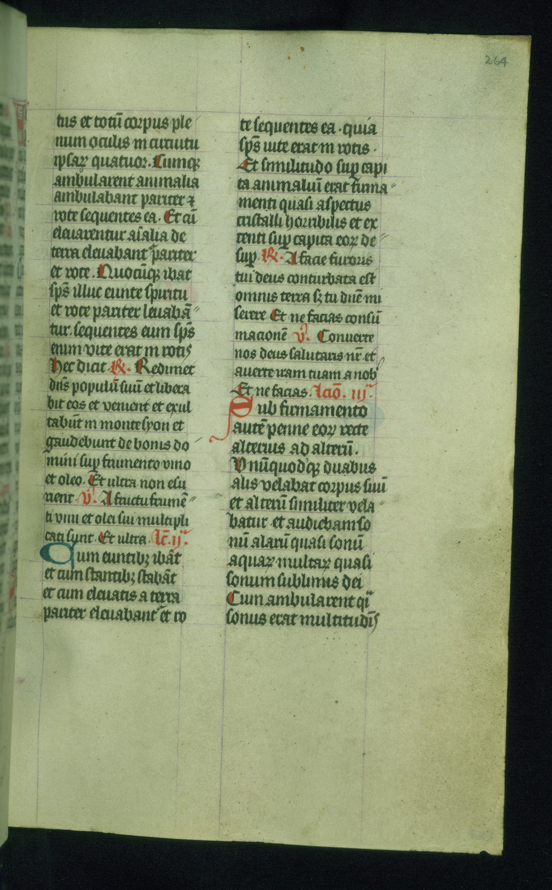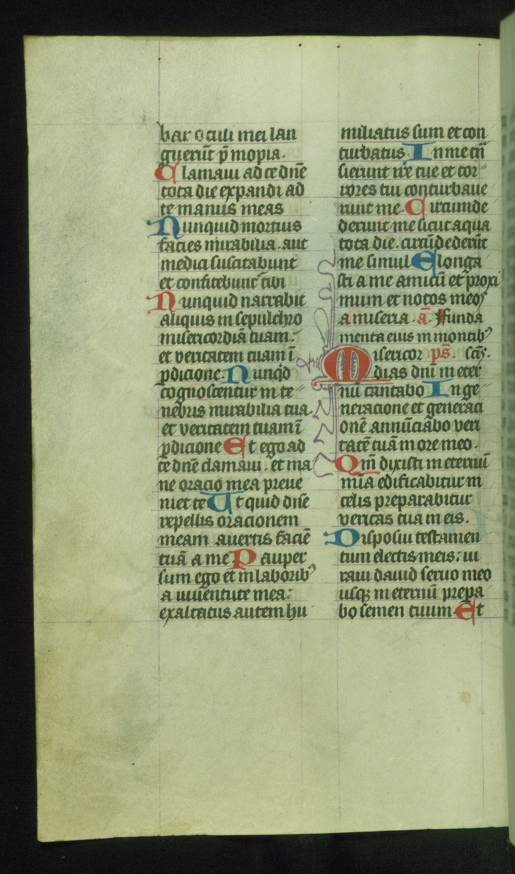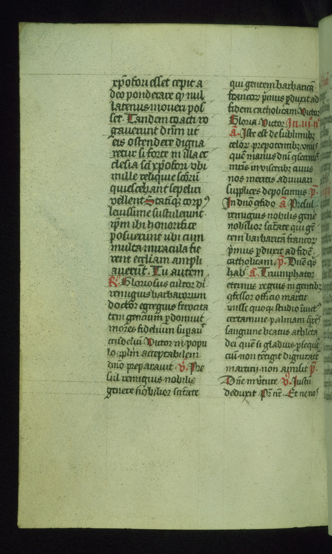 This small breviary, composed of more than 500 folios, is extraordinary for its length, considering it is the summer portion of a two-volume breviary for the use of Liège. The manuscript was completed for ecclesiastical use at the Cathedral of Notre-Dame and St.-Lambert in Liège ca. 1420. This attribution is suggested, for instance, by the petitions to the congregation of this cathedral (fols. 114v-117v), as well as the armorial shield of the family of Surlet de Chokier of Liège represented at the opening of the Psalms. The manuscript has modest, but interesting, decoration with historiated and decorated initials marking the liturgical texts, and occasional angels playing instruments in the margins. The most notable pictorial effect is found in the initials inhabited by transparent figures on rich blue ground. The technique is found, for instance, on fol. 156r with the gold monstrance held by translucent angels for the feast of the Corpus Christi.