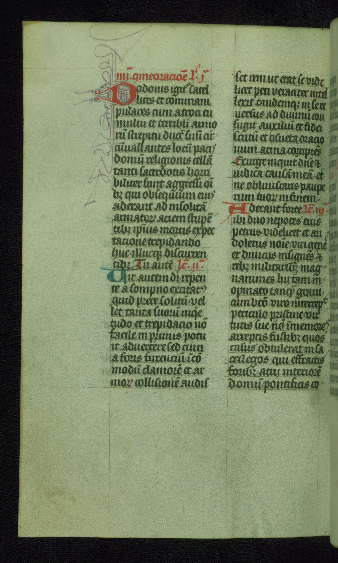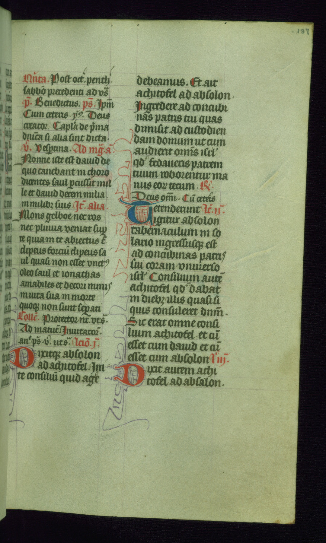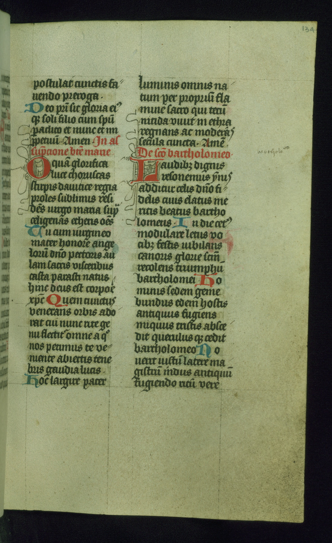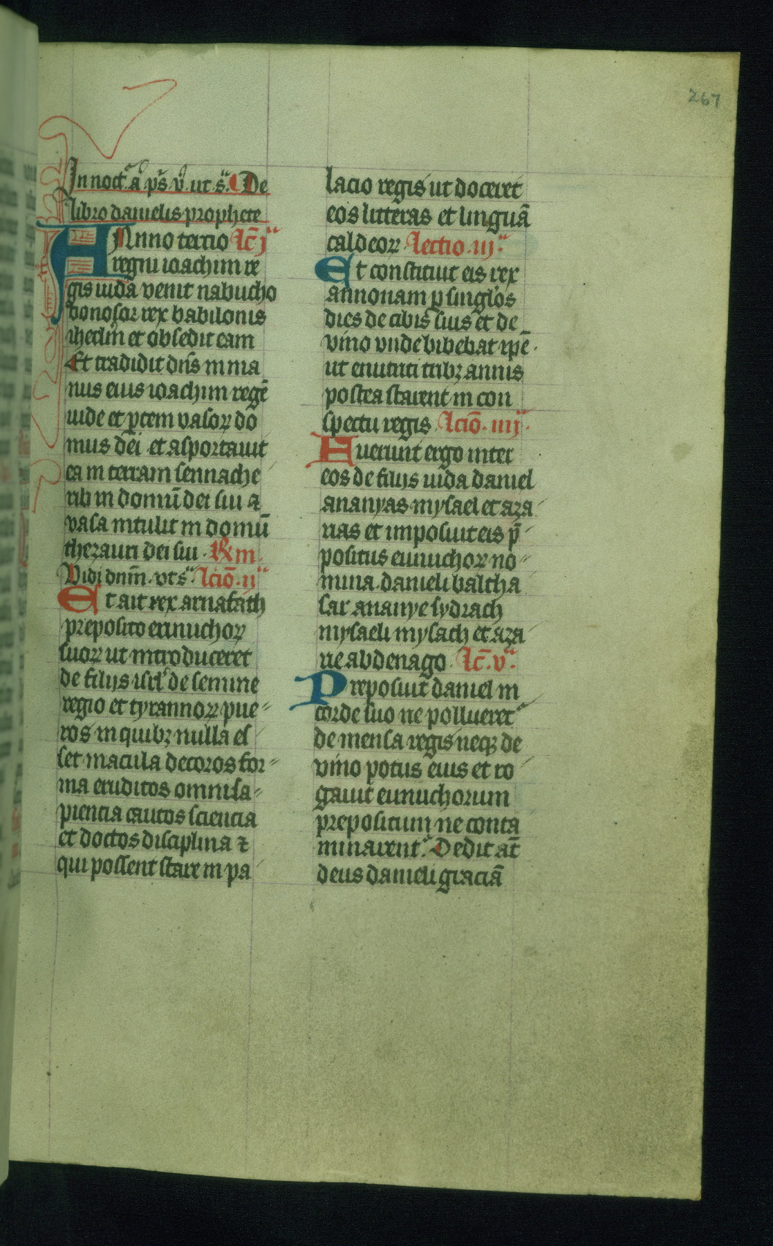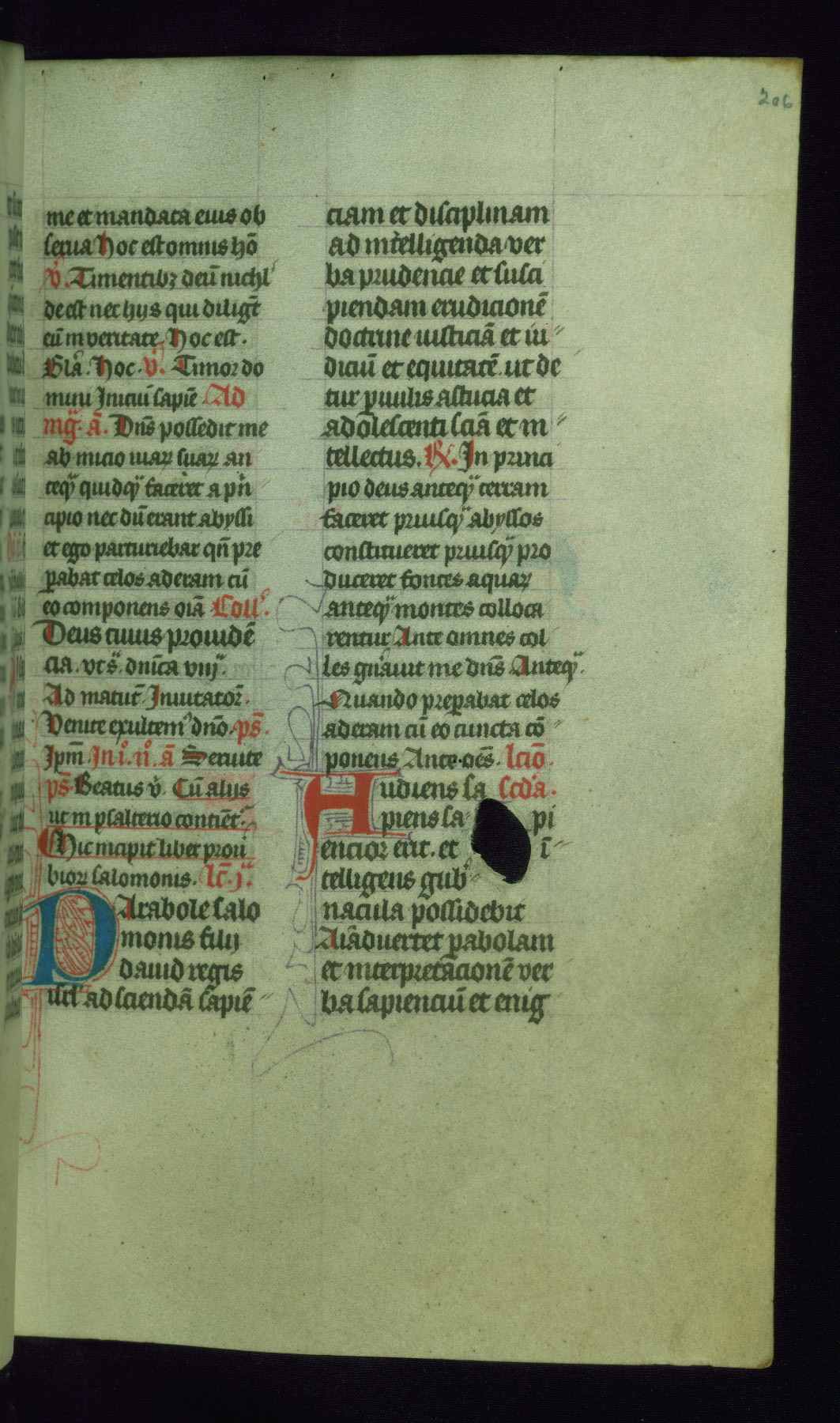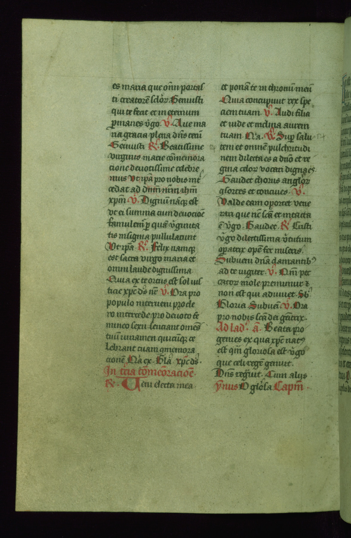 This small breviary, composed of more than 500 folios, is extraordinary for its length, considering it is the summer portion of a two-volume breviary for the use of Liège. The manuscript was completed for ecclesiastical use at the Cathedral of Notre-Dame and St.-Lambert in Liège ca. 1420. This attribution is suggested, for instance, by the petitions to the congregation of this cathedral (fols. 114v-117v), as well as the armorial shield of the family of Surlet de Chokier of Liège represented at the opening of the Psalms. The manuscript has modest, but interesting, decoration with historiated and decorated initials marking the liturgical texts, and occasional angels playing instruments in the margins. The most notable pictorial effect is found in the initials inhabited by transparent figures on rich blue ground. The technique is found, for instance, on fol. 156r with the gold monstrance held by translucent angels for the feast of the Corpus Christi.