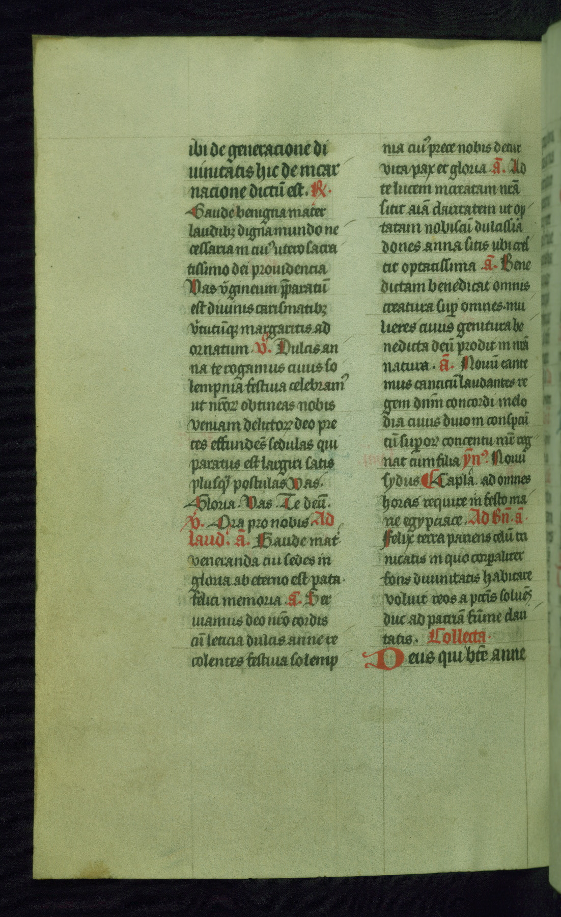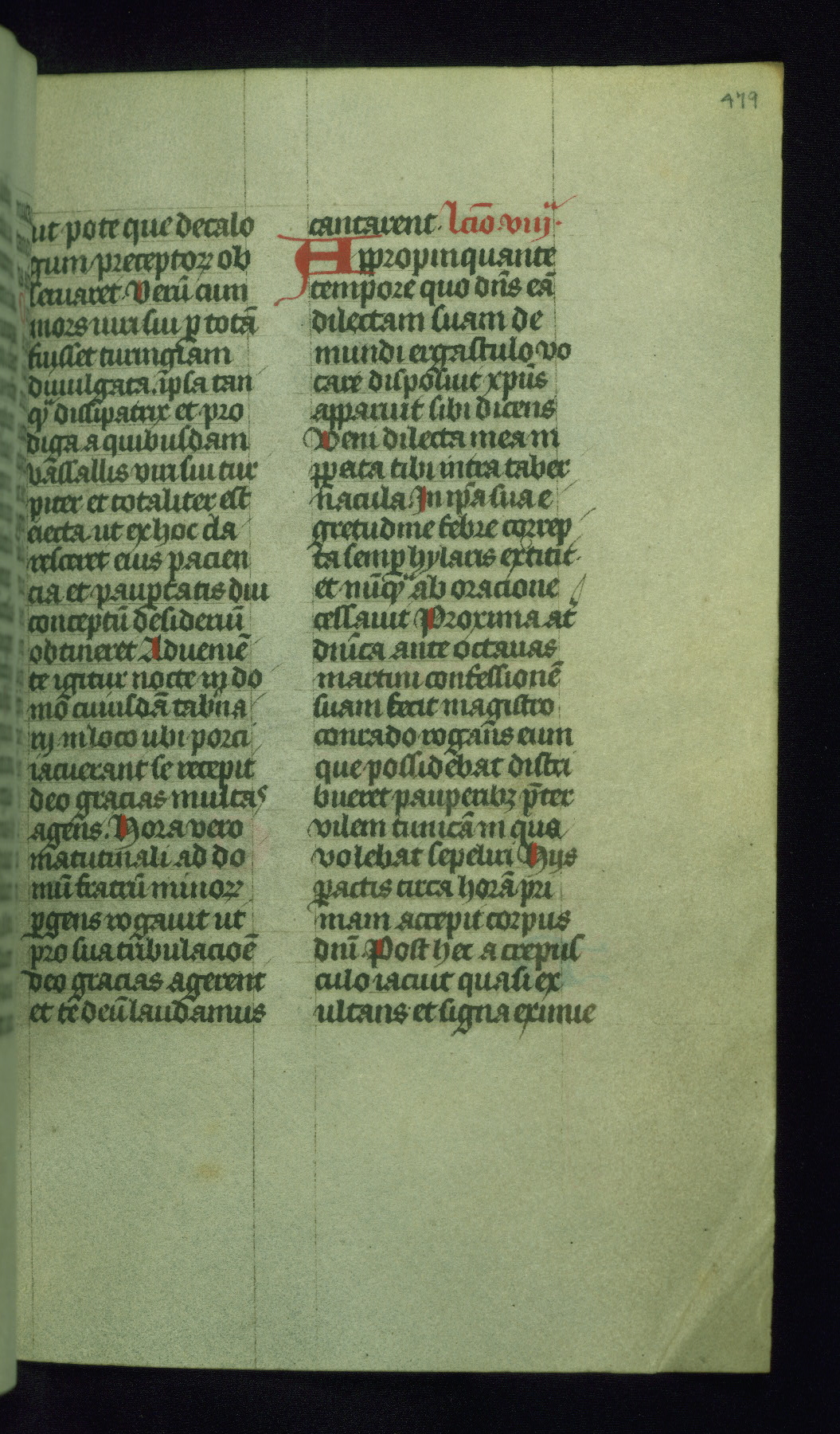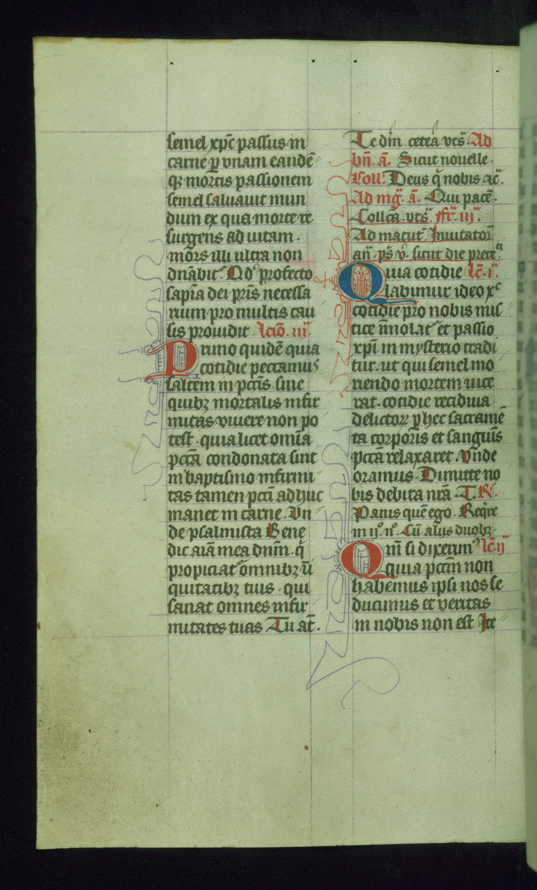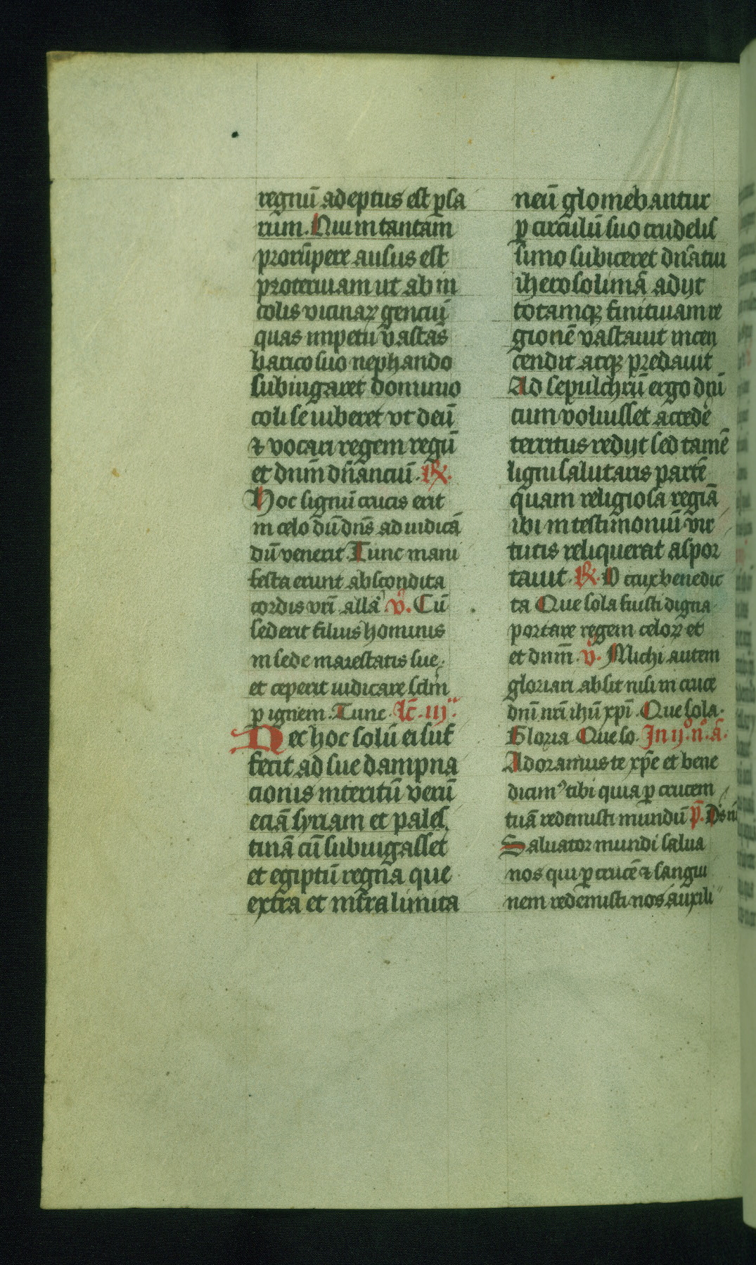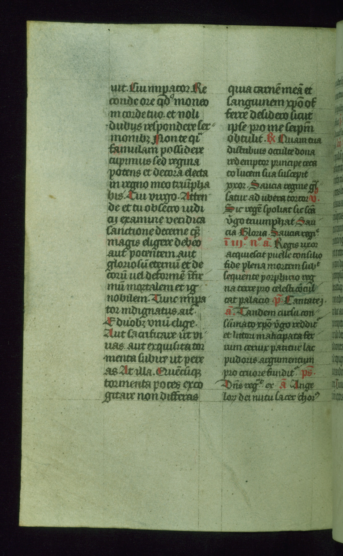 This small breviary, composed of more than 500 folios, is extraordinary for its length, considering it is the summer portion of a two-volume breviary for the use of Liège. The manuscript was completed for ecclesiastical use at the Cathedral of Notre-Dame and St.-Lambert in Liège ca. 1420. This attribution is suggested, for instance, by the petitions to the congregation of this cathedral (fols. 114v-117v), as well as the armorial shield of the family of Surlet de Chokier of Liège represented at the opening of the Psalms. The manuscript has modest, but interesting, decoration with historiated and decorated initials marking the liturgical texts, and occasional angels playing instruments in the margins. The most notable pictorial effect is found in the initials inhabited by transparent figures on rich blue ground. The technique is found, for instance, on fol. 156r with the gold monstrance held by translucent angels for the feast of the Corpus Christi.