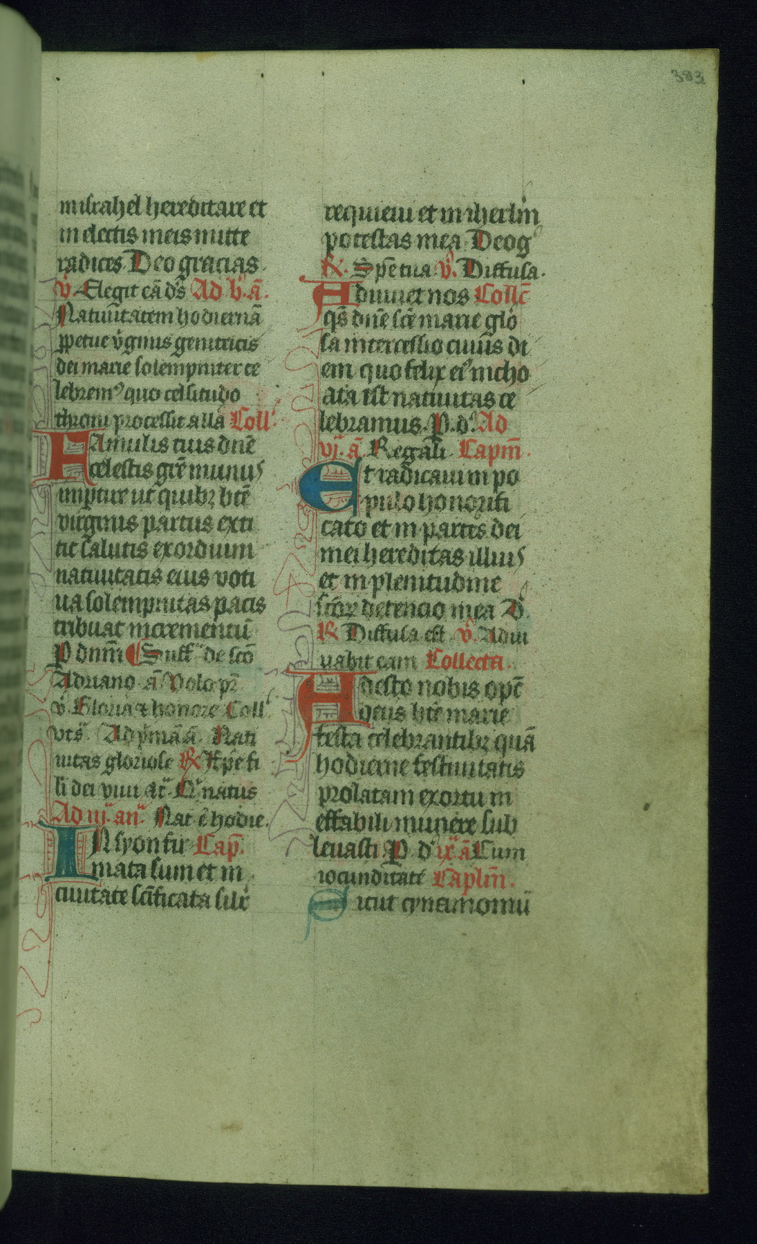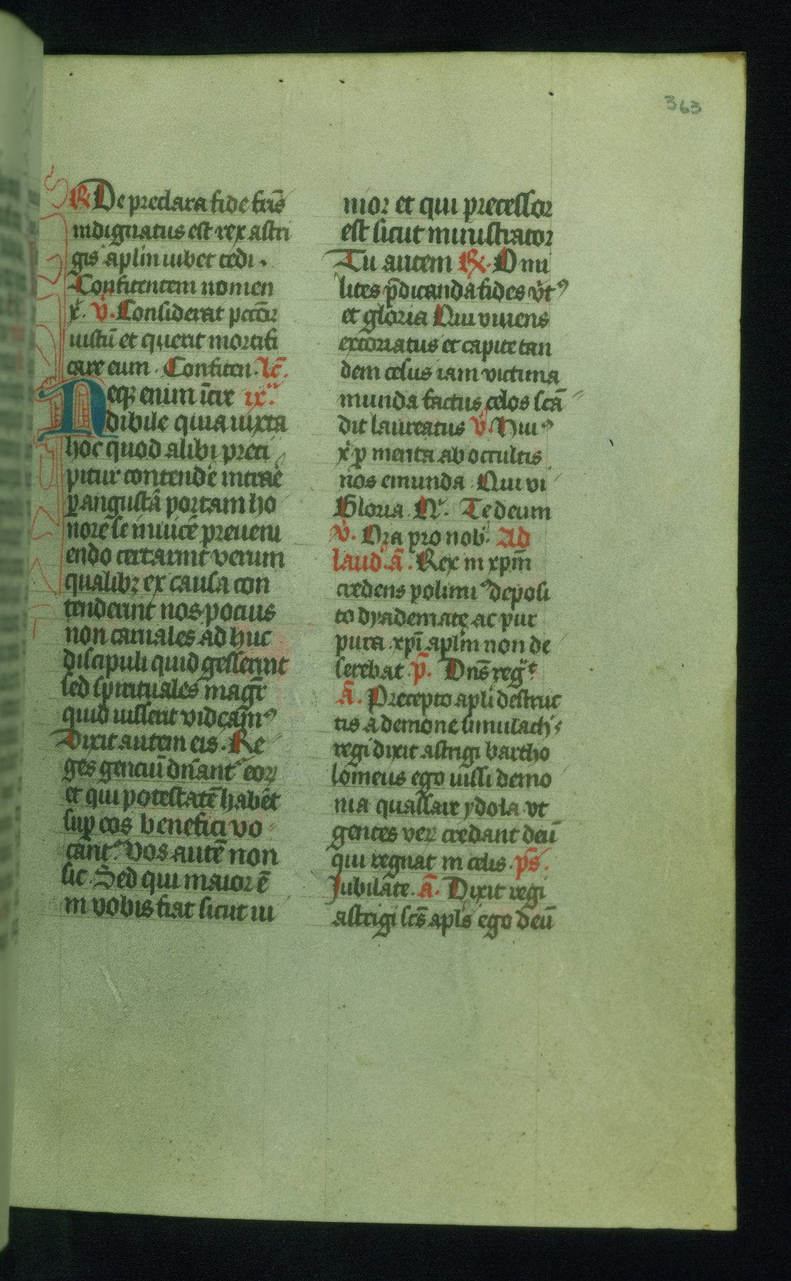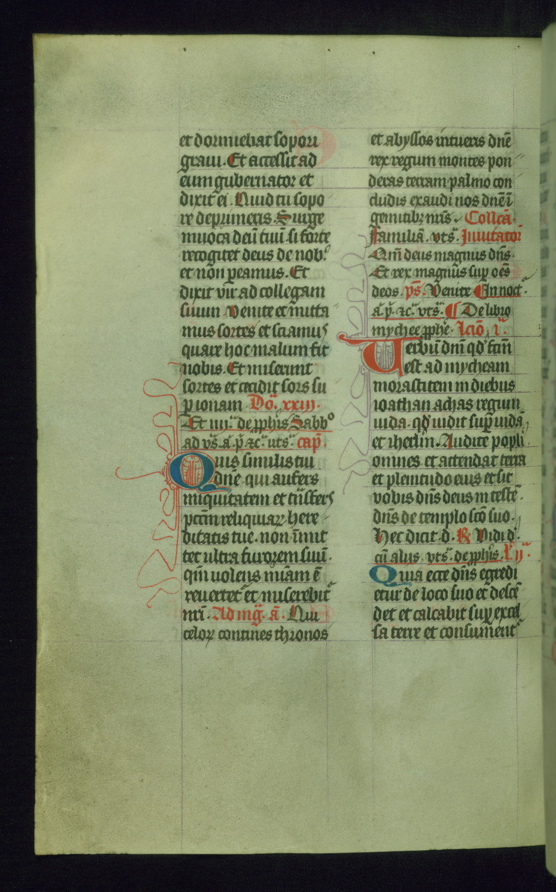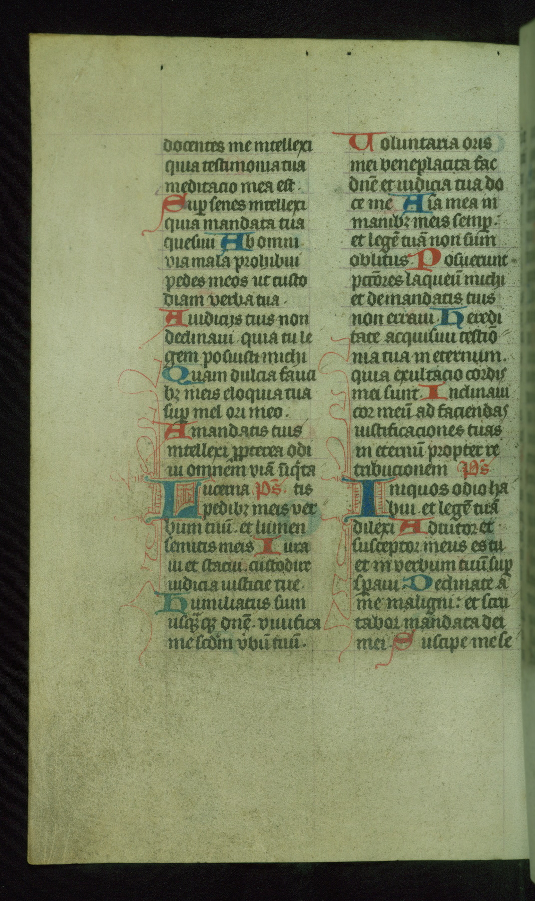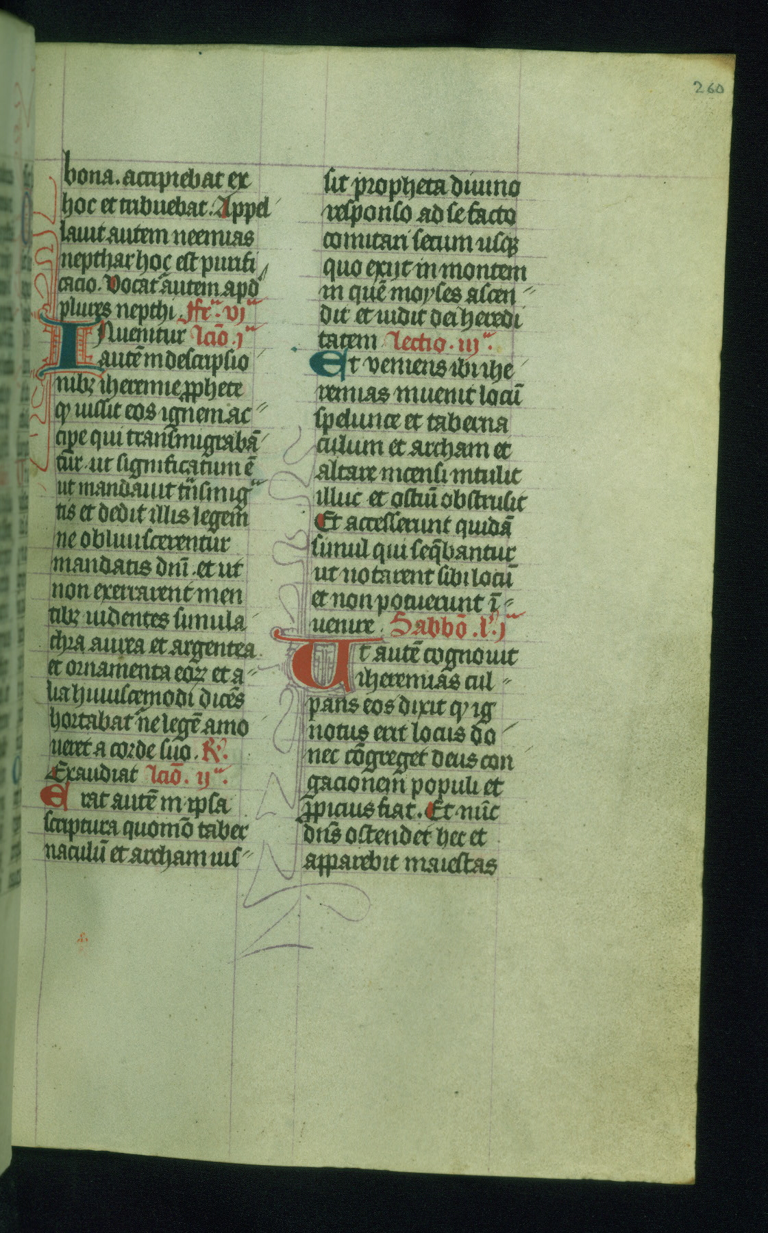 This small breviary, composed of more than 500 folios, is extraordinary for its length, considering it is the summer portion of a two-volume breviary for the use of Liège. The manuscript was completed for ecclesiastical use at the Cathedral of Notre-Dame and St.-Lambert in Liège ca. 1420. This attribution is suggested, for instance, by the petitions to the congregation of this cathedral (fols. 114v-117v), as well as the armorial shield of the family of Surlet de Chokier of Liège represented at the opening of the Psalms. The manuscript has modest, but interesting, decoration with historiated and decorated initials marking the liturgical texts, and occasional angels playing instruments in the margins. The most notable pictorial effect is found in the initials inhabited by transparent figures on rich blue ground. The technique is found, for instance, on fol. 156r with the gold monstrance held by translucent angels for the feast of the Corpus Christi.