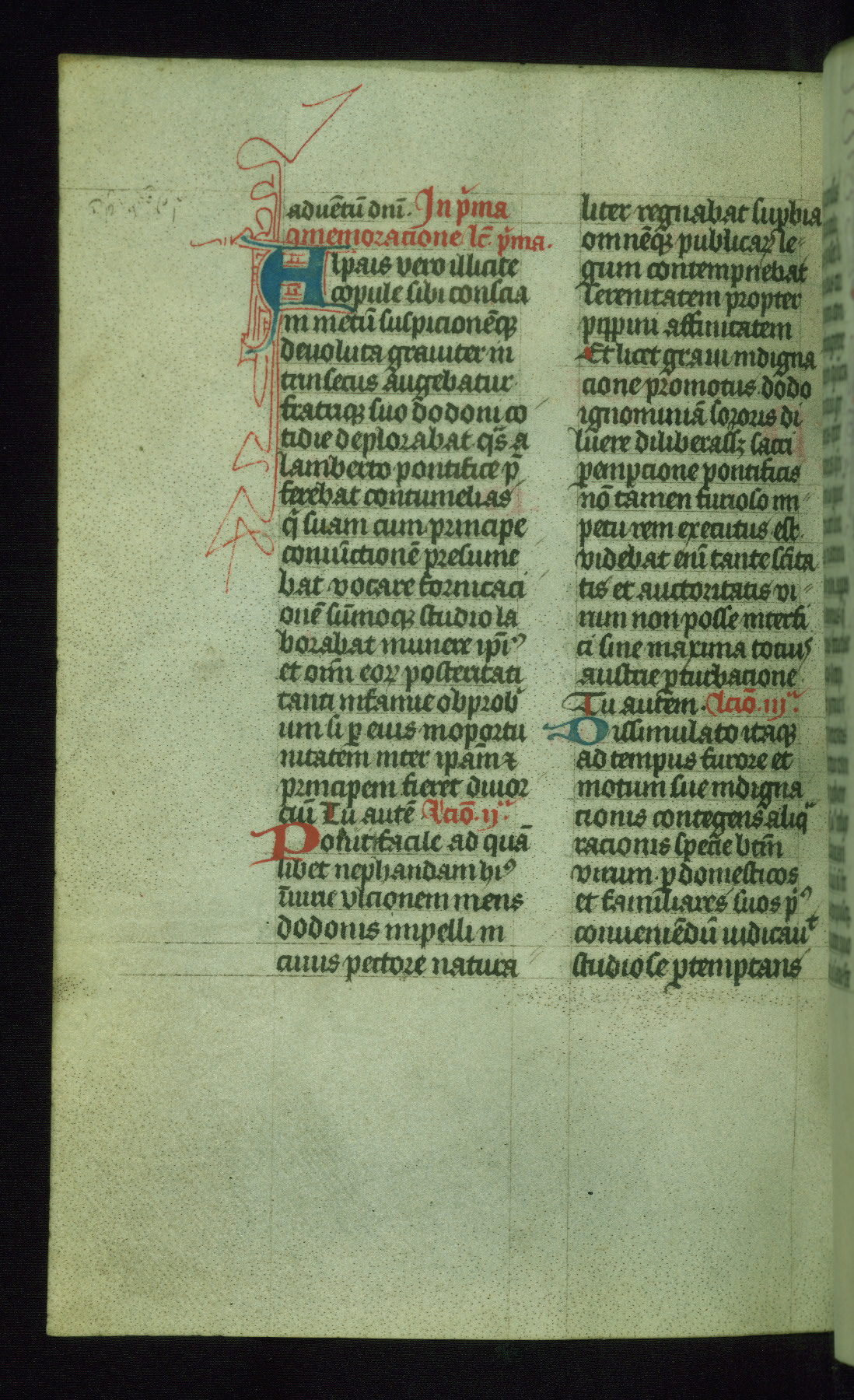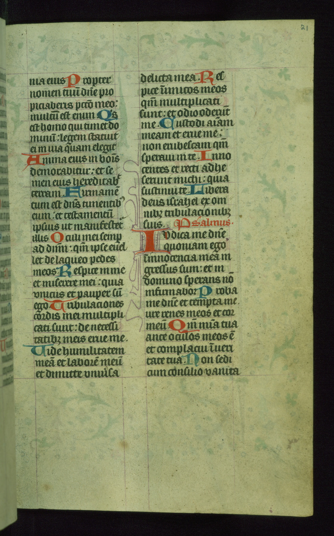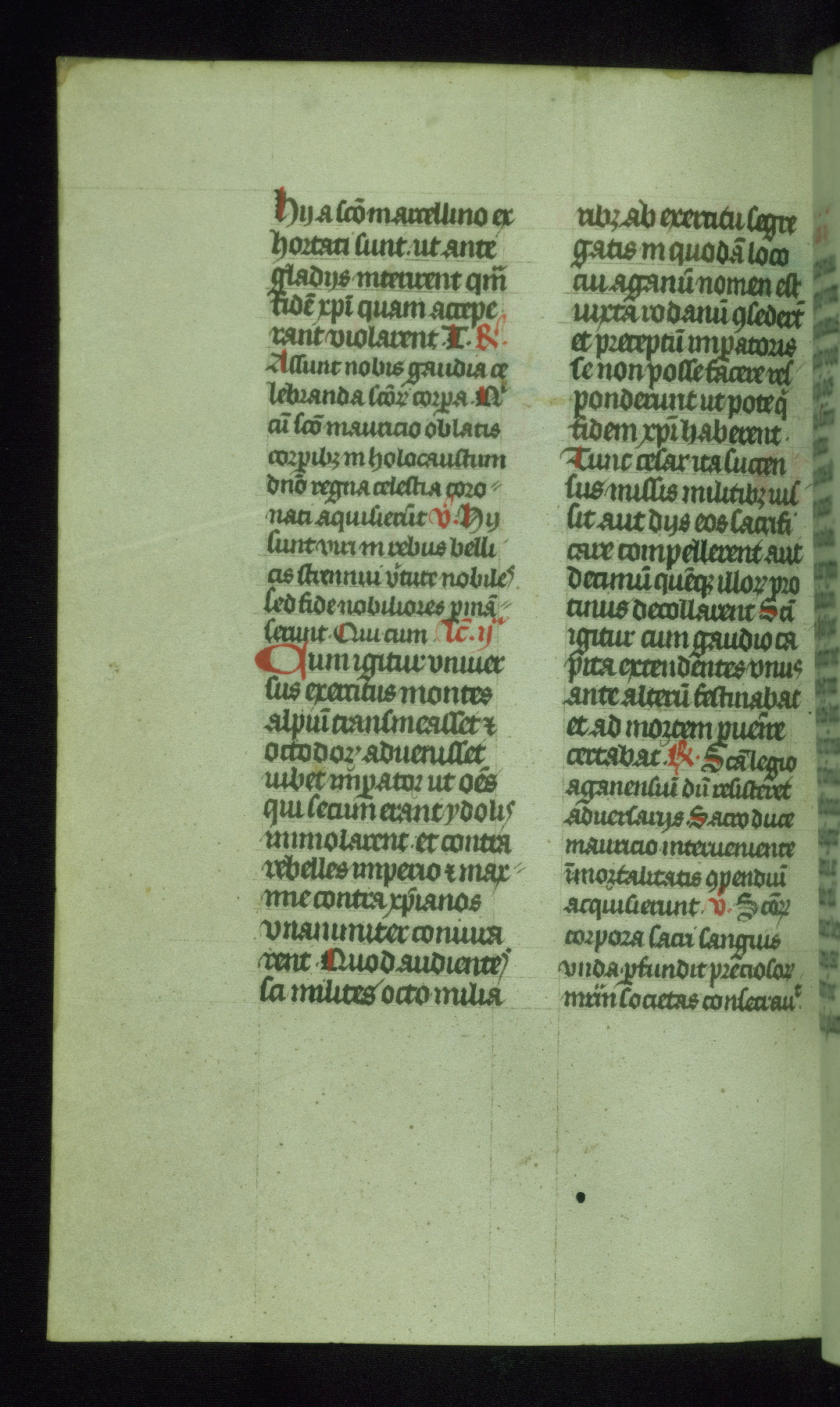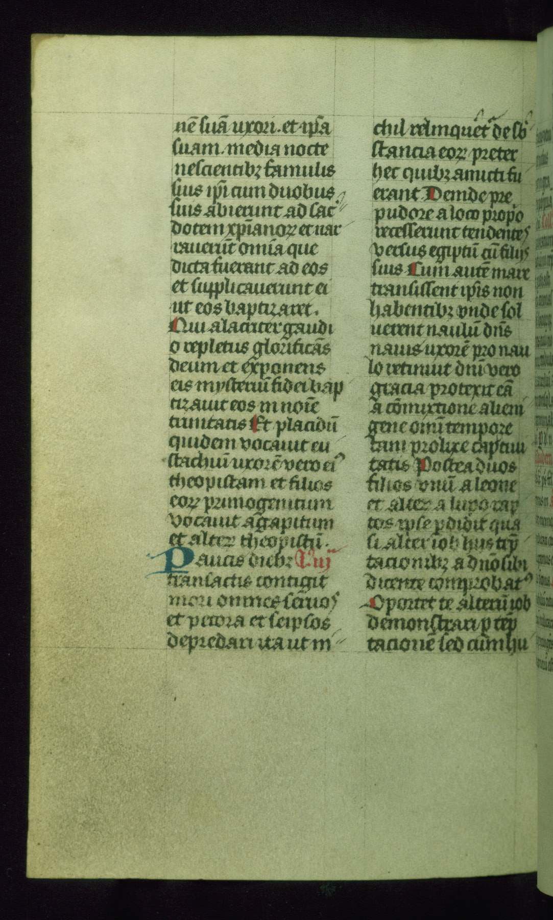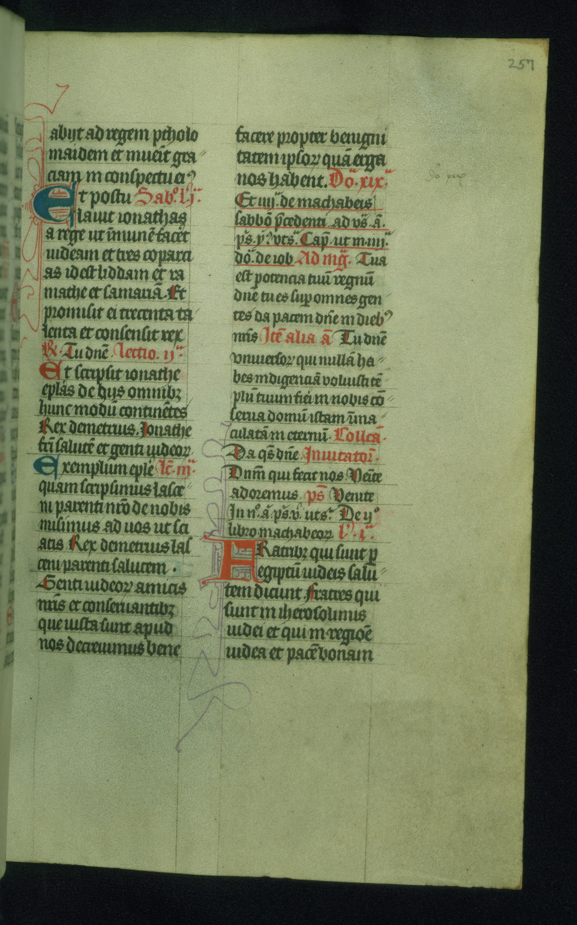 This small breviary, composed of more than 500 folios, is extraordinary for its length, considering it is the summer portion of a two-volume breviary for the use of Liège. The manuscript was completed for ecclesiastical use at the Cathedral of Notre-Dame and St.-Lambert in Liège ca. 1420. This attribution is suggested, for instance, by the petitions to the congregation of this cathedral (fols. 114v-117v), as well as the armorial shield of the family of Surlet de Chokier of Liège represented at the opening of the Psalms. The manuscript has modest, but interesting, decoration with historiated and decorated initials marking the liturgical texts, and occasional angels playing instruments in the margins. The most notable pictorial effect is found in the initials inhabited by transparent figures on rich blue ground. The technique is found, for instance, on fol. 156r with the gold monstrance held by translucent angels for the feast of the Corpus Christi.