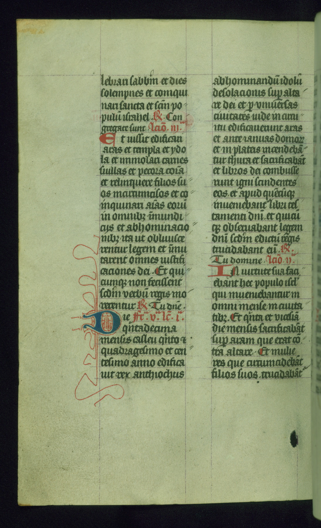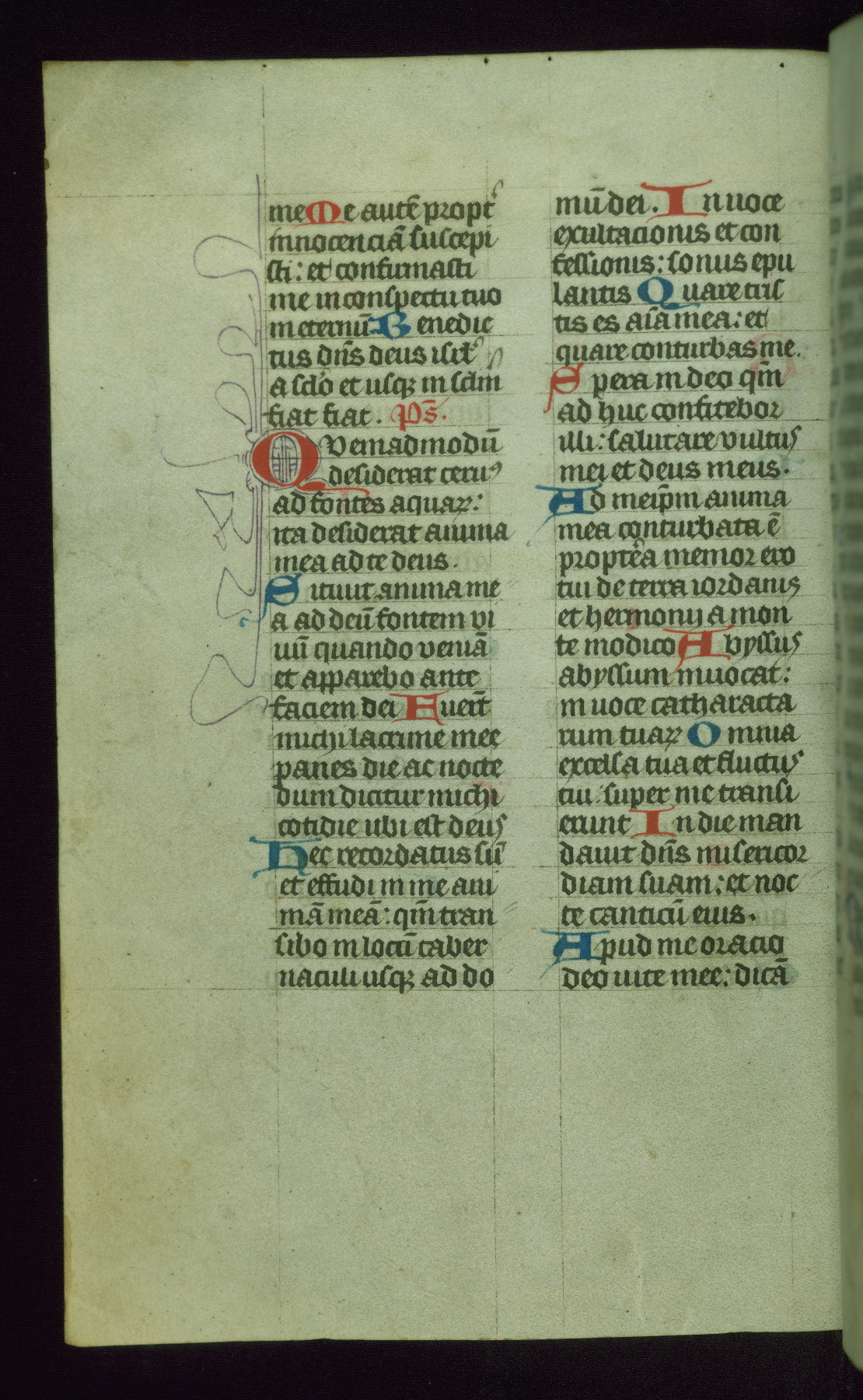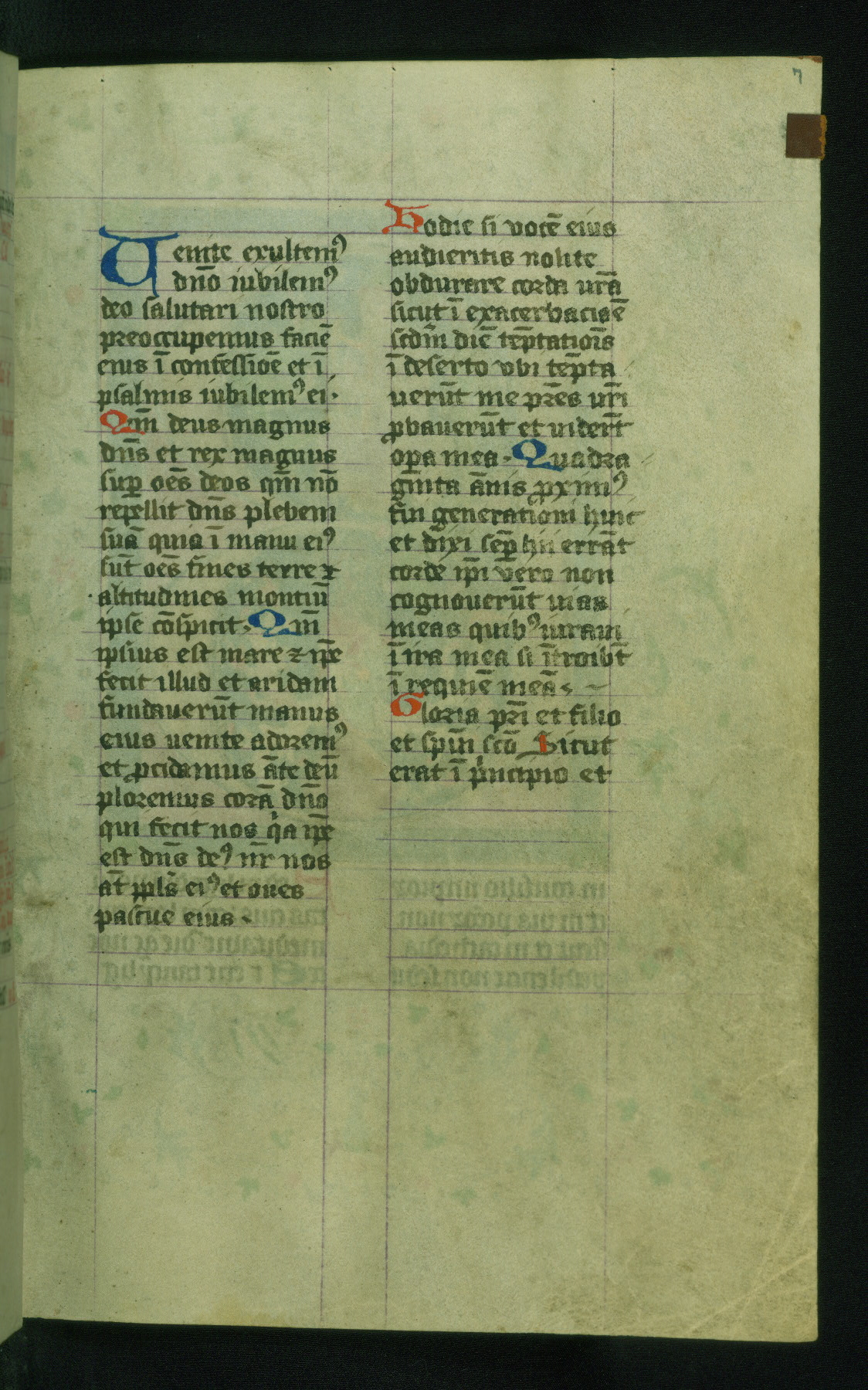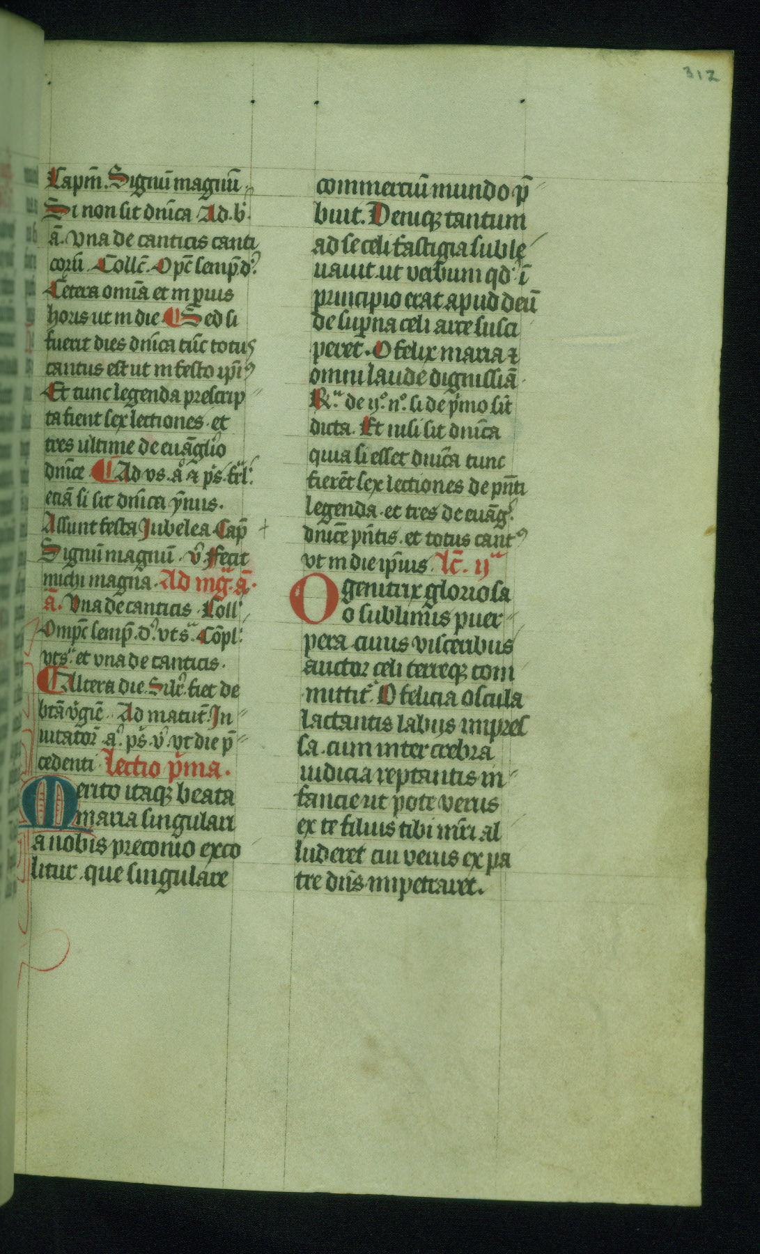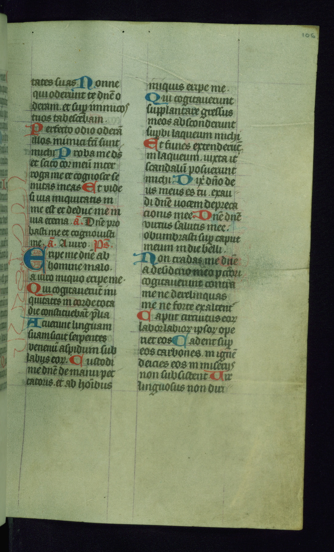 This small breviary, composed of more than 500 folios, is extraordinary for its length, considering it is the summer portion of a two-volume breviary for the use of Liège. The manuscript was completed for ecclesiastical use at the Cathedral of Notre-Dame and St.-Lambert in Liège ca. 1420. This attribution is suggested, for instance, by the petitions to the congregation of this cathedral (fols. 114v-117v), as well as the armorial shield of the family of Surlet de Chokier of Liège represented at the opening of the Psalms. The manuscript has modest, but interesting, decoration with historiated and decorated initials marking the liturgical texts, and occasional angels playing instruments in the margins. The most notable pictorial effect is found in the initials inhabited by transparent figures on rich blue ground. The technique is found, for instance, on fol. 156r with the gold monstrance held by translucent angels for the feast of the Corpus Christi.
