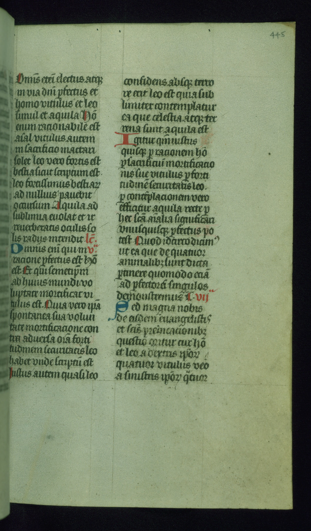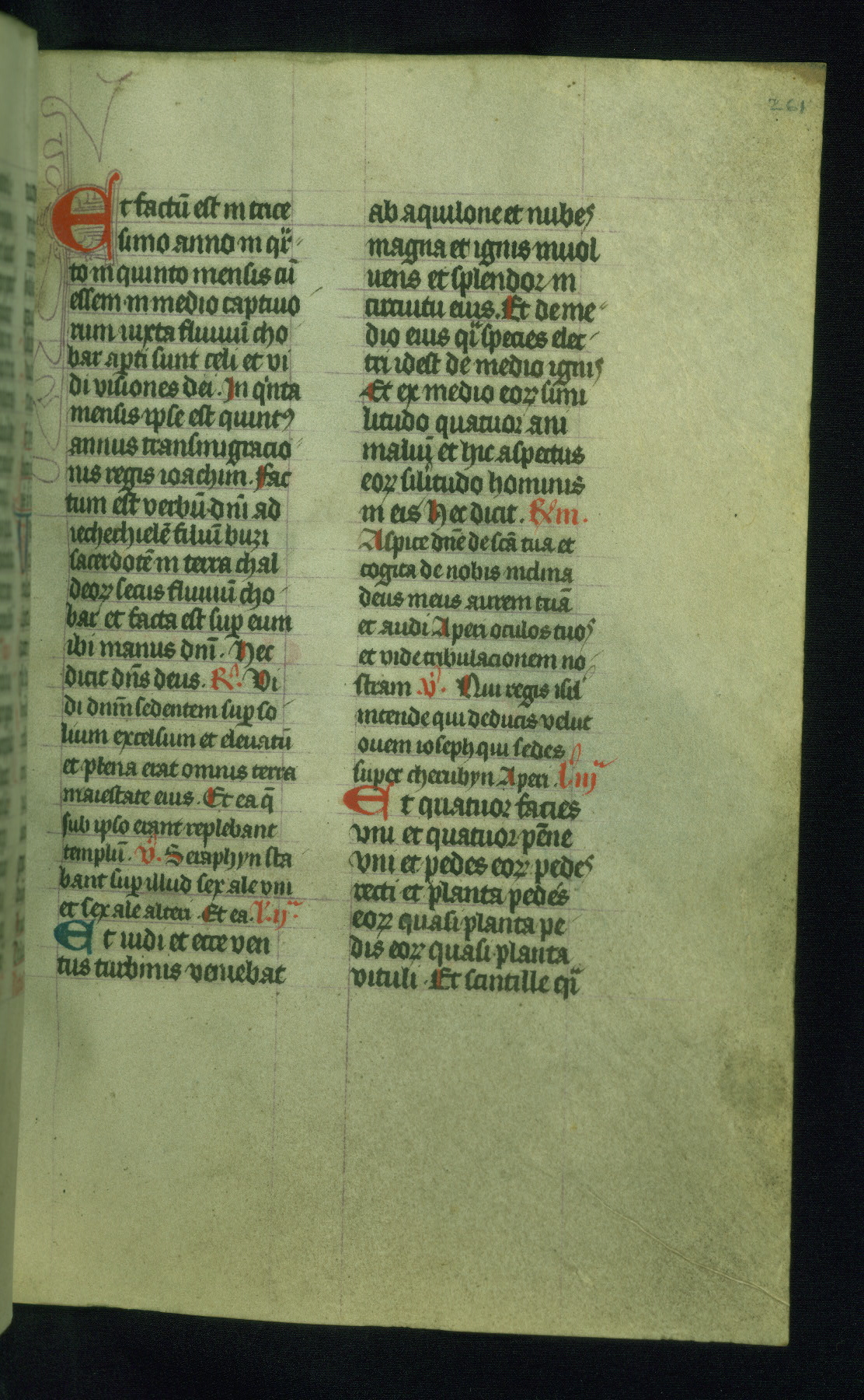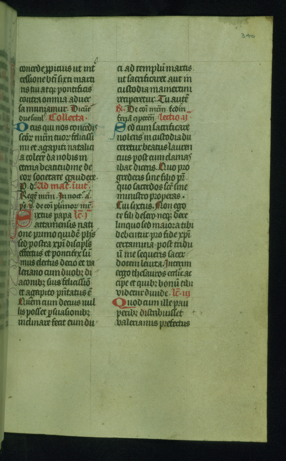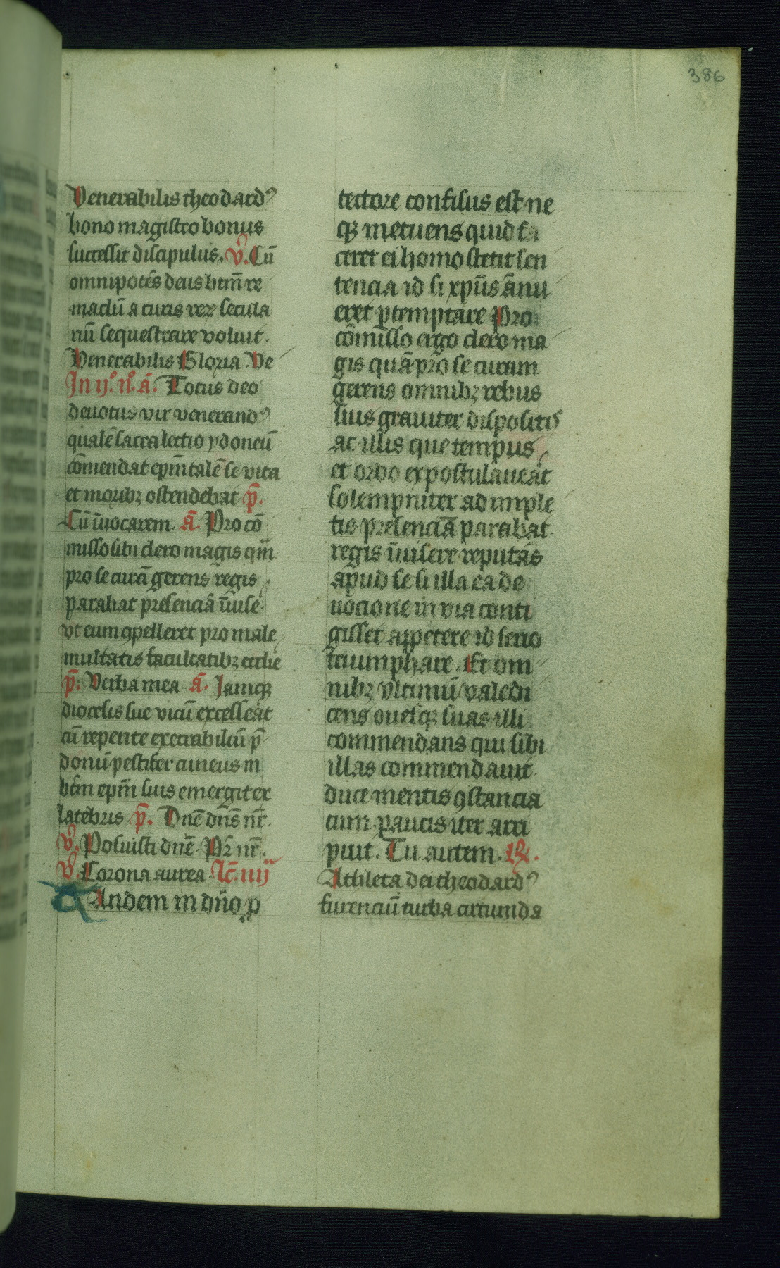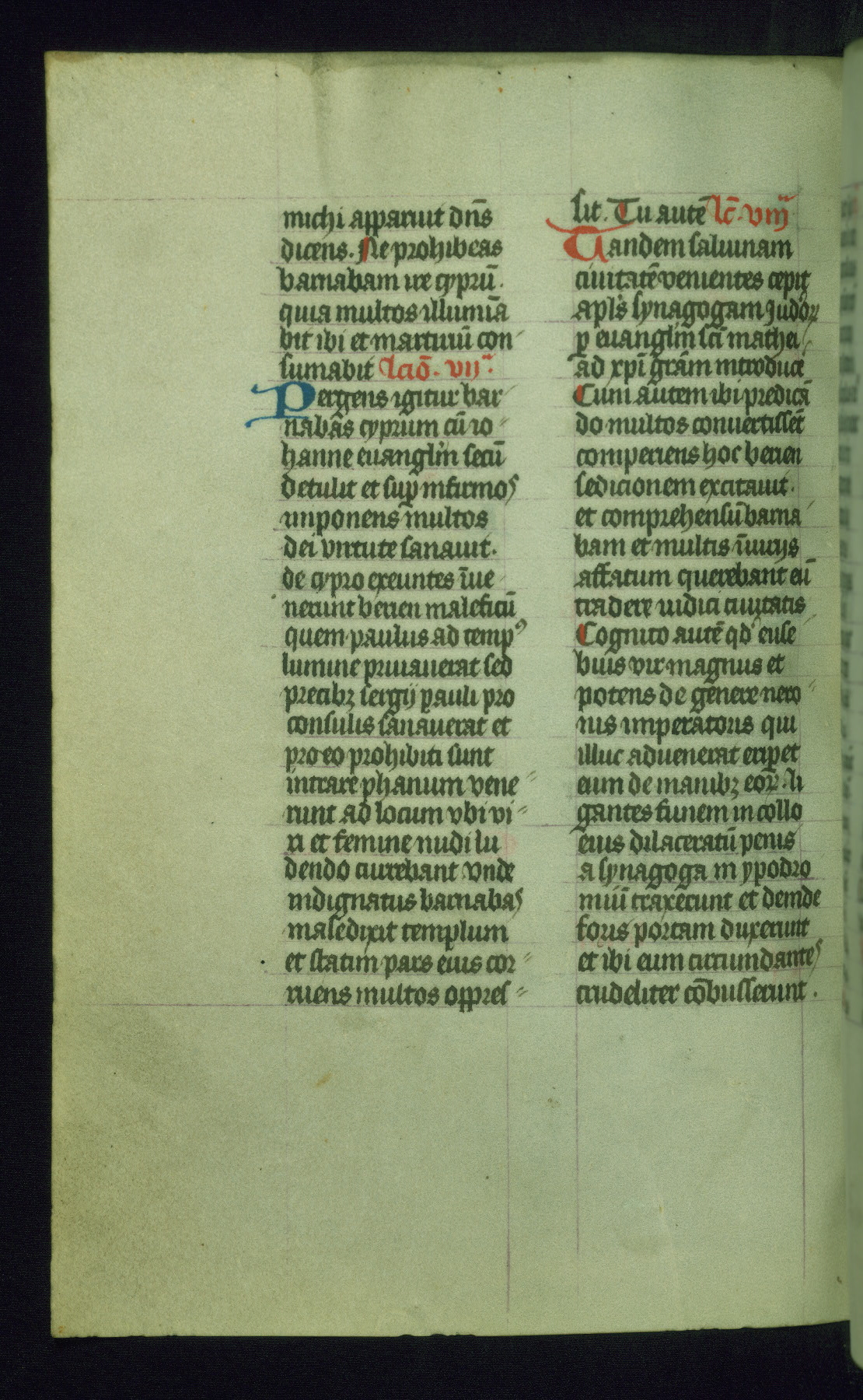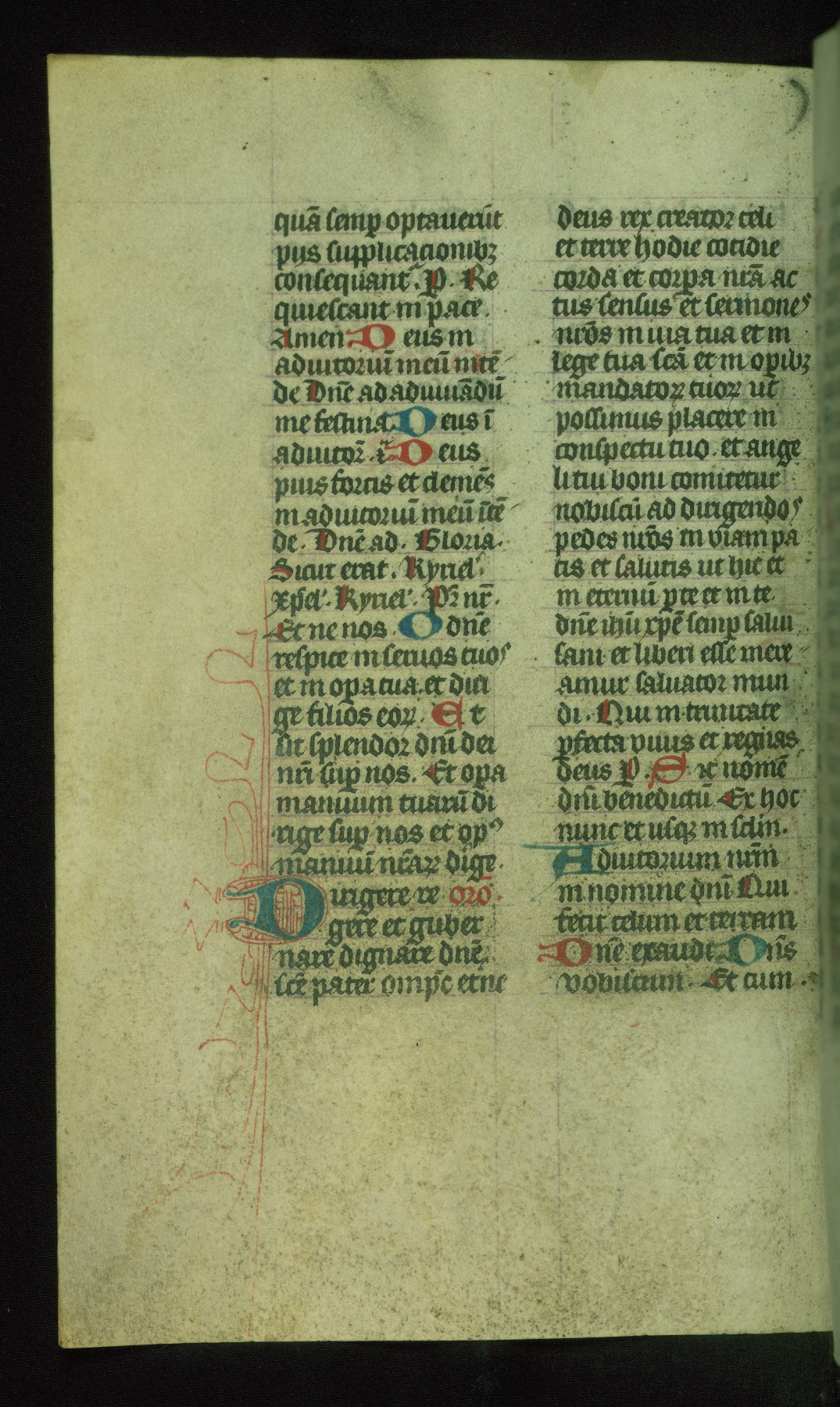 This small breviary, composed of more than 500 folios, is extraordinary for its length, considering it is the summer portion of a two-volume breviary for the use of Liège. The manuscript was completed for ecclesiastical use at the Cathedral of Notre-Dame and St.-Lambert in Liège ca. 1420. This attribution is suggested, for instance, by the petitions to the congregation of this cathedral (fols. 114v-117v), as well as the armorial shield of the family of Surlet de Chokier of Liège represented at the opening of the Psalms. The manuscript has modest, but interesting, decoration with historiated and decorated initials marking the liturgical texts, and occasional angels playing instruments in the margins. The most notable pictorial effect is found in the initials inhabited by transparent figures on rich blue ground. The technique is found, for instance, on fol. 156r with the gold monstrance held by translucent angels for the feast of the Corpus Christi.