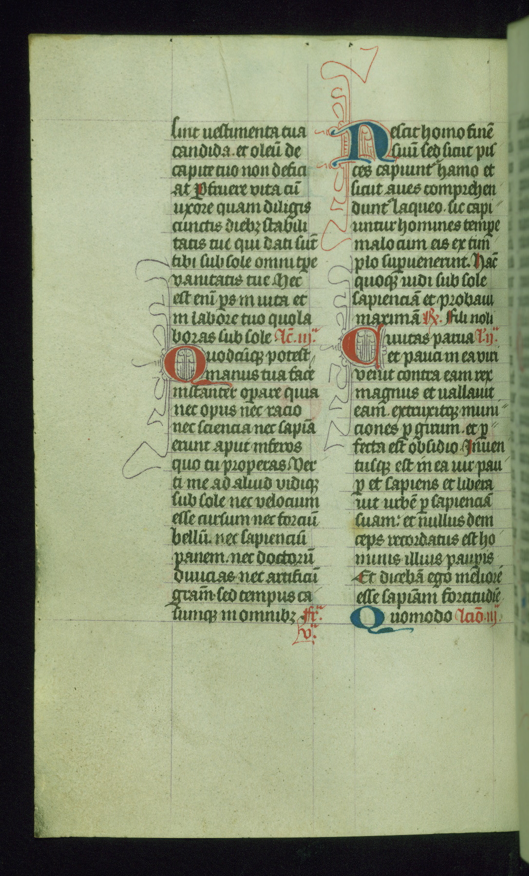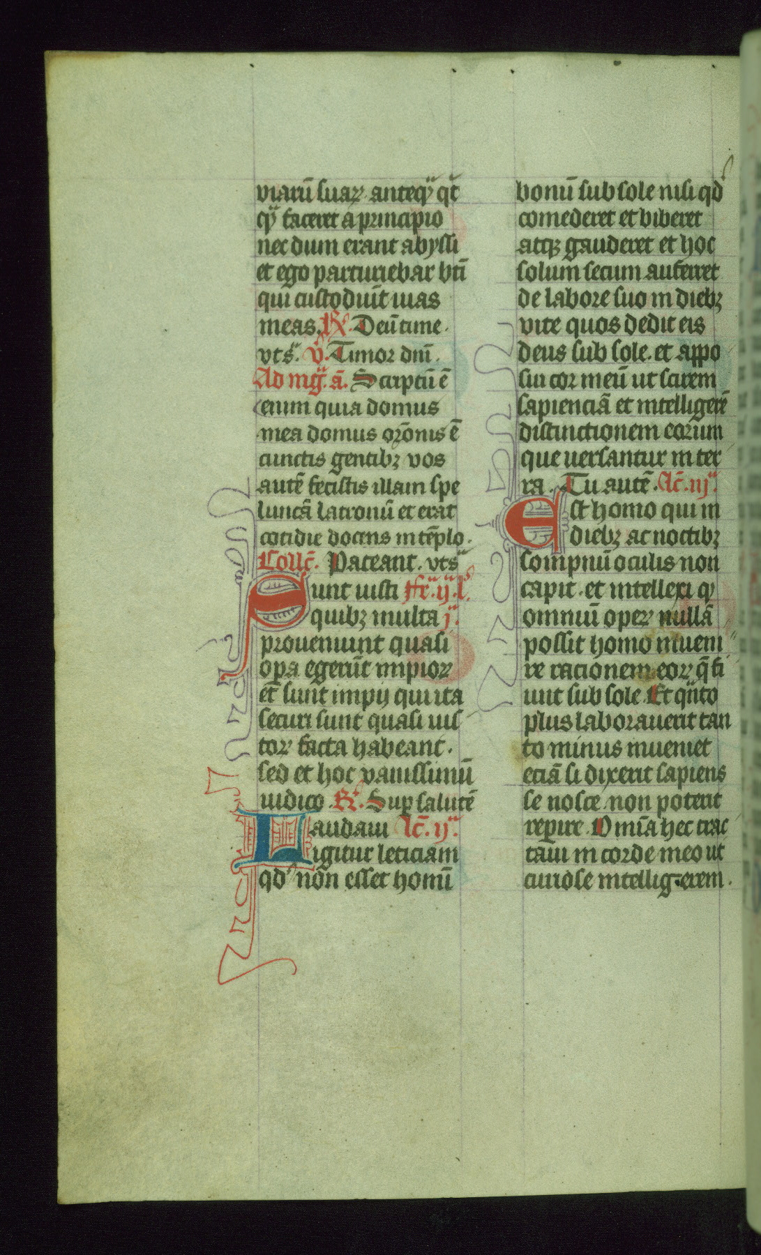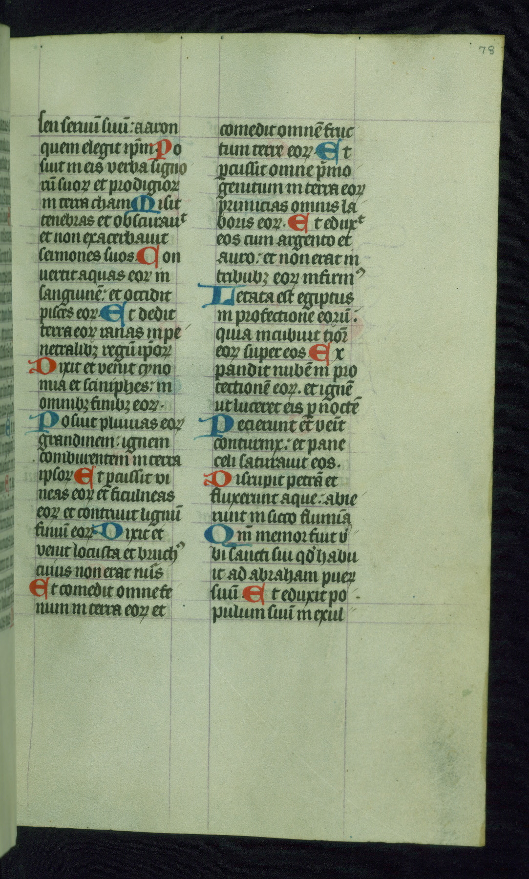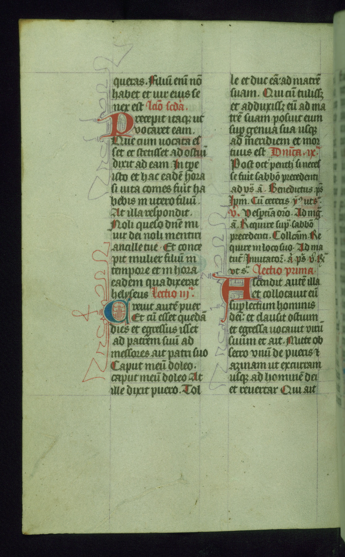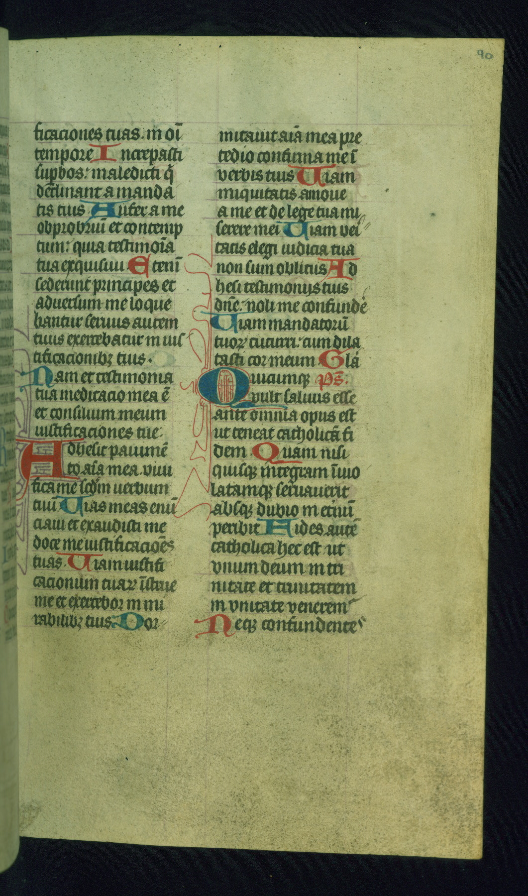 This small breviary, composed of more than 500 folios, is extraordinary for its length, considering it is the summer portion of a two-volume breviary for the use of Liège. The manuscript was completed for ecclesiastical use at the Cathedral of Notre-Dame and St.-Lambert in Liège ca. 1420. This attribution is suggested, for instance, by the petitions to the congregation of this cathedral (fols. 114v-117v), as well as the armorial shield of the family of Surlet de Chokier of Liège represented at the opening of the Psalms. The manuscript has modest, but interesting, decoration with historiated and decorated initials marking the liturgical texts, and occasional angels playing instruments in the margins. The most notable pictorial effect is found in the initials inhabited by transparent figures on rich blue ground. The technique is found, for instance, on fol. 156r with the gold monstrance held by translucent angels for the feast of the Corpus Christi.
