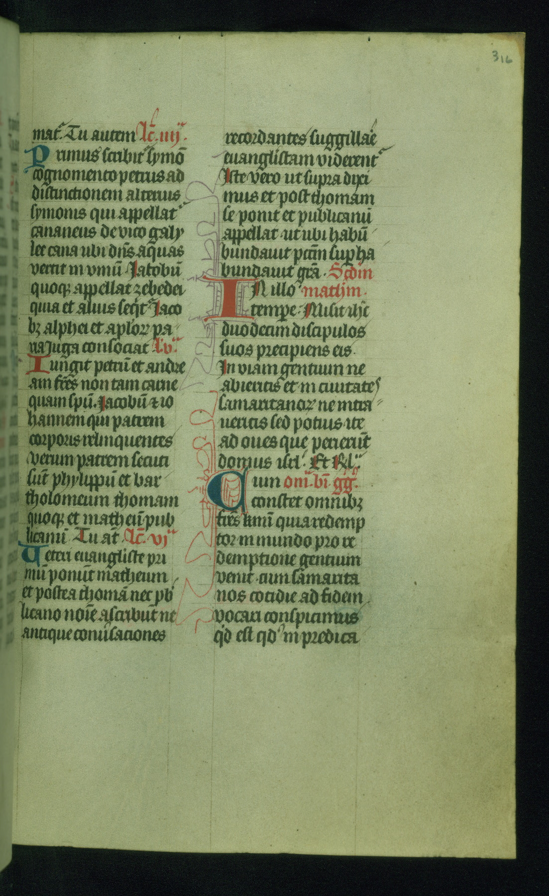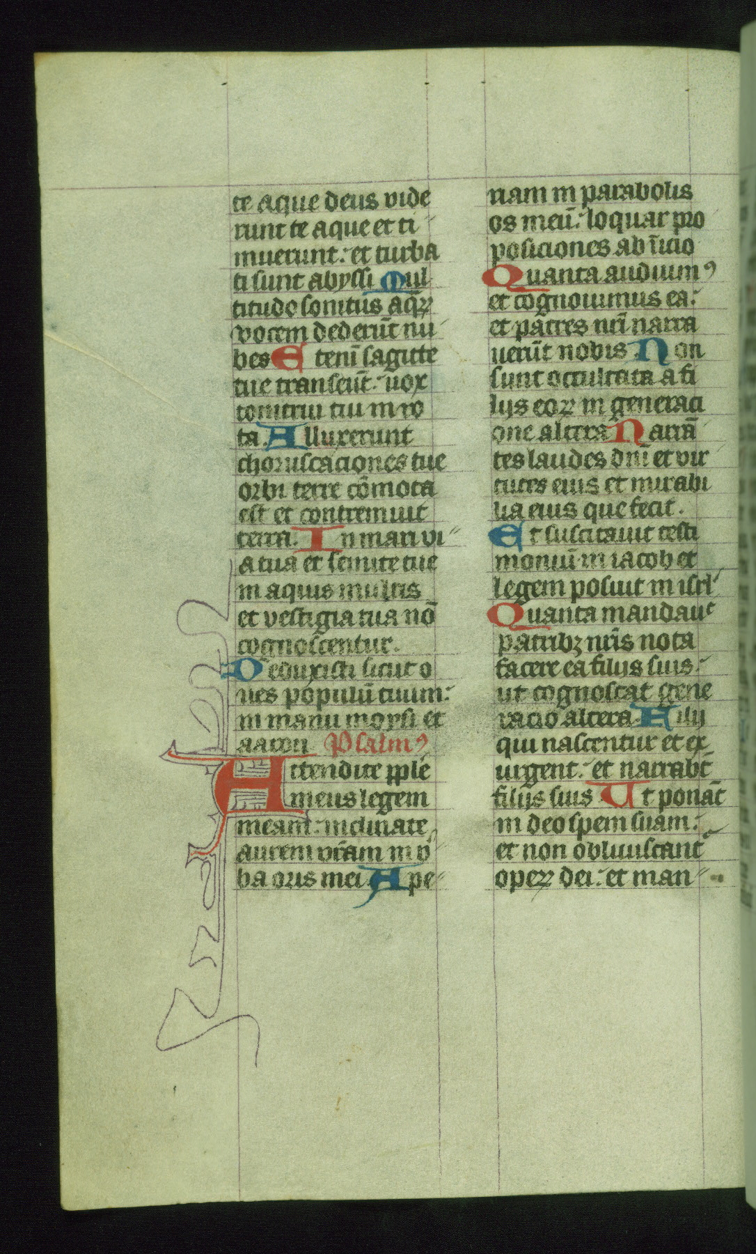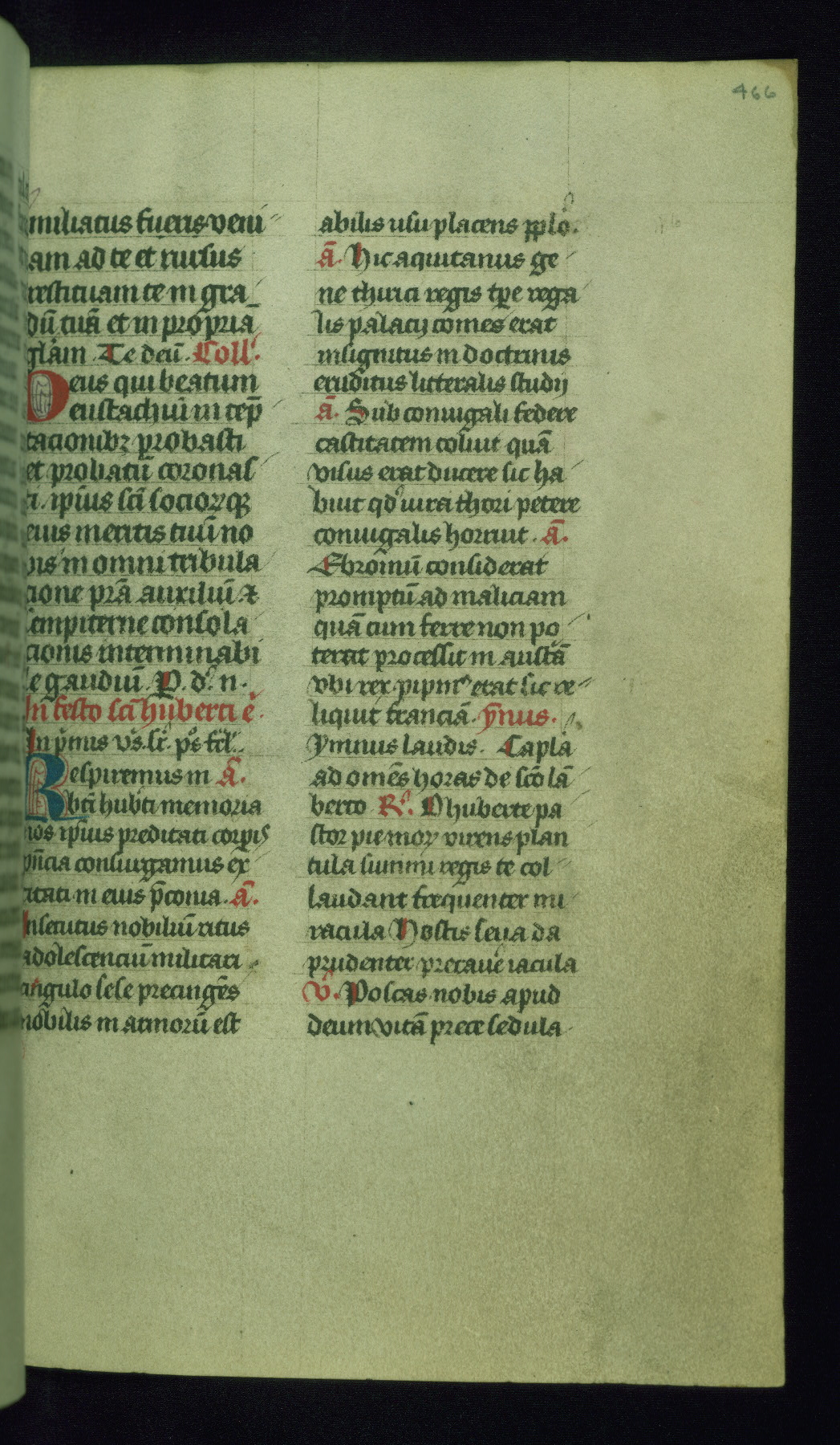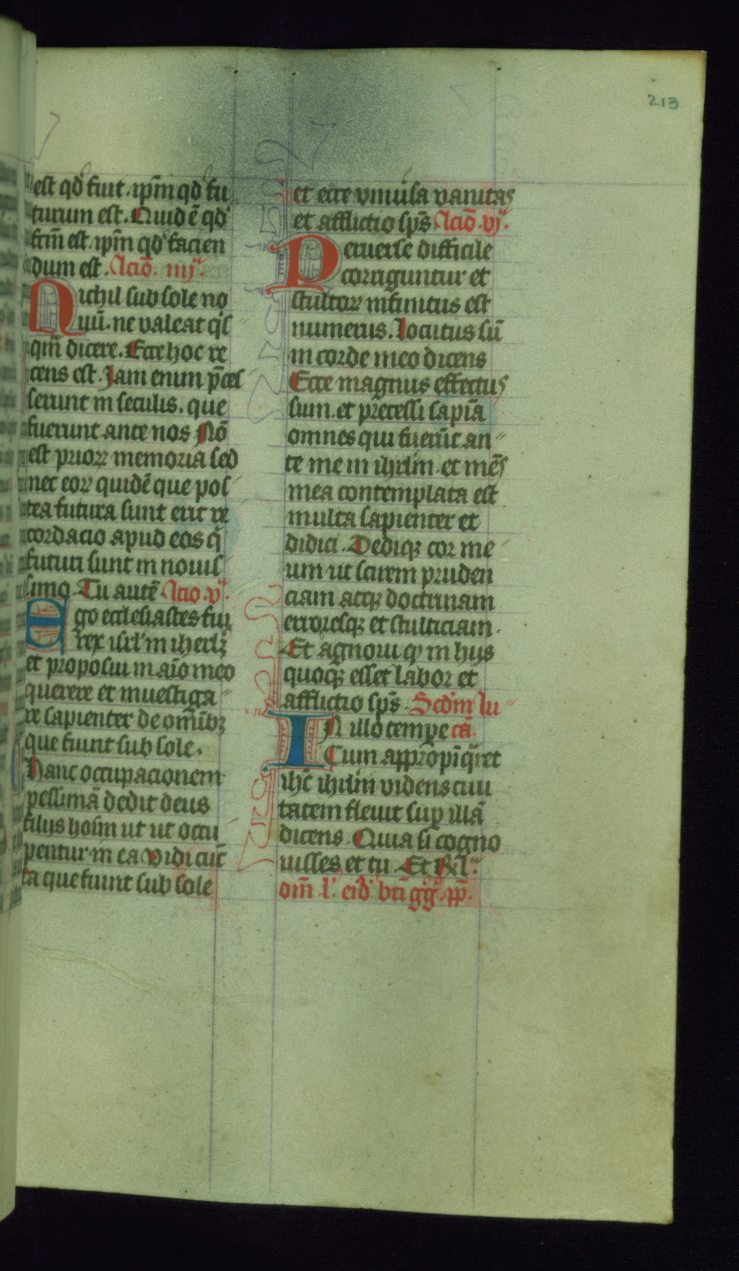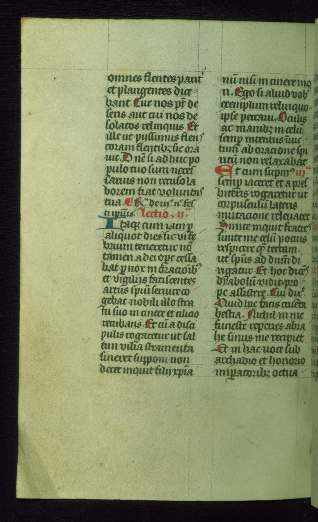 This small breviary, composed of more than 500 folios, is extraordinary for its length, considering it is the summer portion of a two-volume breviary for the use of Liège. The manuscript was completed for ecclesiastical use at the Cathedral of Notre-Dame and St.-Lambert in Liège ca. 1420. This attribution is suggested, for instance, by the petitions to the congregation of this cathedral (fols. 114v-117v), as well as the armorial shield of the family of Surlet de Chokier of Liège represented at the opening of the Psalms. The manuscript has modest, but interesting, decoration with historiated and decorated initials marking the liturgical texts, and occasional angels playing instruments in the margins. The most notable pictorial effect is found in the initials inhabited by transparent figures on rich blue ground. The technique is found, for instance, on fol. 156r with the gold monstrance held by translucent angels for the feast of the Corpus Christi.