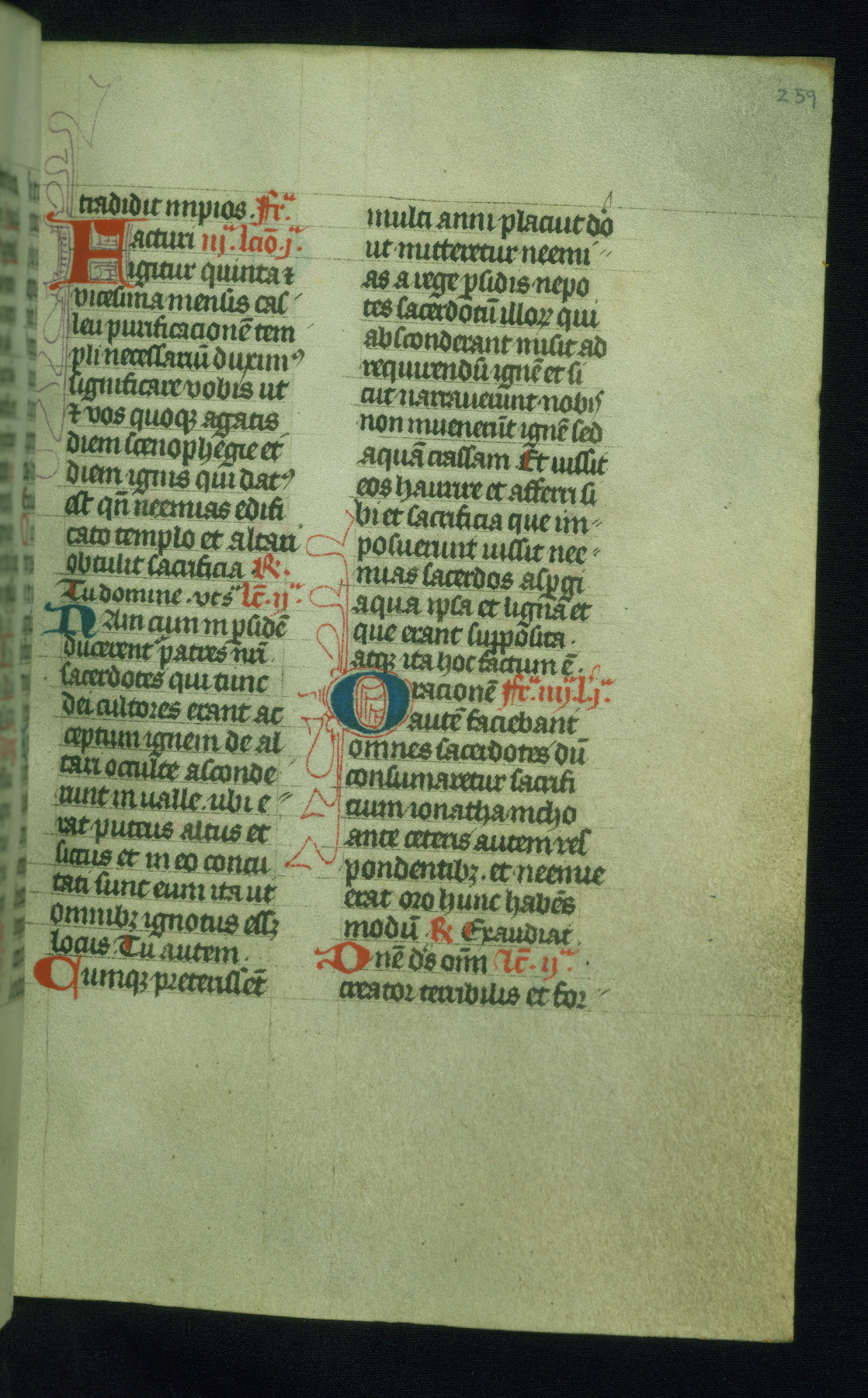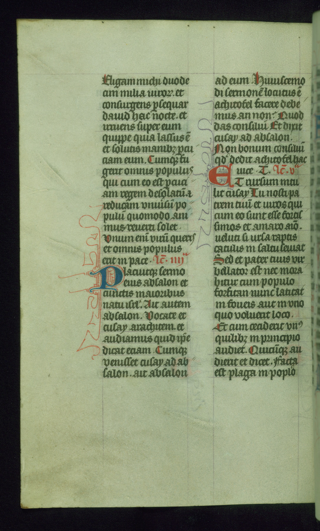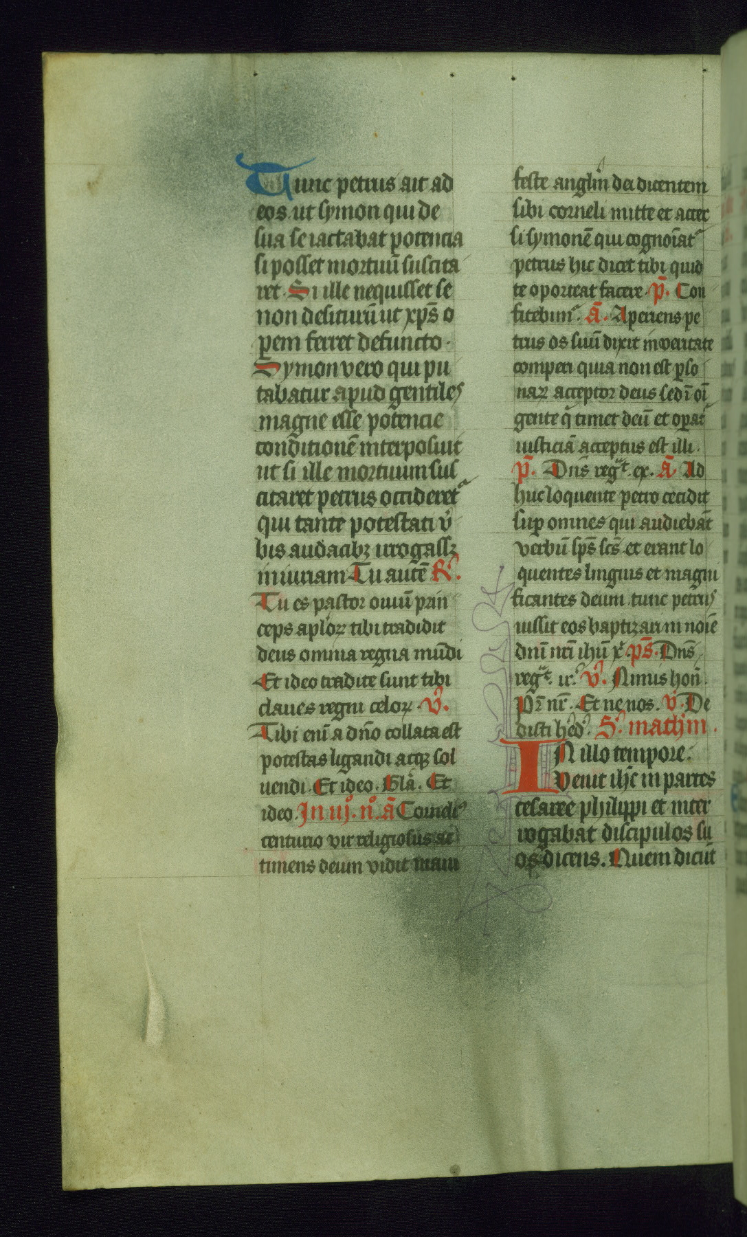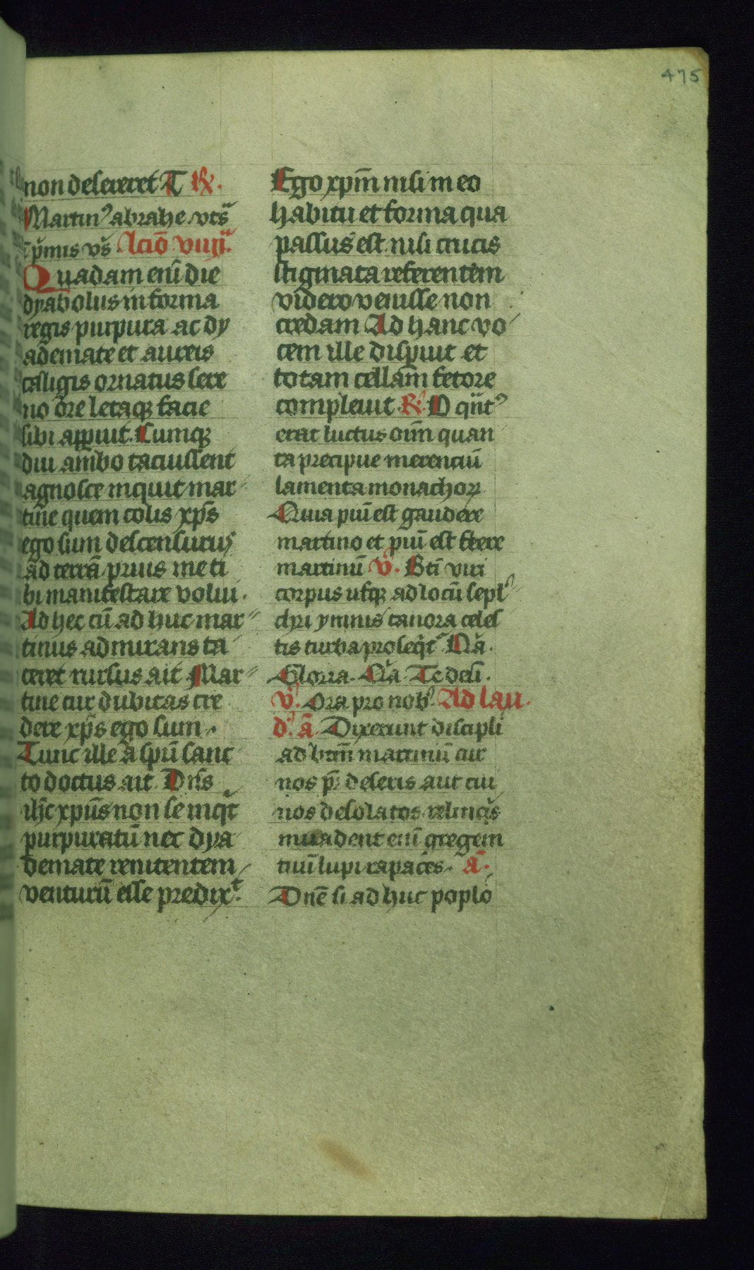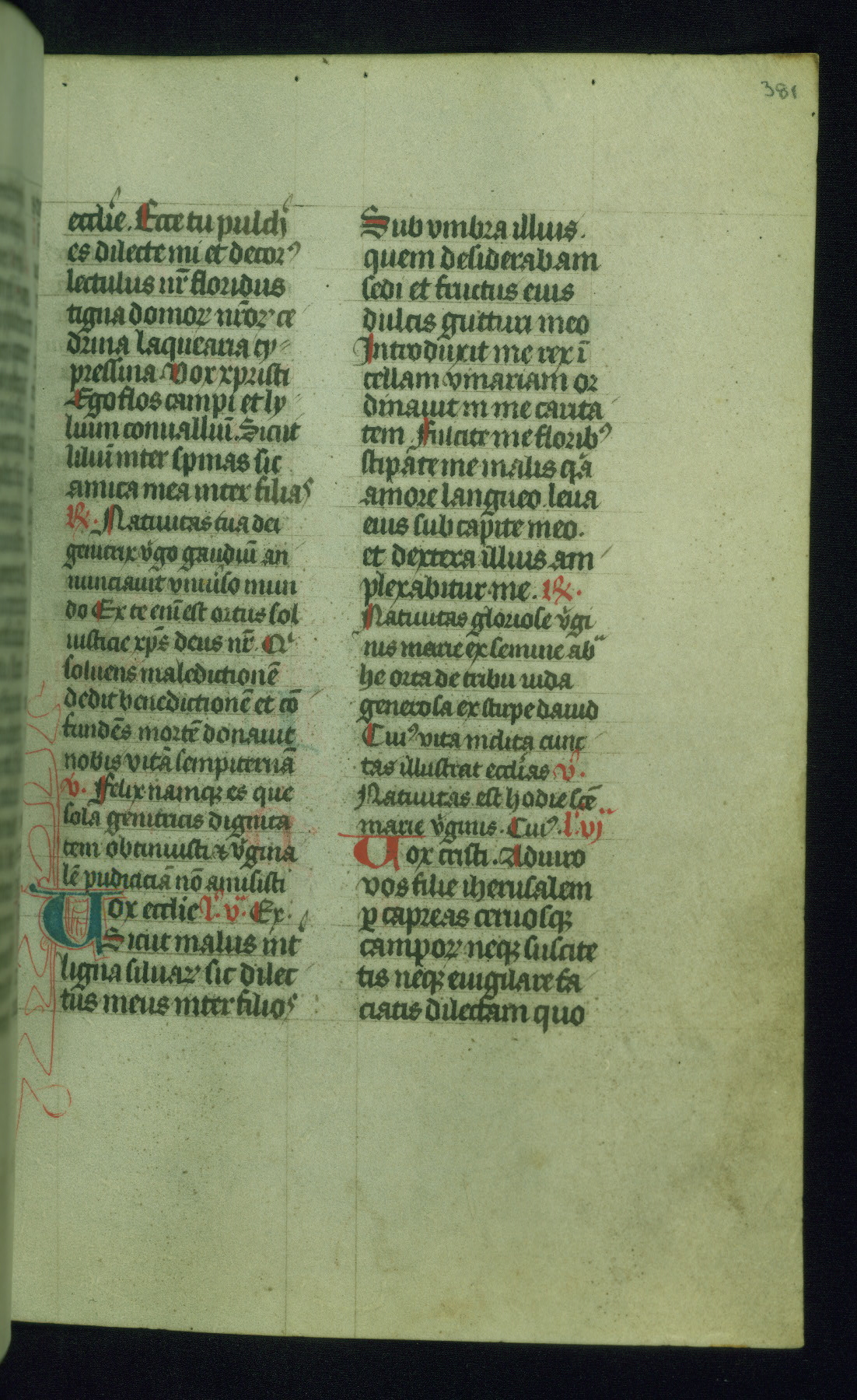 This small breviary, composed of more than 500 folios, is extraordinary for its length, considering it is the summer portion of a two-volume breviary for the use of Liège. The manuscript was completed for ecclesiastical use at the Cathedral of Notre-Dame and St.-Lambert in Liège ca. 1420. This attribution is suggested, for instance, by the petitions to the congregation of this cathedral (fols. 114v-117v), as well as the armorial shield of the family of Surlet de Chokier of Liège represented at the opening of the Psalms. The manuscript has modest, but interesting, decoration with historiated and decorated initials marking the liturgical texts, and occasional angels playing instruments in the margins. The most notable pictorial effect is found in the initials inhabited by transparent figures on rich blue ground. The technique is found, for instance, on fol. 156r with the gold monstrance held by translucent angels for the feast of the Corpus Christi.