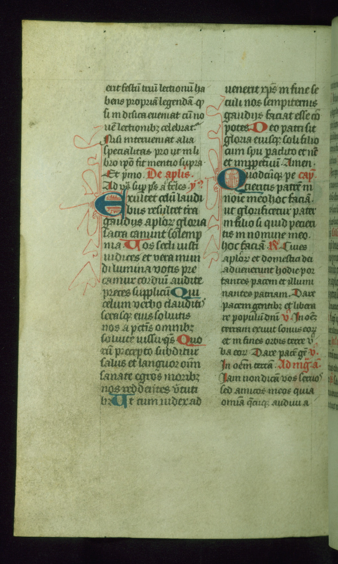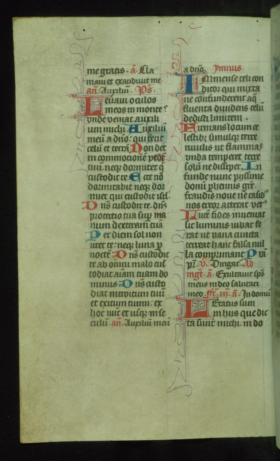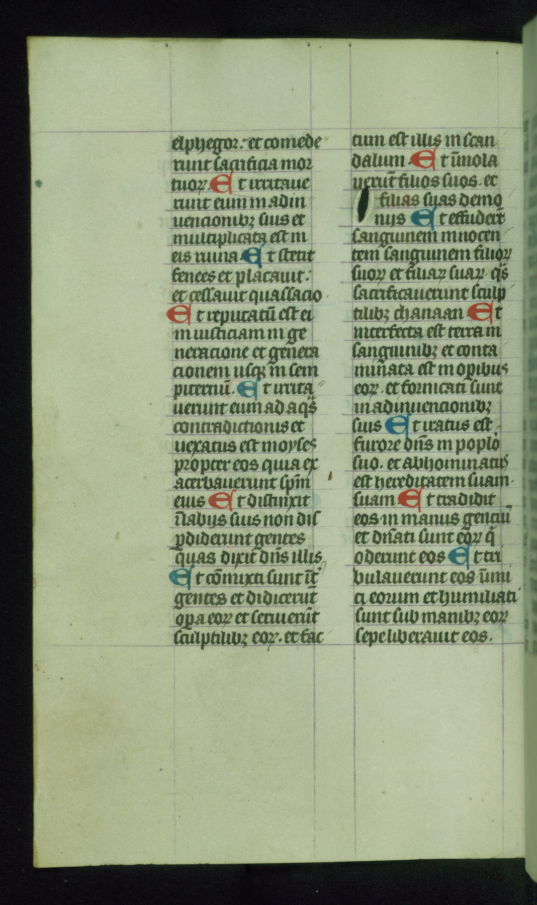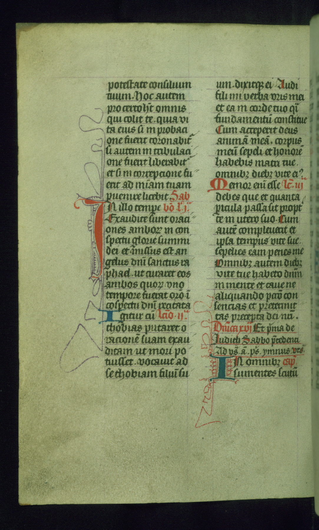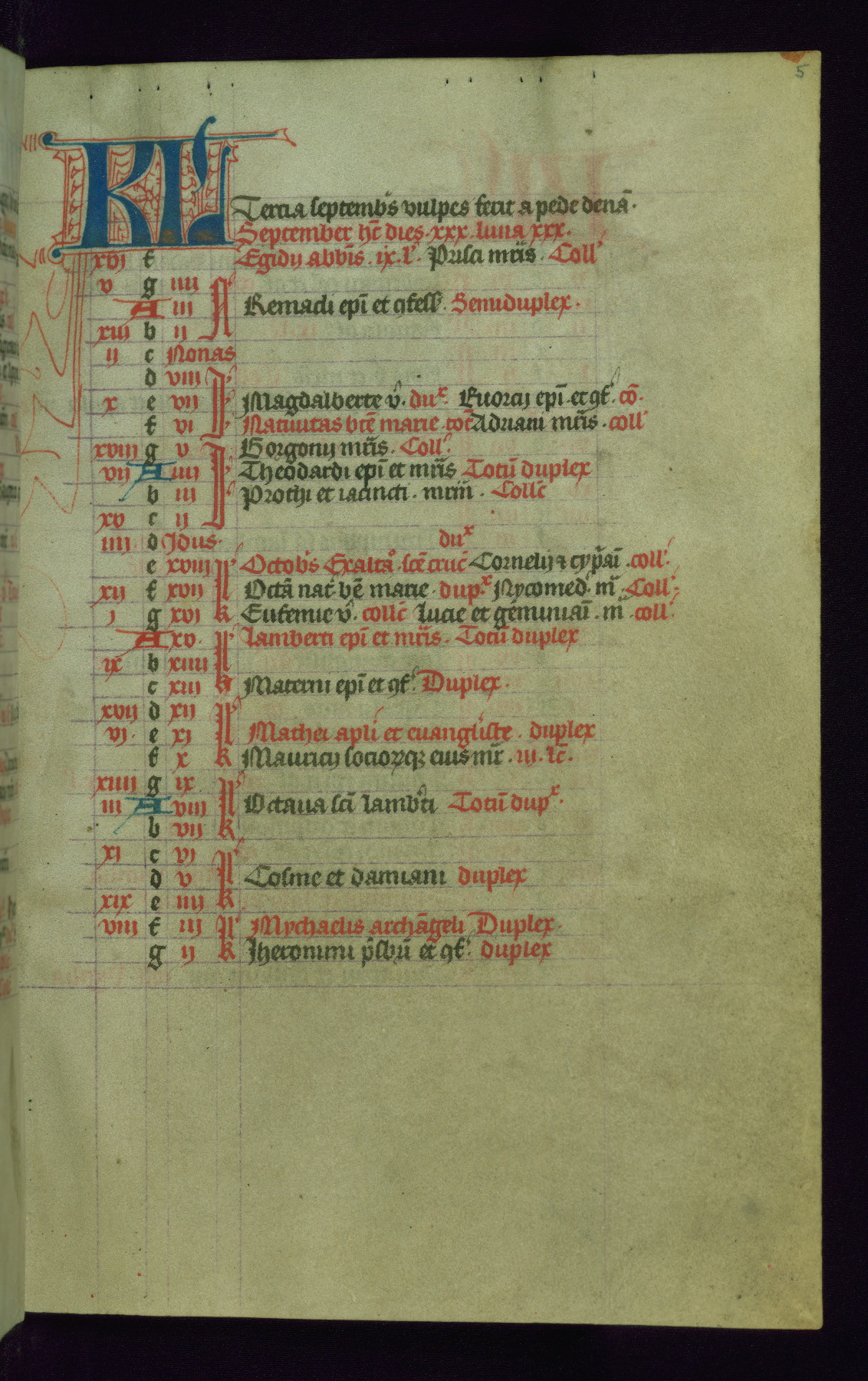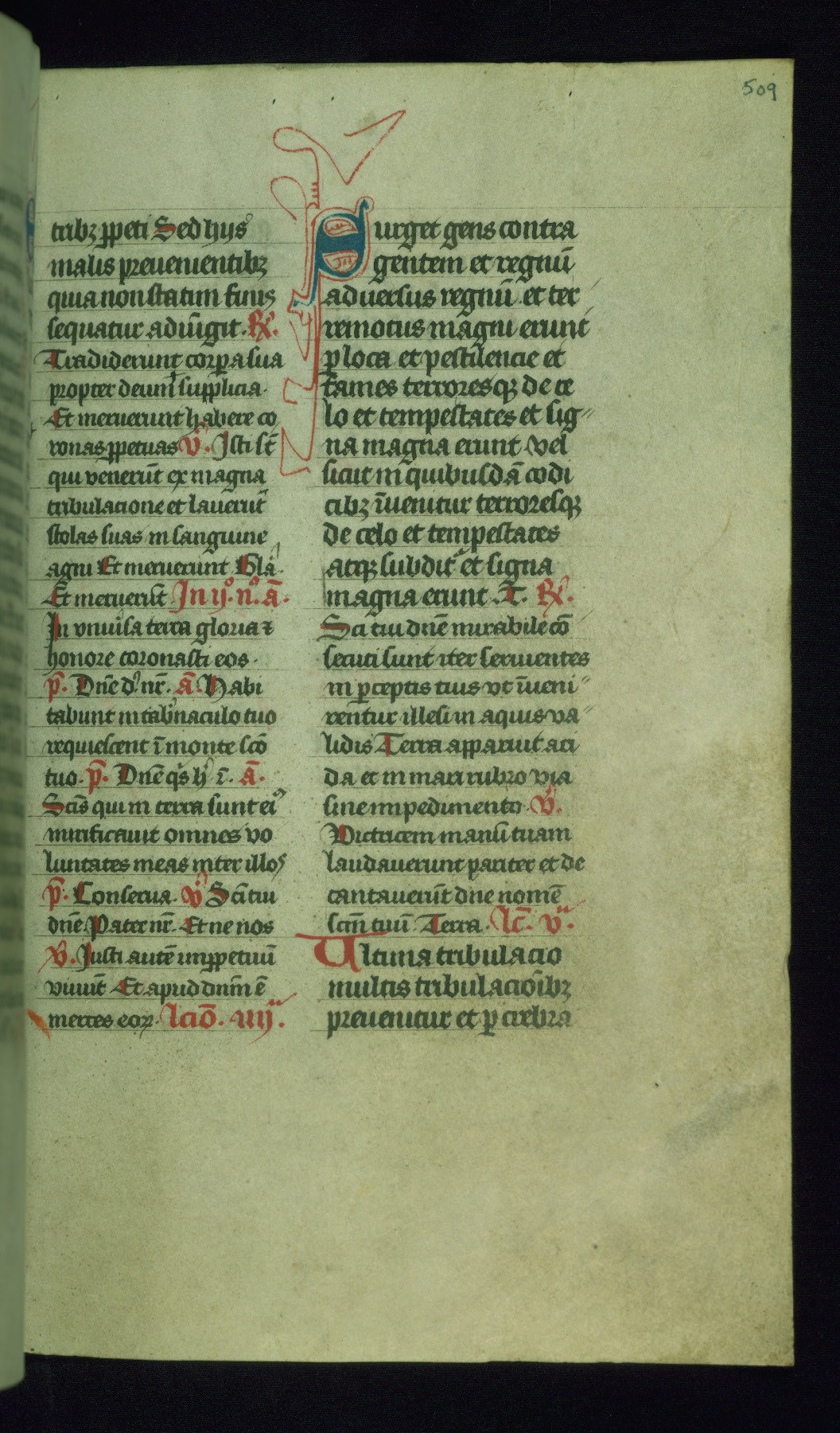 This small breviary, composed of more than 500 folios, is extraordinary for its length, considering it is the summer portion of a two-volume breviary for the use of Liège. The manuscript was completed for ecclesiastical use at the Cathedral of Notre-Dame and St.-Lambert in Liège ca. 1420. This attribution is suggested, for instance, by the petitions to the congregation of this cathedral (fols. 114v-117v), as well as the armorial shield of the family of Surlet de Chokier of Liège represented at the opening of the Psalms. The manuscript has modest, but interesting, decoration with historiated and decorated initials marking the liturgical texts, and occasional angels playing instruments in the margins. The most notable pictorial effect is found in the initials inhabited by transparent figures on rich blue ground. The technique is found, for instance, on fol. 156r with the gold monstrance held by translucent angels for the feast of the Corpus Christi.