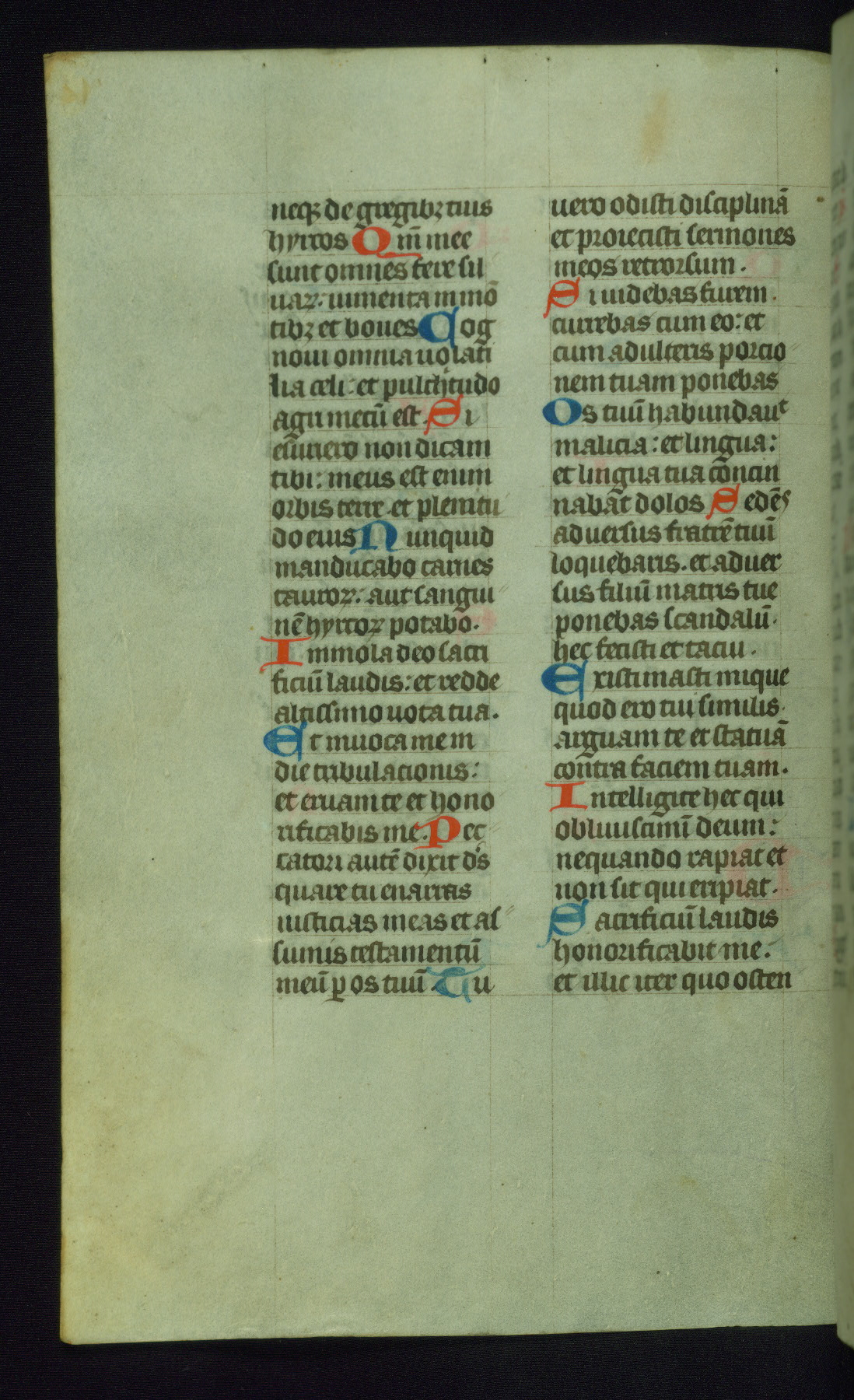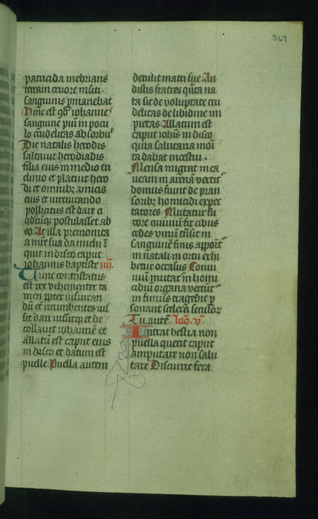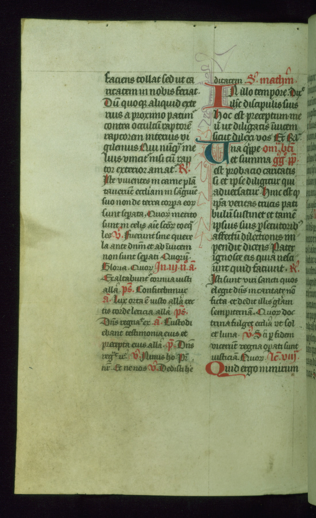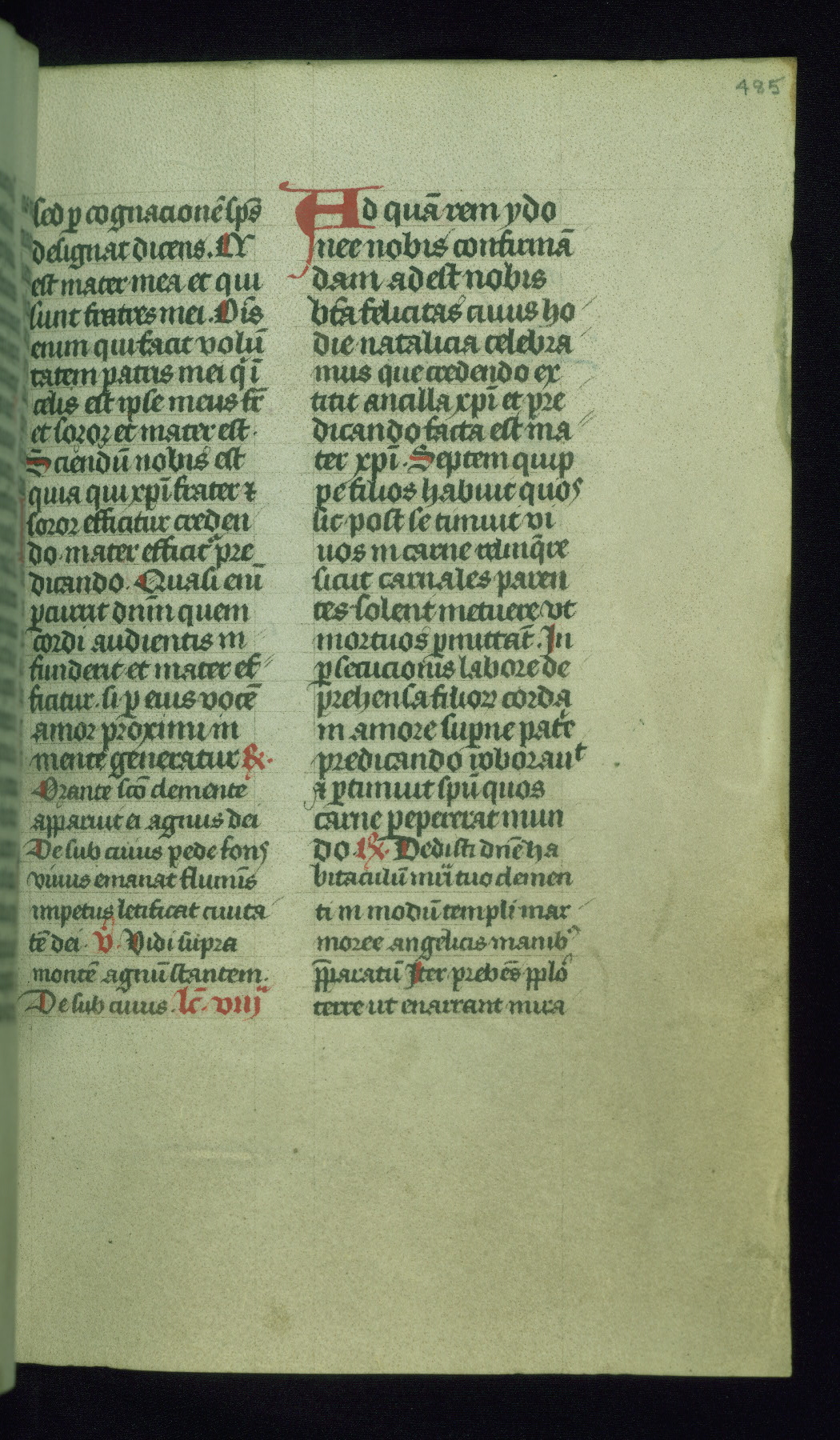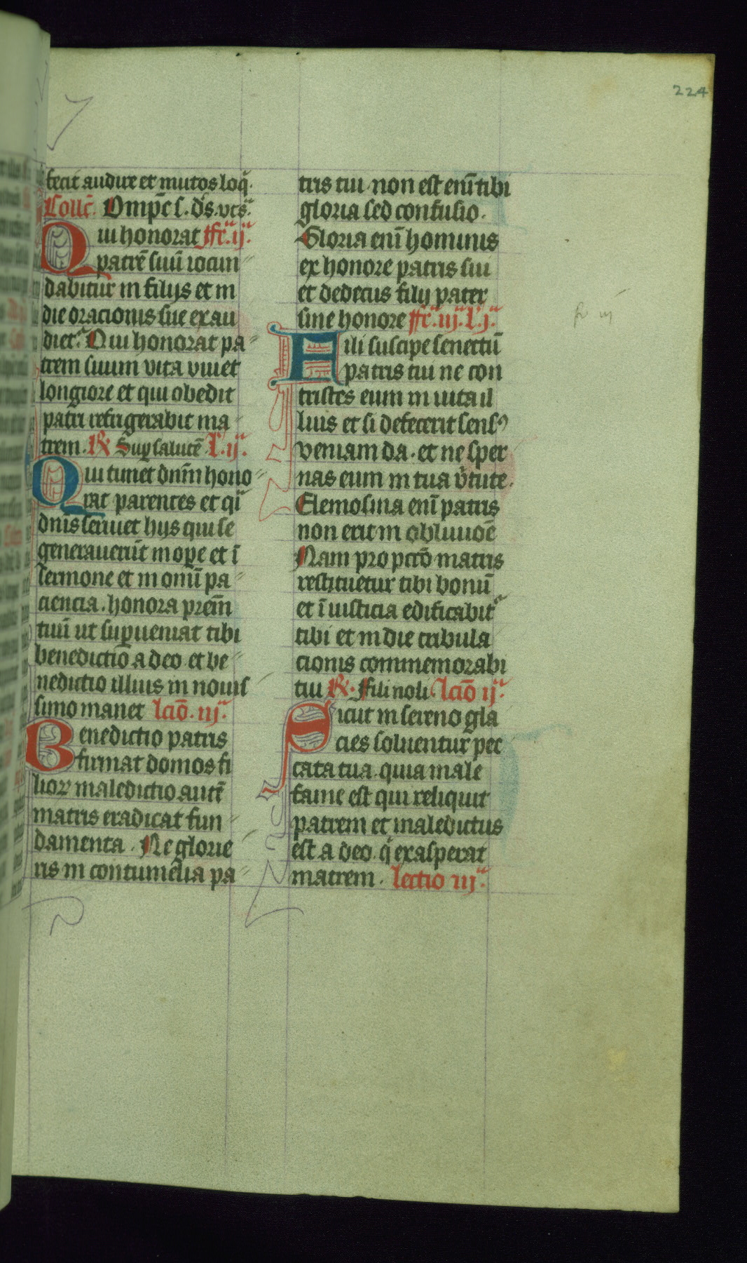 This small breviary, composed of more than 500 folios, is extraordinary for its length, considering it is the summer portion of a two-volume breviary for the use of Liège. The manuscript was completed for ecclesiastical use at the Cathedral of Notre-Dame and St.-Lambert in Liège ca. 1420. This attribution is suggested, for instance, by the petitions to the congregation of this cathedral (fols. 114v-117v), as well as the armorial shield of the family of Surlet de Chokier of Liège represented at the opening of the Psalms. The manuscript has modest, but interesting, decoration with historiated and decorated initials marking the liturgical texts, and occasional angels playing instruments in the margins. The most notable pictorial effect is found in the initials inhabited by transparent figures on rich blue ground. The technique is found, for instance, on fol. 156r with the gold monstrance held by translucent angels for the feast of the Corpus Christi.