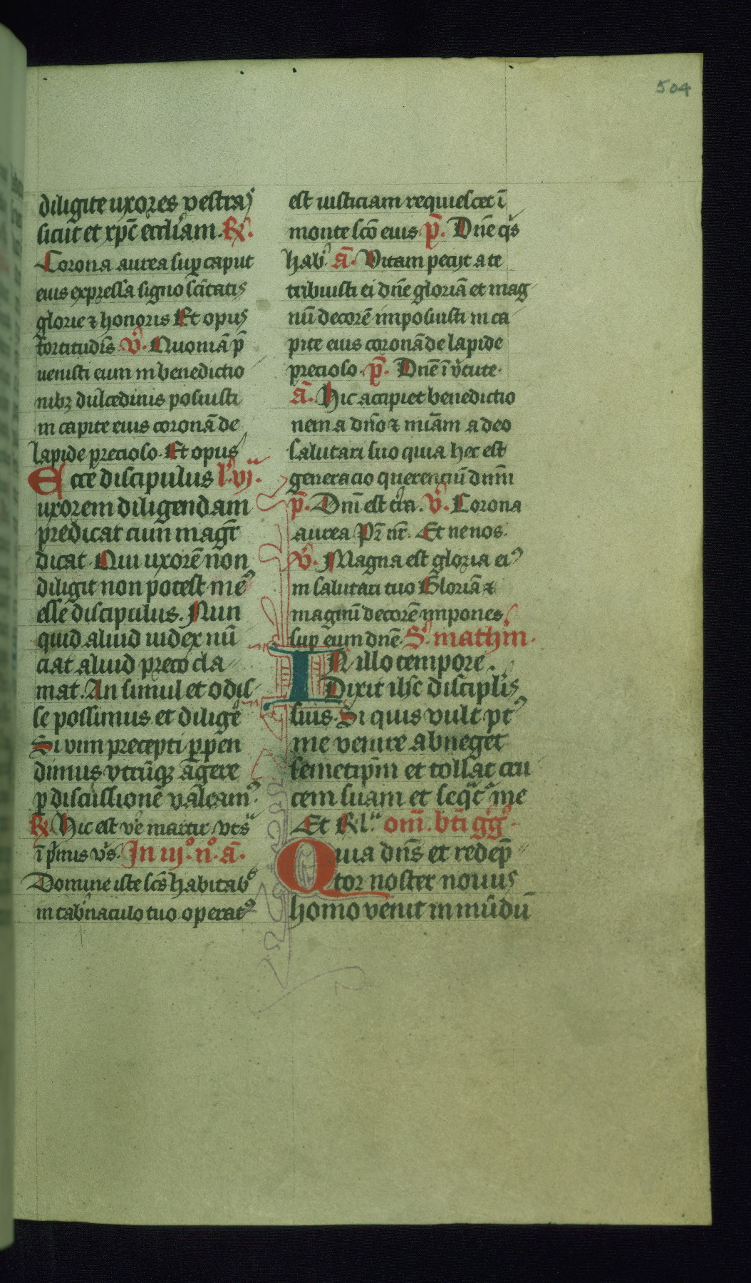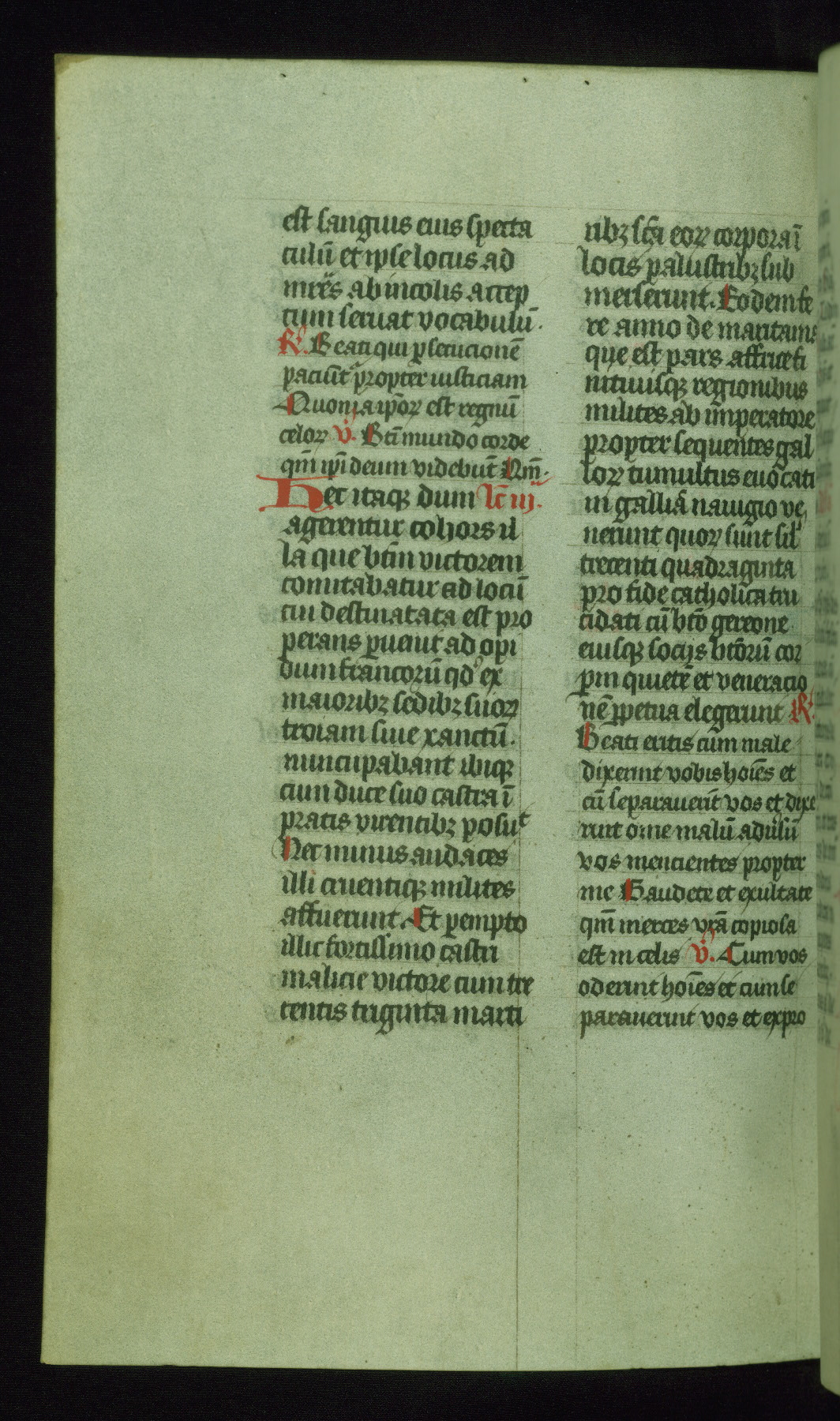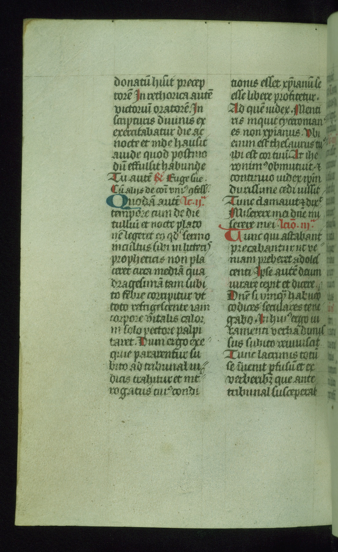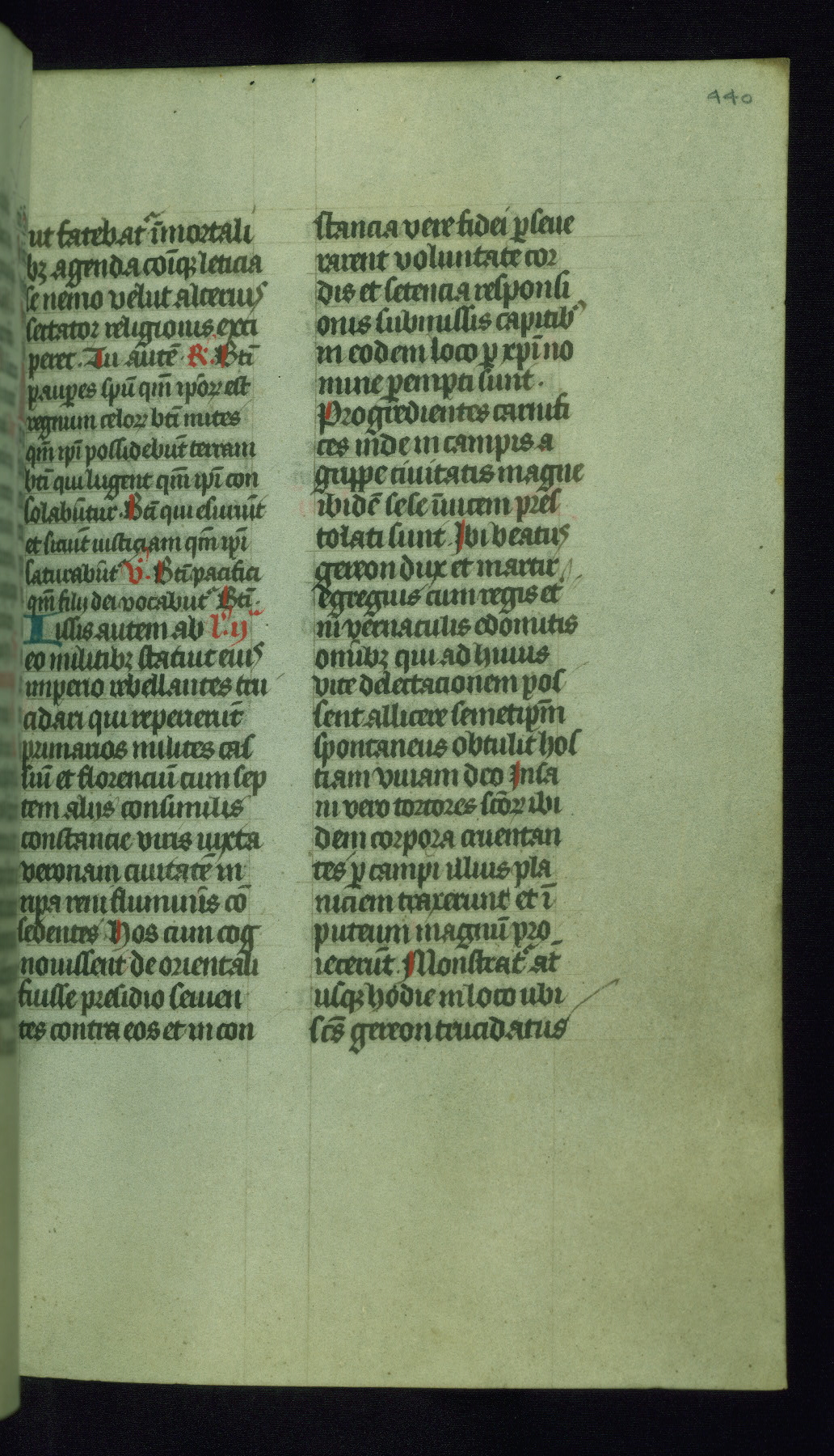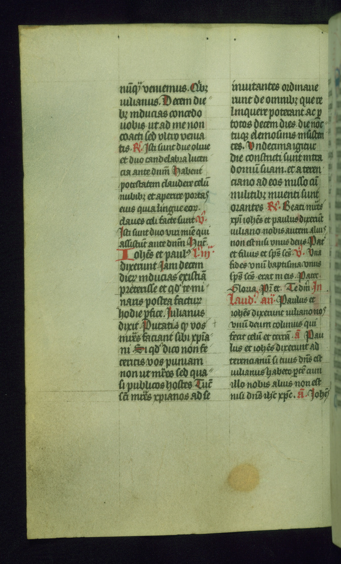 This small breviary, composed of more than 500 folios, is extraordinary for its length, considering it is the summer portion of a two-volume breviary for the use of Liège. The manuscript was completed for ecclesiastical use at the Cathedral of Notre-Dame and St.-Lambert in Liège ca. 1420. This attribution is suggested, for instance, by the petitions to the congregation of this cathedral (fols. 114v-117v), as well as the armorial shield of the family of Surlet de Chokier of Liège represented at the opening of the Psalms. The manuscript has modest, but interesting, decoration with historiated and decorated initials marking the liturgical texts, and occasional angels playing instruments in the margins. The most notable pictorial effect is found in the initials inhabited by transparent figures on rich blue ground. The technique is found, for instance, on fol. 156r with the gold monstrance held by translucent angels for the feast of the Corpus Christi.