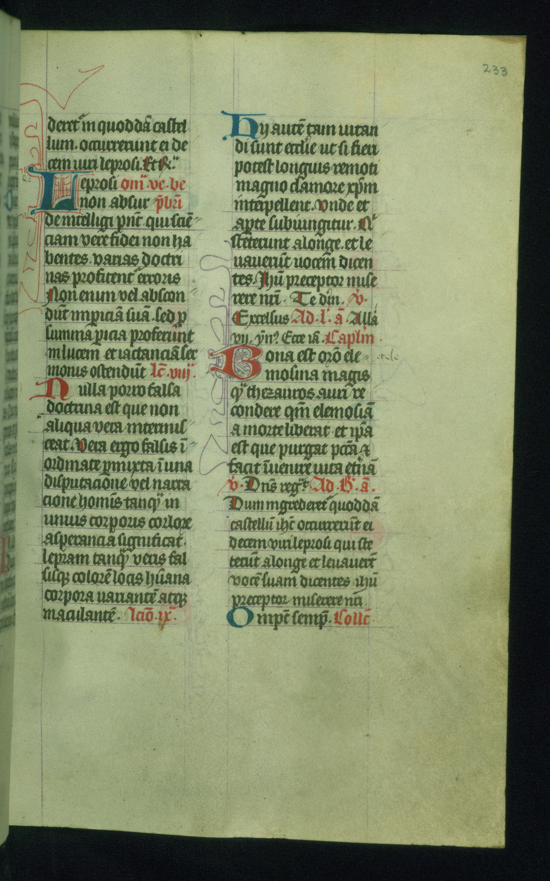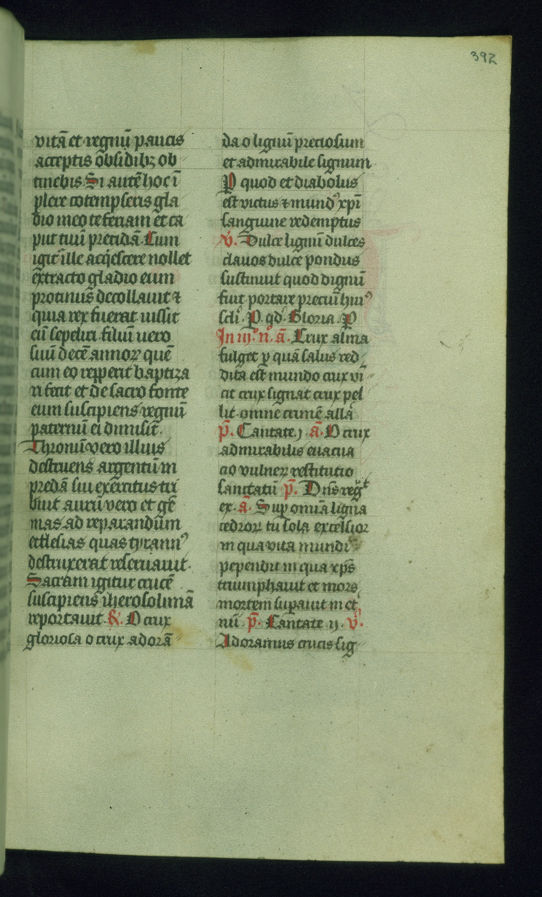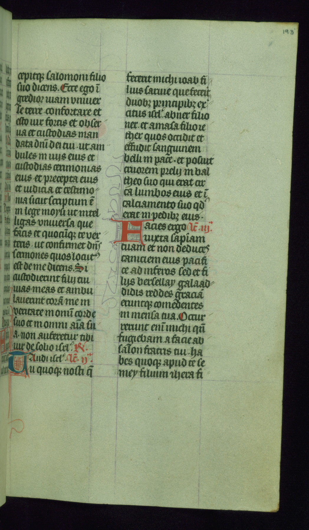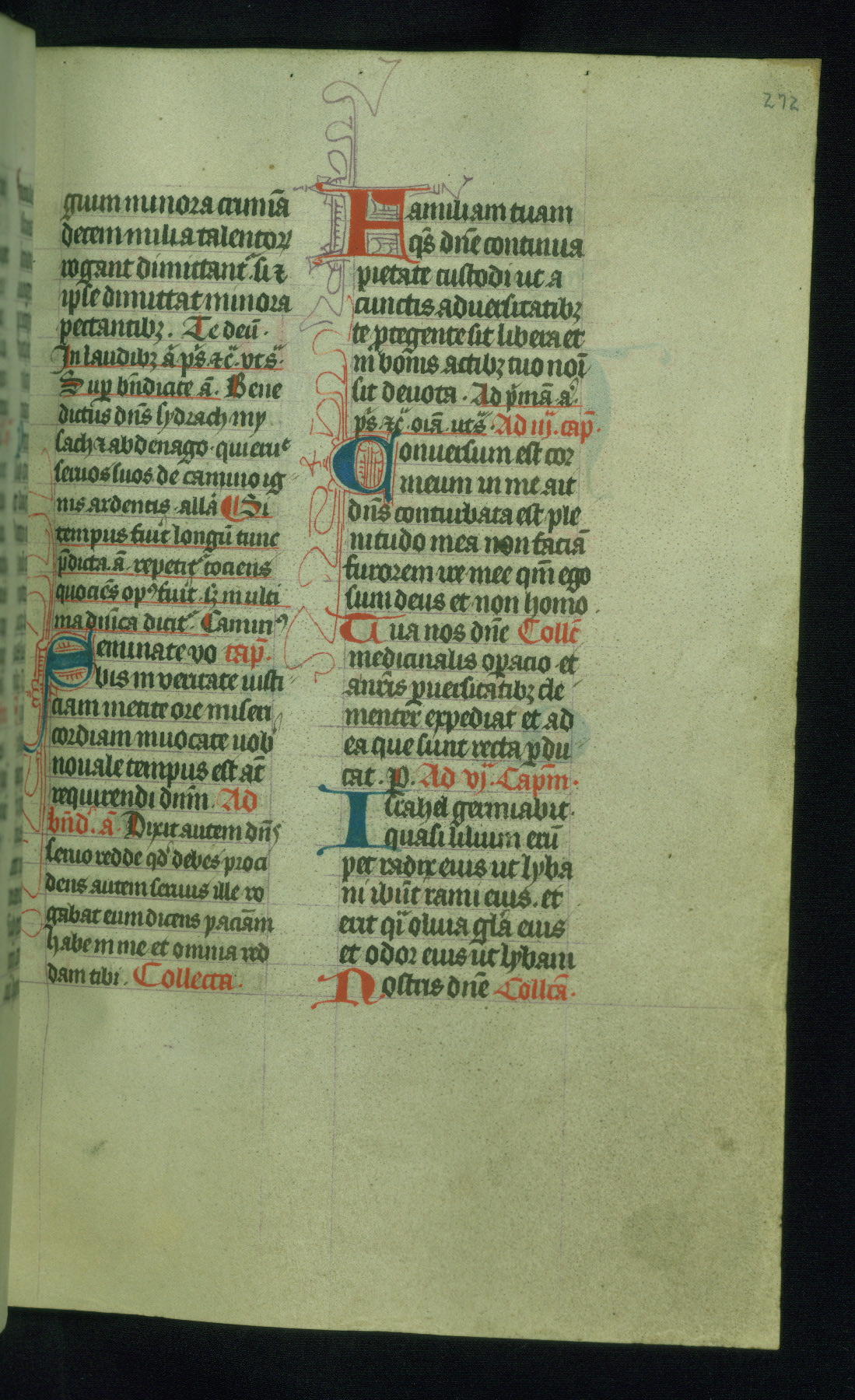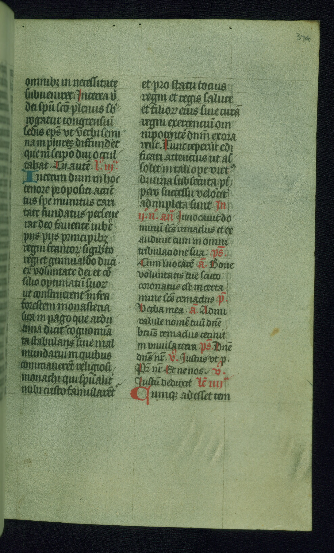 This small breviary, composed of more than 500 folios, is extraordinary for its length, considering it is the summer portion of a two-volume breviary for the use of Liège. The manuscript was completed for ecclesiastical use at the Cathedral of Notre-Dame and St.-Lambert in Liège ca. 1420. This attribution is suggested, for instance, by the petitions to the congregation of this cathedral (fols. 114v-117v), as well as the armorial shield of the family of Surlet de Chokier of Liège represented at the opening of the Psalms. The manuscript has modest, but interesting, decoration with historiated and decorated initials marking the liturgical texts, and occasional angels playing instruments in the margins. The most notable pictorial effect is found in the initials inhabited by transparent figures on rich blue ground. The technique is found, for instance, on fol. 156r with the gold monstrance held by translucent angels for the feast of the Corpus Christi.