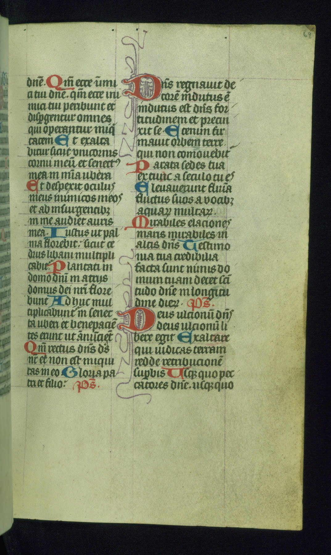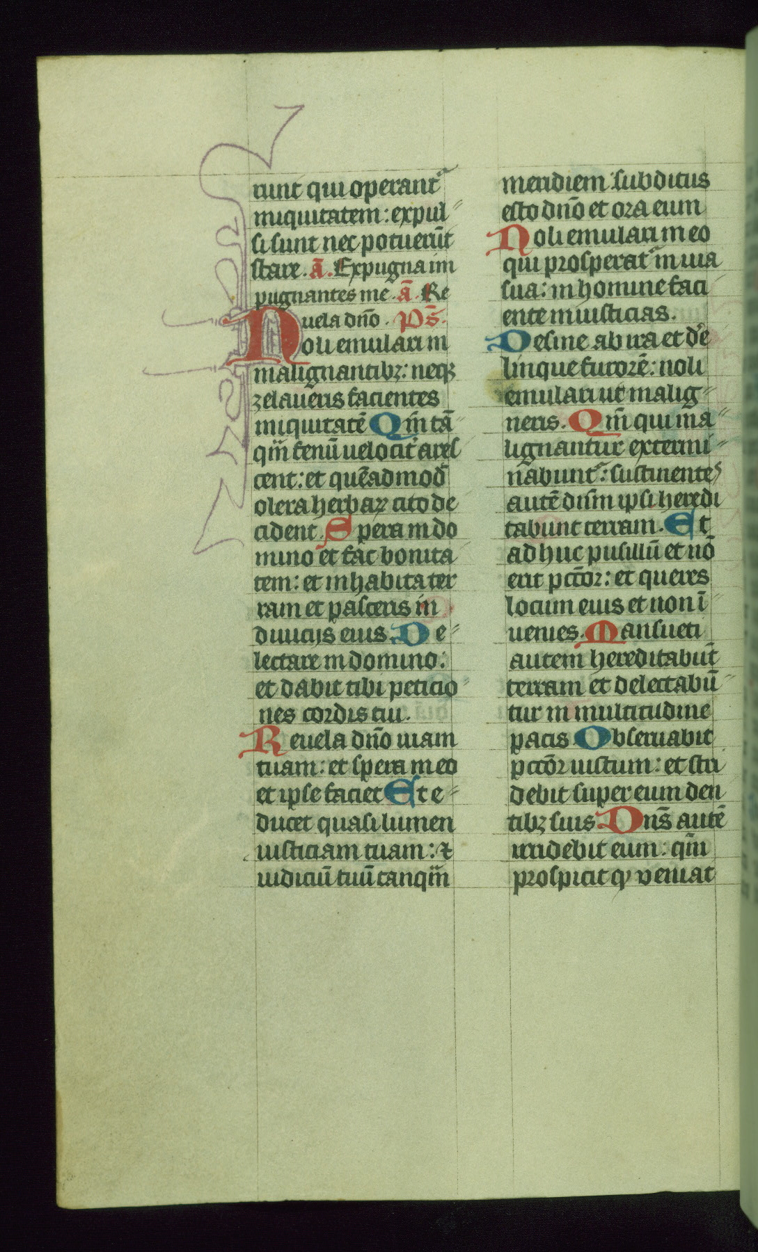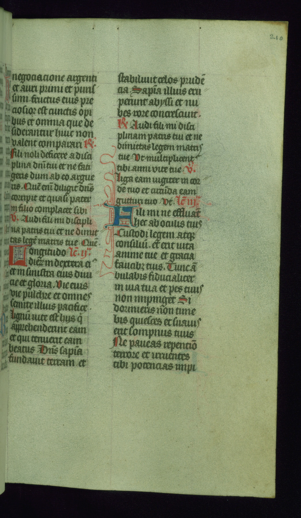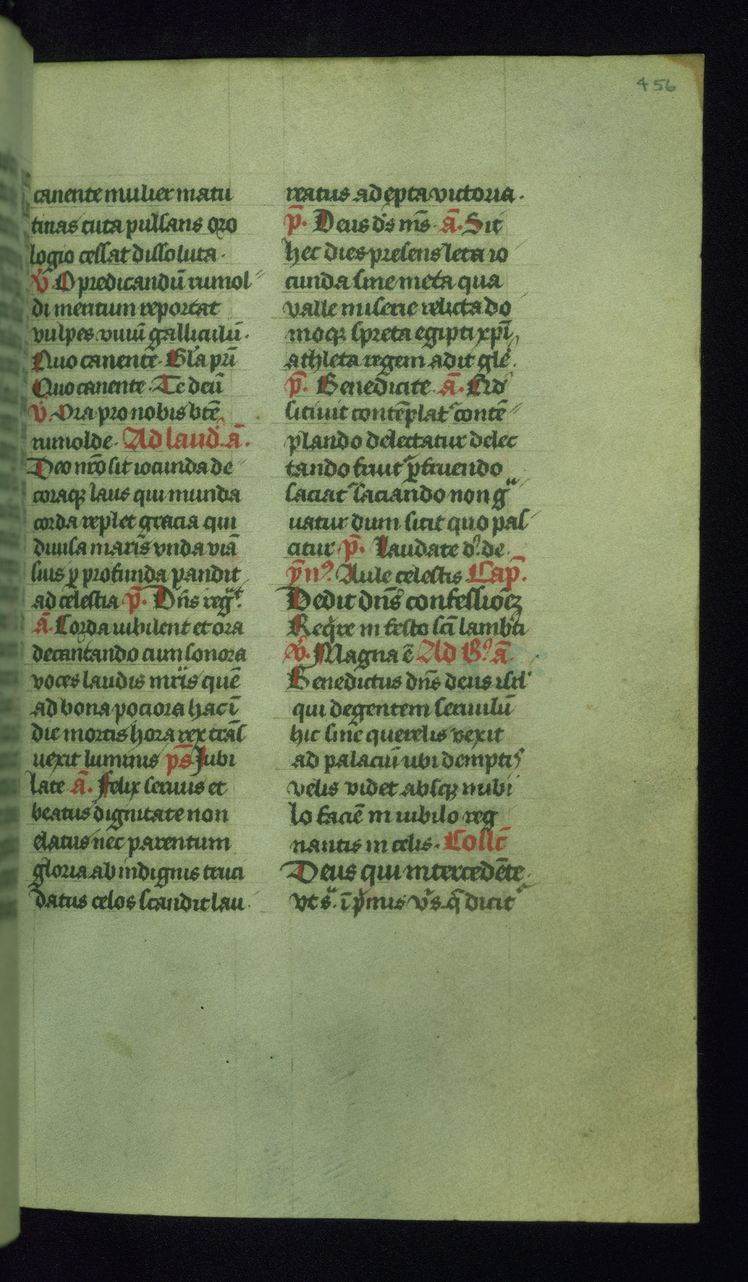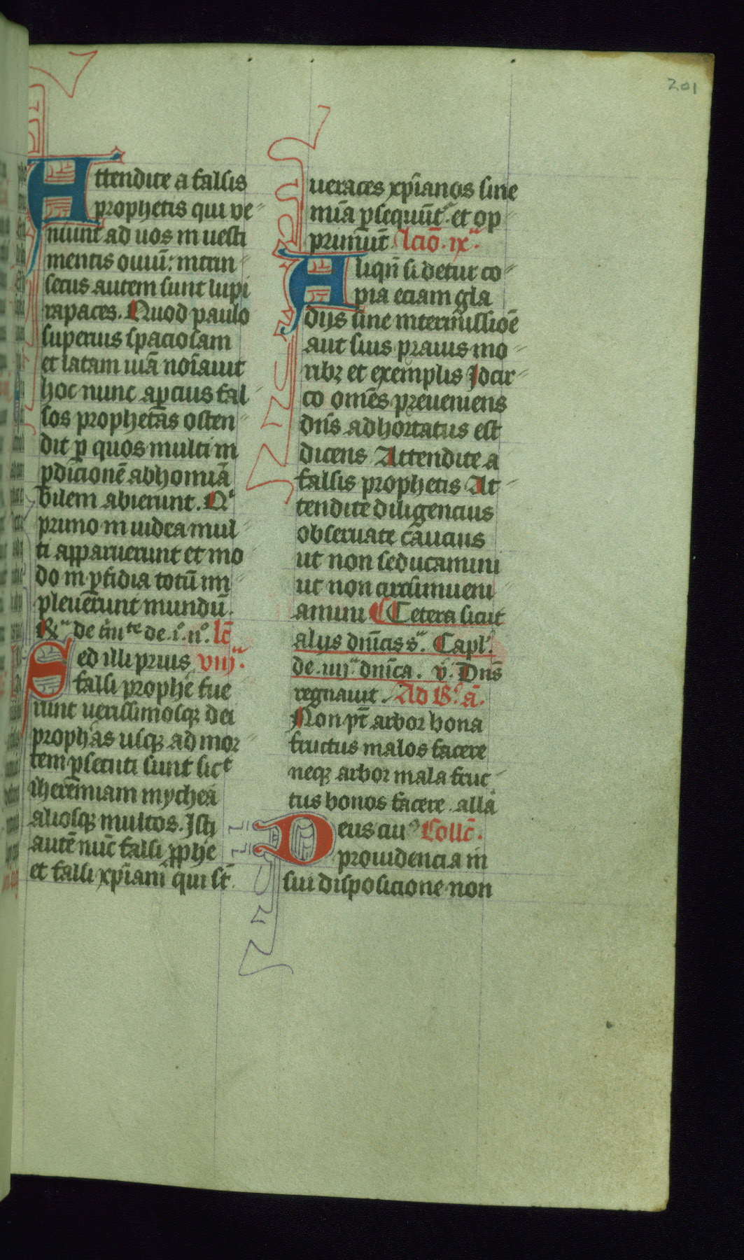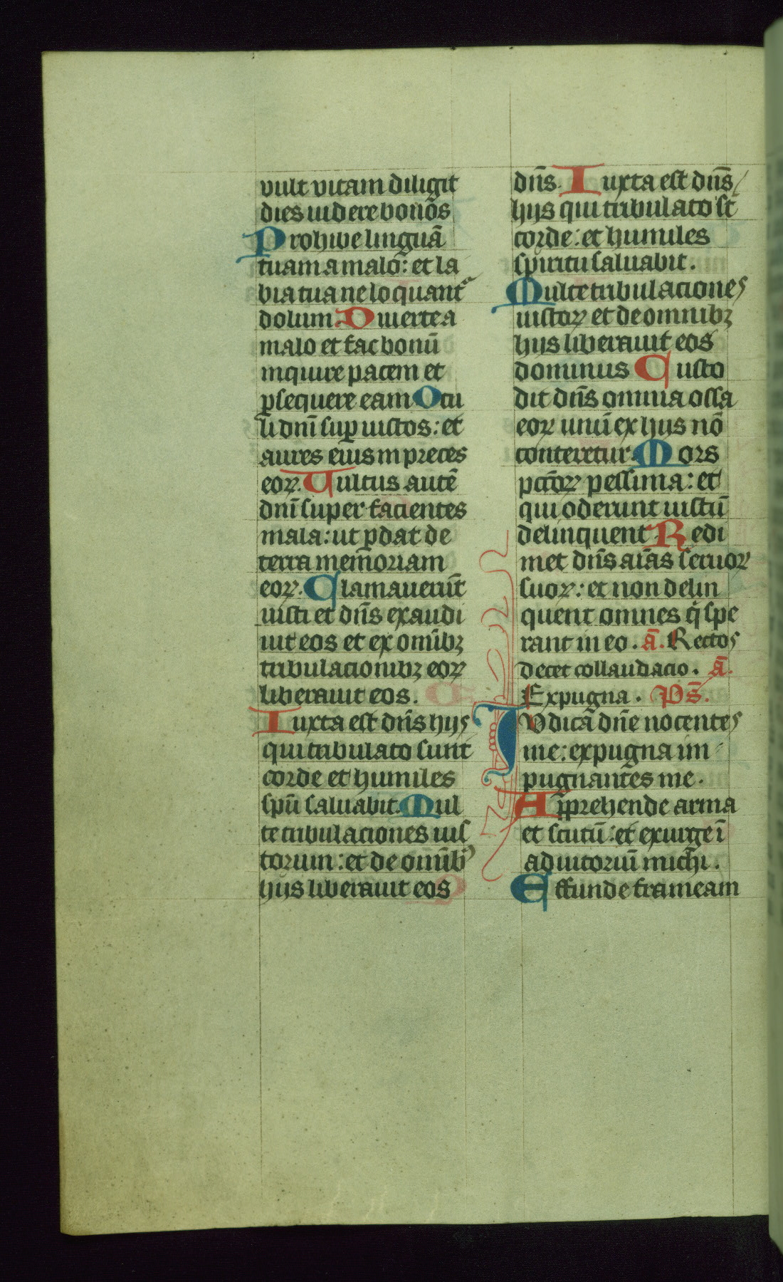 This small breviary, composed of more than 500 folios, is extraordinary for its length, considering it is the summer portion of a two-volume breviary for the use of Liège. The manuscript was completed for ecclesiastical use at the Cathedral of Notre-Dame and St.-Lambert in Liège ca. 1420. This attribution is suggested, for instance, by the petitions to the congregation of this cathedral (fols. 114v-117v), as well as the armorial shield of the family of Surlet de Chokier of Liège represented at the opening of the Psalms. The manuscript has modest, but interesting, decoration with historiated and decorated initials marking the liturgical texts, and occasional angels playing instruments in the margins. The most notable pictorial effect is found in the initials inhabited by transparent figures on rich blue ground. The technique is found, for instance, on fol. 156r with the gold monstrance held by translucent angels for the feast of the Corpus Christi.